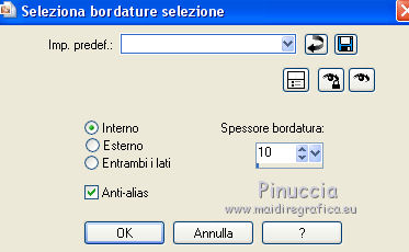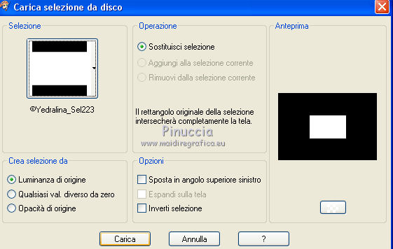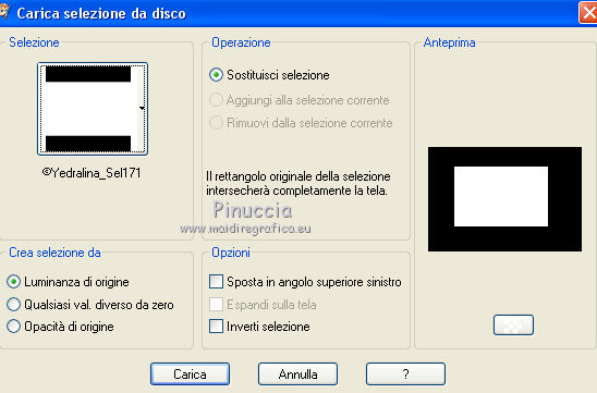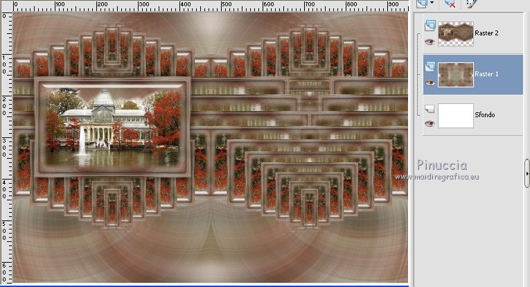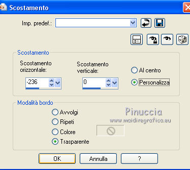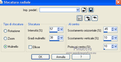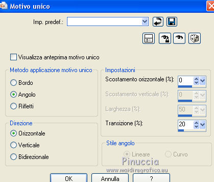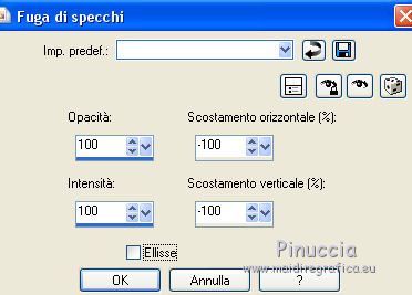 qui puoi trovare qualche risposta ai tuoi dubbi. Se l'argomento che ti interessa non è presente, ti prego di segnalarmelo. Questo tutorial è stato realizzato con Corel19 e tradotto con Corel X e, CorelX19, ma può essere realizzato anche con le altre versioni di PSP. Dalla versione X4, il comando Immagine>Rifletti è stato sostituito con Immagine>Capovolgi in orizzontale, e il comando Immagine>Capovolgi con Immagine>Capovolgi in verticale. Nelle versioni X5 e X6, le funzioni sono state migliorate rendendo disponibile il menu Oggetti. Con la nuova versione X7, sono tornati Rifletti>Capovolgi, ma con nuove varianti. Vedi la scheda sull'argomento qui traduzione in inglese/english translation qui/here Le vostre versioni/your versions qui/here Occorrente: Un tube a scelta. Il resto del materiale qui Il tube della donna, non fornito è di Gabry (Gabry-woman 0-133). Il tube del paesaggio è di Yedralina (1467©Yedralina). tube secondo esempio: misted di Yedralina (1468/copy;Yedralina.png) tube di Guismo(CalGuisTRISTESSE08112013) terzo esempio: misted di Jewel (Paysage automne jewel 007) tube donna autore sconosciuto (tubespngN_019). Filtri: se hai problemi con i filtri, consulta la mia sezione filtri qui Frischluft - Mosaic Plane qui Alien Skin Eye Candy 5 Impact - Glass qui ![]() non esitare a cambiare modalità di miscelatura e opacità secondo i colori utilizzati. Metti il preset Cliccando sul file una o due volte (a seconda delle tue impostazioni), automaticamente il preset si installerà nella cartella corretta. perchè uno o due clic vedi qui Metti le selezioni nella cartella Selezioni. Scegli un colore chiaro dal tuo misted del paesaggio, e impostalo come colore di primo piano. Come puoi notare dalle immagini finali in alto, l'effetto principale, dipenderà dalla grandezza del tuo misted, nella cornice a sinistra, per questo ho preferito mostrarti vari esempi. Utilizza un misted della dimensione che preferisci, dopo riduci o aumenta il tube ,a tuo piacimento. 1. Apri una nuova immagine bianca 950 x 650 pixels. ![]() 2. Selezione>Seleziona tutto. Livelli>Nuovo livello raster. 3. Apri il tuo misted e vai a Modifica>Copia. Torna al tuo lavoro e vai a Modifica>Incolla nella selezione. Selezione>Deseleziona. 4. Effetti>Effetti di immagine>Motivo unico. ![]() 5. Regola>Sfocatura>Sfocatura radiale. ![]() 6. Effetti>Effetti di riflesso>Specchio rotante. ![]() 7. Livelli>Duplica. Immagine>Capovolgi. 8. Abbassa l'opacità di questo livello al 50%. ![]() Livelli>Unisci>Unisci giù. 9. Effetti>Effetti di bordo>Aumenta di più. 10. Modifica>Copia. Modifica>Incolla come nuova immagine e minimizza l'immagine che userai più tardi. 11. Torna al tuo lavoro. Livelli>Nuovo livello raster. 12. Selezione>Carica/Salva selezione>Carica selezione da disco. Cerca e carica la selezione sel171. ![]() 13. Modifica>Incolla nella selezione (hai ancora in memoria l'immagine minimizzata al punto 10). 14. Selezione>Modifica>Contrai - 5 pixels. Riempi con il tuo colore chiaro.15. Selezione>Modifica>Contrai - 3 pixels. Modifica>Incolla nella selezione (hai sempre in memoria l'immagine del punto 10). 16. Selezione>Modifica>Contrai - 5 pixels. Riempi la selezione con il colore chiaro.17. Selezione>Modifica>Contrai - 3 pixels. Modifica>Incolla nella selezione (sempre l'immagine del punto 10). Mantieni selezionato. 18. Attiva nuovamente il tuo mist e vai a Modifica>Copia. Torna al tuo lavoro e vai a Modifica>Incolla nella selezione. Selezione>Deseleziona. ![]() 19. Immagine>Ridimensiona, al 65%, tutti i livelli non selezionato. Regola>Messa a fuoco>Metti a fuoco. Oggetti>Allinea>Centra nella tela. Nelle versioni precedenti: Modifica>Taglia e Modifica>Incolla come nuovo livello, e l'immagine sarà perfettamente al centro. (non dimenticare di eliminare il livello rimasto vuoto). 20. Selezione>Carica/Salva selezione>Carica selezione da disco. Cerca e carica la selezione sel223. ![]() 21. Effetti>Plugins>Alien Skin Eye Candy 5 Impact - Glass. Seleziona il preset ©Yedralina_Glass2 e ok. Questi i settaggi, in caso di problemi con il preset. ![]() Selezione>Deseleziona. 22. Livelli>Duplica. Chiudi questo livello e attiva il livello sottostante dell'originale - Raster 2. 23. Effetti>Effetti di riflesso>Fuga di specchi. ![]() 24. Effetti>Effetti di riflesso>Specchio rotante. ![]() 25. Livelli>Duplica. Immagine>Capovolgi. Livelli>Unisci>Unisci giù. 26. Effetti>Effetti di immagine>Motivo unico. ![]() 27. Riapri e attiva il livello superiore Copia di Raster 2. 28. Effetti>Effetti di immagine>Scostamento. ![]() 29. Effetti>Effetti 3D>Sfalsa ombra, colore nero. ![]() 30. Livelli>Unisci>Unisci giù. 31. Oggetti>Allinea>Superiore. Nelle versioni precedenti: sposta il livello in alto.32. Attiva il livello Raster 1. ![]() Effetti>Plugins>Frischluft - Mosaic Plane. ![]() 33. Dovresti avere questo: ![]() 34. Attiva nuovamente l'immagine del punto 10 e vai a Modifica>Copia. Torna al tuo lavoro. 35. Selezione>Seleziona tutto. Immagine>Aggiungi bordatura, 45 pixels, simmetriche, colore chiaro. Selezione>Inverti. Modifica>Incolla nella selezione. 36. Regola>Sfocatura>Sfocatura gaussiana - raggio 25. ![]() 37. Selezione>Modifica>Seleziona bordature selezione. ![]() 38. Effetti>Effetti 3D>Sfalsa ombra, con i settaggi precedenti. ![]() Selezione>Deseleziona. 39. Apri il tuo tube e vai a Modifica>Copia. Torna al tuo lavoro e vai a Modifica>Incolla come nuovo livello. Immagine>Ridimensiona, se e quanto necessario, tutti i livelli non selezionato. Posiziona correttamente il tube.40. Immagine>Ridimensiona, 950 pixels di larghezza, tutti i livelli selezionato. Firma il tuo lavoro su un nuovo livello. Livelli>Unisci>Unisci tutto e salva in formato jpg. ![]() Puoi scrivermi se hai problemi o dubbi, o trovi un link che non funziona, o soltanto per un saluto. 3 Novembre 2016 |