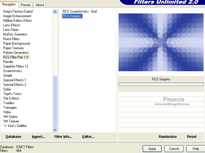 5. Effects>Plugins>Filters Unlimited 2.0 - RCS Filter Pak 1.0 - RCS Sequins