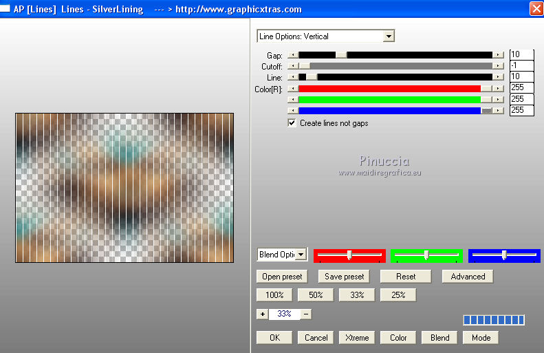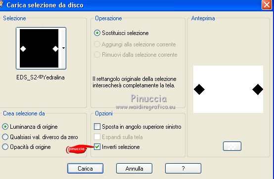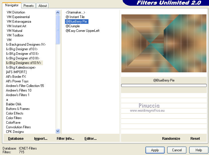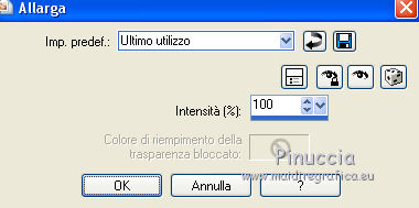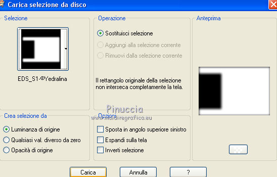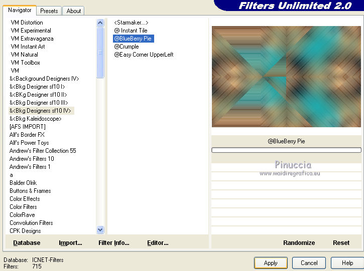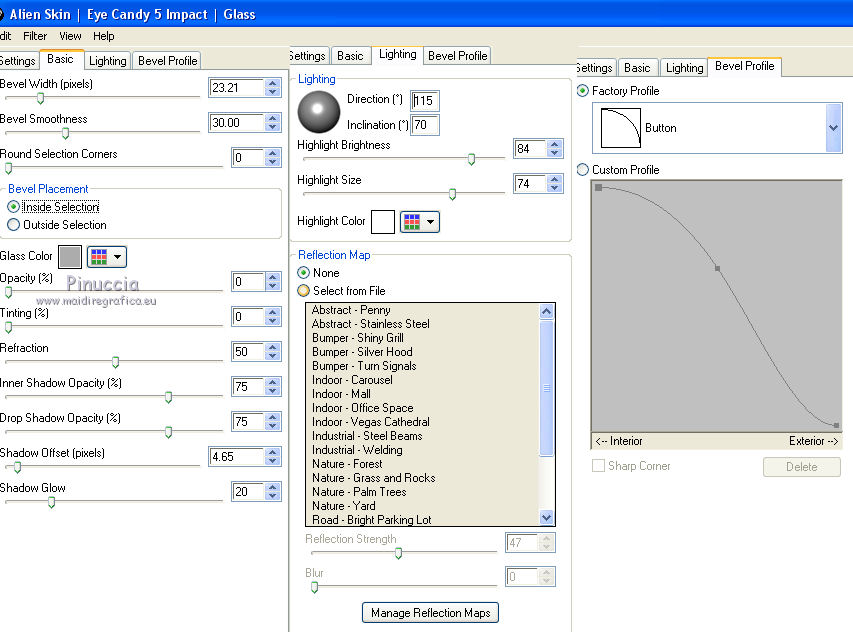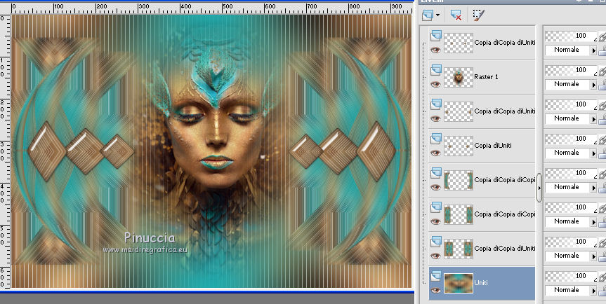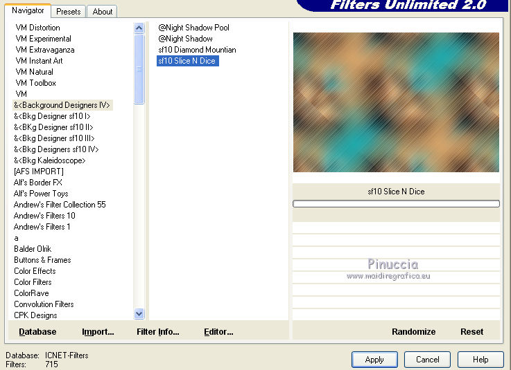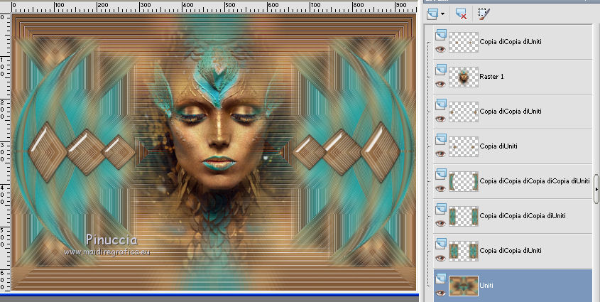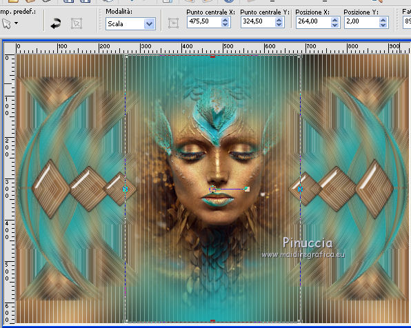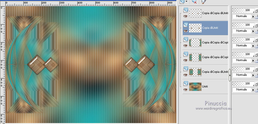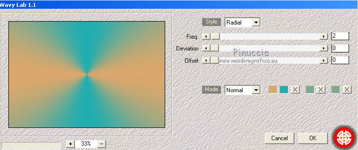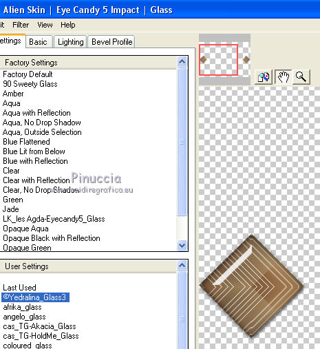 qui puoi trovare qualche risposta ai tuoi dubbi. Se l'argomento che ti interessa non è presente, ti prego di segnalarmelo. Questo tutorial è stato realizzato con Corel19 e tradotto con Corel X e CorelX17, ma può essere realizzato anche con le altre versioni di PSP. Dalla versione X4, il comando Immagine>Rifletti è stato sostituito con Immagine>Capovolgi in orizzontale, e il comando Immagine>Capovolgi con Immagine>Capovolgi in verticale. Nelle versioni X5 e X6, le funzioni sono state migliorate rendendo disponibile il menu Oggetti. Con la nuova versione X7, sono tornati Rifletti>Capovolgi, ma con nuove varianti. Vedi la scheda sull'argomento qui traduzione in inglese/english translation qui/here le vostre versioni/your versions qui/here Occorrente: Un misted a scelta Il resto del materiale qui Per il tube usato e non fornito grazie Nara Pamplona (tube NP1405). (in questa pagina trovi i links ai loro siti). Filtri: se hai problemi con i filtri, consulta la mia sezione filtri qui Filters Unlimited 2.0 qui Mehdi - Wavy Lab 1.1. qui AP [Lines] - Lines SilverLining qui &<Background Designers IV> - sf10 Slice N Dice (da importare in Unlimited) qui &<Background Designer sf10IV> - @Blueberry Pie (da importare in Unlimited) qui Alien Skin Eye Candy 5 Impact - Glass qui Frischluft 1.1 - Mosaic plane qui ![]() non esitare a cambiare modalità di miscelatura e opacità secondo i colori utilizzati. Metti il preset Cliccando sul file una o due volte (a seconda delle tue impostazioni), automaticamente il preset si installerà nella cartella corretta. perchè uno o due clic vedi qui Se preferisci, puoi importare direttamente il preset nel corso del tutorial Come fare vedi la scheda del filtro Eye Candy qui Metti il preset Preset_Pick_202-©Yedralina nella cartella Impostazioni predefinite. Metti le selezioni nella cartella Selezioni. 1. Imposta il colore di primo piano con #20adaf, e il colore di sfondo con #daa76c. ![]() 2. Apri una nuova immagine trasparente 950 x 650 pixels. 3. Effetti>Plugins>Mehdi - Wavy Lab 1.1. Questo filtro lavora con i colori della paletta: il primo è il colore di sfondo, il secondo quello di primo piano. Mantieni gli ultimi due colori creati dal filtro. ![]() 4. Livelli>Nuovo livello raster. Selezione>Seleziona tutto. Apri il tuo misted e vai a Modifica>Copia. Torna al tuo lavoro e vai a Modifica>Incolla nella selezione. Selezione>Deseleziona. 5. Effetti>Effetti di immagine>Motivo unico. ![]() 6. Regola>Sfocatura>Sfocatura gaussiana - raggio 25. ![]() 7. Effetti>Plugins>AP [Lines] - Lines SilverLining. ![]() 8. Livelli>Unisci>Unisci visibile. 9. Livelli>Duplica. 10. Effetti>Plugins>Filters Unlimited 2.0 - &<Background Designers IV> - sf10 Slice N Dice. ![]() 11. Effetti>Plugins>Filters Unlimited 2.0 - &<Background Designers sf10IV> - @Blueberry Pie. ![]() 12. Effetti>Effetti di riflesso>Specchio rotante ![]() 13. Livelli>Duplica. Immagine>Ridimensiona, al 50%, tutti i livelli non selezionato. 14. Immagine>Ruota per gradi - 90 gradi a sinistra ruota il livello singolo... selezionato. ![]() 15. Oggetti>Allinea>Sinistra Se stai usando una versione precedente che non dispone del menu Oggetti, usa lo strumento Spostamento ![]() ![]() 16. Selezione>Carica/Salva selezione>Carica selezione da disco. Cerca e carica la selezione EDS_S1_©Yedralina. ![]() Premi 2 volte sulla tastiera il tasto CANC ![]() Selezione>Deseleziona. 17. Effetti>Effetti di riflesso>Specchio rotante, con i settaggi precedenti. ![]() 18. Livelli>Duplica. Effetti>Effetti di distorsione>Allarga (nelle versioni più recenti è diventato Espansione). ![]() 19. Livelli>Duplica. Effetti>Effetti geometrici>Sfera. ![]() 20. Attiva il livello Copia di Uniti. ![]() 21. Selezione>Carica/Salva selezione>Carica selezione da disco. Cerca e carica la selezione EDS_S2_©Yedralina, Inverti selezione selezionato ![]() Premi sulla tastiera il tasto CANC. 22. Selezione>Inverti. Livelli>Disponi>Porta in alto. 23. Effetti>Plugins>Alien Skin Eye Candy 5 Impact - Glass seleziona il preset ©Yedralina_Glass 3 e ok. ![]() Questi i settaggi, in caso di problemi con il preset. ![]() 24. Selezione>Deseleziona. 25. Immagine>Ridimensiona, al 75%, tutti i livelli non selezionato. 26. Livelli>Duplica. Immagine>Ridimensiona, al 75%, tutti i livelli non selezionato. 27. Attiva nuovamente il livello sottostante (copia di Uniti). ![]() 28. Livelli>Duplica. Effetti>Effetti geometrici>Sfera, con i settaggi precedenti. ![]() 29. Modifica>Incolla come nuovo livello (il tuo misted è sempre in memoria). 30. Attiva lo strumento Puntatore ![]() apri il menu dei preset e seleziona il preset 202-©Yedralina ![]() o posiziona / a tuo piacimento.![]() 31. Attiva il livello di sfondo (Uniti). ![]() Effetti>Plugins>Filters Unlimited 2.0 - &<Background Designers sf10IV> - @Blueberry Pie. ![]() 32. Effetti>Effetti di riflesso>Specchio rotante, con i settaggi precedenti. ![]() 33. Effetti>Plugins>Frischluft - Mosaic Plane. ![]() Effetti>Effetti di bordo>Aumenta. **** Attenzione, se stai usando una versione precedente del filtro Frischluft, (per il tutorial è stata usata la versione 1.1.) avrai un risultato differente ![]() **** 34. Modifica>Copia (il livello di sfondo). ![]() 35. Immagine>Aggiungi bordatura, 2 pixels, simmetriche, colore di primo piano. Selezione>Seleziona tutto. Immagine>Aggiungi bordatura, 30 pixels, simmetriche, con un colore qualsiasi. Selezione>Inverti. Modifica>Incolla nella selezione. 36. Immagine>Capovolgi. Selezione>Deseleziona. 37. Apri il testo Text_EDS_©Yedralina e vai a Modifica>Copia. Torna al tuo lavoro e vai a Modifica>Incolla come nuovo livello. Posiziona il testo come preferisci.Cambia la modalità di miscelatura di questo livello in Sovrapponi, o altro. 38. Firma il tuo lavoro su un nuovo livello. 39. Immagine>Aggiungi bordatura, 1 pixel, simmetriche, colore di sfondo. 40. Immagine>Ridimensiona, 950 pixels di larghezza, tutti i livelli selezionato. Salva in formato jpg. Il tube di questo esempio è di Nimue la Fée ![]() ![]