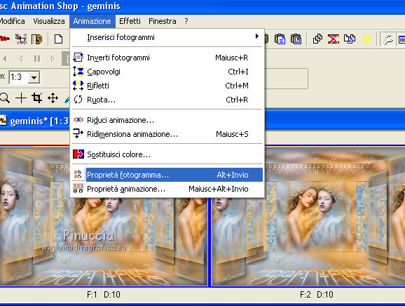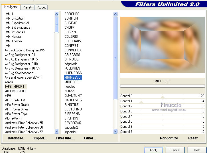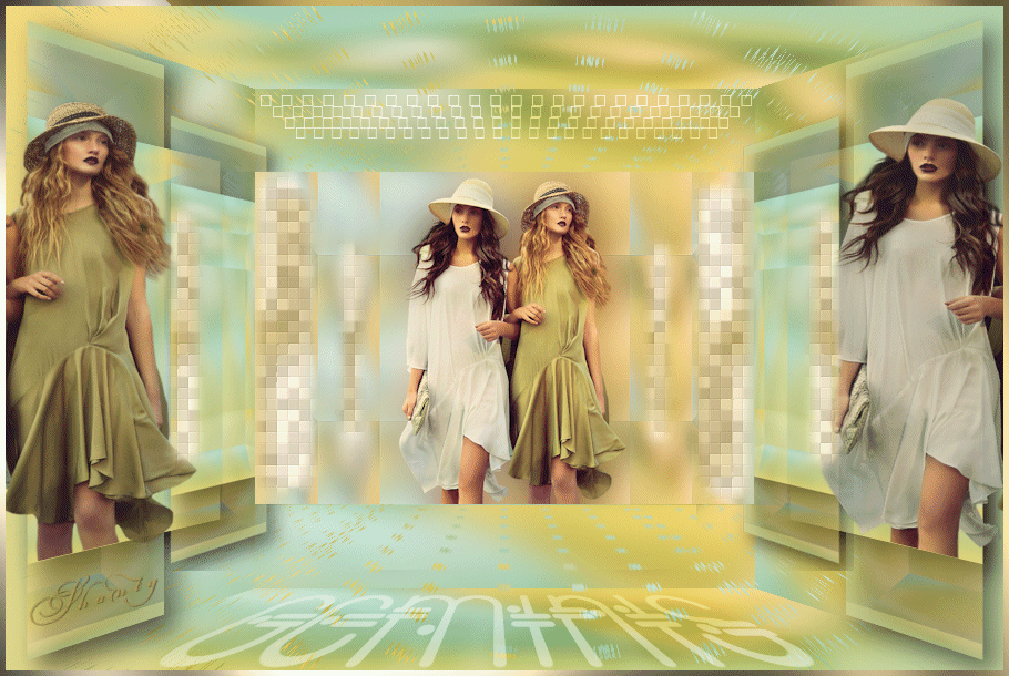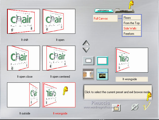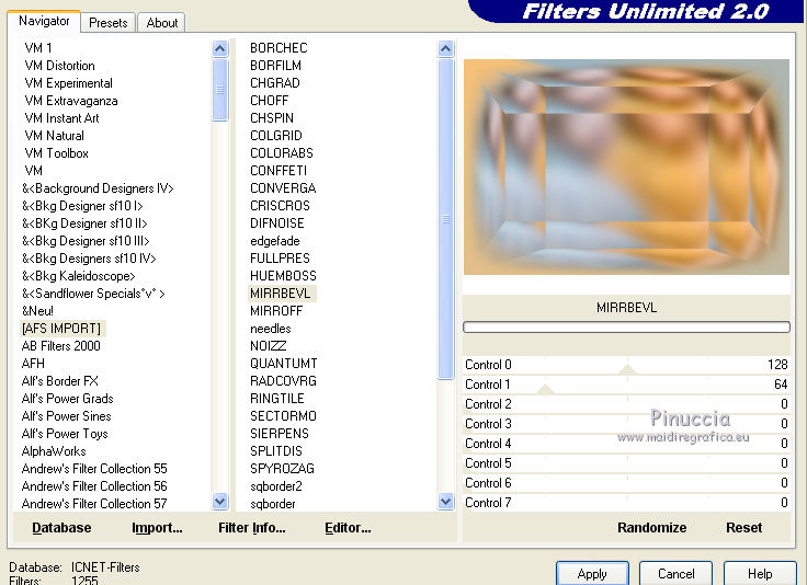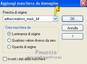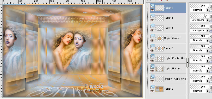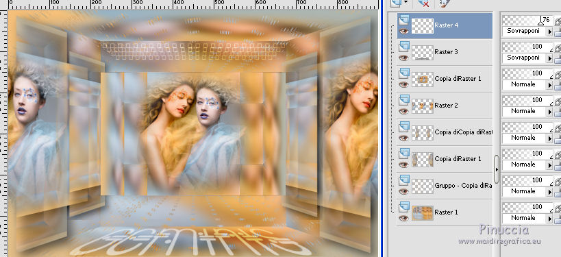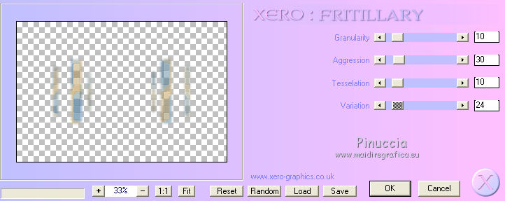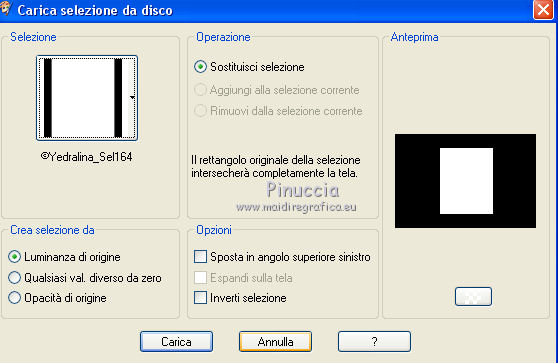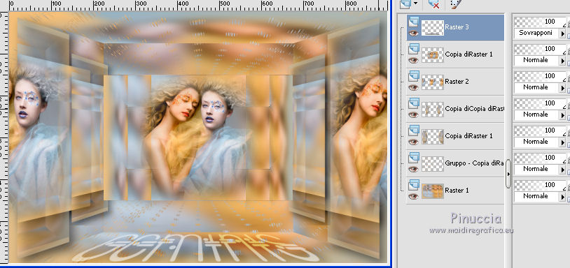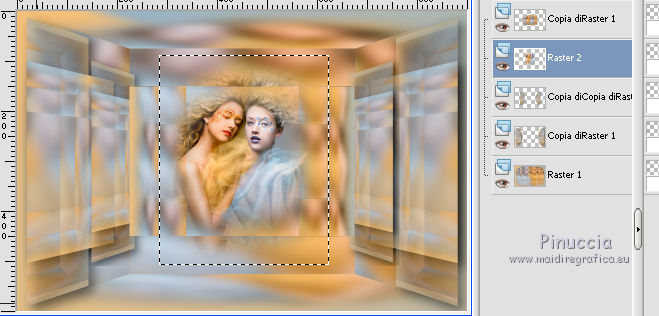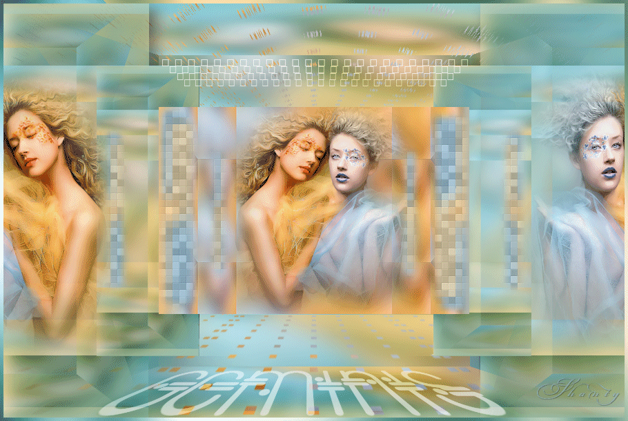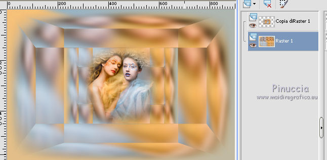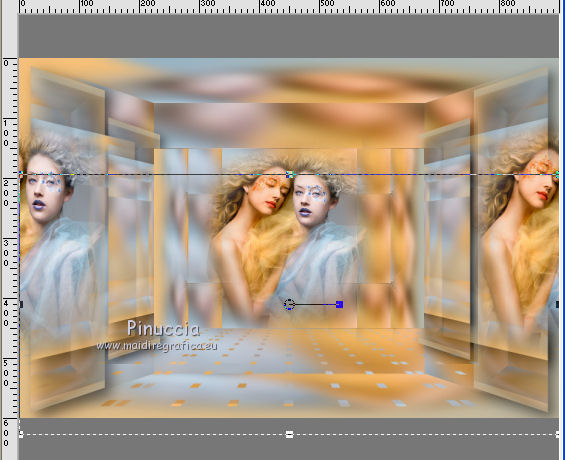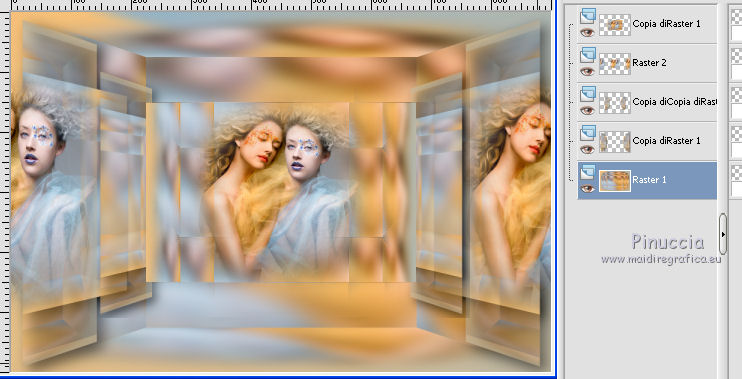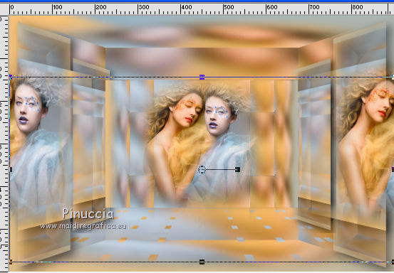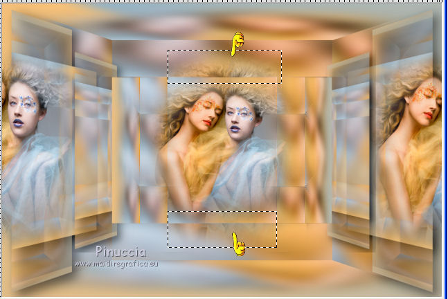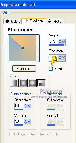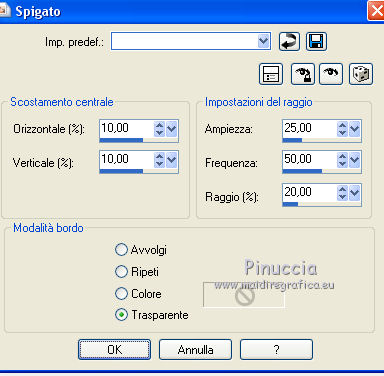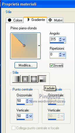 qui puoi trovare qualche risposta ai tuoi dubbi. Se l'argomento che ti interessa non è presente, ti prego di segnalarmelo. Questo tutorial è stato realizzato con Corel18 e tradotto con Corel X, ma può essere realizzato anche con le altre versioni di PSP. Dalla versione X4, il comando Immagine>Rifletti è stato sostituito con Immagine>Capovolgi in orizzontale, e il comando Immagine>Capovolgi con Immagine>Capovolgi in verticale. Nelle versioni X5 e X6, le funzioni sono state migliorate rendendo disponibile il menu Oggetti. Con la nuova versione X7, sono tornati Rifletti>Capovolgi, ma con nuove varianti. Vedi la scheda sull'argomento qui Occorrente: Un tube a scelta. Il resto del materiale qui Per il materiale grazie: Mentali per il tube mentali-misted905 (non fornito) Adita per la maschera aditascreations_mask_44 Il resto del materiale è di ©Yedralina. Filtri: se hai problemi con i filtri, consulta la mia sezione filtri qui Mura's Meister - Copies qui AFS IMPORT - Mirrbevl qui Andromeda Perspective qui Filters Unlimited 2.0 qui Alien Skin Eye Candy 5 Impact - Perspective Shadow qui Xero - Fritillary qui Animation Shop qui ![]() non esitare a cambiare modalità di miscelatura e opacità secondo i colori utilizzati. Nelle ultime versioni di PSP non c'è il gradiente di primo piano/sfondo (Corel_06_029) Trovi i gradienti delle versioni precedenti qui Metti le selezioni nella cartella Selezioni. Apri la maschera in PSP e minimizzala con il resto del materiale. 1. Scegli due colori dal tuo tube principale. Per l'esempio: Imposta il colore di primo piano con #f6c176, e il colore di sfondo con #92b2c6. ![]() Passa il colore di primo piano a Gradiente di primo piano/sfondo, stile Radiale. ![]() 2. Apri una nuova immagine trasparente 900 x 600 pixels e riempila con il gradiente.3. Selezione>Seleziona tutto. Apri il tuo tube. Immagine>Rifletti. Modifica>Copia, e minimizza il tube. Torna al tuo lavoro e vai a Modifica>Incolla nella selezione. Selezione>Deseleziona. 4. Regola>Sfocatura>Sfocatura gaussiana, raggio 25. ![]() 5. Effetti>Plugins>Filters Unlimited 2.0 - AFS IMPORT - Mirrbevl, con i settaggi standard ![]() Ripeti il filtro una seconda volta con gli stessi settaggi. ![]() 6. Livelli>Duplica. Effetti>Effetti di immagine>Motivo unico. ![]() Effetti>Effetti di bordo>Aumenta. 7. Attiva nuovamente il tuo tube. Modifica>Annulla azione Rifletti. Modifica>Copia. Torna al tuo lavoro e vai a Modifica>Incolla come nuovo livello. Livelli>Unisci>Unisci giù. Immagine>Ridimensiona, al 50%, tutti i livelli non selezionato. 8. Attiva il livello di sfondo. ![]() Livelli>Duplica. Immagine>Ridimensiona, al 70%, tutti i livelli non selezionato. Effetti>Plugins>Mura's Meister - Copies. ![]() 9. Effetti>Plugins>Andromeda - Perspective clicca sull'icona presets ![]() Imposta i settaggi e clicca sul segno di spunta in basso a destra per applicare ![]() Clicca nuovamente sul segno di spunta per confermare e chiudere. ![]() 10. Effetti>Effetti di riflesso>Specchio rotante. ![]() 11. Effetti>Plugins>Alien Skin Eye Candy 5 Impact - Perspective Shadow. Seleziona il preset Drop shadow blurry e ok. ![]() 12. Selezione>Carica/Salva selezione>Carica selezione da disco. Cerca e carica la selezione ©Yedralina_sel164. attenzione, per effetto delle regole dell'ordine alfabetico, trovi la selezione in cima alla lista, prima delle lettere ![]() Premi sulla tastiera il tasto CANC ![]() Mantieni selezionato. 13. Livelli>Duplica. Immagine>Ridimensiona, al 70%, tutti i livelli non selezionato. 14. Livelli>Nuovo livello raster. Modifica>Incolla nella selezione (il tube nel suo aspetto originale - senza rifletti - è ancora in memoria). ![]() Selezione>Deseleziona. 15. Effetti>Effetti di immagine>Motivo unico. ![]() 16. Attiva lo strumento Selezione , rettangolo,e seleziona le ombre, vedi l'esempio. ![]() Premi sulla tastiera il tasto CANC. Selezione>Deseleziona. 17. Attiva nuovamente il livello di sfondo Raster 1. ![]() Livelli>Duplica. Immagine>Rifletti. Livelli>Nuovo livello maschera>Da immagine. Apri il menu sotto la finestra di origine e vedrai la lista dei files aperti. Seleziona la maschera aditascreations_mask_44. ![]() Livelli>Unisci>Unisci gruppo. Per spostare la maschera, attiva lo strumento Spostamento ![]() o, per vedere meglio, premi il tasto K per attivare lo strumento Puntatore ![]() se stai usando PSP 9 tasto D per attivare lo strumento Deformazione ![]() ![]() e, tenendo premuto il tasto della maiuscola, clicca 1 volta sulla freccia giù della tastiera. ![]() Il livello si sposterà di 50 pixels. ![]() attenzione, questo sistema non funziona se non viene attivato lo strumento Spostamento/Puntatore e in PSP maiuscola+freccia sposta il livello di 10 pixels: pertanto dovrai cliccare sulla freccia 5 volte. Vedi la scheda sull'argomento qui Tasto M per deselezionare lo strumento. 18. Livelli>Duplica. Immagine>Capovolgi. Livelli>Unisci>Unisci giù. 19. Effetti>Effetti di distorsione>Spigato. ![]() 20. Apri il testo Geminis e vai a Modifica>Copia. Torna al tuo lavoro e vai a Modifica>Incolla come nuovo livello. Livelli>Disponi>Porta in alto. 21. Effetti>Effetti di immagine>Scostamento. ![]() Cambia la modalità di miscelatura di questo livello in Sovrapponi. ![]() 22. Apri il tube deco128 e vai a Modifica>Copia. Torna al tuo lavoro e vai a Modifica>Incolla come nuovo livello. 23. Effetti>Effetti di immagine>Scostamento. ![]() Cambia la modalità di miscelatura di questo livello in Sovrapponi, e abbassa l'opacità al 76%. ![]() 24. Livelli>Nuovo livello raster. Cambia i settaggi del gradiente, deselezionando Inverti ![]() Riempi il livello con il gradiente.Selezione>Seleziona tutto. Selezione>Modifica>Contrai - 5 pixesl. Premi sulla tastiera il tasto CANC. Selezione>Deseleziona. Dovresti avere questo. ![]() 25. Firma il tuo lavoro su un nuovo livello. Livelli>Unisci>Unisci visibile. 26. Livelli>Nuovo livello raster. Selezione>Carica/Salva selezione>Carica selezione da disco. Cerca e carica la selezione ©Yedralina_sel16