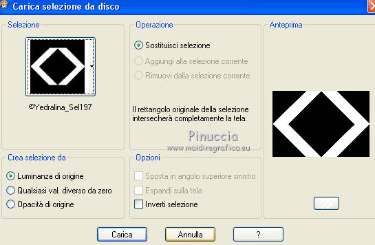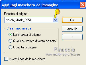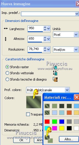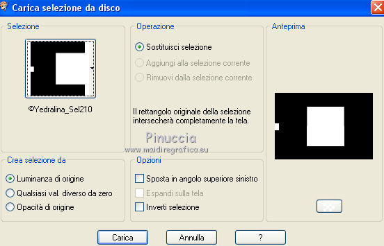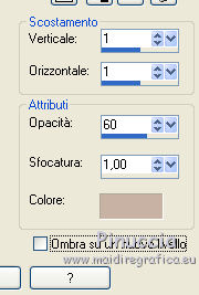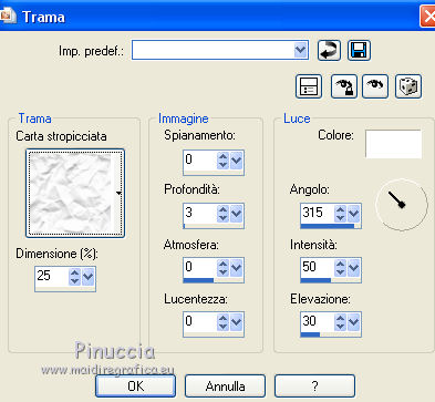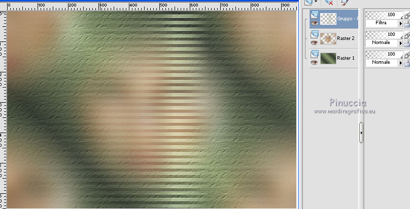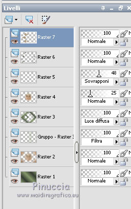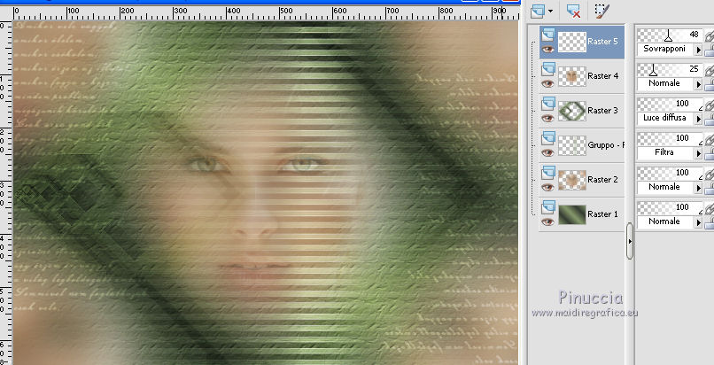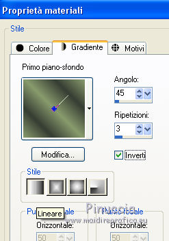 qui puoi trovare qualche risposta ai tuoi dubbi. Se l'argomento che ti interessa non è presente, ti prego di segnalarmelo. Questo tutorial è stato realizzato con Corel18 e tradotto con Corel X, CorelX17 e CorelX18, ma può essere realizzato anche con le altre versioni di PSP. Dalla versione X4, il comando Immagine>Rifletti è stato sostituito con Immagine>Capovolgi in orizzontale, e il comando Immagine>Capovolgi con Immagine>Capovolgi in verticale. Nelle versioni X5 e X6, le funzioni sono state migliorate rendendo disponibile il menu Oggetti. Con la nuova versione X7, sono tornati Rifletti>Capovolgi, ma con nuove varianti. Vedi la scheda sull'argomento qui traduzione in inglese qui le vostre versioni qui Occorrente: A scelta il misted di un personaggio. Il resto del materiale qui Tube utilizzato e non fornito: Misted di André Drevers_misted_face_25 La maschera è di Narah. (in questa pagina trovi i links ai loro siti). Filtri: se hai problemi con i filtri, consulta la mia sezione filtri qui Filters Unlimited 2.0 qui Toadies - what are you qui AAA Filters - Custom qui Alien Skin Eye Candy 5 Impact - Perspective Shadow qui I filtri Toadies si possono usare da soli o importati in Filters Unlimited (come fare vedi qui) Se un filtro fornito appare con questa icona ![]() non esitare a cambiare modalità di miscelatura e opacità secondo i colori utilizzati. Nelle ultime versioni di PSP non c'è il gradiente di primo piano/sfondo (Corel_06_029) Puoi usare i gradienti delle versioni precedenti. Trovi qui i gradienti Corel X. Metti il preset Emboss 3 nella cartella Impostazioni predefinite. La trama fornita corrisponde alla trama standard Carta stropicciata o Corel_15_038 delle successive versioni. Se non la trovi nel tuo PSP metti quella fornita nella cartella Trame. Metti il pennello nella cartella Pennelli. Attenzione, il pennello è composto da due files che non devono essere separati. Vedi gli appunti sui pennelli qui Metti le selezioni nella cartella Selezioni. Apri la maschera in PSP e minimizzala con il resto del materiale. colori utilizzati (3 colori scelti dal misted). ![]() 1. Imposta il colore di primo piano con il colore scuro #363d33 e il colore di sfondo con con il colore chiaro #889b6d. ![]() Passa il colore di primo piano a Gradiente di primo piano/sfondo, stile Lineare. ![]() 2. Apri una nuova immagine 950 x 650 pixels, sfondo gradiente. Dopo aver tolto la selezione a trasparente, clicca sulla paletta e avrai la tabella dei colori recenti. Clicca sulla palettina corrispondente per impostare lo sfondo della tua immagine. ![]() 3. Effetti>Effetti di trama>Trama seleziona la trama Carta stropicciata o Corel_15_038, con i seguenti settaggi. ![]() 4. Apri il tuo tube e vai a Modifica>Copia. Torna al tuo lavoro e vai a Modifica>Incolla come nuovo livello. 5. Effetti>Effetti di immagine>Motivo unico. ![]() 6. Regola>Sfocatura>Sfocatura gaussiana - raggio 25. ![]() 7. Livelli>Nuovo livello raster. Riempi con il colore di sfondo.8. Livelli>Nuovo livello maschera>Da immagine. Apri il menu sotto la finestra di origine e vedrai la lista dei files aperti. Seleziona la maschera Narah_Mask_0951. ![]() Livelli>Unisci>Unisci gruppo. Effetti>Effetti di bordo>Aumenta. 9. Immagine>Rifletti>Rifletti orizzontalmente. con le versioni meno recenti: Immagine>Rifletti Effetti>Effetti di bordo>Aumenta. Cambia la modalità di miscelatura di questo livello in Filtra. ![]() 10. Livelli>Nuovo livello raster. Selezione>Carica/Salva selezione>Carica selezione da disco. Cerca e carica la selezione ©yedralina_sel197. ![]() Riempi la selezione con il gradiente.Selezione>Deseleziona. 11. Effetti>Plugins>Toadies - What are you, con i settaggi standard. ![]() 12. Effetti>Effetti di riflesso>Fuga di specchi. ![]() Effetti>Effetti di bordo>Aumenta. 13. Cambia la modalità di miscelatura di questo livello in Luce diffusa. 14. Modifica>Incolla come nuovo livello (il tuo tube è ancora in memoria). Immagine>Ridimensiona, se e quanto necessario, per il mio tube all'85%, tutti i livelli non selezionato. Abbassa l'opacità di questo livello al 25%. 15. Apri il testo dekor3, e vai a Modifica>Copia. Torna al tuo lavoro e vai a Modifica>Incolla come nuovo livello. Immagine>Ridimensiona, al 115%, tutti i livelli non selezionato. 16. Oggetti>Allinea>Sinistra. Oggetti>Allinea>Superiore. con le versioni meno recenti: sposta il tube in alto a sinistra.![]() 17. Immagine>Immagine negativa. se stai usando PSP 9: Regola>Bilanciamento colore>Immagine negativa Cambia la modalità di miscelatura di questo livello in Sovrapponi. 18. Livelli>Duplica. Immagine>Rifletti>Rifletti orizzontalmente. Oggetti>Allinea>Inferiore. con le versioni meno recenti: Immagine>Rifletti. Sposta il testo in basso19. Livelli>Unisci>Unisci giù. Abbassa l'opacità di questo livello al 48%. ![]() 20. Livelli>Nuovo livello raster. Porta il colore di primo piano a Colore. Attiva lo strumento Pennello ![]() cerca e seleziona il pennello 607057df, dimensione 950 ![]() e applicalo al centro dell'immagine, cliccando con il tasto sinistro del mouse, per usare il colore scuro di primo piano. ![]() Se il tuo PSP non consente di usare pennelli superiori a 500 pixels, applicalo alla dimensione massima e poi allarga il pennello con lo strumento Puntatore ![]() ![]() 21. Effetti>Effetti 3D>Sfalsa ombra, con il terzo colore #c8b2a4. ![]() 22. Livelli>Nuovo livello raster. Selezione>Carica/Salva selezione>Carica selezione da disco. Cerca e carica la selezione ©yedralina_sel209. ![]() 23. Modifica>Copia speciale>Copia Unione. 24. Selezione>Modifica>Contrai - 40 pixels. Modifica>Incolla nella selezione. 25. Selezione>Inverti. Effetti>Plugins>Alien Skin Eye Candy 5 Impact - Perspective Shadow, seleziona il preset Drop Shadow,Lowest e ok. ![]() per il mio esempio ho preferito usare Drop Shadow Blurry Selezione>Deseleziona. 26. Immagine>Ridimensiona, all'80%, tutti i livelli non selezionato. 27. Effetti>Effetti di riflesso>Fuga di specchi, con i settaggi precedenti. ![]() 28. Se