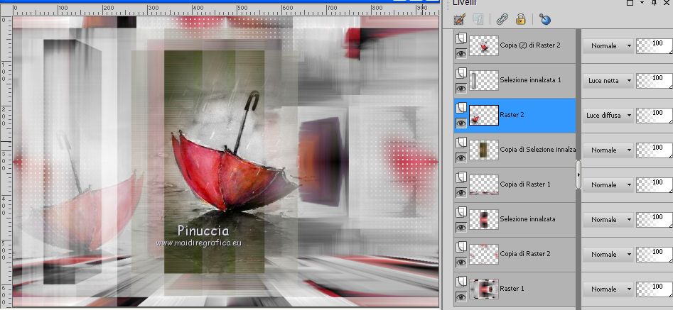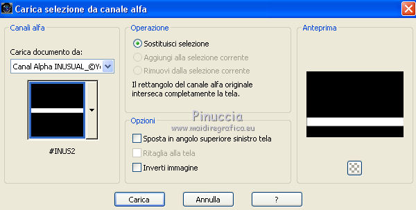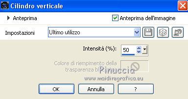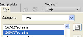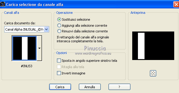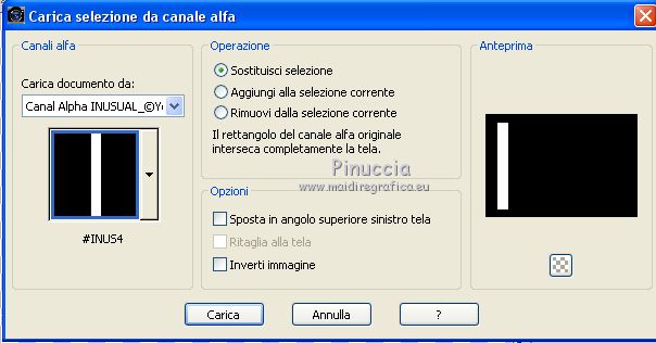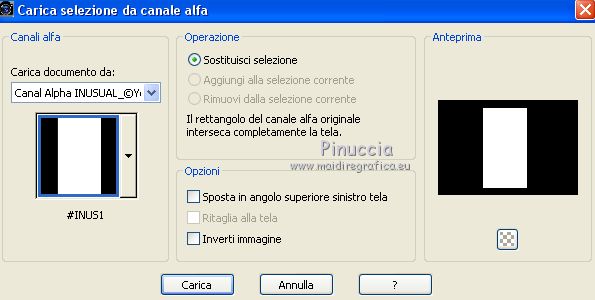 qui puoi trovare qualche risposta ai tuoi dubbi. Se l'argomento che ti interessa non è presente, ti prego di segnalarmelo. Questo tutorial è stato realizzato con Corel19 e tradotto con CorelX7, CorelX2 e CorelX3, ma può essere realizzato anche con le altre versioni di PSP. Dalla versione X4, il comando Immagine>Rifletti è stato sostituito con Immagine>Capovolgi in orizzontale, e il comando Immagine>Capovolgi con Immagine>Capovolgi in verticale. Nelle versioni X5 e X6, le funzioni sono state migliorate rendendo disponibile il menu Oggetti. Con la nuova versione X7, sono tornati Rifletti>Capovolgi, ma con nuove varianti. Vedi la scheda sull'argomento qui traduzione in francese/traduction en français qui/icitraduzione in inglese/english translation qui/hereVersioni/Versions qui Occorrente: Tube a scelta. Il resto del materiale qui Per il tube usato e non fornito grazie Maryse. Il resto del materiale è di Yedralina. (in questa pagina trovi i links ai siti dei creatori di tubes) Filtri: se hai problemi con i filtri, consulta la mia sezione filtri qui Filters Unlimited 2.0 qui Mehdi - Sorting Tiles qui AP Lines - Lines SilverLining qui Visual Manipulation qui Toadies - What are you qui Mura's Meister - Perspective Tiling qui Simple - Left Right Wrap (bonus) qui Alien Skin Eye Candy 5 Impact - Extrude qui AAA Frames - Foto Frame / AAA Filters - Custom (facoltativo) qui I filtri Visual Manipulation, Toadies e Simple si possono usare da soli o importati in Filters Unlimited (come fare vedi qui) Se un filtro fornito appare con questa icona ![]() non esitare a cambiare modalità di miscelatura e opacità secondo i colori utilizzati. Metti il preset Cliccando sul file una o due volte (a seconda delle tue impostazioni), automaticamente il preset si installerà nella cartella corretta. perchè uno o due clic vedi qui Se preferisci, puoi importare direttamente il preset nel corso del tutorial Come fare vedi la scheda del filtro Eye Candy qui Metti la maschera nella cartella Maschere. Metti i preset nella cartella Impostazioni predefinite. 1. Apri Canal Alpha_INUSUAL_©Yedralina. Questa immagine, che sarà la base del tuo lavoro, non è vuota, ma contiene le selezioni salvate sul canale alfa. Selezione>Seleziona tutto. Apri l'immagine in jpg e vai a Modifica>Copia. minimizza l'immagine. Torna al tuo lavoro e vai a Modifica>Incolla nella selezione. Selezione>Deseleziona. Effetti>Plugins>Mehdi - Sorting Tiles. ![]() Effetti>Effetti di immagine>Motivo unico. ![]() Effetti>Effetti di riflesso>Specchio rotante. ![]() 2. Attiva nuovamente l'immagine in jpg. Su questa immagine: Livelli>Carica/Salva maschera>Carica maschera da disco. Cerca e carica la maschera 20.20 ![]() Livelli>Duplica. Livelli>Unisci>Unisci gruppo. Modifica>Copia. Torna al tuo lavoro e vai a Modifica>Incolla come nuovo livello. Attiva lo strumento Puntatore ![]() apri il menu delle impostazioni e seleziona il preset 267-©Yedralina. ![]() ![]() Tasto M per deselezionare lo strumento. Livelli>Duplica - 2 volte. 3. Attiva il livello sottostante della prima copia (copia di Raster 2) Effetti>Plugins>Filters Unlimited 2.0 - Simple - Left Right Wrap ![]() Regola>Sfocatura>Sfocatura gaussiana, raggio 15. ![]() Effetti>Plugins>AP [Lines] - Lines SilverLining. ![]() Effetti>Effetti di bordo>Dilata. Effetti>Effetti di immagine>Motivo unico, con i settaggi precedenti. Livelli>Disponi>Sposta giù. 4. Attiva il livello inferiore, Raster 1. Selezione>Carica/Salva selezione>Carica selezione da canale alfa. La selezione #INUS1 è subito disponibile. Devi soltanto cliccare Carica. ![]() Selezione>Innalza selezione a livello. Livelli>Disponi>Sposta su. Selezione>Deseleziona. Livelli>Duplica. Effetti>Plugins>Visual Manipulation - Transmission ![]() Effetti>Plugins>Toadies - What are you, con i settaggi standard. ![]() il risultato può cambiare se usi la versione di Unlimited in versione software, o la versione che non si installa Qui sotto la versione in formato files 8bf. ![]() 5. Attiva nuovamente il livello inferiore, Raster 1. Livelli>Duplica. Effetti>Plugins>Mura's Meister - Perspective Tiling. ![]() Selezione>Carica/Salva selezione>Carica selezione da canale alfa. Apri il menu delle selezioni e carica la selezione #INUS2. ![]() Premi sulla tastiera il tasto CANC ![]() Selezione>Deseleziona. Livelli>Disponi>Sposta su - 2 volte. Attiva nuovamente il livello Raster 1. 6. Selezione>Carica/Salva selezione>Carica selezione da canale alfa. Apri il menu delle selezioni e carica la selezione #INUS3. ![]() Selezione>Innalza selezione a livello. Selezione>Deseleziona. Livelli>Disponi>Sposta su - 5 volte (deve essere il secondo livello dall'alto). Effetti>Plugins>Toadies - What are you, con i settaggi precedenti. Effetti>Effetti geometrici>Cilindro verticale. ![]() Selezione>Carica/Salva selezione>Carica selezione da canale alfa. Apri il menu delle selezioni e carica la selezione #INUS4. ![]() Effetti>Plugins>Alien Skin Eye Candy 5 Impact - Extrude seleziona il preset EC5_Extrude01-©Yedralina e ok ![]() Selezione>Inverti. Effetti>Effetti 3D>Sfalsa ombra, colore nero. ![]() Selezione>Deseleziona. Effetti>Effetti di riflesso>Specchio rotante, con i settaggi precedenti. ![]() Cambia la modalità di miscelatura di questo livello in Luce netta. 7. Attiva il livello sottostante, Raster 2. Attiva lo strumento Puntatore ![]() apri il menu dei preset e seleziona il preset 268-©Yedralina ![]() ![]() Livelli>Disponi>Sposta giù - 2 volte. FACOLTATIVO: Immagine>Capovolgi>Capovolgi orizzontale. se stai lavorando con una versione precedente: Immagine>Rifletti e attiva lo strumento Puntatore , preset 268©Yedralina![]() Cambia la modalità di miscelatura di questo livello in Luce diffusa, e abbassa l'opacità più o meno al 60%. (per entrambe le mie versioni ho lasciato a 100) ![]() 8. Livelli>Unisci>Unisci tutto. 9. Immagine>Aggiungi bordatura, 3 pixels, simmetriche, colore nero o grigio scuro. Selezione>Seleziona tutto. Modifica>Copia. Immagine>Aggiungi bordatura, 35 pi