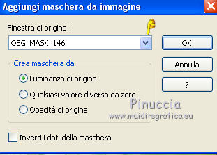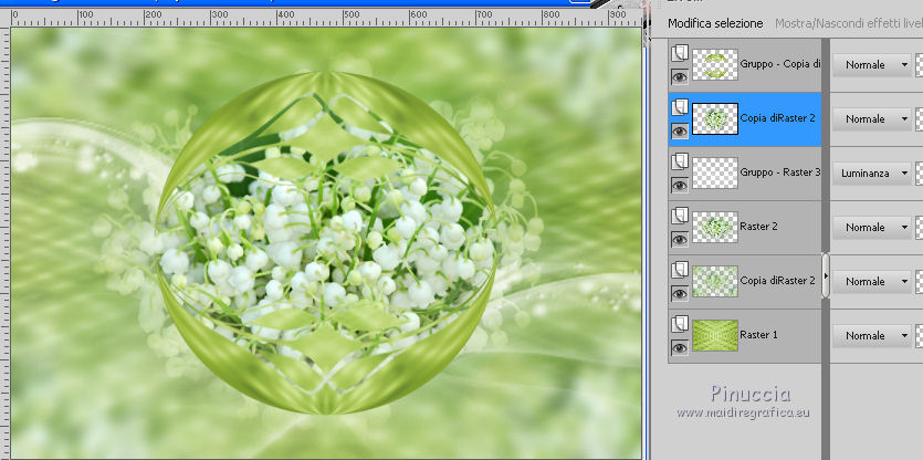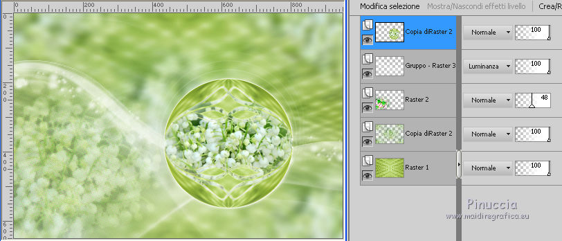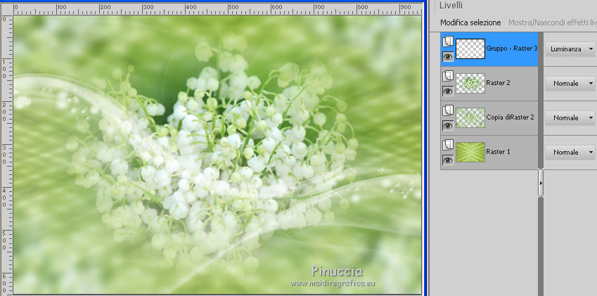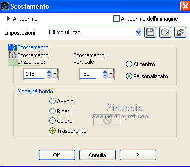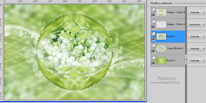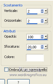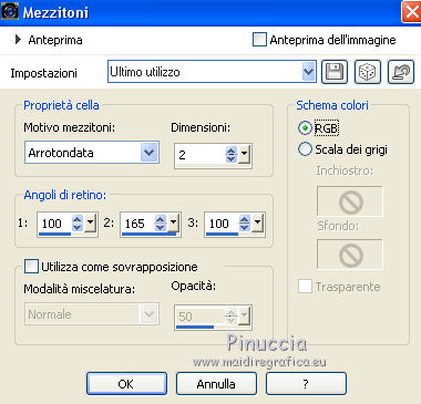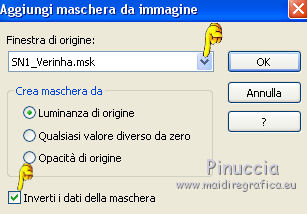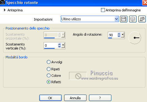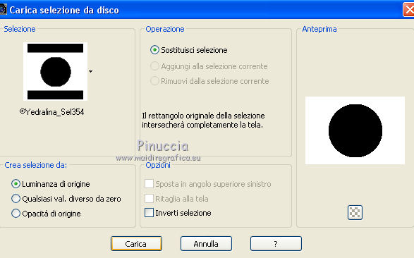 qui puoi trovare qualche risposta ai tuoi dubbi. Se l'argomento che ti interessa non è presente, ti prego di segnalarmelo. Questo tutorial è stato realizzato con Corel19 e tradotto con Corel X e CorelX17, ma può essere realizzato anche con le altre versioni di PSP. Dalla versione X4, il comando Immagine>Rifletti è stato sostituito con Immagine>Capovolgi in orizzontale, e il comando Immagine>Capovolgi con Immagine>Capovolgi in verticale. Nelle versioni X5 e X6, le funzioni sono state migliorate rendendo disponibile il menu Oggetti. Con la nuova versione X7, sono tornati Rifletti>Capovolgi, ma con nuove varianti. Vedi la scheda sull'argomento qui traduzione in inglese/english translation qui/here traduzione in francese/traduction en français ici Le vostre versioni/your versions qui/here Occorrente: Un tube accessorio Il resto del materiale qui Il tube accessorio, non incluso, è di Syl (SvB Vaasje met sneeuwvlokjes). Le Maschere sono di Occhiblu e Verinha (OBG_MASK_146/ SN1_Verinha.msk) Il resto del materiale è di Yedralina (in questa pagina trovi i links ai loro siti). Filtri: se hai problemi con i filtri, consulta la mia sezione filtri qui Filters Unlimited 2.0 qui Redfield - Ripples Magic qui Alien Skin Eye Candy 5 Impact - Backlight qui Simple - 4Way Average qui I filtri Simple si possono usare da soli o importati in Filters Unlimited (come fare vedi qui) Se un filtro fornito appare con questa icona ![]() non esitare a cambiare modalità di miscelatura e opacità secondo i colori utilizzati. Nelle ultime versioni di PSP non c'è il gradiente di primo piano/sfondo (Corel_06_029) Puoi usare i gradienti delle versioni precedenti. Trovi qui i gradienti Corel X. Metti il preset Cliccando sul file una o due volte (a seconda delle tue impostazioni), automaticamente il preset si installerà nella cartella corretta. perchè uno o due clic vedi qui Se preferisci, puoi importare direttamente il preset nel corso del tutorial Come fare vedi la scheda del filtro Eye Candy qui Metti i preset Preset_Pick_196 e Emboss 3 nella cartella Impostazioni predefinite. Metti la selezione nella cartella Selezioni. Apri le maschere in PSP e minimizzale con il resto del materiale. 1. Imposta il colore di primo piano con #72930e, e il colore di sfondo con #bbdb6e. ![]() Passa il colore di primo piano a Gradiente di primo piano/sfondo, stile Lineare. ![]() 2. Apri una nuova immagine trasparente 950 x 650 pixels. Riempi l'immagine trasparente con il gradiente.3. Effetti>Plugins>Redfield - Ripples Magic seleziona il preset Dance floor e cambia il Refraction con -50 ![]() Dovresti avere questo ![]() se hai problemi con il filtro, nel materiale trovi "file_redfield". Inizia il tutorial da questo file 4. Effetti>Effetti di riflesso>Specchio rotante, con i settaggi standard. ![]() 5. Effetti>Plugins>Filters Unlimited 2.0 - Simple - 4 Way Average. ![]() 6. Livelli>Nuovo livello raster. Selezione>Seleziona tutto. 7. Apri il misted 1518©Yedralina, e vai a Modifica>Copia. Torna al tuo lavoro e vai a Modifica>Incolla nella selezione. Selezione>Deseleziona. 8. Livelli>Duplica. 9. Effetti>Effetti di immagine>Motivo unico. ![]() 10. Regola>Sfocatura>Sfocatura gaussiana - raggio 10. ![]() 11. Livelli>Disponi>Sposta giù. 12. Livelli>Nuovo livello raster. Livelli>Disponi>Porta in alto. 13. Imposta il colore di sfondo con il colore bianco ![]() 14. Abbassa l'opacità dello strumento riempimento a 60 e riempi il livello con il colore bianco.(non dimenticare di riportare l'opacità a 100) 15. Livelli>Nuovo livello maschera>Da immagine. Apri il menu sotto la finestra di origine e vedrai la lista dei files aperti. Seleziona la maschera OBG_MASK_146. ![]() Livelli>Unisci>Unisci gruppo. 16. Immagine>Capovolgi. Immagine>Rifletti. 17. Effetti>Filtro definito dall'utente, seleziona il preset Emboss 3 e ok. ![]() 18. Cambia la modalità di miscelatura di questo livello in Luminanza, o come preferisci. ![]() 19. Attiva il livello di sfondo (Raster 1). Livelli>Duplica. Livelli>Disponi>Porta in alto. 20. Livelli>Nuovo livello maschera>Da immagine. Apri il menu sotto la finestra di origine e seleziona la maschera SN1_Verinha. ![]() Livelli>Unisci>Unisci gruppo. 21. Effetti>Effetti di riflesso>Specchio rotante. ![]() 22. Effetti>Effetti geometrici>Cerchio. ![]() 23. Immagine>Ridimensiona, all'80%, tutti i livelli non selezionato. 24. Selezione>Carica/Salva selezione>Carica selezione da disco. Cerca e carica la selezione ©Yedralina_Sel354. ![]() 25. Attiva il livello del misted, Raster 2. ![]() 26. Livelli>Duplica. Livelli>Disponi>Sposta su 27. Premi sulla tastiera il tasto CANC ![]() Selezione>Deseleziona. ![]() 28. Attiva nuovamente il livello superiore (Gruppo Raster 1). Effetti>Effetti di bordo>Aumenta. 29. Effetti>Effetti 3D>Sfalsa ombra, colore bianco ![]() 30. Livelli>Unisci>Unisci giù. 31. Immagine>Ridimensiona, all'80%, tutti i livelli non selezionato. 32. Effetti>Plugins>Alien skin Eye Candy 5 Impact - Backlight. Seleziona il preset EC5_BackL_FF03-©Yedralina e ok. Questi i settaggi, in caso di problemi con il preset. ![]() 33. Attiva nuovamente il livello del tube (Raster 2) ![]() 34. Effetti>Effetti artistici>Mezzitoni. ![]() 35. Attiva lo strumento Puntatore (tasto K sulla tastiera)apri il menu dei preset e seleziona il preset 196-©Yedralina ![]() Avrai questo ![]() Tasto M per deselezionare lo strumento. 36. Attiva il livello superiore Immagine>Ridimensiona, al 90%, tutti i livelli non selezionato. Effetti>Effetti di immagine>Scostamento ![]() ![]() 36. Immagine>Aggiungi bordatura, 2 pixel, simmetriche, colore scuro di primo piano. Immagine>Aggiungi bordatura, 10 pixels, simmetriche, colore bianco. Immagine>Aggiungi bordatura, 2 pixel, simmetriche, colore scuro di primo piano. Immagine>Aggiungi bordatura, 40 pixels, simmetriche, colore bianco. 37. Attiva lo strumento Bacchetta magica ![]() e clicca nel bordo bianco di 40 pixels per selezionarlo. 38. Selezione>Inverti. Effetti>Effetti 3D>Sfalsa ombra, colore nero. ![]() Selez