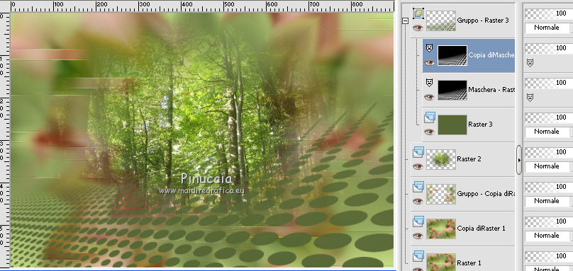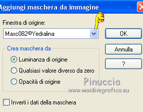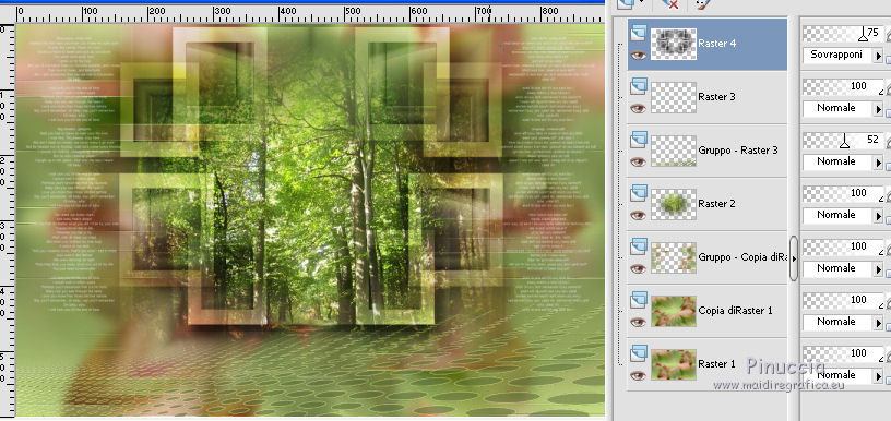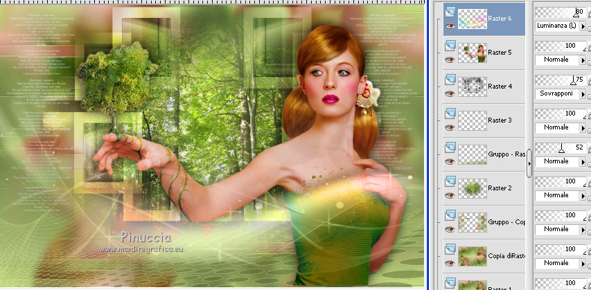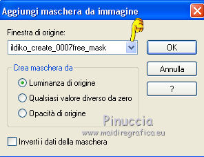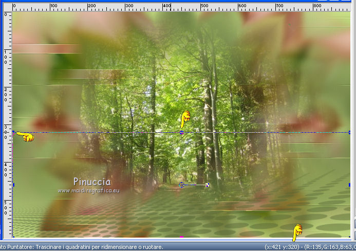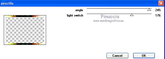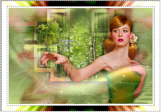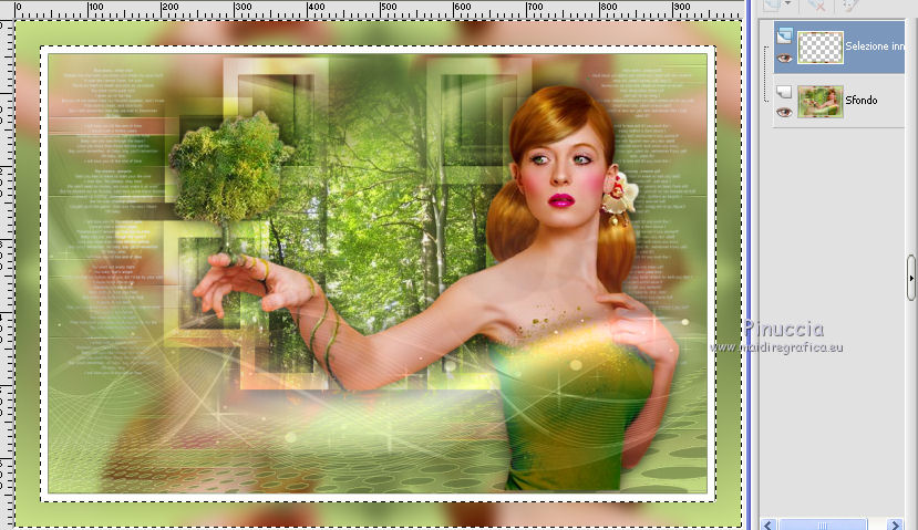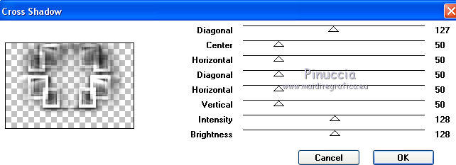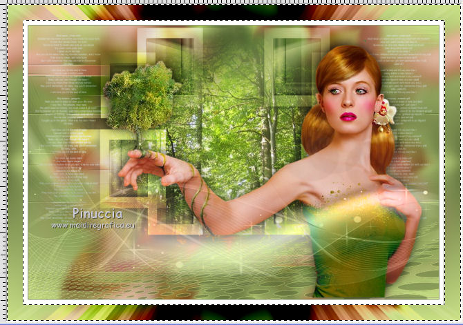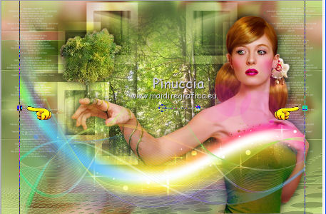 qui puoi trovare qualche risposta ai tuoi dubbi. Se l'argomento che ti interessa non è presente, ti prego di segnalarmelo. Questo tutorial è stato realizzato con Corel18 e tradotto con Corel X, ma può essere realizzato anche con le altre versioni di PSP. Dalla versione X4, il comando Immagine>Rifletti è stato sostituito con Immagine>Capovolgi in orizzontale, e il comando Immagine>Capovolgi con Immagine>Capovolgi in verticale. Nelle versioni X5 e X6, le funzioni sono state migliorate rendendo disponibile il menu Oggetti. Con la nuova versione X7, sono tornati Rifletti>Capovolgi, ma con nuove varianti. Vedi la scheda sull'argomento qui Occorrente: A scelta il tube di un personaggio e il misted di un paesaggio. Il resto del materiale qui Maschera Ildiko (ildiko_create_0007free_mask) Maschera (Masc082©Yedralina) Deco _0_fa2ab_f0ee790e_orig Text_021©Yedralina Deco0132©Yedralina Tubes usati e non inclusi nel materiale: donna: calguisprimavera21610 misted paesaggio: 1396©Yedralina.png. 2º VERSION 1 tube principal de ©Guismo (calguisblue11012016) 1 tube paisaje difuminado, personal (1383©Yedralina) Filtri: se hai problemi con i filtri, consulta la mia sezione filtri qui Filters Unlimited 2.0 qui &<Background Designer IV> - Splish (da importare in Unlimited) qui Alien Skin Eye Candy 5 Impact - Perspective Shadow qui Kang 1 - Penzilla qui Transparency - Eliminate white qui I filtri Transparency, Kang si possono usare da soli o importati in Filters Unlimited (come fare vedi qui) Se un filtro fornito appare con questa icona ![]() non esitare a cambiare modalità di miscelatura e opacità secondo i colori utilizzati. Nelle ultime versioni di PSP non c'è il gradiente di primo piano/sfondo (Corel_06_029) Puoi usare i gradienti delle versioni precedenti. Trovi qui i gradienti Corel X. Apri le maschere in PSP e minimizzale con il resto del materiale. Imposta il colore di primo piano con #576736 e il colore di sfondo con #cbe288. ![]() colori usati per la seconda versione: primo piano #3563ae, colore di sfondo #1effd8. ![]() terzo colore per entrambe le versioni: bianco #ffffff. 1. Passa il colore di primo piano a Gradiente di primo piano/sfondo, stile Lineare. ![]() Apri una nuova immagine trasparente 900 x 600 pixels e riempila con il gradiente.Selezione>Seleziona tutto. Apri il tuo tube principale e vai a Modifica>Copia. Torna al tuo lavoro e vai a Modifica>Incolla nella selezione. Selezione>Deseleziona. Effetti>Effetti di immagine>Motivo unico. ![]() Regola>Sfocatura>Sfocatura gaussiana - raggio 10. ![]() Livelli>Duplica. 2. Effetti>Plugins>Filters Unlimited 2.0 - &<Background Designer IV> - @Splish. ![]() 3. Attiva il livello di sfondo - Raster 1. Livelli>Duplica. Livelli>Disponi>Sposta su. Immagine>Rifletti. Livelli>Nuovo livello maschera>Da immagine. Apri il menu sotto la finestra di origine e vedrai la lista dei files aperti. Seleziona la maschera Masc082©Yedralina. ![]() Livelli>Unisci>Unisci gruppo. Effetti>Effetti di bordo>Aumenta. 4. Apri il misted del paesaggio e vai a Modifica>Copia. Torna al tuo lavoro e vai a Modifica>Incolla come nuovo livello. Immagine>Ridimensiona, se e quanto necessario (per me 80%), tutti i livelli non selezionato. 5. Livelli>Nuovo livello raster. Riporta il colore di primo piano a Colore, e riempi il livello con il colore scuro di primo piano.Livelli>Nuovo livello maschera>Da immagine. Apri il menu sotto la finestra di origine e seleziona la maschera ildiko_create_0007free_mask. ![]() Livelli>Duplica. ![]() Livelli>Unisci>Unisci gruppo. Abbassa l'opacità di questo livello al 52%. Tasto K per attivare lo strumento Puntatore ![]() se stai usando PSP 9 il tasto D per attivare lo strumento Deformazione ![]() in modalità Scala ,spingi il nodo superiore centrale verso il basso fino a 320 pixels. ![]() Tasto M per deselezionare lo strumento. Effetti>Effetti di bordo>Aumenta di più. 6. Apri Text_021©Yedralina.png e vai a Modifica>Copia. Torna al tuo lavoro e vai a Modifica>Incolla come nuovo livello. Effetti>Effetti di immagine>Scostamento. ![]() 7. Apri Deco0132©Yedralina e vai a Modifica>Copia. Torna al tuo lavoro e vai a Modifica>Incolla come nuovo livello. Effetti>Effetti di immagine>Scostamento, con i settaggi precedenti. ![]() Effetti>Plugins>Alien Skin Eye Candy 5 Impact - Perspective Shadow. Seleziona il preset Drop Shadow,Blurry e ok. ![]() Cambia la modalità di miscelatura di questo livello in Sovrapponi, e abbassa l'opacità al 75%. ![]() Effetti>Plugins>Graphics Plus - Cross Shadow. ![]() 8. Attiva nuovamente il tuo tube principale e vai a Modifica>Copia. Torna al tuo lavoro e vai a Modifica>Incolla come nuovo livello. Immagine>Ridimensiona, se e quanto necessario (per me al 120%), tutti i livelli non selezionato. Regola>Messa a fuoco>Metti a fuoco. Spostalo un po' più a destra.Effetti>Effetti 3D>Sfalsa ombra, colore nero. ![]() 9. Apri NOE_0_fa2ab_f0ee790e_orig e vai a Modifica>Copia. Torna al tuo lavoro e vai a Modifica>Incolla come nuovo livello. Tasto K per attivare lo strumento Puntatore ![]() se stai usando PSP 9 il tasto D per attivare lo strumento Deformazione ![]() in modalità Scala ,spingi i nodi centrali a destra e a sinistra fino ai bordi ![]() Tasto M per deselezionare lo strumento. Cambia la modalità di miscelatura di questo livello in Luminanza (esistente) e abbassa l'opacità all'80%. ![]() Regola>Messa a fuoco>Metti a fuoco. 10. Attiva il livello inferiore - Raster 1. Modifica>Copia (se vuoi, per precauzione, Modifica>Incolla come nuova immagine e minimizza). Immagine>Aggiungi bordatura, 1 pixel, simmetriche, colore scuro di primo piano. Immagine>Aggiungi bordatura, 10 pixels, simmetriche, colore bianco. Immagine>Aggiungi bordatura, 1 pixel, simmetriche, colore scuro di primo piano. Selezione>Seleziona tutto. 11. Immagine>Aggiungi bordatura, 35 pixels, simmetriche, colore chiaro di sfondo. Selezione>Inverti. Modifica>Incolla nella selezione. Immagine>Rifletti. Selezione>Innalza selezione a livello. ![]() 12. Effetti>Plugins>