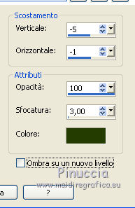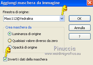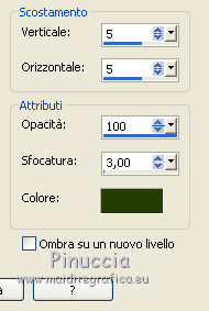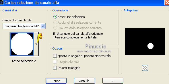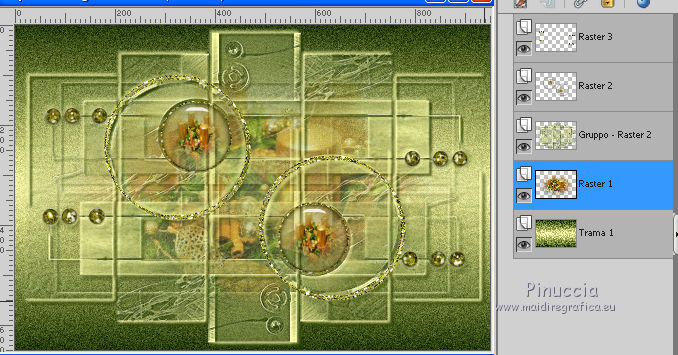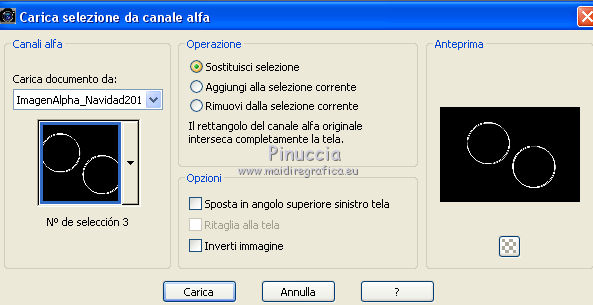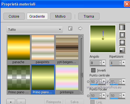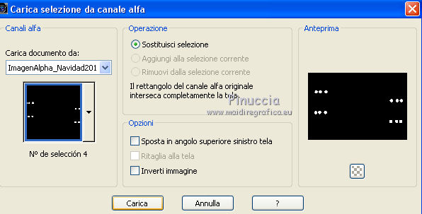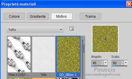 qui puoi trovare qualche risposta ai tuoi dubbi. Se l'argomento che ti interessa non è presente, ti prego di segnalarmelo. Questo tutorial è stato realizzato con Corel19 e tradotto con Corel X e CorelX17, ma può essere realizzato anche con le altre versioni di PSP. Dalla versione X4, il comando Immagine>Rifletti è stato sostituito con Immagine>Capovolgi in orizzontale, e il comando Immagine>Capovolgi con Immagine>Capovolgi in verticale. Nelle versioni X5 e X6, le funzioni sono state migliorate rendendo disponibile il menu Oggetti. Con la nuova versione X7, sono tornati Rifletti>Capovolgi, ma con nuove varianti. Vedi la scheda sull'argomento qui traduzione in inglese/english translation qui/herele vostre versioni/your versions qui Occorrente: Materiale qui Misted di Yedralina (1679©Yedralina) Tube principale trovato sul web (element 42) Filtri: se hai problemi con i filtri, consulta la mia sezione filtri qui Filters Unlimited 2.0 qui Alien Skin Eye Candy 5 Impact - Glass qui AAA Frames - Foto Frame qui Alien Skin Xenofex 2 - Constellation qui Animation Shop qui ![]() se non vuoi sentire la musica, premi il tasto ESC non esitare a cambiare modalità di miscelatura e opacità secondo i colori utilizzati. Nelle ultime versioni di PSP non c'è il gradiente di primo piano/sfondo (Corel_06_029) Puoi usare i gradienti delle versioni precedenti. Trovi qui i gradienti Corel X. Metti il preset Cliccando sul file una o due volte (a seconda delle tue impostazioni), automaticamente il preset si installerà nella cartella corretta. perchè uno o due clic vedi qui Se preferisci, puoi importare direttamente il preset nel corso del tutorial Come fare vedi la scheda del filtro Eye Candy qui Apri la maschera e il motivo oro in PSP e minimizzali con il resto del materiale. 1. Imposta il colore di primo piano con il colore scuro #253c00, e il colore di sfondo con il colore chiaro #ffffa3. ![]() Passa il colore di primo piano a Gradiente di primo piano/sfondo, stile Lineare. ![]() 2. Apri "ImagenAlpha_Navidad2017". Duplicala usando la combinazione di tasti maiuscola+D e chiudi l'originale. La copia, che sarà la base del tuo lavoro, non è vuota, ma contiene le selezioni salvate sul canale alfa. Riempi l'immagine trasparente con il gradiente.3. Effetti>Plugins>Filters Unlimited 2.0 - Noise Filters - Add Noise (Monochromatic) ![]() 4. Livelli>Nuovo livello raster. Selezione>Seleziona tutto. 5. Apri il tuo misted e vai a Modifica>Copia. Torna al tuo lavoro e vai a Modifica>Incolla nella selezione. Selezione>Deseleziona. Abbassa l'opacità di questo livello più o meno al 75% (dipende dal tube usato). 6. Livelli>Nuovo livello raster. Riempi con il colore chiaro di sfondo.7. Livelli>Nuovo livello maschera>Da immagine. Apri il menu sotto la finestra di origine e vedrai la lista dei files aperti. Seleziona la maschera Masc112©Yedralina ![]() Livelli>Unisci>Unisci gruppo. 8. Oggetti>Allinea>Inferiore Se stai usando una versione precedente che non dispone del menu oggetti, usa lo strumento Spostamento ![]() ![]() 9. Livelli>Duplica. Immagine>Rifletti>Rifletti verticalmente Immagine>Capovolgi>Capovolgi in orizzontale se stai usando una versione precedente: Immagine>Rifletti. Immagine>Capovolgi Livelli>Unisci>Unisci giù. Effetti>Effetti di bordo>Aumenta. 10. Effetti>Effetti 3D>Sfalsa ombra, colore scuro di primo piano. ![]() Risultato ![]() 11. Selezione>Carica/Salva selezione>Carica selezione da canale alfa. La selezione #1 è subito disponibile. Devi soltanto cliccare Carica. ![]() 12. Livelli>Nuovo livello raster. Passa il colore di primo piano a Motivi e seleziona la trama dorata DD_Glitter 2 (o, se preferisci, una a tua scelta) ![]() 13. Selezione>Modifica>Contrai - 4 pixels. Premi sulla tastiera il tasto CANC ![]() 14. Modifica>Incolla nella selezione (il tuo misted è sempre in memoria). 15. Effetti>Plugins>Alien Skin Eye Candy 5 Impact - Glass seleziona il preset ©Yedralina_Glass4. ![]() Questi i settaggi, in caso di problemi con il preset ![]() Selezione>Deseleziona. 16. Modifica>Copia. 17. Selezione>Carica/Salva selezione>Carica selezione da canale alfa. Apri il menu delle selezioni e carica la selezione #2. ![]() 18. Modifica>Incolla nella selezione. Se necessario: Regola>Messa a fuoco>Metti a fuoco. 19. Selezione>Carica/Salva selezione>Carica selezione da canale alfa. Apri il menu delle selezioni e carica la selezione #3. ![]() Riempi la selezione con il motivo oro.Effetti>Effetti di bordo>Aumenta. Selezione>Deseleziona. 20. Selezione>Carica/Salva selezione>Carica selezione da canale alfa. Apri il menu delle selezioni e carica la selezione #4. ![]() 21. Livelli>Nuovo livello raster. Riempi la selezione con il motivo oro.22. Effetti>Plugins>Alien Skin Eye Candy 5 Impact - Glass, con i settaggi precedenti. ![]() Selezione>Deseleziona. 23. Attiva il livello del misted - Raster 2. ![]() Livelli>Duplica. 24. Effetti>Effetti di immagine>Motivo unico. ![]() 25. Regola>Sfocatura>Sfocatura gaussiana - raggio 20. ![]() 26. Livelli>Disponi>Sposta giù. 27. Selezione>Seleziona tutto. Immagine>Aggiungi bordatura, 2 pixels, simmetriche, colore chiaro. 28. Selezione>Inverti. Riempi il livello con il motivo oro.Selezione>Deseleziona. 29. Modifica>Copia. per sicurezza, puoi fare Modifica>Incolla come nuova immagine 30. Immagine>Aggiungi bordatura, 25 pixels, simmetriche, colore chiaro. Selezione>Seleziona tutto. Immagine>Aggiungi bordatura, 2 pixels, simmetriche, colore chiaro. Selezione>Inverti. Riempi la selezione con il motivo oro.31. Selezione>Seleziona tutto. Immagine>Aggiungi bordatura, 25 pixels, simmetriche, colore chiaro. Selezione>Inverti. Modifica>Incolla nella selezione. 32. Selezione>Seleziona tutto. Selezione>Modifica>Contrai - 50 pixels. Selezione>Inverti. 33. Effetti>Plugins>AAA Frames - Foto Frame, con i settaggi standard. ![]() 34. Effetti>Effetti di riflesso>Specchio rotante. ![]() 35. Selezione>Seleziona tutto. Immagine>Aggiungi bordatura, 2 pixels, simmetriche, colore chiaro. Selezione>Inverti. R