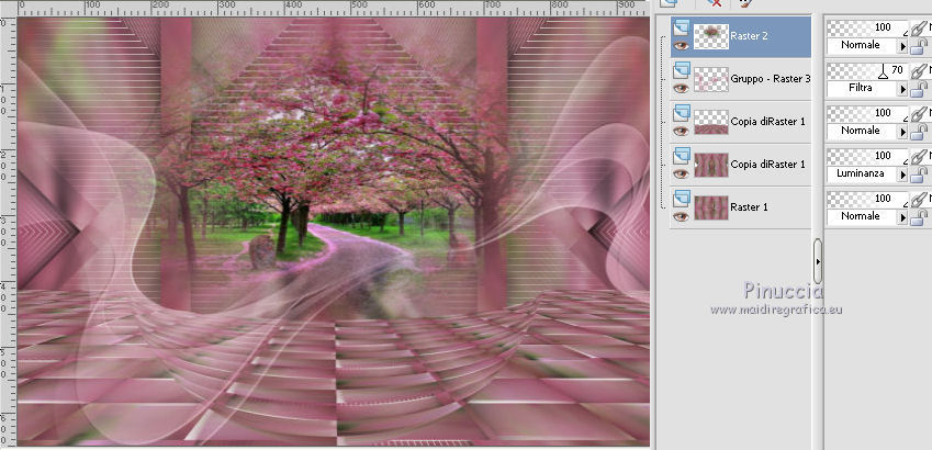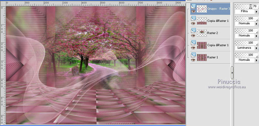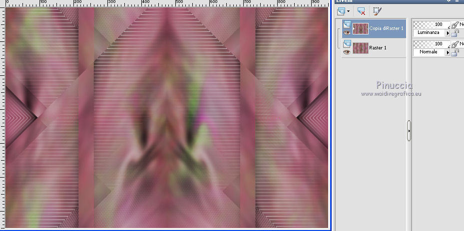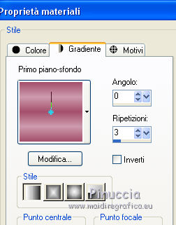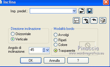 qui puoi trovare qualche risposta ai tuoi dubbi. Se l'argomento che ti interessa non è presente, ti prego di segnalarmelo. Questo tutorial è stato realizzato con Corel19 e tradotto con Corel X e CorelX17, ma può essere realizzato anche con le altre versioni di PSP. Dalla versione X4, il comando Immagine>Rifletti è stato sostituito con Immagine>Capovolgi in orizzontale, e il comando Immagine>Capovolgi con Immagine>Capovolgi in verticale. Nelle versioni X5 e X6, le funzioni sono state migliorate rendendo disponibile il menu Oggetti. Con la nuova versione X7, sono tornati Rifletti>Capovolgi, ma con nuove varianti. Vedi la scheda sull'argomento qui traduzione in inglese/english translation qui/here Le vostre versioni/your versions qui/here Occorrente: Il misted di un paeaggio e un personaggio Il resto del materiale qui Tubes non forniti: donna di Occhi Blu (OBG_2239) paesaggio di Kad (KaD_Scenery_Lente2) La maschera è di Ildiko (ildiko_create_0041free_mask) (in questa pagina trovi i links ai loro siti). Filtri: se hai problemi con i filtri, consulta la mia sezione filtri qui Mehdi - Sorting Tiles qui AP Lines - Lines SilverLining qui Mura's Meister - Perspective Tiling qui AAA Filters - Custom (facoltativo) qui ![]() non esitare a cambiare modalità di miscelatura e opacità secondo i colori utilizzati. Nelle ultime versioni di PSP non c'è il gradiente di primo piano/sfondo (Corel_06_029) Puoi usare i gradienti delle versioni precedenti. Trovi qui i gradienti Corel X. Metti i preset Preset_Pick_197 e Emboss 3 nella cartella Impostazioni predefinite. Apri la maschera in PSP e minimizzala con il resto del materiale. 1. Imposta il colore di primo piano con #a44f6c, e il colore di sfondo con #cd9bad. ![]() Passa il colore di primo piano a Gradiente di primo piano/sfondo, stile Lineare. ![]() 2. Apri una nuova immagine trasparente 950 x 650 pixels. Riempi l'immagine trasparente con il gradiente.3. Livelli>Nuovo livello raster. 4. Selezione>Seleziona tutto. 5. Apri il misted del paesaggio e vai a Modifica>Copia. Torna al tuo lavoro e vai a Modifica>Incolla nella selezione. Selezione>Deseleziona. 6. Effetti>Effetti di immagine>Motivo unico. ![]() 7. Regola>Sfocatura>Sfocatura gaussiana - raggio 10. ![]() 8. Livelli>Unisci>Unisci giù. 9. Livelli>Duplica. Attiva il livello di sfondo (raster 1). 10. Effetti>Plugins>AP [Lines] - Lines SilverLining. ![]() 11. Effetti>Effetti di riflesso>Specchio rotante. ![]() 12. Attiva nuovamente il livello superiore. Immagine>Ruota per gradi - 90 gradi a sinistra. ![]() 13. Immagine>Ridimensiona, all'80%, tutti i livelli non selezionato. 14. Effetti>Effetti 3D>Sfalsa ombra, colore scuro o nero. ![]() 15. Livelli>Unisci>Unisci giù. 16. Effetti>Effetti di immagine>Motivo unico, con i settaggi precedenti. ![]() 17. Livelli>Duplica. Effetti>Effetti geometrici>Inclina. ![]() 18. Livelli>Duplica. Immagine>Rifletti. Livelli>Unisci>Unisci giù. 19. Effetti>Effetti 3D>Sfalsa ombra, colore nero. ![]() 20. Effetti>Effetti di riflesso>Specchio rotante, con i settaggi precedenti. ![]() 21. Cambia la modalità di miscelatura di questo livello in Luminanza o Luminanza (esistente) Per il mio esempio ho fatto Luminanza ![]() 22. Livelli>Nuovo livello raster. Selezione>Seleziona tutto. Modifica>Incolla nella selezione (il tuo paesaggio è sempre in memoria). Selezione>Deseleziona. 23. Immagine>Ridimensiona, secondo il tuo tube, per il mio esempio al 75%, tutti i livelli non selezionato. Regola>Messa a fuoco>Metti a fuoco. 24. Oggetti>Allinea>Superiore se stai lavorando con una versione precedente che non disponibile il menu Oggetti, usa lo strumento Spostamento ![]() ![]() 25. Attiva il livello di sfondo, Raster 1. Livelli>Duplica. Livelli>Disponi>Porta in alto. 26. Effetti>Plugins>Mehdi - Sorting Tiles. ![]() 27. Effetti>Plugins>Mura's Meister - Perspective Tiling, con i settaggi standard. ![]() 28. Tasto K per attivare lo strumento Puntatore ![]() apri il menu dei preset e seleziona il preset 197-©Yedralina ![]() Se hai problemi con il preset, spingi il nodo centrale in alto verso il basso, fino al bordo sotto il triangolo ![]() Tasto M per deselezionare lo strumento. 29. Effetti>Effetti geometrici>Sfera. ![]() 30. Livelli>Nuovo livello raster. Riempi con il colore chiaro di sfondo.31. Livelli>Nuovo livello maschera>Da immagine. Apri il menu sotto la finestra di origine e vedrai la lista dei files aperti. Seleziona la maschera ildiko_create_0041free_mask. ![]() Livelli>Unisci>Unisci gruppo. 32. Effetti>Filtro definito dall'utente - seleziona il preset Emboss 3 e ok. ![]() 33. Cambia la modalità di miscelatura di questo livello in Filtra e abbassa l'opacità al 70%. ![]() 34. Attiva il livello del paesaggio (Raster 2). Livelli>Disponi>Porta in alto. ![]() 35. Attiva il livello di sfondo. Modifica>Copia se vuoi, per precauzione Modifica>Incolla come nuova immagine 36. Selezione>Seleziona tutto. Immagine>Aggiungi bordatura, 2 pixels, simmetriche, colore bianco. 37. Di nuovo Selezione>Seleziona tutto. Immagine>Aggiungi bordatura, simmetriche non selezionato, colore bianco. ![]() 38. Selezione>Inverti. Modifica>Incolla nella selezione (l'immagine di sfondo copiata al punto 35). 39. Regola>Sfocatura>Sfocatura gaussiana, raggio 20. ![]() 40. Selezione>Inverti. Effetti>Effetti 3D>Sfalsa ombra, colore nero. ![]() Selezione>Deseleziona. 41. Apri il tuo tube principale e vai a Modifica>Copia. Torna al tuo lavoro e vai a Modifica>Incolla come nuovo livello. Immagine>Ridimensiona, se e quanto necessario (per me 80%), tutti i livelli non selezionato. Spostalo a destra.Effetti>Effetti 3D>Sfalsa ombra, a scelta. 42. Immagine>Aggiungi bordatura, 2 pixels, simmetriche, colore scuro. 43. Immagine>Ridimensiona, 950 pixels di larghezza, tutti i livelli selezionato. 44. Firma il tuo lavoro su un nuovo livello. Livelli>Unisci>Unisci tutto. 45. Facoltativo: Effetti>Plugins>AAA Filters - Custom - clicca su Landscape e ok. Salva in formato jpg. I tubes di questo esempio sono di Azalee (Femme-1617-A