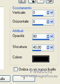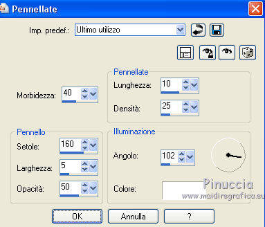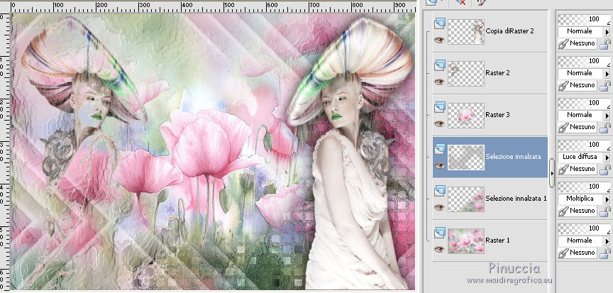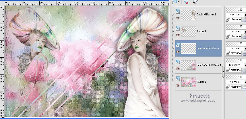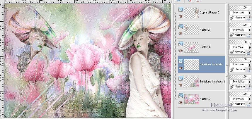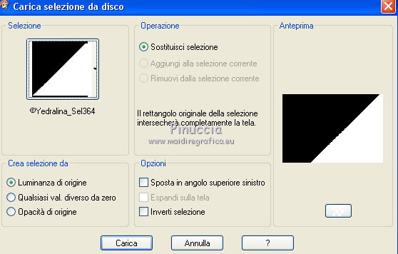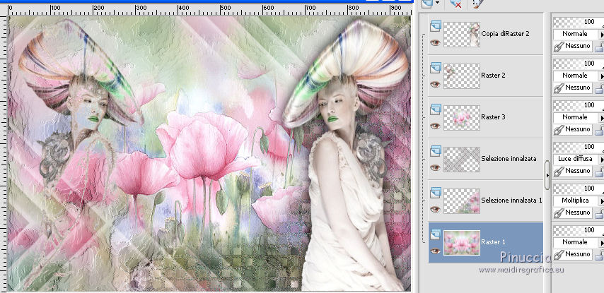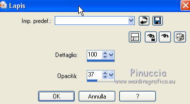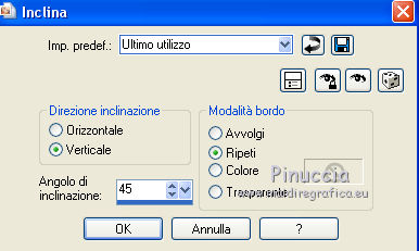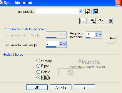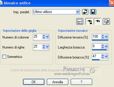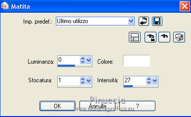 qui puoi trovare qualche risposta ai tuoi dubbi. Se l'argomento che ti interessa non è presente, ti prego di segnalarmelo. Questo tutorial è stato realizzato con Corel19 e tradotto con Corel X e CorelX17, ma può essere realizzato anche con le altre versioni di PSP. Dalla versione X4, il comando Immagine>Rifletti è stato sostituito con Immagine>Capovolgi in orizzontale, e il comando Immagine>Capovolgi con Immagine>Capovolgi in verticale. Nelle versioni X5 e X6, le funzioni sono state migliorate rendendo disponibile il menu Oggetti. Con la nuova versione X7, sono tornati Rifletti>Capovolgi, ma con nuove varianti. Vedi la scheda sull'argomento qui traduzione in inglese/english translation qui/here Le vostre versioni/your versions qui/here Occorrente: A scelta: un'immagine in jpg e il tube di una donna Il resto del materiale qui Materiale non fornito: immagine in jpg: flower-01, ricevuto da un gruppo di scambio. tube della donna di Guismo: calguisbeauty24022014). Il resto del materiale è di Yedralina (in questa pagina trovi i links ai loro siti). Filtri: se hai problemi con i filtri, consulta la mia sezione filtri qui Filters Unlimited 2.0 qui Visual Manipulation - Hue Transparency qui Alien Skin Eye Candy 5 Impact - Backlight qui Simple - Centre Tile qui AAA Filters - Custom qui I filtri Simple e Visual Manipulation si possono usare da soli o importati in Filters Unlimited (come fare vedi qui) Se un filtro fornito appare con questa icona ![]() non esitare a cambiare modalità di miscelatura e opacità secondo i colori utilizzati. Metti il preset Cliccando sul file una o due volte (a seconda delle tue impostazioni), automaticamente il preset si installerà nella cartella corretta. perchè uno o due clic vedi qui Se preferisci, puoi importare direttamente il preset nel corso del tutorial Come fare vedi la scheda del filtro Eye Candy qui Metti le selezioni nella cartella Selezioni. 1. Scegli due colori dalla tua immagine. Per l'esempio: Imposta il colore di primo piano con #c85a77, e il colore di sfondo con il colore bianco #ffffff. ![]() 1. Apri una nuova immagine trasparente 950 x 650 pixels. Selezione>Seleziona tutto. Apri la tua immagine in jpg e vai a Modifica>Copia. Torna al tuo lavoro e vai a Modifica>Incolla nella selezione. Selezione>Deseleziona. 2. Effetti>Effetti tecniche di disegno>Pennellate. ![]() 3. Selezione>Carica/Salva selezione>Carica selezione da disco. Cerca e carica la selezione ©Yedralina_sel332 ![]() Selezione>Innalza selezione a livello. Selezione>Deseleziona. Effetti>Effetti geometrici>Inclina ![]() Avrai questo ![]() 4. Apri il tuo tube e vai a Modifica>Copia. Torna al tuo lavoro e vai a Modifica>Incolla come nuovo livello. Tasto K per attivare lo strumento Puntatore ![]() e tira i nodi centrali ![]() per tutta l'altezza della tela ![]() Tasto M per deselezionare lo strumento. naturalmente, questo dipende dal tuo tube Nel secondo esempio non è stato necessario, ma ho dovuto ridimensionare 5. Livelli>Duplica. Oggetti>Allinea>Destra Se stai usando una versione precedente a Corel X17, il menu Oggetti>Allinea non è disponibile. Usa lo strumento Spostamento ![]() ![]() Effetti>Effetti 3D>Sfalsa ombra, colore nero. ![]() 6. Attiva il livello sottostante dell'originale. Immagine>Capovolgi>Capovolgi orizzontale. Se stai usando una versione precedente Immagine>Rifletti. Oggetti>Allinea>Sinistra - o usa lo strumento Spostamento ![]() ![]() A questo punto, puoi giocare con le opzioni, secondo il tuo gusto e la tua immagine: Lapis o Matita. Per il mio tube, ho usato: Effetti>Effetti tecniche di disegno>Matita ![]() Effetti>Plugins>Filters Unlimited 2.0 - Visual Manipulation - Hue Transparency ![]() Modalità di miscelatura: Normale. Per il secondo esempio, ho usato Effetti>Effetti tecniche di disegno>Lapis ![]() Effetti>Plugins>Filters Unlimited 2.0 - Visual Manipulation - Hue transparency cambia Tolerance a tuo piacimento o secondo il tuo tube ![]() Modalità di miscelatura Luminanza 7. Attiva il livello di sfondo. Selezione>Carica/Salva selezione>Carica selezione da disco. Cerca e carica la selezione ©Yedralina_sel364 ![]() Selezione>Innalza selezione a livello. Effetti>Effetti di trama>Mosaico antico ![]() Selezione>Deseleziona. Effetti>Effetti di bordo>Aumenta. Cambia la modalità di miscelatura di questo livello in Moltiplica. Attiva il livello soprastante (selezione innalzata) ![]() 8. Livelli>Nuovo livello raster. Selezione>Carica/Salva selezione>Carica selezione da disco. Cerca e carica la selezione ©Yedralina_sel363 ![]() Attiva nuovamente l'immagine in jpg e vai a Modifica>Copia. Torna al tuo lavoro e vai a Modifica>Incolla nella selezione. Selezione>Modifica>Sfuma interno/esterno. ![]() Selezione>Inverti. Premi da 3 a 5 volte sulla tastiera il tasto CANC ![]() per sfumare l'immagine con lo sfondo ![]() Selezione>Deseleziona. Effetti>Effetti di bordo>Aumenta. 9. Attiva nuovamente il livello Selezione innalzata ![]() Effetti>Plugins>Alien Skin Eye Candy 5 Impact - Backlight. Seleziona il preset EC5_BackL_FF02-©Yedralina Questi i settaggi, in caso di problemi con il preset. ![]() 10. Effetti>Plugins>Simple - Centre Tile. Il filtro lavora senza finestre; questo il risultato ![]() Effetti>Effetti 3D>Sfalsa ombra, colore nero. ![]() Cambia la modalità di miscelatura di questo livello in Luce diffusa. ![]() 11. Attiva il livello di sfondo, Raster 1. Effetti>Effetti di riflesso>Specchio rotante. ![]() 12. Dovresti avere questo ![]() 13. Immagine>Aggiungi bordatura, 2 pixels, simmetriche, colore bianco. Immagine>Aggiungi bordatura, 2 pixels, simmetriche, colore di primo piano. Selezione>Seleziona tutto. 14. Immagine>Aggiungi bordatura, 20 pixels, simmetriche, colore bianco. Selezione>Inverti. Effetti>Effetti 3D>Sfalsa ombra, colore nero. ![]() 15. Immagine>Aggiungi bordatura, 2 pixels, simmetriche, colore di primo piano. Immagine>Aggiungi bordatura, 2 pixels, simmetriche, colore bianco. Selezione>Seleziona tutto. 16. Immagine>Aggiungi bordatura, 40 pixels, simmetri