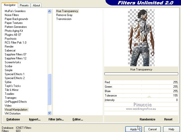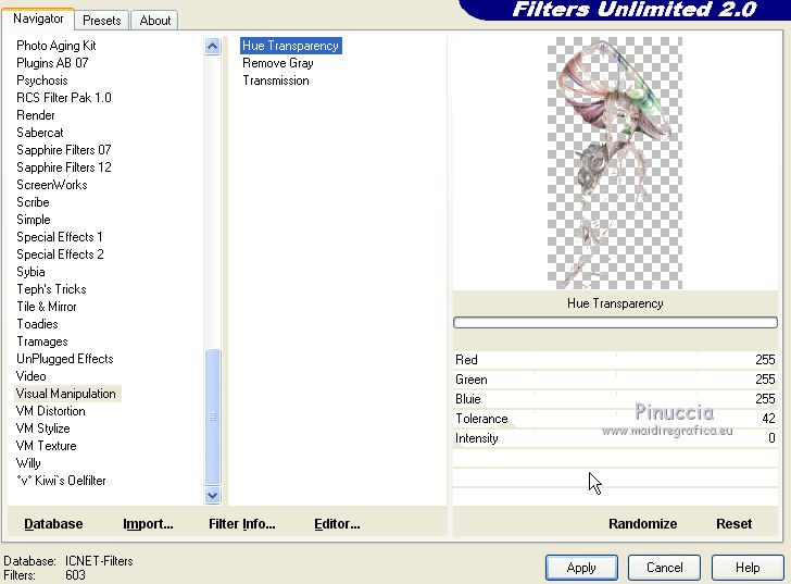 Effects>Plugins>Filters Unlimited 2.0 - Visual Manipulation - Hue transparency