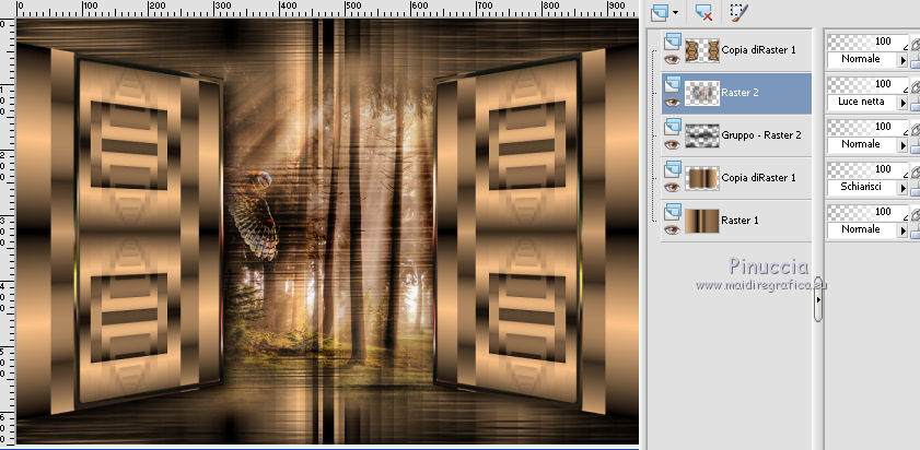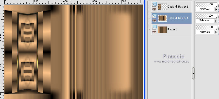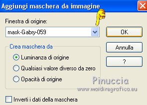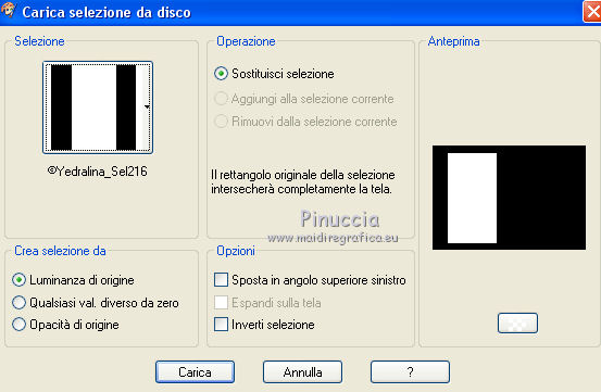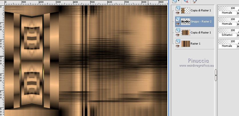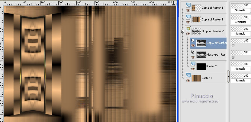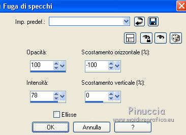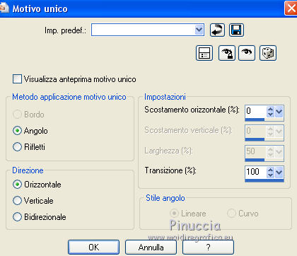 qui puoi trovare qualche risposta ai tuoi dubbi. Se l'argomento che ti interessa non è presente, ti prego di segnalarmelo. Questo tutorial è stato realizzato con Corel19 e tradotto con Corel X, CorelX17, ma può essere realizzato anche con le altre versioni di PSP. Dalla versione X4, il comando Immagine>Rifletti è stato sostituito con Immagine>Capovolgi in orizzontale, e il comando Immagine>Capovolgi con Immagine>Capovolgi in verticale. Nelle versioni X5 e X6, le funzioni sono state migliorate rendendo disponibile il menu Oggetti. Con la nuova versione X7, sono tornati Rifletti>Capovolgi, ma con nuove varianti. Vedi la scheda sull'argomento qui traduzione in inglese/english translation qui/here Le vostre versioni/your versions qui/here Occorrente: A scelta il misted di un paesaggio e il tube di un personaggio. Il resto del materiale qui Per i tubes usati e non forniti, grazie: Malacka per il tube della donna: malackatube v340 Dani@ per il tube del paesaggio: Dani@1831) No incluido Gabry per la maschera: mask-Gabry-059. Filtri: se hai problemi con i filtri, consulta la mia sezione filtri qui Alien Skin Eye Candy 5 Impact - Perspective Shadow, Chrome, Bevel qui L&K's - L&K's Maxime qui Imagenie - Imagenie Auto Adjustement qui Andromeda - Perspective qui ![]() non esitare a cambiare modalità di miscelatura e opacità secondo i colori utilizzati. Nelle ultime versioni di PSP non c'è il gradiente di primo piano/sfondo (Corel_06_029) Puoi usare i gradienti delle versioni precedenti. Trovi qui i gradienti Corel X. Metti la selezione nella cartella Selezioni. Apri la maschera in PSP e minimizzala con il resto del materiale. 1. Imposta il colore di primo piano con il colore nero #000000 e il colore di sfondo con il colore chiaro #f5be86. ![]() Passa il colore di primo piano a Gradiente di primo piano/sfondo, stile Lineare. ![]() 2. Apri una nuova immagine trasparente 950 x 650 pixels, e riempila con il gradiente.3. Effetti>Plugins>Imagenie - Imagenie auto Adjustement, con i settaggi standard. ![]() 4. Livelli>Duplica. Chiudi questo livello e attiva il livello originale Raster 1. 5. Effetti>Plugins>L&K's - L&K's Maxime. ![]() 6. Riapri e attiva il livello superiore Copia di Raster 1. Effetti>Effetti di riflesso>Fuga di specchi. ![]() 7. Effetti>Effetti di riflesso>Specchio rotante. ![]() 8. Effetti>Effetti di immagine>Motivo unico. ![]() 9. Immagine>Ridimensiona, al 60%, tutti i livelli non selezionato. 10. Immagine>Ruota per gradi - 90 gradi a destra ![]() 11. Oggetti>Allinea>Sinistra (nelle ultime versioni di PSP). Per le versioni precedenti: sposta l'immagine a sinistra.12. Selezione>Carica/Salva selezione>Carica selezione da disco. Cerca e carica la selezione ©Yedralina_Sel216. ![]() Se l'immagine è correttamente posizionata dovresti avere questo ![]() 13. Selezione>Modifica>Seleziona bordature selezione. ![]() 14. Effetti>Pluglins>Alien Skin Eye Candy 5 Impact - Chrome. Seleziona il preset Night e ok. ![]() 15. Selezione>Deseleziona. 16. Effetti>Plugins>Andromeda - Perspective clicca sull'icona Presets ![]() imposta i settaggi e clicca sul segno di spunta in basso a destra per applicare. ![]() Di nuovo clicca sul segno di spunta in basso a destra per chiudere la finestra del filtro. ![]() 17. Oggetti>Allinea>Sinistra (nelle ultime versioni di PSP). Per le versioni precedenti: sposta l'immagine a sinistra.18. Effetti>Effetti di riflesso>Specchio rotante, con i settaggi precedenti. ![]() 19. Effetti>Plugins>Alien Skin Eye Candy 5 Impact - Perspective Shadow. Seleziona il preset Drop Shadow Blurry e ok (se stai usando altri colori, sotto Basic cambia il colore con il tuo colore scuro) ![]() Attiva il livello di sfondo Raster 1. 20. Livelli>Duplica. Immagine>Ridimensiona, all'80%, tutti i livelli non selezionato. 21. Immagine>Rifletti>Rifletti orizzontalmente (nelle versioni precedenti Immagine>Rifletti). 22. Regola>Sfocatura>Sfocatura gaussiana - raggio 20. ![]() 23. Cambia la modalità di miscelatura di questo livello in Schiarisci. ![]() Attiva il livello di sfondo. 24. Riporta il colore di primo piano a Colore. Livelli>Nuovo livello raster. Riempi con il colore scuro di primo piano.25. Livelli>Nuovo livello maschera>Da immagine. Apri il menu sotto la finestra di origine e vedrai la lista dei files aperti. Seleziona la maschera mask-Gabry-059. ![]() Livelli>Duplica. ![]() Livelli>Unisci>Unisci gruppo. 26. Effetti>Effetti di immagine>Motivo unico. ![]() 27. Effetti>Effetti di distorsione>Vento - da sinistra, intensità 100. ![]() 28. Livelli>Disponi>Sposta su ![]() 28. Apri il misted del paesaggio e vai a Modifica>Copia. Torna al tuo lavoro e vai a Modifica>Incolla come nuovo livello (per il mio tube: Immagine>Capovolgi>Capovolgi orizzontale; nelle precedenti versioni: Immagine>Rifletti). 29. Cambia la modalità di miscelatura di questo livello in Luce netta, o secondo i tuoi colori. ![]() 30. Attiva il livello inferiore Raster 1. Modifica>Copia. 31. Immagine>Aggiungi bordatura, 2 pixels, simmetriche, con il colore chiaro di sfondo. Selezione>Seleziona tutto. 32. Immagine>Aggiungi bordatura, 35 pixels, simmetriche, con un colore qualsiasi. Selezione>Inverti. 33. Modifica>Incolla nella selezione. 34. Regola>Sfocatura>Sfocatura gaussiana - raggio 10. ![]() 35. Selezione>Inverti. Effetti>Effetti di immagine>Motivo unico. ![]() 36. Selezione>Inverti. Effetti>Plugins>Alien Skin Eye Candy 5 Impact - Bevel. Seleziona il preset Hump Edge,Inside e ok. ![]() 37. Selezione>Deseleziona. 38. Apri il tube del personaggio e vai a Modifica>Copia. Torna al tuo lavoro e vai a Modifica>Incolla come nuovo livello. Immagine>Ridimensiona, se e quanto necessario, tutti i livelli non selezionato. Sposta il tube a destra, vedi il mio esempio.39. Effetti>Effetti 3D>Sfalsa ombra, con settaggi a scelta. 40. Apri il tube text_Pinuccia e vai a Modifica>Copia. Torna al tuo lavoro e vai a Modifica>Incolla come nuovo livello. Spostalo in alto, vedi il mio esempio.Cambia la modalità di miscelatura di questo livello in S