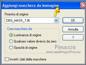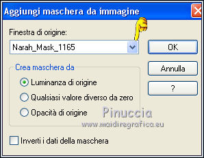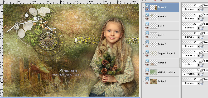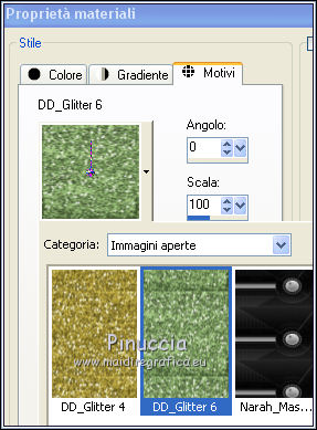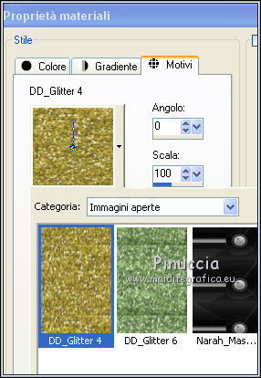 qui puoi trovare qualche risposta ai tuoi dubbi. Se l'argomento che ti interessa non è presente, ti prego di segnalarmelo. Questo tutorial è stato realizzato con Corel19 e tradotto con CorelX7, CorelX2 e CorelX3, ma può essere realizzato anche con le altre versioni di PSP. Dalla versione X4, il comando Immagine>Rifletti è stato sostituito con Immagine>Capovolgi in orizzontale, e il comando Immagine>Capovolgi con Immagine>Capovolgi in verticale. Nelle versioni X5 e X6, le funzioni sono state migliorate rendendo disponibile il menu Oggetti. Con la nuova versione X7, sono tornati Rifletti>Capovolgi, ma con nuove varianti. Vedi la scheda sull'argomento qui traduzione in francese/traduction en français qui/icitraduzione in inglese/english translation qui/hereVersioni/Versions qui ![]() Occorrente: Tube a scelta. Il resto del materiale qui Per i tubes usati e non forniti, grazie tube della donna Mina (Mina.4381.Bimba.11.16) misted di Nikita (13508436294_noel_nikita) Per le maschere grazie Narah (Narah_Mask_1165) e OBG (OBG MASK_136) (in questa pagina trovi i links ai siti dei creatori di tubes) Filtri: se hai problemi con i filtri, consulta la mia sezione filtri qui AAA Filters - Custom (facoltativo) qui Alien Skin Eye Candy 5 Impact - Glass qui ![]() non esitare a cambiare modalità di miscelatura e opacità secondo i colori utilizzati. Metti i presets Cliccando sul file una o due volte (a seconda delle tue impostazioni), automaticamente il preset si installerà nella cartella corretta. perchè uno o due clic vedi qui Se preferisci, puoi importare direttamente il preset nel corso del tutorial Come fare vedi la scheda del filtro Eye Candy qui Metti la selezione nella cartella Selezioni. Apri le maschere e le trame glitter in PSP e minimizzali con il resto del materiale. 1. Imposta il colore di primo piano con #4e4d34, e il colore di sfondo con #c9c49d ![]() Apri una nuova immagine trasparente 950 x 650 pixels. Riempi l'immagine trasparente con il colore chiaro di sfondo.Selezione>Seleziona tutto. Apri il tube principale e vai a Modifica>Copia. minimizza il tube Torna al tuo lavoro e vai a Modifica>Incolla nella selezione. Selezione>Deseleziona. Effetti>Effetti di immagine>Motivo unico. ![]() Regola>Sfocatura>Sfocatura gaussiana - raggio 20. ![]() 2. Livelli>Nuovo livello raster. Passa il colore di primo piano a Motivi sotto la categoria Immagini aperte, cerca e seleziona la trama DD_Glitter 6 con i seguenti settaggi. ![]() Riempi il livello con il motivo di primo piano.*** Puoi cambiare il colore della trama glitter per adattarla ai toni della tua immagine, con uno dei colori che hai scelto, utilizzando lo strumento Cambia colore ![]() **** Livelli>Nuovo livello maschera>Da immagine Apri il menu sotto la finestra di origine e vedrai la lista dei files aperti Seleziona la maschera OBG_MASK_136. ![]() Livelli>Unisci>Unisci gruppo. Immagine>Rifletti. Cambia la modalità di miscelatura di questo livello in Sovrapponi, e abbassa l'opacità tra 38 e 48%. 3. Livelli>Nuovo livello raster. Passa il colore di sfondo a Motivi sotto la categoria Immagini aperte, cerca e seleziona la trama DD_Glitter 4 con i seguenti settaggi. ![]() Riempi il livello con il motivo di sfondo.Livelli>Nuovo livello maschera>Da immagine Apri il menu sotto la finestra di origine e seleziona la maschera Narah_Mask_1165. ![]() Livelli>Unisci>Unisci gruppo. Immagine>Rifletti. Immagine>Capovolgi. Effetti>Effetti di bordo>Aumenta. Cambia la modalità di miscelatura di questo livello in Luce netta. 4. Selezione>Carica/Salva selezione>Carica selezione da disco. Cerca e carica la selezione Sel 610. ![]() Livelli>Nuovo livello raster. Apri il tube dell'orologio 0_d55bd_dfd449bd_orig, e vai a Modifica>Copia. Torna al tuo lavoro e vai a Modifica>Incolla nella selezione. Effetti>Effetti di bordo>Aumenta. Mantieni selezionato. Livelli>Nuovo livello raster. Effetti>Plugins>Alien Skin Eye Candy 5 Impact - Glass. Seleziona il preset ©Yedralina_Glass4 e ok ![]() Questi i settaggi, in caso di problemi con il preset. ![]() Livelli>Nuovo livello raster. Effetti>Plugins>Alien Skin Eye Candy 5 Impact - Glass. Seleziona il preset ©Yedralina_Glass8 e ok ![]() Questi i settaggi, in caso di problemi con il preset. ![]() Selezione>Deseleziona. Attiva nuovamente il livello dell'orologio Effetti>Effetti 3D>Sfalsa ombra, colore nero. ![]() 5. Attiva il livello della prima maschera (Gruppo maschera 2). Apri il tuo misted e vai a Modifica>Copia. Torna al tuo lavoro e vai a Modifica>Incolla come nuovo livello. Immagine>Ridimensiona, se necessario, tutti i livelli non selezionato. Spostalo in basso a sinistra (vedi il mio esempio).Cambia la modaltà di miscelatura di questo livello in Moltiplica, o a tuo piacimento. 6. Attiva il livello superiore. Apri il tuo tube decorativo e vai a Modifica>Copia. Torna al tuo lavoro e vai a Modifica>Incolla come nuovo livello. Immagine>Ridimensiona, se necessario, tutti i livelli non selezionato. Spostalo sopra l'orologio.Effetti>Effetti 3D>Sfalsa ombra, a scelta; per il mio esempio ![]() 7. Attiva nuovamente il tube principale e vai a Modifica>Copia. Torna al tuo lavoro e vai a Modifica>Incolla come nuovo livello. Immagine>Ridimensiona, se necessario, tutti i livelli non selezionato. Spostalo a destra.Effetti>Effetti 3D>Sfalsa ombra, a scelta. Dovresti avere questo: ![]() 8. Immagine>Aggiungi bordatura, 1 pixel, simmetriche, colore di sfondo. Immagine>Aggiungi bordatura, 10 pixels, simmetriche, colore bianco. Selezione>Seleziona tutto. Immagine>Aggiungi bordatura, 5 pixels, simmetriche, con un colore qualsiasi. Selezione>Inverti. Riempi la selezione con il motivo dorato di sfondo (DD_Glitter 4)Selezione>Deseleziona. Immagine>Aggiungi bordatura, 40 pixels, simmetriche, colore bianco. Immagine>Aggiungi bordatura, 1 pixel, simmetriche, colore scuro. 9. Copia/Incolla come nuovo livello i testi che trovi nella cartella Textos y Fuente. Se preferisci, scrivi i testi a scelta (nella cartella trovi anche il font utilizzato pe