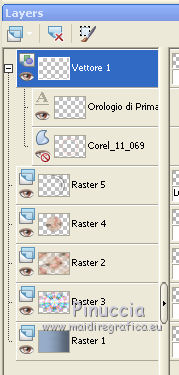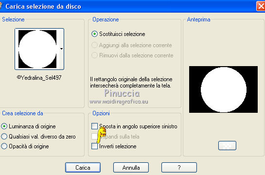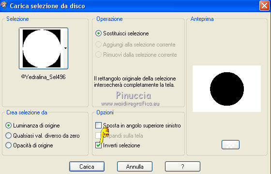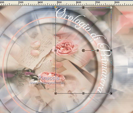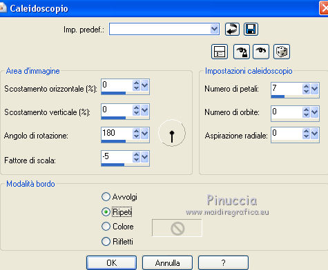 qui puoi trovare qualche risposta ai tuoi dubbi. Se l'argomento che ti interessa non è presente, ti prego di segnalarmelo. Questo tutorial è stato realizzato con Corel19 e tradotto con Corel X e CorelX17, ma può essere realizzato anche con le altre versioni di PSP. Dalla versione X4, il comando Immagine>Rifletti è stato sostituito con Immagine>Capovolgi in orizzontale, e il comando Immagine>Capovolgi con Immagine>Capovolgi in verticale. Nelle versioni X5 e X6, le funzioni sono state migliorate rendendo disponibile il menu Oggetti. Con la nuova versione X7, sono tornati Rifletti>Capovolgi, ma con nuove varianti. Vedi la scheda sull'argomento qui traduzione in francese/traduction en français qui/icitraduzione in inglese/english translation qui/hereVersioni/Versions qui Occorrente: Tubes a scelta Il resto del materiale qui Per i tubes usati e non forniti, grazie Colybrix per il tube della donna (femme508-coly) Mina per il misted (Mina@.5205 mist vintage 04.18) Filtri: se hai problemi con i filtri, consulta la mia sezione filtri qui Filters Unlimited 2.0 qui Mehdi - Sorting Tiles qui Filter Factory Gallery M - Motion Trail qui Filter Factory Gallery S - Ray Dream 2 qui Axion - Glow qui AAA Frames - Foto Frame qui Graphics Plus - Kaleidoscope qui I filtri Factory Gallery e Graphics Plus si possono usare da soli o importati in Filters Unlimited (come fare vedi qui) Se un filtro fornito appare con questa icona ![]() non esitare a cambiare modalità di miscelatura e opacità secondo i colori utilizzati. Metti le selezioni nella cartella Selezioni. Scegli due colori dal tube principale e dal misted. Per l'esempio: colore di primo piano #edbcae colore di sfondo #97acc8. ![]() 1. Apri una nuova immagine trasparente 950 x 650 pixels, e riempila con il colore di sfondo.2. Effetti>Plugins>Filters Unlimited 2.0 - Filter Factory Gallery M, Motion Trail, con i settaggi standard. ![]() 3. Livelli>Nuovo livello raster. Selezione>Seleziona tutto. 4. Apri il tuo misted e vai a Modifica>Copia. Torna al tuo lavoro e vai a Modifica>Incolla nella selezione. Selezione>Deseleziona. 5. Regola>Sfocatura>Sfocatura gaussiana, raggio 5. ![]() 6. Effetti>Plugins>Mehdi - Sorting Tiles. ![]() 7. Effetti>Effetti di immagine>Motivo unico, con i settaggi standard. ![]() 8. Modifica>Incolla nella selezione (il tuo misted è sempre in memoria). Selezione>Deseleziona. 9. Effetti>Plugins>Filters Unlimited 2.0 - Filter Factory Gallery S - Ray Dream 2, con i settaggi standard. ![]() 10. Cambia la modalità di miscelatura di questo livello in Luminanza. Livelli>Disponi>Sposta giù. Effetti>Effetti di bordo>Dilata. 11. Effetti>Plugins>Axion - Glow. ![]() 12. Attiva il livello superiore. Modifica>Copia Unione. Modifica>Incolla come nuovo livello. 13. Selezione>Carica/Salva selezione>Carica selezione da disco. Cerca e carica la selezione ©Yedralina_Sel496. Inverti Selezione selezionato ![]() Premi sulla tastiera il tasto CANC ![]() 14. Selezione>Inverti. Modifica>Incolla nella selezione (il misted è sempre in memoria). Selezione>Deseleziona. 15. Livelli>Nuovo livello raster. Selezione>Carica/Salva selezione>Carica selezione da disco. Cerca e carica la selezione ©Yedralina_Sel497. Non dimenticare di deselezionare Inverti selezione ![]() 16. Effetti>Effetti 3D>Sfalsa ombra, colore nero. ![]() 17. Effetti>Effetti 3D>Ritaglio. ![]() Selezione>Deseleziona. 18. Livelli>Duplica. Immagine>Ridimensiona, al 75%, tutti i livelli non selezionato. Livelli>Unisci>Unisci giù. Cambia la modalità di miscelatura di questo livello in Luminanza (esistente). 19. Chiudi il colore di sfondo. Attiva lo strumento Forme predefinite , Ellisse![]() 20. Disegna un cerchio: **A seconda di dove si avvia il cerchio, la scrittura curva avrà un orientamento diverso (all'interno o all'esterno del cerchio e da sinistra a destra o da destra a sinistra) In questo caso scriverai da sinistra a destra, fuori dal cerchio. Posiziona il puntatore del mouse verso l'alto, a sinistra e spostalo verso destra, per aprire il cerchio. Quindi scorri verso il basso, nella misura in cui vuoi il cerchio (il livello è vettoriale).*** ![]() Usa i nodi dello strumento per ridimensionare e posizionare meglio il cerchio. ![]() 21. Attiva lo strumento Testo e scegli un font a tuo piacimento.Per il mio esempio ho usato il font Aphrodite Pro (lo trovi nel materiale), dimensione 48 ![]() Imposta il colore di sfondo con il colore bianco (o il colore che hai scelto per scrivere il tuo testo). 22. Passa il mouse sul cerchio nel punto in cui inizierai a scrivere il tuo testo, e quando vedi apparire una A sottolineata da una mezza luna ![]() Clicca con il tasto sinistro del mouse e scrivi il testo ![]() ![]() 23. Apri il menu del livello Vettore e chiudi il livello del cerchio che ti è servito da guida ![]() Livelli>Converti in livello raster. Effetti>Effetti 3D>Sfalsa ombra, colore nero. ![]() 24. Immagine>Aggiungi bordatura, 2 pixels, simmetriche, colore di sfondo. Immagine>Aggiungi bordatura, 2 pixels, simmetriche, colore di primo piano. Immagine>Aggiungi bordatura, 2 pixels, simmetriche, colore di sfondo. 25. Selezione>Seleziona tutto. Modifica>Copia. Immagine>Aggiungi bordatura, 40 pixels, simmetriche, con un colore qualsiasi. Selezione>Inverti. Modifica>Incolla nella selezione. 26. Regola>Sfocatura>Sfocatura gaussiana - raggio 10 ![]() Selezione>Innalza selezione a livello. 27. Effetti>Plugins>AAA Frames - Foto Frame. ![]() 28. Effetti>Plugins>Graphics Plus - Kaleidoscope, con i settaggi standard. ![]() Cambia la modalità di miscelatura di questo livello in Luce diffusa. 29. Effetti>Effetti di riflesso>Caleidoscopio. ![]() 30. Effetti>Effetti di riflesso>Specchio rotante. ![]() Livelli>Unisci>Unisci giù. 31. Effetti>Plugins>AAA Frames - Foto Frame, con i settaggi precedenti. ![]() Selezione>Deseleziona. 32. Apri il tube principale e vai a Modifica>Copia. Torna al tuo lavoro e vai a Modifica>Incolla come nuovo livello. Spostalo sul lato opposto al testo.Effetti>Effetti 3D>Sfalsa omb