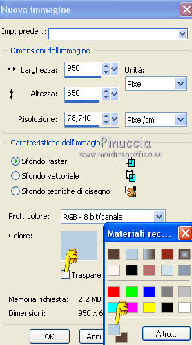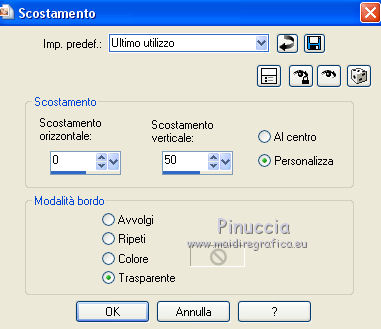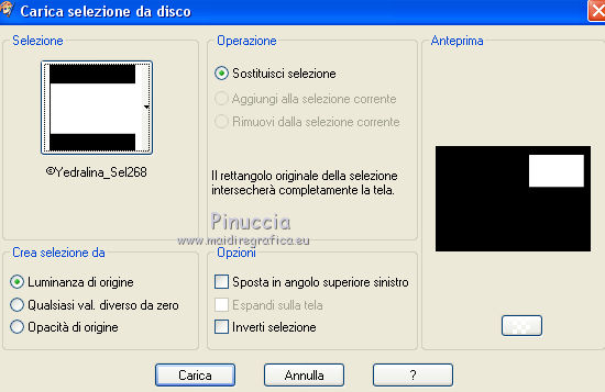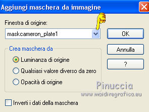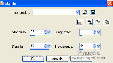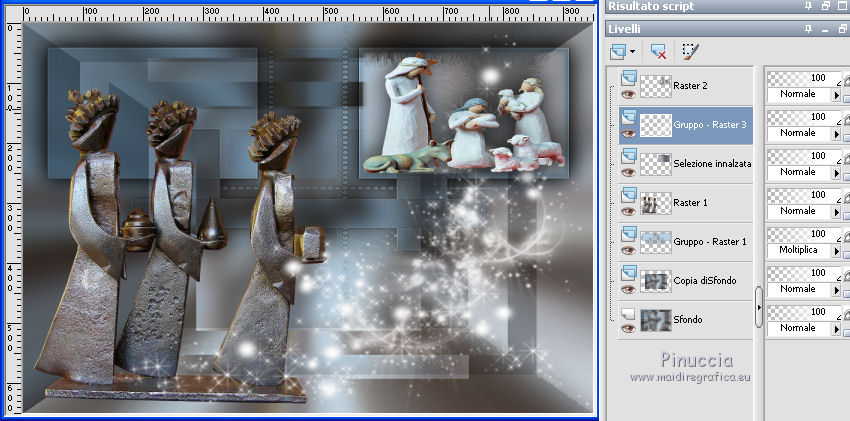qui puoi trovare qualche risposta ai tuoi dubbi. Se l'argomento che ti interessa non è presente, ti prego di segnalarmelo. Questo tutorial è stato realizzato con Corel19 e tradotto con Corel X, Corel X3 e CorelX7, ma può essere realizzato anche con le altre versioni di PSP. Dalla versione X4, il comando Immagine>Rifletti è stato sostituito con Immagine>Capovolgi in orizzontale, e il comando Immagine>Capovolgi con Immagine>Capovolgi in verticale. Nelle versioni X5 e X6, le funzioni sono state migliorate rendendo disponibile il menu Oggetti. Con la nuova versione X7, sono tornati Rifletti>Capovolgi, ma con nuove varianti. Vedi la scheda sull'argomento qui traduzione in inglese/english translation qui/here Le vostre versioni/your versions qui/here Occorrente: Materiale qui Per i tubes grazie Ema (EMA_Gereedschap Drie koningen_Sept.2014) e AnaRidzi (AnaRidzi45). Filtri: se hai problemi con i filtri, consulta la mia sezione filtri qui Filters Unlimited 2.0 qui Filter Factory Gallery B - Button Deluxe qui Filter Factory Gallery G - Bevel 1 qui Alien Skin Xenofex 2 - Constellation herequi I filtri Factory Gallery si possono usare da soli o importati in Filters Unlimited (come fare vedi qui) Se un filtro fornito appare con questa icona Animation Shop qui ![]() non esitare a cambiare modalità di miscelatura e opacità secondo i colori utilizzati. Metti la selezione nella cartella Selezioni. Apri le maschere in PSP e minimizzale con il resto del materiale. 1. Imposta il colore di primo piano con #b8d0e1, e il colore di sfondo con #594134. ![]() 2. Apri una nuova immagine 950 x 650 pixels, sfondo colore di primo piano Dopo aver tolto la selezione a Trasparente, clicca con il tasto destro del mouse sulla paletta. Avrai la tabella dei colori recenti dove, in basso a sinistra, trovi i colori della tua paletta. Clicca sulla paletta corrispondente per impostare lo sfondo della tua immagine. ![]() 3. Selezione>Seleziona tutto. Apri il tube EMA_Gereedschap Drie koningen_Sept.2014 e vai a Modifica>Copia. Torna al tuo lavoro e vai a Modifica>Incolla nella selezione. Selezione>Deseleziona. 4. Effetti>Effetti di immagine>Motivo unico. ![]() 5. Regola>Sfocatura>Sfocatura gaussiana - raggio 25. ![]() 6. Effetti>Plugins>Filters Unlimited 2.0 - Filter Factory Gallery B - Button Deluxe, con i settaggi standard. ![]() 7. Effetti>Plugins>Filters Unlimited 2.0 - Filter Factory Gallery G - Bevel 1, con i settaggi standard. ![]() 8. Livelli>Duplica. Immagine>Ridimensiona, al 70%, tutti i livelli non selezionato. 9. Livelli>Nuovo livello raster. Riempi il livello con il colore chiaro di primo piano.10. Livelli>Nuovo livello maschera>Da immagine. Apri il menu sotto la finestra di origine e vedrai la lista dei files aperti. Seleziona la maschera maskcameron_plate1. ![]() Livelli>Unisci>Unisci gruppo. 11. Effetti>Effetti di riflesso>Specchio rotante. ![]() 12. Effetti>Effetti di bordo>Aumenta. 13. Effetti>Effetti 3D>Sfalsa ombra, colore nero. ![]() 14. Effetti>Effetti di immagine>Scostamento. ![]() 15. Cambia la modalità di miscelatura di questo livello in Moltiplica. ![]() 16. Modifica>Incolla come nuovo livello (il tube EMA_Gereedschap Drie koningen_Sept.2014 è sempre in memoria). Immagine>Ridimensiona, al 60%, tutti i livelli non selezionato. Spostalo in basso a sinistra.![]() 17. Attiva il livello di sfondo. Selezione>Carica/Salva selezione>Carica selezione da disco. Cerca e carica la selezione ©Yedralina_Sel268. ![]() 18. Selezione>Innalza selezione a livello. Livelli>Disponi>Porta in alto. 19. Effetti>Effetti di trama>Manto. ![]() 20. Livelli>Nuovo livello raster. Apri il tube del presepe AnaRidzi145. e vai a Modifica>Copia. Torna al tuo lavoro e vai a Modifica>Incolla nella selezione. Regola>Messa a fuoco>Metti a fuoco. Selezione>Deseleziona. 21. Effetti>Effetti 3D>Sfalsa ombra, con i settaggi precedenti. ![]() 22. Livelli>Nuovo livello raster. Imposta il colore di primo piano con il colore bianco e riempi il livello con questo colore.23. Livelli>Nuovo livello maschera>Da immagine. Apri il menu sotto la finestra di origine e seleziona la maschera StarDust2 ![]() Livelli>Unisci>Unisci gruppo. 24. Livelli>Disponi>Sposta giù. Cambia la modalità di miscelatura di questo livello in Indebolisci, o secondo i tuoi colori. Per il mio esempio ho mantenuto Normale. ![]() 25. Attiva il livello superiore. Firma il tuo lavoro su un nuovo livello. 26. Livelli>Nuovo livello raster. Selezione>Seleziona tutto. 27. Selezione>Modifica>Contrai - 5 pixels. Selezione>Inverti. Riempi la selezione con il colore di sfondo.Selezione>Deseleziona. 28. Se non vuoi animare il lavoro: Livelli>Unisci>Unisci tutto e salva in formato jpg. Animazione. 29. Attiva il livello della seconda maschera (stardust2) ![]() 30. Effetti>Plugins>Alien Skin Xenofex 2 - Constellation. ![]() 31. Modifica>Copia Unione. Apri Animation Shop e vai a Modifica>Incolla>Incolla come nuova animazione. 32. Torna in PSP. Modifica>Annulla azione Constellation. Ripeti Effetti>Plugins>Alien Skin Xenofex 2 - Constellation, clicca una volta su Random Seed e ok. 33. Modifica>Copia Unione. Torna in Animation Shop e vai a Modifica>Incolla>Incolla dopo il fotogramma corrente. 34. Di nuovo in PSP. Modifica>Annulla azione Constellation. Ripeti l'Effetto Constellation, cliccando una volta su Random Seed. 35. Modifica>Copia Unione. Torna in Animation Shop e vai a Modifica>Incolla>Incolla dopo il fotogramma corrente. E avrai una animazione composta da 3 fotogrammi. ![]() Clicca sul primo fotogramma per selezionarlo e vai a Modifica>Seleziona tutto. 36. Apri la gif della stella: 460757qhrvyqbgly, anche questa composta da 3 fotogrammi. Modifica>Seleziona tutto. Animazione>Ridimensiona animazione, al 20%. ![]() 36. Modifica>Copia. Attiva il tuo lavoro e vai a Modifica>Incolla>Incolla nel fotogramma selezionato. Posiziona la gif nel quadro del presepe. ![]() 37. Animazione>Proprietà fotogramma e imposta la velocità a 25 ![]() 38. Controlla il risultato cliccando su Visualizza e salva