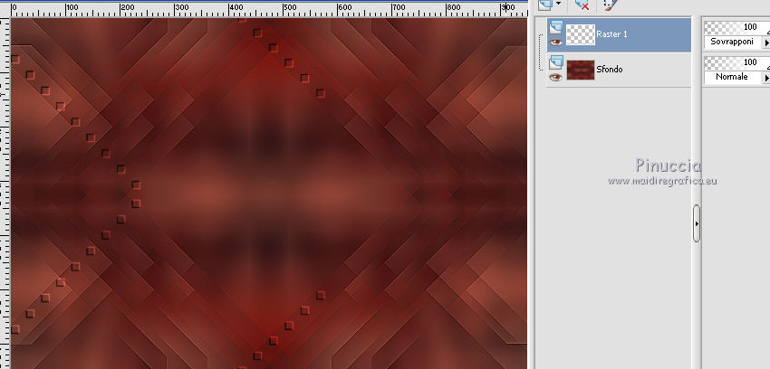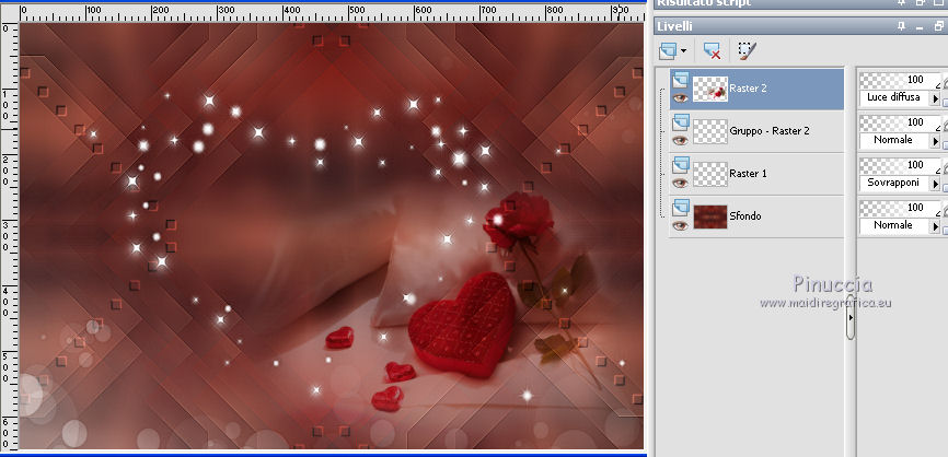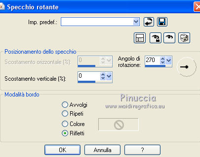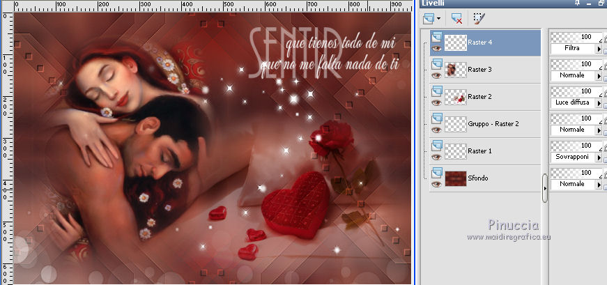 qui puoi trovare qualche risposta ai tuoi dubbi. Se l'argomento che ti interessa non è presente, ti prego di segnalarmelo. Questo tutorial è stato realizzato con Corel19 e tradotto con Corel X, Corel X3 e CorelX7, ma può essere realizzato anche con le altre versioni di PSP. Dalla versione X4, il comando Immagine>Rifletti è stato sostituito con Immagine>Capovolgi in orizzontale, e il comando Immagine>Capovolgi con Immagine>Capovolgi in verticale. Nelle versioni X5 e X6, le funzioni sono state migliorate rendendo disponibile il menu Oggetti. Con la nuova versione X7, sono tornati Rifletti>Capovolgi, ma con nuove varianti. Vedi la scheda sull'argomento qui traduzione in inglese/english translation qui/here Le vostre versioni/your versions qui/here Occorrente: Materiale qui Misted di Luz Cristina (3655-luzcristina.pspimage) misted di Mina (Mina@.mist.sanvalentino.27.01.16.pspimage) maschera di Narah (Narah_Mask_0939) Deco di Yedralina (Deco00146©Yedralina) wordart di Yedralina (Text_Sentir©Yedralina) Filtri: se hai problemi con i filtri, consulta la mia sezione filtri qui Filters Unlimited 2.0 qui Toadies - What are you qui Simple - Blintz qui Nik Software - Color Efex Pro qui I filtri Simple e Toadies si possono usare da soli o importati in Filters Unlimited (come fare vedi qui) Se un filtro fornito appare con questa icona ![]() non esitare a cambiare modalità di miscelatura e opacità secondo i colori utilizzati. Apri la maschera in PSP e minimizzala con il resto del materiale. Colori utilizzati. ![]() 1. Imposta il colore di primo piano con il colore bianco #ffffff, e il colore di sfondo con il colore scuro #7c120c. ![]() 2. Apri una nuova immagine, sfondo colore scuro, 950 x 650 pixels, ![]() 3. Selezione>Seleziona tutto. Apri il misted della coppia e vai a Modifica>Copia. minimizza il tube, che ti servirà ancora Torna al tuo lavoro e vai a Modifica>Incolla nella selezione. Selezione>Deseleziona. 4. Effetti>Effetti di immagine>Motivo unico. ![]() 5. Regola>Sfocatura>Sfocatura gaussiana - raggio 20. ![]() 6. Effetti>Plugins>Simple - Blintz. Modifica>Ripeti Blintz. 7. Immagine>Rifletti. Immagine>Capovolgi. 8. Di nuovo Effetti>Plugins>Simple - Blintz - 2 volte. 9. Effetti>Effetti di riflesso>Specchio rotante. ![]() 10. Di nuovo Effetti>Effetti di riflesso>Specchio rotante. ![]() 11. Effetti>Plugins>Toadies - What are you, con i settaggi standard. ![]() 12. Effetti>Effetti di bordo>Aumenta di più. 13. Apri il tube deco00145©Yedralina e vai a Modifica>Copia. Torna al tuo lavoro e vai a Modifica>Incolla come nuovo livello. Spostalo a sinistra.14. Cambia la modalità di miscelatura di questo livello in Sovrapponi. ![]() 15. Effetti>Effetti di riflesso>Specchio rotante, con i settaggi precedenti. ![]() 16. Livelli>Nuovo livello raster. Riempi il livello con il colore bianco.17. Livelli>Nuovo livello maschera<>Da immagine. Apri il menu sotto la finestra di origine e vedrai la lista dei files aperti. Seleziona la maschera Narah_Mask_0939. ![]() Livelli>Unisci>Unisci gruppo. Effetti>Effetti di bordo>Aumenta. 18. Apri il misted di Mina e vai a Modifica>Copia. Torna al tuo lavoro e vai a Modifica>Incolla come nuovo livello. Immagine>Ridimensiona, all'80%, tutti i livelli non selezionato. Spostalo in basso a destra.Cambia la modalità di miscelatura di questo livello in Luce diffusa, o secondo i tuoi colori, e abbassa l'opacità al 45%. Per il mio esempio non ho ridotto l'opacità. ![]() 19. Attiva nuovamente il tube della coppia e vai a Modifica>Copia. Torna al tuo lavoro e vai a Modifica>Incolla come nuovo livello. Spostalo un po' più a sinistra, come nel mio esempio.20. Apri il wordart e vai a Modifica>Copia. Torna al tuo lavoro e vai a Modifica>Incolla come nuovo livello. Spostalo dove preferisci.Cambia la modalità di miscelatura di questo livello in Filtra. ![]() 21. Attiva il livello di sfondo. Modifica>Copia. 22. Immagine>Aggiungi bordatura, 1 pixel, simmetriche, colore scuro #7c120c. Selezione>Seleziona tutto. Immagine>Aggiungi bordatura, 40 pixels, simmetriche, colore chiaro #f38260. 23. Selezione>Inverti. Modifica>Incolla nella selezione. 24. Di nuovo Selezione>Inverti. Effetti>Effetti 3D>Sfalsa ombra, colore nero. ![]() Selezione>Deseleziona. 25. Effetti>Plugins>Nik Software - Color Efex Pro - Tonal Contrast. ![]() 26. Immagine>Ridimensiona, 950 pixels di larghezza, tutti i livelli selezionato. Firma il tuo lavoro e salva in formato jpg. Per questo esempio ho "tubato" un'immagine trovata in rete. ![]() ![]() Puoi scrivermi se hai problemi o dubbi, o trovi un link che non funziona, o soltanto per un saluto. 14 Febbraio 2017 |