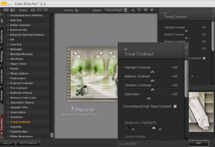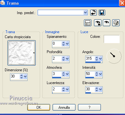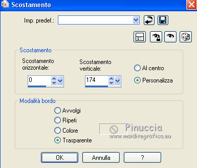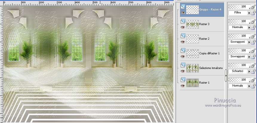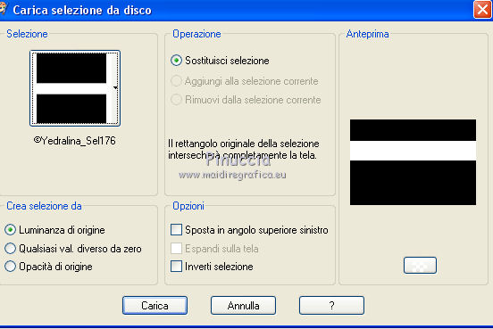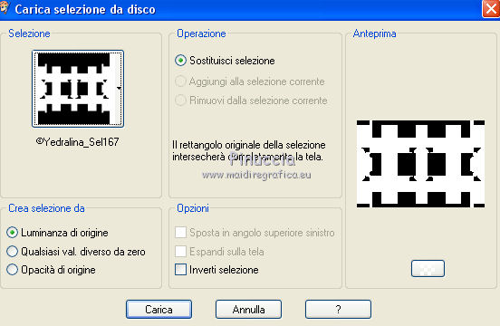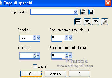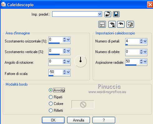 qui puoi trovare qualche risposta ai tuoi dubbi. Se l'argomento che ti interessa non è presente, ti prego di segnalarmelo. Questo tutorial è stato realizzato con Corel18 e tradotto con Corel X, ma può essere realizzato anche con le altre versioni di PSP. Dalla versione X4, il comando Immagine>Rifletti è stato sostituito con Immagine>Capovolgi in orizzontale, e il comando Immagine>Capovolgi con Immagine>Capovolgi in verticale. Nelle versioni X5 e X6, le funzioni sono state migliorate rendendo disponibile il menu Oggetti. Con la nuova versione X7, sono tornati Rifletti>Capovolgi, ma con nuove varianti. Vedi la scheda sull'argomento qui Occorrente: A scelta: il misted di un paesaggio, il tube di un personaggio e un tube accessorio. Il resto del materiale qui Tubes non inclusi: Non conosco l'autore del tube della donna. Tube accessorio, vaso di Riet (Riet_145_18-2-2015) Misted paesaggio di Luz Cristina (4189-luzcristina) Trama Carta stropicciata (Corel_15_038) Maschera di Moni C (Mask053-Mony C Designs) 3 selezioni: ©Yedralina_sel153, ©Yedralina_sel167 e ©Yedralina_sel176. Filtri: se hai problemi con i filtri, consulta la mia sezione filtri qui Nik Software - Color Efex Pro qui ![]() non esitare a cambiare modalità di miscelatura e opacità secondo i colori utilizzati. Nelle ultime versioni di PSP non c'è il gradiente di primo piano/sfondo (Corel_06_029) Trovi i gradienti delle versioni precedenti qui La trama Carta stropicciata è standard nelle versioni meno recenti di PSP, e corrisponde alla trama standard delle nuove versioni Corel_015_38. Se non la trovi nel tuo PSP, metti quella fornita nella cartella Trame. Metti le selezioni nella cartella Selezioni. 1. Scegli due colori dal tuo misted. Per l'esempio: Imposta il colore di primo piano con #ffffff e il colore di sfondo con #645d51. ![]() colori usati per la seconda versione: primo piano #d9d8d5, colore di sfondo #f0bb4d. ![]() Passa il colore di primo piano a Gradiente di primo piano/sfondo, stile Sprazzo di luce. ![]() Apri una nuova immagine trasparente 950 x 650 pixels, e riempila con il gradiente.Selezione>Seleziona tutto. Apri il tuo misted e vai a Modifica>Copia. Torna al tuo lavoro e vai a Modifica>Incolla nella selezione. Selezione>Deseleziona. Effetti>Effetti di immagine>Motivo unico. ![]() Regola>Sfocatura>Sfocatura gaussiana - raggio 15. ![]() 2. Selezione>Carica/Salva selezione>Carica selezione da disco. Cerca e carica la selezione ©Yedralina_sel167. ![]() Selezione>Innalza selezione a livello. Effetti>Effetti di trama>Trama - seleziona la trama Carta stropicciata (Corel_015_038) ![]() Cambia la modalità di miscelatura di questo livello in Schiarisci. Selezione>Deseleziona. 3. Attiva il livello di sfondo (raster 1). Livelli>Duplica. Livelli>Disponi>Sposta su. Immagine>Ridimensiona, al 60%, tutti i livelli non selezionato. Effetti>Effetti di riflesso>Caleidoscopio. ![]() Cambia la modalità di miscelatura di questo livello in Sovrapponi. Effetti>Effetti di immagine>Motivo unico, con i settaggi precedenti. Effetti>Effetti di immagine>Scostamento. ![]() Facoltativo. Selezione>Carica/Salva selezione>Carica selezione da disco. Cerca e carica la selezione ©Yedralina_sel176. ![]() Premi sulla tastiera il tasto CANC. Selezione>Deseleziona. Effetti>Effetti 3D>Sfalsa ombra, colore nero. ![]() Effetti>Effetti di bordo>Aumenta di più. 4. Livelli>Nuovo livello raster. Selezione>Carica/Salva selezione>Carica selezione da disco. Cerca e carica la selezione ©Yedralina_sel153. ![]() Riporta il colore di primo piano a colore, e riempi la selezione con il colore di primo piano.Selezione>Deseleziona. Effetti>Effetti di immagine>Motivo unico, con i settaggi precedenti. Effetti>Effetti di immagine>Scostamento. ![]() 5. Effetti>Effetti di riflesso>Fuga di specchi. ![]() Effetti>Effetti di immagine>Motivo unico, con i settaggi precedenti. Effetti>Effetti di riflesso>Specchio rotante. ![]() Di nuovo Effetti>Effetti di riflesso>Specchio rotante, con i settaggi standard. ![]() Cambia la modalità di miscelatura di questo livello in Sovrapponi, o come preferisci. 6. Apri il tuo misted e vai a Modifica>Copia. Torna al tuo lavoro e vai a Modifica>Incolla come nuovo livello. Immagine>Ridimensiona, al 90%, tutti i livelli non selezionato. Effetti>Effetti di immagine>Motivo unico, con i settaggi precedenti. Effetti>Effetti di riflesso>Specchio rotante, come al punto 5. 7. Livelli>Nuovo livello raster. Abbassa l'opacità dello strumento Riempimento al 73%, e riempi il livello con il colore di primo piano.Livelli>Nuovo livello maschera>Da immagine. Apri il menu sotto la finestra di origine e vedrai la lista dei files aperti. Seleziona la maschera Mask053_Mony C Designs. ![]() Livelli>Unisci>Unisci giù. Immagine>Rifletti. Cambia la modalità di miscelatura di questo livello in Filtra. (nella seconda versione ho cambiato la modalità di miscelatura in Indebolisci, opacità 65%). Effetti>Effetti di immagine>Scostamento. ![]() 8. Apri il tube accessorio e vai a Modifica>Copia. Torna al tuo lavoro e vai a Modifica>Incolla come nuovo livello. Per il mio esempio: Immagine>Ridimensiona, al 55%, tutti i livelli non selezionato. Spostalo a sinistra, come nel mio esempio.Effetti>Effetti 3D>Sfalsa ombra, a tua scelta. Dovresti avere questo: ![]() 9. Attiva il livello di sfondo. Modifica>Copia. Immagine>Aggiungi bordatura, 1 pixel, simmetriche, colore di primo piano. Selezione>Seleziona tutto. Immagine>Aggiungi bordatura, 40 pixels, simmetriche, con un colore qualsiasi. Selezione>Inverti. Modifica>Incolla nella selezione (il livello di sfondo copiato prima). Regola>Sfocatura>Sfocatura gaussiana - raggio 15. ![]() Effetti>Effetti di trama>Veneziana. ![]() Selezione>Inverti. Effetti>Effetti 3D>Sfalsa ombra, colore nero. ![]() Selezione>Deseleziona. 10. Apri il tube del personaggio e vai a Modifica>Copia. Torna al tuo lavoro e vai a Modifica>Incolla come nuovo livello. Spostalo a destra, come nel mio esempio.Effetti>Effetti 3D>Sfalsa ombra, a scelta. 11. Live