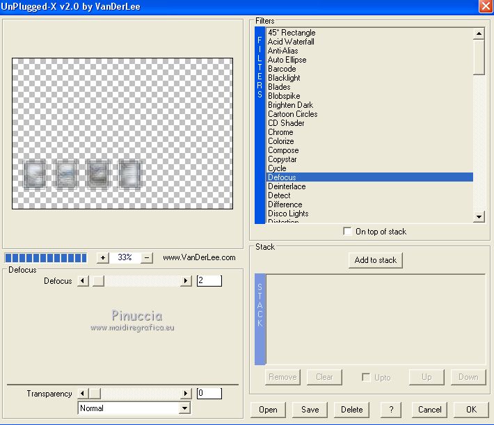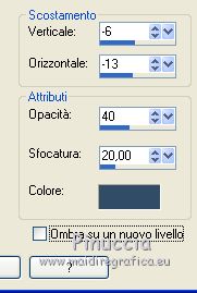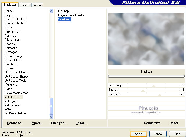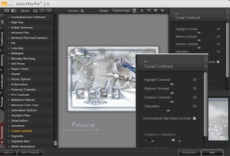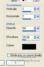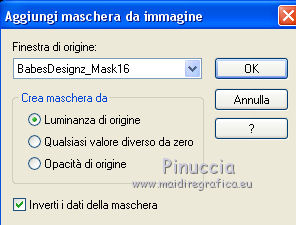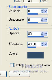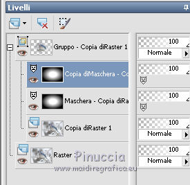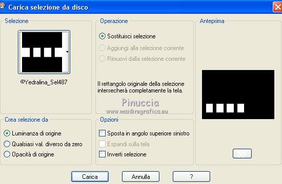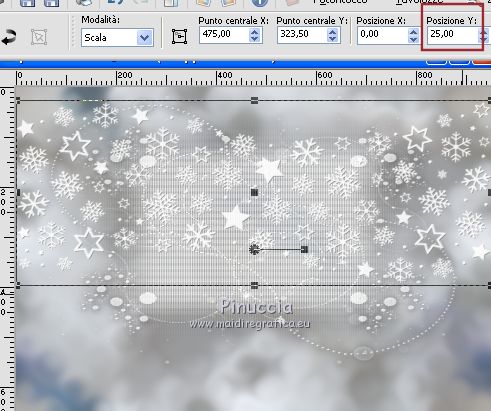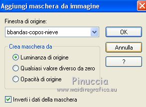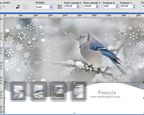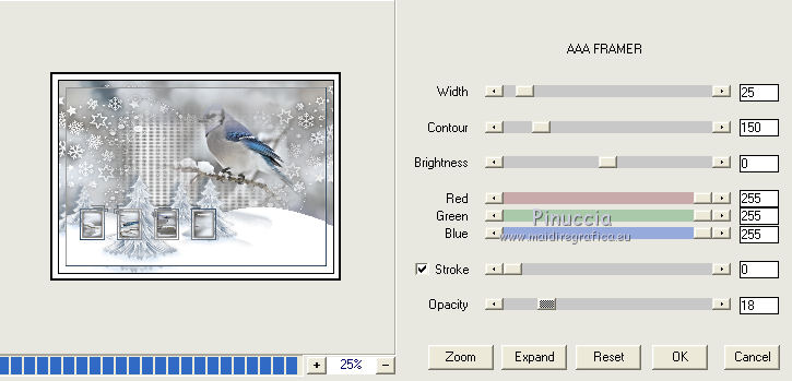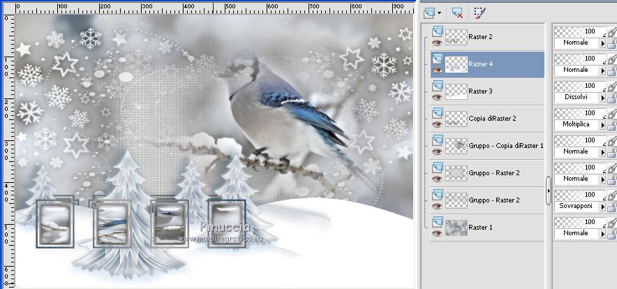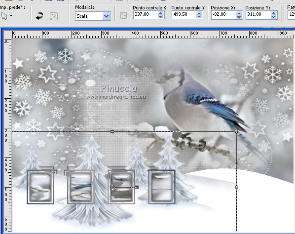 qui puoi trovare qualche risposta ai tuoi dubbi. Se l'argomento che ti interessa non è presente, ti prego di segnalarmelo. Questo tutorial è stato realizzato con Corel19 e tradotto con CorelX7, CorelX2 e CorelX3, ma può essere realizzato anche con le altre versioni di PSP. Dalla versione X4, il comando Immagine>Rifletti è stato sostituito con Immagine>Capovolgi in orizzontale, e il comando Immagine>Capovolgi con Immagine>Capovolgi in verticale. Nelle versioni X5 e X6, le funzioni sono state migliorate rendendo disponibile il menu Oggetti. Con la nuova versione X7, sono tornati Rifletti>Capovolgi, ma con nuove varianti. Vedi la scheda sull'argomento qui traduzione in francese/traduction en français qui/icitraduzione in inglese/english translation qui/hereVersioni/Versions qui Occorrente: Materiale qui Immagine in Jpg (nature snow birds blue jay 2560x1600 wallpaper_www.animalhi.com_23) (facoltativo un misted) tube decorativo (White Forest) decorazione (xmas2019). Maschere: BabesDesignz:Mask16 e bbandas-copos-nieve. Il resto del materiale è di Yedralina. Filtri: se hai problemi con i filtri, consulta la mia sezione filtri qui Filters Unlimited 2.0 qui AAA Filters - Framer qui VM Distortion - Smallpox qui Alien Skin Eye Candy 5 Impact - Glass qui Mura's Seamless - Emboss at Alpha qui VanDerLee - Unplugged-X qui I filtri VM Distortion e Mura's Seamless si possono usare da soli o importati in Filters Unlimited (come fare vedi qui) Se un filtro fornito appare con questa icona ![]() non esitare a cambiare modalità di miscelatura e opacità secondo i colori utilizzati. Nelle ultime versioni di PSP non c'è il gradiente di primo piano/sfondo (Corel_06_029) Puoi usare i gradienti delle versioni precedenti. Trovi qui i gradienti Corel X. Metti i presets Cliccando sul file una o due volte (a seconda delle tue impostazioni), automaticamente il preset si installerà nella cartella corretta. perchè uno o due clic vedi qui Se preferisci, puoi importare direttamente il preset nel corso del tutorial Come fare vedi la scheda del filtro Eye Candy qui Metti il preset nella cartella Impostazioni predefinite. Metti la selezione nella cartella Selezioni. Metti la maschera 20-20 nella cartella Maschere. Apri le altre maschere in PSP e minimizzale con il resto del materiale. Colori utilizzati ![]() 1. Apri una nuova immagine trasparente 950 x 650 pixels. Selezione>Seleziona tutto. Apri la tua immagine in jpg e vai a Modifica>Copia. Torna al tuo lavoro e vai a Modifica>Incolla nella selezione. Selezione>Deseleziona. Se hai scelto un misted, vai direttamente al passo 3 2. Livelli>Duplica. Livelli>Carica/Salva maschera>Carica maschera da disco. Cerca e carica la maschera 20-20. ![]() Livelli>Duplica ![]() Livelli>Unisci>Unisci gruppo. Chiudi questo livello e attiva il livello sottostante (Raster 1) 3. Effetti>Effetti di immagine>Motivo unico. ![]() Regola>Sfocatura>Sfocatura gaussiana - raggio 20 ![]() Effetti>Plugins>Filters Unlimited 2.0 - VM Distortion - Smallpox, con i settaggi standard. ![]() 4. Imposta il colore di primo piano con il colore bianco #ffffff. Livelli>Nuovo livello raster. Riempi il livello con il colore bianco.Livelli>Nuovo livello maschera>Da immagine Apri il menu sotto la finestra di origine e vedrai la lista dei files aperti Seleziona la maschera BabesDesignz_Mask16. ![]() Livelli>Duplica. Livelli>Unisci>Unisci gruppo. Oggetti>Allinea>Superiore o, se il tuo PSP non rende disponibile il menu Oggetti, premi il tasto K per attivare lo strumento Puntatore ![]() e imposta Posizione Y a 0,00. ![]() Effetti>Plugins>Mura's Seamless - Emboss at Alpha, con i settaggi standard. ![]() Effetti>Effetti 3D>Sfalsa ombra, colore nero. ![]() 5. Livelli>Nuovo livello raster. Riempi il livello con il colore bianco.Livelli>Nuovo livello maschera>Da immagine Apri il menu sotto la finestra di origine e seleziona la maschera bbandas-copos-nieve. ![]() Livelli>Unisci>Unisci gruppo. Effetti>Plugins>Mura's Seamless - Emboss at Alpha, con i settaggi standard. Attiva lo strumento Puntatore ![]() e sposta la maschera un po' più in alto ![]() Effetti>Effetti 3D>Sfalsa ombra, con i settaggi precedenti. ![]() Livelli>Disponi>Sposta giù. **FACOLTATIVO**. Cambia la modalità di miscelatura di questo livello in Sovrapponi. 6. Attiva il livello soprastante Gruppo-Raster 2. Livelli>Nuovo livello raster. Selezione>Carica/Salva selezione>Carica selezione da disco Cerca e carica la selezione ©Yedralina_Sel487. ![]() Imposta il colore di primo piano con il colore scuro #314c67, e il colore di sfondo con il colore chiaro #aca7a3 ![]() Passa il colore di primo piano a Gradiente di primo piano/sfondo, stile Lineare. ![]() Riempi la selezione con il gradiente.Selezione>Modifica>Contrai - 4 pixels. Premi sulla tastiera il tasto CANC ![]() Selezione>Modifica>Contrai - 4 pixels. Riempi con il colore chiaro di sfondo.Selezione>Modifica>Contrai - 4 pixels. Attiva la tua immagine in jpg. Immagine>Rifletti. Modifica>Copia. Torna al tuo lavoro e vai a Modifica>Incolla nella selezione. Effetti>Plugins>Alien Skin Eye Candy 5 Impact - Glass seleziona il preset ©Yedralina_Glass4 e ok ![]() Questi i settaggi, in caso di problemi con il preset. ![]() Selezione>Deseleziona. Livelli>Duplica. Effetti>Plugins>VanDerLee - Unplugged-X - Defocus, con i settaggi standard. ![]() Cambia la modalità di miscelatura di questo livello in Moltiplica, o a tuo piacimento (puoi anche lasciarlo in modo Normale). Livelli>Disponi>Sposta giù. 7. Riapri e attiva il livello superiore Gruppo-Copia di Raster 1. ** Se hai scelto un misted diverso, fai questo: Attiva il livello superiore. Copia e Incolla come nuovo livello il tuo tube. Immagine>Ridimensiona, a tuo piacimento. Posiziona / l'immagine come nel mio esempio.![]() Regola>Messa a fuoco>Maschera di contrasto ![]() Effetti>Effetti 3D>Sfalsa ombra, colore chiaro #aca7a3. ![]() Livelli>Disponi>Sposta giù - 2 volte. 8. Apri il tube Deco00231©Yedralina e vai a Modifica>Copia. Torna al tuo lavoro e vai a Modific