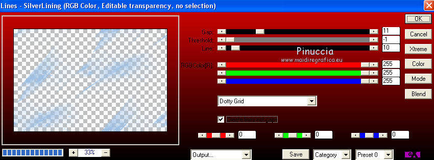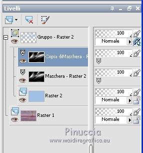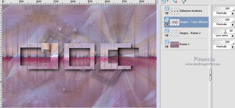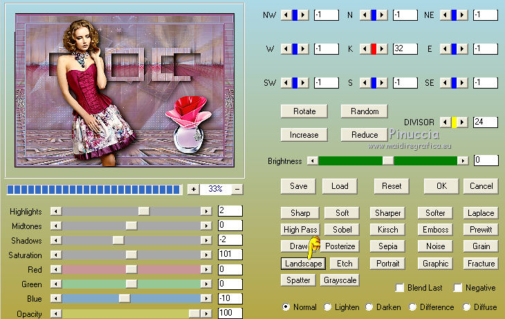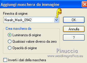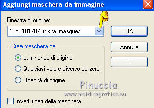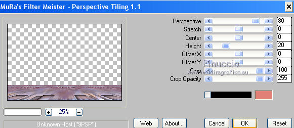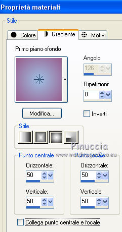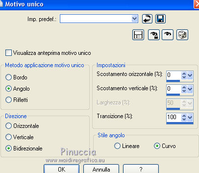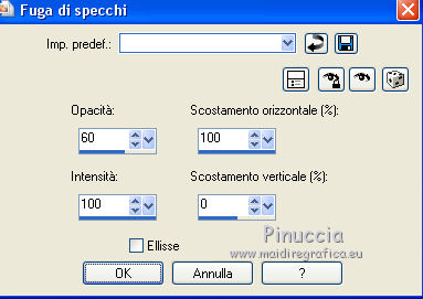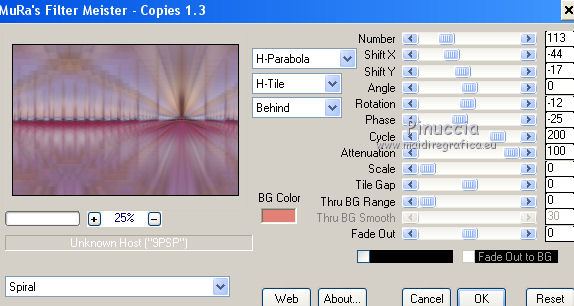 qui puoi trovare qualche risposta ai tuoi dubbi. Se l'argomento che ti interessa non è presente, ti prego di segnalarmelo. Questo tutorial è stato realizzato con Corel18 e tradotto con Corel X, ma può essere realizzato anche con le altre versioni di PSP. Dalla versione X4, il comando Immagine>Rifletti è stato sostituito con Immagine>Capovolgi in orizzontale, e il comando Immagine>Capovolgi con Immagine>Capovolgi in verticale. Nelle versioni X5 e X6, le funzioni sono state migliorate rendendo disponibile il menu Oggetti. Con la nuova versione X7, sono tornati Rifletti>Capovolgi, ma con nuove varianti. Vedi la scheda sull'argomento qui Occorrente: A scelta il tube di un personaggio e un tube accessorio. Il resto del materiale qui Grazie: per il tube principale (FB0072) Isa per il tube accessorio Yvonne per le maschere Narah (Narah_Mask_0942) e Nikita (1250181707_nikita_masques). Filtri: se hai problemi con i filtri, consulta la mia sezione filtri qui Mura's Meister - Copies qui Mura's Meister - Perspective Tiling qui Alien Skin Eye Candy 5 Impact - Perspective Shadow qui AAA Filters - Custom qui AP 01 [Innovations] - Lines SilverLining qui ![]() non esitare a cambiare modalità di miscelatura e opacità secondo i colori utilizzati. Nelle ultime versioni di PSP non c'è il gradiente di primo piano/sfondo (Corel_06_029) Trovi i gradienti delle versioni precedenti qui Metti i preset Cliccando sul file una o due volte (a seconda delle tue impostazioni), automaticamente il preset si installerà nella cartella corretta. perchè uno o due clic vedi qui Metti la selezione nella cartella Selezioni. Apri le maschere in PSP e minimizzale con il resto del materiale. 1. Scegli due colori dal tuo tube principale. Per l'esempio: Imposta il colore di primo piano con #9ec0e4, e il colore di sfondo con #995c8c. ![]() Passa il colore di primo piano a Gradiente di primo piano/sfondo, stile Sprazzo di luce. ![]() 2. Apri una nuova immagine trasparente 900 x 600 pixels e riempila con il gradiente.3. Selezione>Seleziona tutto. Apri il tuo tube e vai a Modifica>Copia. Torna al tuo lavoro e vai a Modifica>Incolla nella selezione. Selezione>Deseleziona. 4. Regola>Sfocatura>Sfocatura radiale. ![]() 5. Regola>Messa a fuoco>Metti a fuoco. 6. Effetti>Effetti di immagine>Motivo unico. ![]() 7. Effetti>Effetti di riflesso>Fuga di specchi. ![]() 8. Livelli>Duplica. Immagine>Rifletti. Abbassa l'opacità di questo livello al 50%. Livelli>Unisci>Unisci giù. Effetti>Effetti di bordo>Aumenta. 9. Effetti>Plugins>Mura's Meister - Copies. ![]() 10. Riporta il colore di primo piano a Colore. Livelli>Nuovo livello raster. Riempi con il colore chiaro di primo piano.Livelli>Nuovo livello maschera>Da immagine. Apri il menu sotto la finestra di origine e vedrai la lista dei files aperti. Seleziona la maschera Narah_Mask_0942. ![]() Livelli>Duplica. ![]() Livelli>Unisci>Unisci gruppo. 11. Effetti>Effetti di immagine>Motivo unico. ![]() Cambia la modalità di miscelatura di questo livello in Luce netta, o secondo i tuoi colori e abbassa l'opacità al 60%. 12. Effetti>Plugins>AP 01 [Innovations#93; - Lines SilverLining. ![]() Effetti>Effetti di bordo>Dilata. 13. Attiva il livello Raster 1. Livelli>Duplica. Immagine>Rifletti. Livelli>Nuovo livello maschera>Da immagine. Apri il menu sotto la finestra di origine e vedrai la lista dei files aperti. Seleziona la maschera 1250181707_nikita_masques. ![]() Livelli>Unisci>Unisci gruppo. Effetti>Effetti di bordo>Aumenta. Effetti>Effetti di bordo>Dilata. 14. Effetti>Plugins>Alien Skin Eye Candy 5 Impact - Perspective Shadow. Seleziona il preset Drop Shadow,Blurry e ok. ![]() 15. Livelli>Disponi>Sposta giù. 16. Attiva il livello Raster 1. Selezione>Carica/Salva selezione>Carica selezione da disco. Cerca e carica la selezione ©Yedralina_sel114. attenzione, per effetto delle regole dell'ordine alfabetico, trovi la selezione in cima alla lista, prima delle lettere ![]() Selezione>Innalza selezione a livello. Livelli>Disponi>Porta in alto. Effetti>Effetti di bordo>Dilata. 17. Selezione>Inverti. Effetti>Plugins>Alien Skin Eye Candy 5 Impact - Perspective Shadow, con i settaggi precedenti. ![]() Selezione>Deseleziona. 18. Attiva il livello della maschera (gruppo copia di Raster 1). Immagine>Ridimensiona, al 75%, tutti i livelli non selezionato. ![]() 19. Livelli>Unisci>Unisci visibile. Livelli>Duplica. 20. Effetti>Effetti di immagine>Motivo unico, con i settaggi standard. ![]() 21. Effetti>Plugins>Mura's Meister - Perspective Tiling. ![]() Ripeti il filtro una seconda volta. Effetti>Effetti 3D>Sfalsa ombra, colore nero. ![]() 22. Attiva il livello Uniti. Effetti>Effetti di immagine>Scostamento. ![]() 23. Apri il tube accessorio e vai a Modifica>Copia. Torna al tuo lavoro e vai a Modifica>Incolla come nuovo livello. Immagine>Ridimensiona, se e quanto necessario, tutti i livelli non selezionato. Sposta il tube a destra.24. Effetti>Plugins>Alien Skin Eye Candy 5 Impact - Perspective Shadow, con i settaggi precedenti. ![]() 25. Livelli>Disponi>Porta in alto. 26. Immagine>Aggiungi bordatura, 2 pixels, simmetriche, colore di sfondo. Immagine>Aggiungi bordatura, 2 pixels, simmetriche, colore di primo piano. Immagine>Aggiungi bordatura, 2 pixels, simmetriche, colore di sfondo. 27. Modifica>Copia. 28. Selezione>Seleziona tutto. Immagine>Aggiungi bordatura, 40 pixels, simmetriche, colore di primo piano. Selezione>Inverti. Modifica>Incolla nella selezione. 29. Effetti>Effetti di riflesso>Fuga di specchi, con i settaggi precedenti. ![]() 30. Effetti>Effetti di riflesso>Specchio rotante, con i settaggi standard. ![]() Regola>Messa a fuoco>Metti a fuoco. Selezione>Deseleziona. 31. Immagine>Aggiungi bordatura, 2 pixels, simmetriche, colore di sfondo. 32. Apri il tuo tube e vai a Modifica>Copia. Torna al tuo lavoro e vai a Modifica>Incolla come nuovo livello. Immagine>Ridimensiona, se e quanto necessario (per l'esempio all'85%), tutti i livelli non selezionato. Sposta il tube a sinistra.33. Effetti>Plugins>Alien Sk