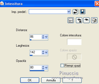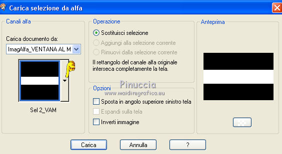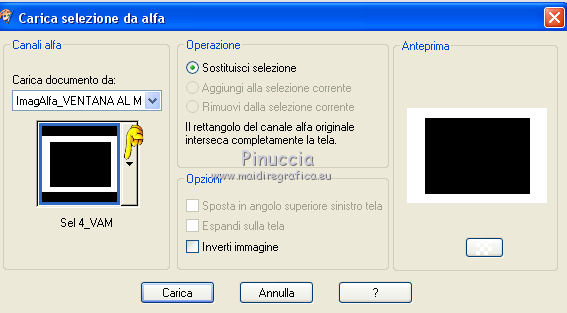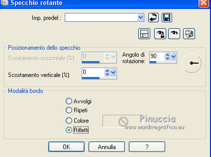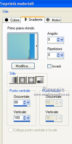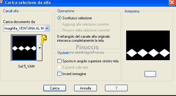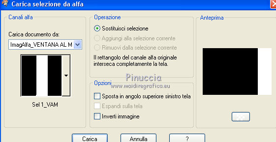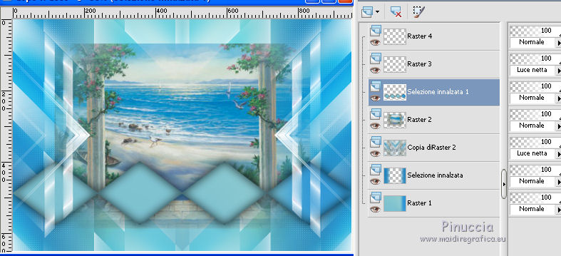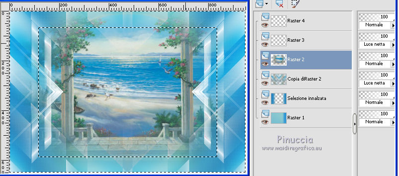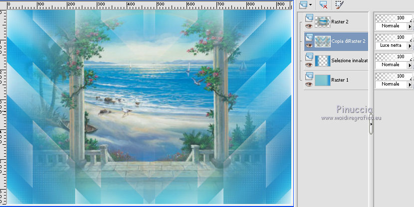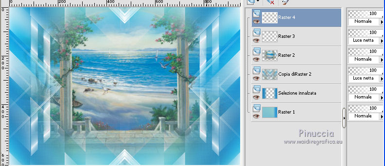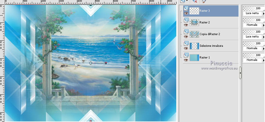 qui puoi trovare qualche risposta ai tuoi dubbi. Se l'argomento che ti interessa non è presente, ti prego di segnalarmelo. Questo tutorial è stato realizzato con Corel19 e tradotto con Corel X e CorelX17, ma può essere realizzato anche con le altre versioni di PSP. Dalla versione X4, il comando Immagine>Rifletti è stato sostituito con Immagine>Capovolgi in orizzontale, e il comando Immagine>Capovolgi con Immagine>Capovolgi in verticale. Nelle versioni X5 e X6, le funzioni sono state migliorate rendendo disponibile il menu Oggetti. Con la nuova versione X7, sono tornati Rifletti>Capovolgi, ma con nuove varianti. Vedi la scheda sull'argomento qui traduzione in inglese/english translation qui/here Le vostre versioni/your versions qui/here Occorrente: Il misted di un paeaggio e un personaggio Il resto del materiale qui Tubes non forniti: Tube della donna di Malackatube (malackatube v0564) Misted del paesaggio di Logane (logane_paysage_plagemisted_16mars2015) Il resto del materiale è di Yedralina. (in questa pagina trovi i links ai loro siti). Filtri: se hai problemi con i filtri, consulta la mia sezione filtri qui L&K's - L&K's Zitah qui Alien Skin Eye Candy 5 Impact - Extrude qui Mura's Meister - Perspective Tiling qui ![]() non esitare a cambiare modalità di miscelatura e opacità secondo i colori utilizzati. Nelle ultime versioni di PSP non c'è il gradiente di primo piano/sfondo (Corel_06_029) Puoi usare i gradienti delle versioni precedenti. Trovi qui i gradienti Corel X. Metti il preset Cliccando sul file una o due volte (a seconda delle tue impostazioni), automaticamente il preset si installerà nella cartella corretta. perchè uno o due clic vedi qui Se preferisci, puoi importare direttamente il preset nel corso del tutorial Come fare vedi la scheda del filtro Eye Candy qui 1. Imposta il colore di primo piano con #2591d5, e il colore di sfondo con #96cece. ![]() Passa il colore di primo piano a Gradiente di primo piano/sfondo, stile Radiale. ![]() 2. Apri ImagAlfa_VENTANA AL MAR. Finestra>Duplica, o sulla tastiera maiuscola+D, per fare una copia. ![]() Chiudi l'originale. La copia, che sarà la base del tuo lavoro, non è vuota, ma contiene le selezioni salvate sul canale alfa. Riempi l'immagine trasparente con il gradiente.3. Regola>Sfocatura>Sfocatura gaussiana - raggio 50. ![]() 4. Selezione>Carica/Salva selezione>Carica selezione da canale alfa. La selezione Sel 1 VAM è subito disponibile. Devi soltanto cliccare Carica. ![]() Selezione>Innalza selezione a livello. Selezione>Deseleziona. 5. Regola>Sfocatura>Sfocatura gaussiana - raggio 50. ![]() 6. Effetti>Effetti di riflesso>Specchio rotante, con i settaggi standard. ![]() 7. Effetti>Plugins>L&K's - L&K's Zitah ![]() 8. Livelli>Nuovo livello raster. Selezione>Seleziona tutto. 9. Apri il misted del paesaggio e vai a Modifica>Copia. Torna al tuo lavoro e vai a Modifica>Incolla nella selezione. Selezione>Deseleziona. Regola>Messa a fuoco>Metti a fuoco. 10. Livelli>Duplica. 11. Effetti>Effetti di immagine>Motivo unico. ![]() 12. Regola>Sfocatura>Sfocatura gaussiana - raggio 40. ![]() 13. Effetti>Effetti di trama>Intessitura colore intessitura: bianco ![]() 14. Effetti>Effetti geometrici>Inclina. ![]() 15. Effetti>Effetti di riflesso>Specchio rotante. ![]() 16. Livelli>Disponi>Sposta giù. 17. Cambia la modalità di miscelatura di questo livello in Luce netta. ![]() 18. Attiva il livello superiore, Raster 2. 19. Apri il tube Deco00158©Yedralina e vai a Modifica>Copia. Torna al tuo lavoro e vai a Modifica>Incolla come nuovo livello. 20. Oggetti>Allinea>Superiore. Se stai lavorando con una versione precedente di PSP che non ha disponibile il menu Oggetti, usa lo strumento Spostamento ![]() ![]() 21. Livelli>Duplica. Immagine>Capovolgi. 22. Livelli>Unisci>Unisci giù. 23. Selezione>Carica/Salva selezione>Carica selezione da canale alfa. Apri il menu delle selezioni e carica la selezione Sel 2 VAM. ![]() 24. Premi sulla tastiera il tasto CANC ![]() Selezione>Deseleziona. 25. Effetti>Effetti geometrici>Inclina, con i settaggi precedenti. 26. Effetti>Effetti di riflesso>Specchio rotante, con i settaggi standard. ![]() 27. Effetti>Effetti di riflesso>Specchio rotante. ![]() 28. Cambia la modalità di miscelatura di questo livello in Luce netta. ![]() 29. Selezione>Carica/Salva selezione>Carica selezione da canale alfa. Apri il menu delle selezioni e carica la selezione Sel 3 VAM. ![]() 30. Modifica>Taglia (questo comando oltre a tagliare tiene anche in memoria) ![]() Selezione>Deseleziona. 31. Modifica>Incolla come nuovo livello. ![]() 32. Immagine>Ruota per gradi - 90 gradi a sinistra. ![]() ![]() 33. Selezione>Carica/Salva selezione>Carica selezione da canale alfa. Apri il menu delle selezioni e carica la selezione Sel 4 VAM. ![]() 34. Attiva il livello del paesaggio, Raster 2. ![]() Premi sulla tastiera il tasto CANC ![]() Selezione>Deseleziona. 35. Attiva il livello di sfondo, Raster 1. Selezione>Carica/Salva selezione>Carica selezione da canale alfa. Apri il menu delle selezioni e carica la selezione Sel 5 VAM. ![]() Selezione>Innalza selezione a livello. 36. Effetti>Effetti 3D>Sfalsa ombra, colore nero. ![]() Selezione>Inverti. Ripeti Effetti>Effetti 3D>Sfalsa ombra, con gli stessi settaggi. Selezione>Deseleziona. 37. Livelli>Disponi>Sposta su - 3 volte. ![]() Oggetti>Allinea>Inferiore. ![]() 38. Immagine>Rifletti 39. Effetti>Plugins>Mura's Meister - Perspective Tiling. ![]() 40. Effetti>Plugins>Alien Skin Eye Candy 5 Impact - Extrude. Seleziona il preset EC5_EXTRUDE03_©Yedralina e ok. Basic: Solid color: il tuo colore scuro. ![]() 41. Livelli>Nuovo livello raster. Livelli>Disponi>Porta in alto. Passa il colore di primo piano a Colore. Riempi il livello con il colore scuro di primo piano.42. Selezione>Seleziona tutto. Selezione>Modifica> Contrai - 20 pixels. Premi sulla tastiera il tasto CANC. 43. Effetti>Effetti 3D>Sfalsa ombra, colore nero. ![]() 44. Selezione>Seleziona tutto. Selezione>Modifica>Contrai - 5 pixels. 45. Selez
