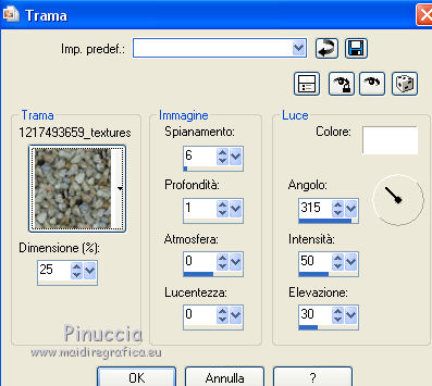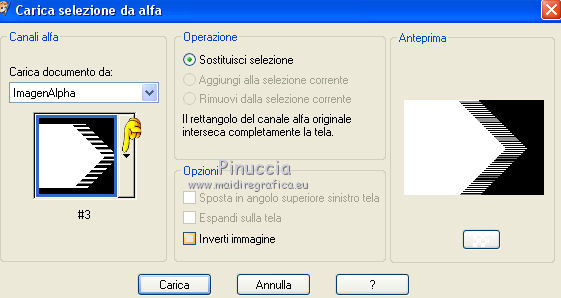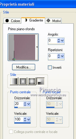 qui puoi trovare qualche risposta ai tuoi dubbi. Se l'argomento che ti interessa non è presente, ti prego di segnalarmelo. Questo tutorial è stato realizzato con Corel19 e tradotto con Corel X e CorelX17, ma può essere realizzato anche con le altre versioni di PSP. Dalla versione X4, il comando Immagine>Rifletti è stato sostituito con Immagine>Capovolgi in orizzontale, e il comando Immagine>Capovolgi con Immagine>Capovolgi in verticale. Nelle versioni X5 e X6, le funzioni sono state migliorate rendendo disponibile il menu Oggetti. Con la nuova versione X7, sono tornati Rifletti>Capovolgi, ma con nuove varianti. Vedi la scheda sull'argomento qui traduzione in inglese/english translation qui/herele vostre versioni / vos versions qui Occorrente: Il tube di una donna e il misted di un paesaggio. Il resto del materiale qui Per i tubes usati e non forniti, grazie Gabry (Gabry-woman 167-17) e Guismo (calguismisted18092015). Il resto del materiale è di Yedralina (in questa pagina trovi i links ai siti dei creatori di tubes). Filtri: se hai problemi con i filtri, consulta la mia sezione filtri qui Filters Unlimited 2.0 qui VM Manipulation - Transmission qui VM Toolbox - Zoom blur qui Mura's Meister - Copies qui I filtri VM Manipulation e VM Toolbox si possono usare da soli o importati in Filters Unlimited (come fare vedi qui) Se un filtro fornito appare con questa icona ![]() non esitare a cambiare modalità di miscelatura e opacità secondo i colori utilizzati. Nelle ultime versioni di PSP non c'è il gradiente di primo piano/sfondo (Corel_06_029) Puoi usare i gradienti delle versioni precedenti. Trovi qui i gradienti Corel X. Metti la trama nella cartella Trame. Metti il preset nella cartella Impostazioni predefinite. 1. Scegli due colori dal misted. Per l'esempio: colore di primo piano #8b6f7b colore di sfondo: #a5a5a5. ![]() Passa il colore di primo piano a Gradiente di primo piano/sfondo, stile Radiale. ![]() 2. Apri "imagen Alpha". Finestra>Duplica, o sulla tastiera maiuscola+D, per fare una copia. Chiudi l'originale. La copia, che sarà la base del tuo lavoro, non è vuota, ma contiene le selezioni registrate sul canale alfa. 3. Riempi l'immagine trasparente con il gradiente.4. Effetti>Effetti di trama>Trama - seleziona la trama 1217493659_textures ![]() 5. Effetti>Plugins>VM Manipulation - Transmission. ![]() 6. Immagine>Rifletti. 7. Effetti>Effetti geometrici>Inclina. ![]() 8. Effetti>Effetti di riflesso>Specchio rotante. ![]() 9. Selezione>Carica/Salva selezione>Carica selezione da canale alfa. La selezione #1 è subito disponibile. Devi soltanto cliccare Carica. ![]() 10. Effetti>Effetti 3D>Sfalsa ombra, colore nero. ![]() Selezione>Deseleziona. 11. Livelli>Duplica. Immagine>Rifletti. 12. Immagine>Ridimensiona, al 60%, tutti i livelli non selezionato. 13. Oggetti>Allinea>Sinistra. Se stai usando una versione di PSP che non ha disponibile il menu Oggetti, usa lo strumento Spostamento per spostare l'immagine a sinistra.Oppure, attiva lo strumento Puntatore ![]() e seleziona il preset 216-Yedralina. ![]() Risultato ![]() 14. Effetti>Plugins>Mura's Meister - Copies. ![]() 15. Effetti>Effetti di immagine>Motivo unico. ![]() 16. Effetti>Effetti 3D>Sfalsa ombra, colore nero. ![]() 17. Livelli>Nuovo livello raster. Selezione>Carica/Salva selezione>Carica selezione da canale alfa. Apri il menu delle selezioni e carica la selezione #2. ![]() Apri il misted del paesaggio e vai a Modifica>Copia. Torna al tuo lavoro e vai a Modifica>Incolla nella selezione. Selezione>Deseleziona. 18. Attiva il livello inferiore, Raster 1. Livelli>Nuovo livello raster. 19. Selezione>Carica/Salva selezione>Carica selezione da canale alfa. Apri il menu delle selezioni e carica la selezione #3. ![]() 20. Modifica>Incolla nella selezione (il misted del paesaggio è sempre in memoria). Selezione>Deseleziona. 21. Effetti>Effetti di bordo>Aumenta. 22. Effetti>Effetti 3D>Sfalsa ombra, colore nero. ![]() 23. Attiva il livello superiore. Apri il tube Deco00176©Yedralina.png e vai a Modifica>Copia. Torna al tuo lavoro e vai a Modifica>Incolla come nuovo livello. Non occorre spostarlo. Cambia la modalità di miscelatura di questo livello in Luminanza (esistente), o a tuo piacimento. 24. Selezione>Seleziona tutto. Immagine>Aggiungi bordatura, 2 pixels, simmetriche, colore chiaro. Immagine>Aggiungi bordatura, 3 pixels, simmetriche, colore scuro. Immagine>Aggiungi bordatura, 2 pixels, simmetriche, colore chiaro. Immagine>Aggiungi bordatura, 15 pixels, simmetriche, colore scuro. Immagine>Aggiungi bordatura, 2 pixels, simmetriche, colore chiaro. Immagine>Aggiungi bordatura, 3 pixels, simmetriche, colore scuro. Immagine>Aggiungi bordatura, 2 pixels, simmetriche, colore chiaro. Immagine>Aggiungi bordatura, 30 pixels, simmetriche, colore scuro. Immagine>Aggiungi bordatura, 2 pixels, simmetriche, colore chiaro. Immagine>Aggiungi bordatura, 3 pixels, simmetriche, colore scuro. Immagine>Aggiungi bordatura, 2 pixels, simmetriche, colore chiaro. 25. Selezione>Inverti. Selezione>Innalza selezione a livello. 26. Effetti>Plugins>VM Toolbox - Zoom Blur, con i settaggi standard ![]() se preferisci importare l'effetto in Unlimited, tieni presente che, una volta importato, l'effetto si posizionerà sotto la voce VM Stylize. ![]() 27. Selezione>Inverti. Effetti>Effetti 3D>Sfalsa ombra, con i settaggi precedenti. Selezione>Deseleziona. 28. Di nuovo Effetti>Effetti 3D>Sfalsa ombra, con i settaggi precedenti. Cambia la modalità di miscelatura di questo livello in Luce diffusa. 29. Apri il tube principale e vai a Modifica>Copia. Torna al tuo lavoro e vai a Modifica>Incolla come nuovo livello. Immagine>Ridimensiona, se e quanto necessario, tutti i livelli non selezionato. Posiziona correttamente il tube.Effetti>Effetti 3D>Sfalsa ombra, a scelta. 30. Firma il tuo lavoro su un nuovo livello. 31. Immagine>Ridimensiona, 950 pixels di larghezza, tutti i livelli selezionato. Livelli>Unisci>Unisci tutto e salva in formato jpg. I tubes di questo esempio 