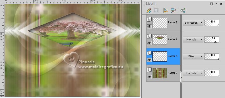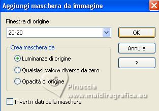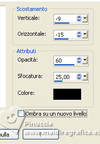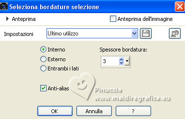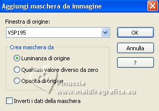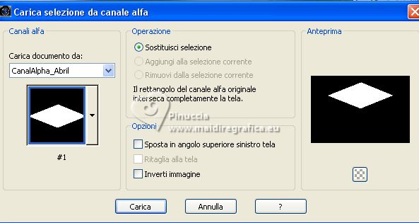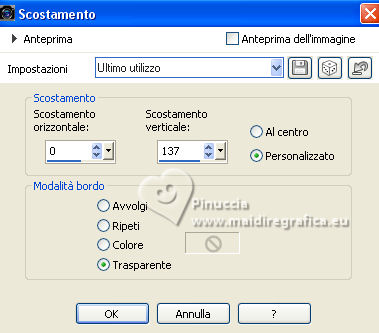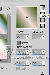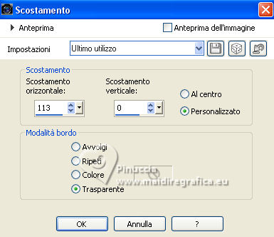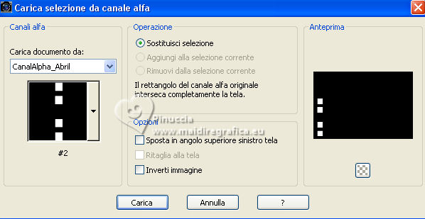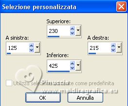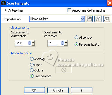 qui puoi trovare qualche risposta ai tuoi dubbi. Se l'argomento che ti interessa non è presente, ti prego di segnalarmelo. Questo tutorial è stato realizzato con PSP19 e tradotto con PSPX7 e PSPX2, ma può essere eseguito anche con le altre versioni di PSP. Dalla versione X4, il comando Immagine>Rifletti è stato sostituito con Immagine>Capovolgi in orizzontale, e il comando Immagine>Capovolgi con Immagine>Capovolgi in verticale. Nelle versioni X5 e X6, le funzioni sono state migliorate rendendo disponibile il menu Oggetti. Con la nuova versione X7, sono tornati Rifletti>Capovolgi, ma con nuove varianti. Vedi la scheda sull'argomento qui traduzione in francese/traduction en français qui/ici traduzione in inglese/english translation qui/here Versioni/Versions quiOccorrente: Un tube a scelta. ![]() Grazie per i tubes Lana, Nikita e Yedralina; per la maschera ValyScrapPassion. (in questa pagina trovi i links ai siti dei creatori di tubes) ![]() se hai problemi con i filtri, consulta la mia sezione filtri qui Filters Unlimited 2.0 qui L&K's - L&K's Raisa qui Cybia - Screenworks qui Graphics Plus - Quick Tile I qui Alien Skin Eye Candy 5 Impact - Perspective Shadow, Glass, Backlight qui Mura's Seamless - Emboss at Alpha qui AAA Frames - Foto Frame - (Facoltativo) AAA Filters - Custom qui I filtri Cybia, Mura's Seamless e Graphics Plus si possono usare da soli o importati in Filters Unlimited (come fare vedi qui) Se un filtro fornito appare con questa icona ![]() non esitare a cambiare modalità di miscelatura e opacità secondo i colori utilizzati. Nelle ultime versioni di PSP non c'è il gradiente di primo piano/sfondo (Corel_06_029) Puoi usare i gradienti delle versioni precedenti. Trovi i gradienti Corel X qui. Metti i preset Cliccando sul file una o due volte (a seconda delle tue impostazioni), automaticamente il preset si installerà nella cartella corretta. perché uno o due clic vedi qui ![]() Apri le maschere in PSP e minimizzale con il resto del materiale. 1. Imposta il colore di primo piano con #32530b, e il colore di sfondo con #f3dddb. ![]() Prepara il colore di primo piano con un Gradiente di primo piano/sfondo, stile Lineare. ![]() 2. Apri CanalAlpha_Abril. Finestra>Duplica o sulla tastiera maiuscola+D per fare una copia. ![]() Chiudi l'originale. La copia, che sarà la base del tuo lavoro, non è vuota, ma contiene le selezioni salvate sul canale alfa. Riempi l'immagine trasparente con il gradiente Lineare.Effetti>Plugins>Cybia - Screenworks ![]() se usi la versione del filtro che lavora senza finestre: Effetti>Plugins>Screenworks - Point Arrow, il risultato non cambia. ![]() 3. Livelli>Nuovo livello raster. Selezione>Seleziona tutto. Apri il misted 0107©Yedralina ![]() Cancella il watermark e vai a Modifica>Copia. Torna al tuo lavoro e vai a Modifica>Incolla nella selezione. Regola>Sfocatura>Sfocatura gaussiana - raggio 20. ![]() Selezione>Deseleziona. 4. Effetti>Effetti di immagine>Motivo unico. ![]() 5. Effetti>Plugins>L&K's - L&K's Raisa. ![]() 6. Effets>Modules Externes>Graphics Plus - Quick Tile I, con i settaggi standard. ![]() Livelli>Unisci>Unisci giù. 7. Livelli>Nuovo livello raster. Selezione>Carica/Salva selezione>Carica selezione da canale alfa. Apri il menu delle selezioni e carica la selezione #1. ![]() 8. Modifica>Incolla nella selezione (il misted è sempre in memoria). Selezione>Inverti. Effetti>Plugins>Alien Skin Eye Candy 5 Impact - Perspective Shadow. Seleziona il preset EC5_DS7_©Yedralina - Shadow color: colore di primo piano. ![]() Selezione>Deseleziona. Abbassa l'opacità di questo livello al +/-74%, secondo i tuoi colori. 9. Apri il tube Deco00206©Yedralina ![]() Modifica>Copia. Torna al tuo lavoro e vai a Modifica>Incolla cmoe nuovo livello. Non occorre spostarlo. Effetti>Plugins>Mura's Seamless - Emboss at Alpha, con i settaggi standard. ![]() Cambia la modalità di miscelatura di questo livello in Sovrapponi. 10. Apri il tube Deco00289©Yedralina ![]() Modifica>Copia. Torna al tuo lavoro e vai a Modifica>Incolla come nuovo livello. Effetti>Effetti di immagine>Scostamento. ![]() Livelli>Disponi>Sposta giù - 2 volte. Cambia la modalità di miscelatura di questo livello in Filtra, o secondo i tuoi colori. ![]() 11. Attiva il livello di sfondo. Selezione>Carica/Salva selezione>Carica selezione da canale alfa. La selezione #2 è subito disponibile. Devi soltanto cliccare Carica. ![]() Livelli>Disponi>Porta in alto. 12. Selezione>Modifica>Contrai - 6 pixels. Selezione>Modifica>Seleziona bordature selezione. ![]() 13. Riempi la selezione con il colore chiaro di sfondo.Selezione>Deseleziona. 14. Effetti>Plugins>Alien Skin Eye Candy 5 Impact - Glass. Seleziona il preset ©Yedralina_Glass4. ![]() Effetti>Effetti di immagine>Scostamento. ![]() 15. Attiva lo strumento Selezione ![]() (non importa il tipo di selezione impostato, perché con la selezione personalizzata si ottiene sempre un rettangolo) clicca sull'icona Selezione personalizzata ![]() e imposta i seguenti settaggi. ![]() Modifica>Taglia (per tenere l'immagine in memoria). Selezione>Deseleziona. 16. Modifica>Incolla come nuovo livello. Immagine>Ridimensiona, all'80%, tutti i livelli non selezionato. Effetti>Effetti di immagine>Scostamento. ![]() Livelli>Unisci>Unisci giù. Livelli>Duplica. 17. Effetti>Plugins>Alien Skin Eye Candy 5 Impact - Backlight. Seleziona il preset EC5_BackL_FF09-©Yedralina ![]() Effetti>Effetti 3D>Sfalsa ombra, colore nero. ![]() Cambia la modalità di miscelatura di questo livello in Sovrapponi. 19. Livelli>Nuovo livello raster. Imposta il colore di primo piano con il colore bianco. Riempi il livello con il colore bianco.Livelli>Nuovo livello maschera>Da immagine. Apri il menu sotto la finestra di origine e vedrai la lista dei files aperti. Seleziona la maschera VSP195 ![]() Livelli>Duplica. Livelli>Unisci>Unisci gruppo. 20. Effetti>Plugins>Mura's Seamless - Emboss at alpha, con i settaggi standard. ![]() 21. Effetti>Plugins>Alien Skin Eye Candy 5 Impact - Perspectiv