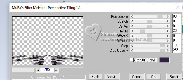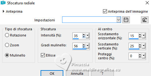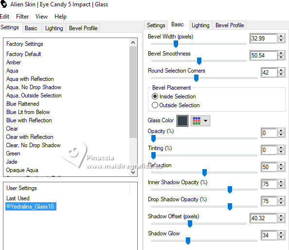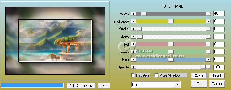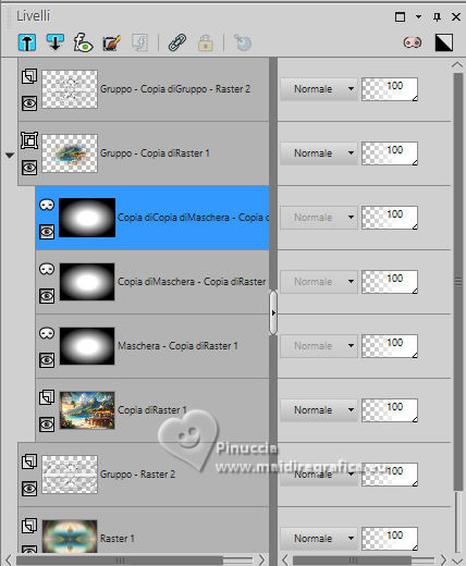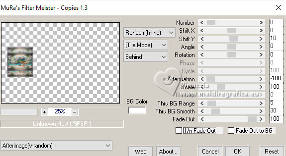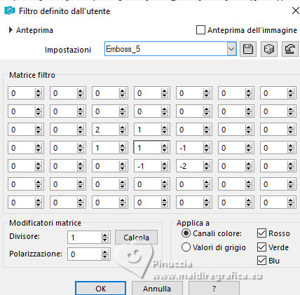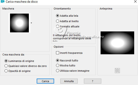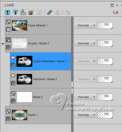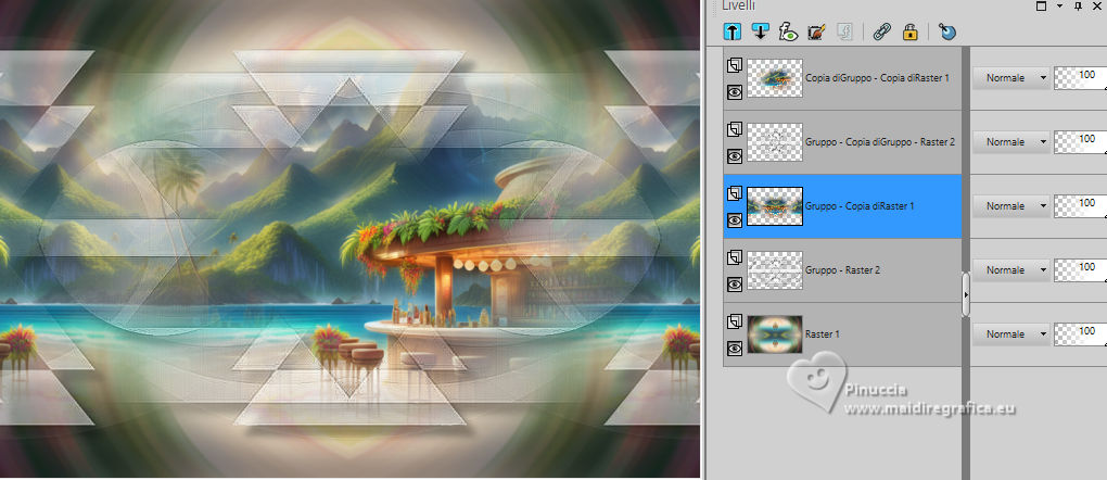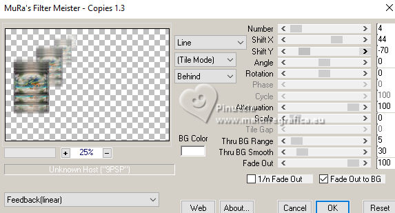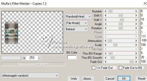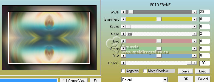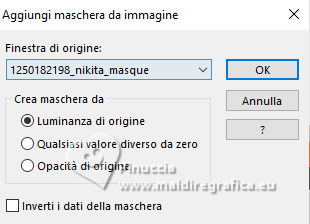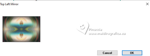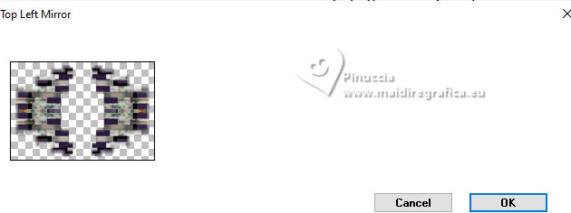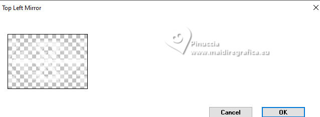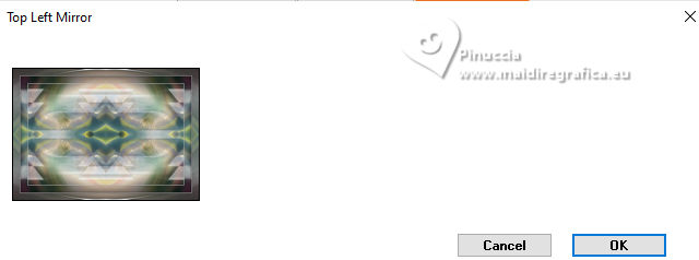 qui puoi trovare qualche risposta ai tuoi dubbi. Se l'argomento che ti interessa non è presente, ti prego di segnalarmelo. Questo tutorial è stato realizzato con PSP2020 e tradotto con PSPX9 e PSP2020, ma può essere eseguito anche con le altre versioni di PSP. Dalla versione X4, il comando Immagine>Rifletti è stato sostituito con Immagine>Capovolgi in orizzontale, e il comando Immagine>Capovolgi con Immagine>Capovolgi in verticale. Nelle versioni X5 e X6, le funzioni sono state migliorate rendendo disponibile il menu Oggetti. Con la nuova versione X7, sono tornati Rifletti>Capovolgi, ma con nuove varianti. Vedi la scheda sull'argomento qui traduzione in francese/traduction en français qui/ici traduzione in inglese/english translation qui/here Versioni/Versions qui![]() Occorrente: ![]() Grazie per i tubes Kamil e per la maschera Nikita. Il resto del materiale è di Yedralina. (in questa pagina trovi i links ai siti dei creatori di tubes) Filtri: se hai problemi con i filtri, consulta la mia sezione filtri qui Filters Unlimited 2.0 qui Simple - Top Left Mirror qui Carolaine and Sensibility - CS_Linear-H qui Mura's Meister - Copies qui Mura's Meister - Perspective Tiling qui AAA Frames - Foto Frame qui I filtri Simple si possono usare da soli o importati in Filters Unlimited (come fare vedi qui) Se un filtro fornito appare con questa icona ![]() non esitare a cambiare modalità di miscelatura e opacità secondo i colori utilizzati. Metti il preset Cliccando sul file una o due volte (a seconda delle tue impostazioni), automaticamente il preset si installerà nella cartella corretta. perchè uno o due clic vedi qui ![]() Metti il preset Emboss 5 nella cartella Impostazioni predefinite. Metti la selezione nella cartella Selezioni. Metti la maschera 20-20 nella cartella Maschere. Apri la seconda maschera in PSP e minimizzala con il resto del materiale. Imposta il colore di primo piano con il colore bianco #ffffff. 1. Apri una nuova immagine trasparente 950 x 650 pixels. Selezione>Seleziona tutto. 2. Apri l'immagine in jpg KamilTube-2746-BG ![]() Modifica>Copia. Torna al tuo lavoro e vai a Modifica>Incolla nella selezione. Selezione>Deseleziona. 3. Livelli>Duplica. Chiudi questo livello e attiva il livello sottostante dell'originale. 4. Regola>Sfocatura>Sfocatura radiale. ![]() 5. Effetti>Effetti di riflesso>Specchio rotante. ![]() 6. Effetti>Plugins>Simple - Top Left Mirror. ![]() 7. Livelli>Nuovo livello raster. Riempi il livello con il colore bianco.8. Livelli>Nuovo livello maschera>Da immagine. Apri il menu sotto la finestra di origine e vedrai la lista dei files aperti. Seleziona la maschera 1250182198_nikita_masque ![]() Livelli>Duplica. ![]() Livelli>Unisci>Unisci gruppo. 9. Effetti>Effetti di immagine>Motivo unico. ![]() 10. Effetti>Plugins>Simple - Top Left Mirror. ![]() 11. Effetti>Effetti 3D>Sfalsa ombra, colore nero. ![]() Effetti>Effetti di bordo>Aumenta. 12. Livelli>Duplica. Livelli>Carica/Salva maschera>Carica maschera da disco. Cerca e carica la maschera 20-20. ![]() Livelli>Unisci>Unisci gruppo. Effetti>Effetti di bordo>Dilata. 13. Livelli>Disponi>Porta in alto. 14. Riapri e attiva il livello sottostante, Copia di Raster 1. Livelli>Carica/Salva maschera>Carica maschera da disco. Carica nuovamente la maschera 20-20. ![]() Livelli>Duplica - 2 volte ![]() Livelli>Unisci>Unisci gruppo. 15. Livelli>Duplica. Livelli>Disponi>Porta in alto. Attiva il livello originale del misted, Gruppo-Copia di Raster 1. ![]() 16. Effetti>Effetti di immagine>Motivo unico, con i settaggi precedenti. ![]() Effetti>Effetti di riflesso>Specchio rotante, con i settaggi standard. ![]() 17. Dovresti avere questo. ![]() 18. Attiva il livello superiore. Modifica>Copia Speciale>Copia Unione. 19. Modifica>Incolla come nuova immagine e minimizza questa immagine. Torna al tuo lavoro. 20. Livelli>Nuovo livello raster. Selezione>Carica/Salva selezione>Carica selezione da disco. Cerca e carica la selezione ©Yedralina_Sel185 ![]() 21. Modifica>Incolla nella selezione (l'immagine minimizzata è sempre in memoria). Regola>Messa a fuoco>Metti a fuoco. 22. Effetti>Plugins>Alien Skin Eye Candy 5 Impact - Glass. Seleziona il preset ©Yedralina_Glass 10 ![]() Selezione>Deseleziona. 23. Attiva l'immagine minimizzata al punto 19 e continua a lavorare su questa immagine. Effetti>Plugins>AAA Frames - Foto Frame. ![]() 24. Immagine>Aggiungi bordatura, 2 pixels, simmetriche, colore bianco. Selezione>Seleziona tutto Modifica>Copia. 25. Immagine>Aggiungi bordatura, 35 pixels, simmetriche, colore bianco. Selezione>Inverti. Modifica>Incolla nella selezione 26. Regola>Sfocatura>Sfocatura radiale, con i settaggi precedenti. ![]() 27. Effetti>Filtro definito dall'utente, seleziona il preset Emboss 5 ![]() 28. Effetti>Plugins>Simple - Top Left Mirror. ![]() Selezione>Deseleziona. 29. Immagine>Aggiungi bordatura, 2 pixels, simmetriche, colore bianco. Immagine>Ridimensiona, al 20%, tutti i livelli selezionato. Regola>Messa a fuoco>Metti a fuoco. 30. Modifica>Copia. 31. Torna al tuo lavoro (sei sempre sul livello superiore). Modifica>Incolla come nuovo livello. 32. Tasto K per attivare lo strumento Puntatore ![]() Posizione X: 46,00 - Posizione Y: 242,00. ![]() Tasto M per deselezionare lo strumento. 33. Effetti>Plugins>Mura's Meister - Copies. ![]() Modifica>Ripeti Copies ![]() 34. Di nuovo ripeti Effetti>Plugins>Mura's Meister - Copies, con questi settaggi. ![]() 35. Effetti>Effetti 3D>Sfalsa ombra, con i settaggi precedenti in negativo ![]() 36. Effetti>Plugins>Carolaine and Sensibility - CS_Linear-H. ![]() 37. Effetti>Effetti di riflesso>Specchio rotante. ![]() 38. Effetti>Plugins>Simple - Top Left Mirror. ![]() Cambia la modalità di miscelatura di questo livello in Luce diffusa. 39. Effetti>Plugins>Mura's Meister - Perspective Tiling. ![]() Effetti>Effetti di bordo>Aumenta. 40. Effetti>Effetti 3D>Sfalsa ombra, con i settaggi precedenti ma in positivo. ![]() 41. Apri il tube principale KamilTube-2746 ![]() Cancella il watermark e 