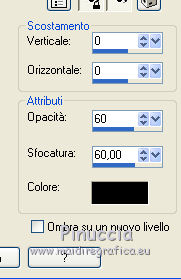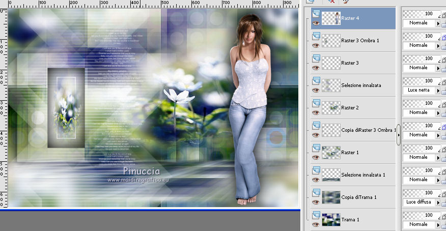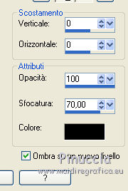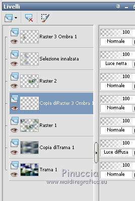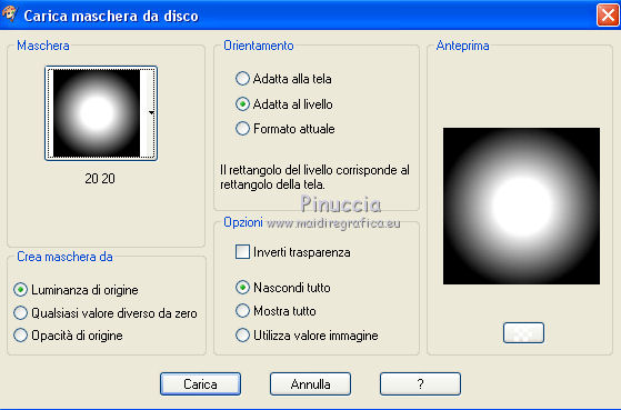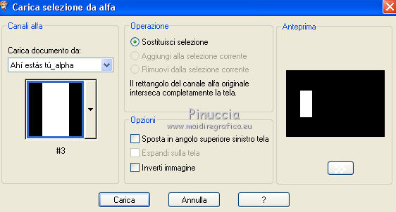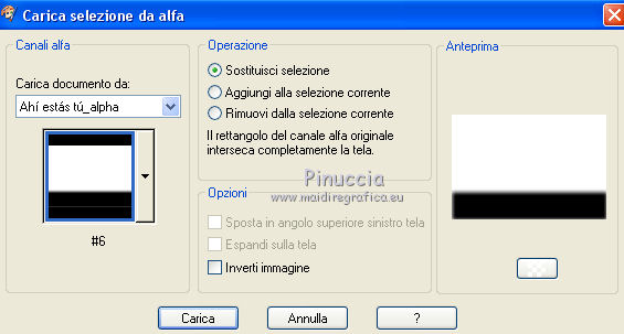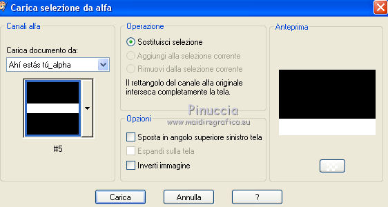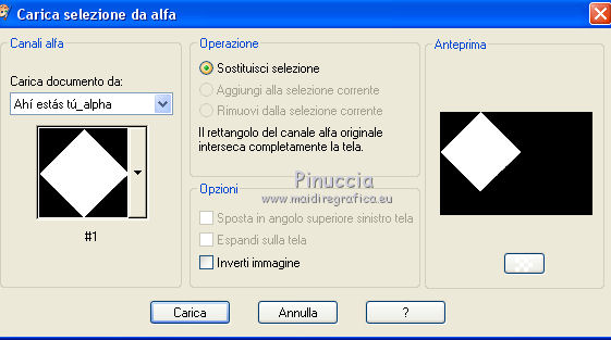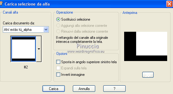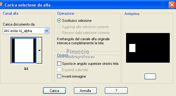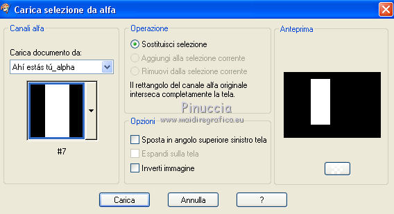 qui puoi trovare qualche risposta ai tuoi dubbi. Se l'argomento che ti interessa non è presente, ti prego di segnalarmelo. Questo tutorial è stato realizzato con Corel19 e tradotto con CorelX7, CorelX2 e CorelX3, ma può essere realizzato anche con le altre versioni di PSP. Dalla versione X4, il comando Immagine>Rifletti è stato sostituito con Immagine>Capovolgi in orizzontale, e il comando Immagine>Capovolgi con Immagine>Capovolgi in verticale. Nelle versioni X5 e X6, le funzioni sono state migliorate rendendo disponibile il menu Oggetti. Con la nuova versione X7, sono tornati Rifletti>Capovolgi, ma con nuove varianti. Vedi la scheda sull'argomento qui traduzione in francese/traduction en français qui/icitraduzione in inglese/english translation qui/hereVersioni/Versions qui Occorrente: Materiale qui Immagine in jpg (trovata su Internet) Facoltativo: un misted. Nel mio caso ho utilizzato la stessa immagine in jpg (1976©Yedralina) Per il tube principale grazie Castorke (castorke_tube_dames__206_082013). (in questa pagina trovi i links ai siti dei creatori di tubes) Filtri: se hai problemi con i filtri, consulta la mia sezione filtri qui Filters Unlimited 2.0 qui Mehdi - Sorting Tiles qui Mura's Meister - Perspective Tiling qui AP 01 [Lines] - Lines SilverLining qui Toadies - What are you qui LOtis Filters - Mosaic Toolkit v.2.022 qui AAA Filters - A Framer qui AAA Filters - Custom qui I filtri Toadies si possono usare da soli o importati in Filters Unlimited (come fare vedi qui) Se un filtro fornito appare con questa icona ![]() non esitare a cambiare modalità di miscelatura e opacità secondo i colori utilizzati. Metti il pennello nella cartella Pennelli. Attenzione, il pennello è composto da due files che non devono essere separati. Vedi gli appunti sui pennelli qui Metti la maschera nella cartella Maschere. I colori saranno determinati dall'immagine scelta. Sarà necessario soltanto un colore scuro alla fine del lavoro. Nel mio caso #101913. 1. Apri l'immagine in jpg. Livelli>Duplica. Livelli>Carica/Salva maschera>Carica maschera da disco. Cerca e carica la maschera 20-20. ![]() Livelli>Duplica. ![]() Livelli>Unisci>Unisci gruppo. Attiva il livello di sfondo e vai a Modifica>Copia. Minimizza l'immagine (più tardi userai anche il livello della maschera). 2. Apri l'immagine alpha Ahi_estas tu_alpha. Finestra>Duplica o sulla tastiera maiuscola+D per fare una copia. ![]() Chiudi l'originale. La copia, che sarà la base del tuo lavoro, non è vuota, ma contiene le selezioni salvate sul canale alfa. Selezione>Seleziona tutto. Modifica>Incolla nella selezione (l'immagine jpg in memoria). Selezione>Deseleziona. Effetti>Plugins>Mehdi - Sorting Tiles. ![]() Effetti>Effetti di bordo>Aumenta di più. Effetti>Plugins>LOtis Filters - Mosaic Tookit v.2.022. ![]() Livelli>Duplica. 3. Effetti>Effetti di immagine>Motivo unico. ![]() Effetti>Plugins>Filters Unlimited 2.0 - Toadies - What are you, con i settaggi standard. ![]() Effetti>Effetti di immagine>Motivo unico. ![]() Cambia la modalità di miscelatura di questo livello in Luce diffusa. Attiva il livello di sfondo, Trama 1. 4. Selezione>Carica/Salva selezione>Carica selezione da canale alfa. La selezione #1 è subito disponibile. Devi soltanto cliccare Carica. ![]() Selezione>Innalza selezione a livello. Livelli>Disponi>Porta in alto. Regola>Sfocatura>Sfocatura gaussiana - raggio 20. ![]() Effetti>Plugins>AP [Lines] - Lines SilverLining. ![]() Selezione>Inverti. Effetti>Effetti 3D>Sfalsa ombra, colore nero. ![]() Selezione>Deseleziona. Effetti>Effetti di immagine>Motivo unico. ![]() Effetti>Plugins>Toadies - What are you. ![]() Cambia la modalità di miscelatura di questo livello in Luce netta. 5. Livelli>Nuovo livello raster. Selezione>Seleziona tutto. Attiva l'immagine che hai minimizzato prima. Attiva il livello superiore della maschera e vai a Modifica>Copia. Torna al tuo lavoro e vai a Modifica>Incolla nella selezione. Selezione>Deseleziona. Effetti>Effetti di immagine>Motivo unico. ![]() Regola>Sfocatura>Sfocatura gaussiana, raggio 10. ![]() Livelli>Disponi>Sposta giù. 6. Livelli>Nuovo livello raster. Selezione>Carica/Salva selezione>Carica selezione da canale alfa. Apri il menu delle selezioni e carica la selezione #2. ![]() Modifica>Incolla nella selezione (il misted in memoria). Selezione>Deseleziona. Regola>Messa a fuoco>Metti a fuoco. 7. Livelli>Nuovo livello raster. Livelli>Disponi>Sposta su. Selezione>Carica/Salva selezione>Carica selezione da canale alfa. Apri il menu delle selezioni e carica la selezione #3. ![]() Modifica>Incolla nella selezione (il misted in memoria). Regola>Messa a fuoco>Metti a fuoco. Selezione>Inverti. Effetti>Effetti 3D>Sfalsa ombra, colore nero, ombra su nuovo livello selezionato. ![]() Rimani posizionato sul livello dell'ombra. 8. Livelli>Nuovo livello raster. Selezione>Inverti. Selezione>Modifica>Contrai - 30 pixels. Imposta il colore di primo piano con il colore bianco. Riempi la selezione con il colore bianco.Selezione>Modifica>Contrai - 2 pixels. Premi sulla tastiera il tasto CANC ![]() Selezione>Deseleziona. Attiva il livello superiore. Livelli>Unisci>Unisci giù - 2 volte. Livelli>Duplica. 9. Immagine>Ridimensiona, al 55%, tutti i livelli non selezionato. Oggetti>Allinea>Sinistra, o attiva lo strumento Puntatore (tasto K)e imposta Posizione X: 0,00 ![]() Selezione>Carica/Salva selezione>Carica selezione da canale alfa. Apri il menu delle selezioni e carica la selezione #4. ![]() Premi sulla tastiera il tasto CANC. Selezione>Deseleziona. Livelli>Disponi>Sposta giù - 3 volte, deve trovarsi sopra il livello Raster 1. ![]() 10. Attiva il livello Copia di Trama 1. Selezione>Carica/Salva selezione>Carica selezione da canale alfa. Apri il menu delle selezioni e carica la selezione #5. ![]() Selezione>Innalza selezione a livello. Livelli>Disponi>Sposta su. Mantieni selezionato. Effetti>Plugins>Mura's Meister - Perspective Tiling. ![]() Selezione>Carica/Salva selezione>Carica selezione da canale alfa.