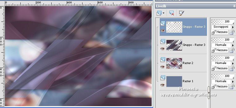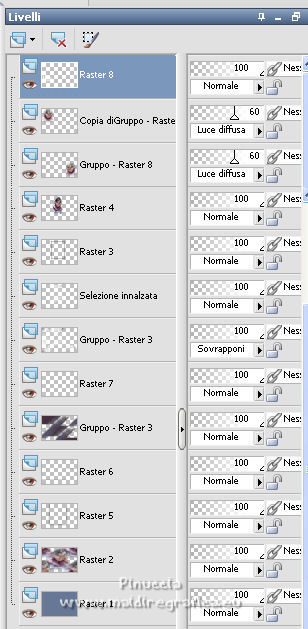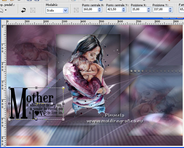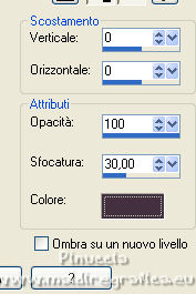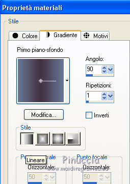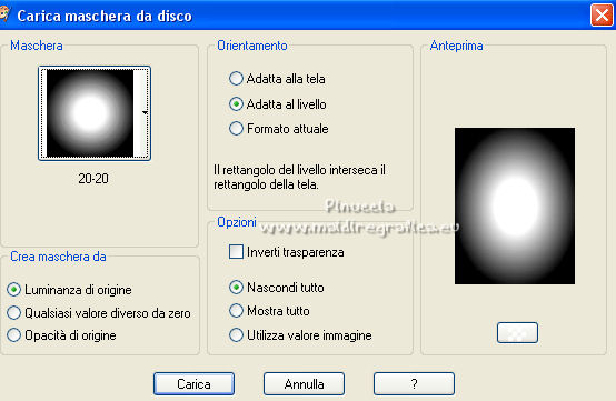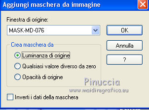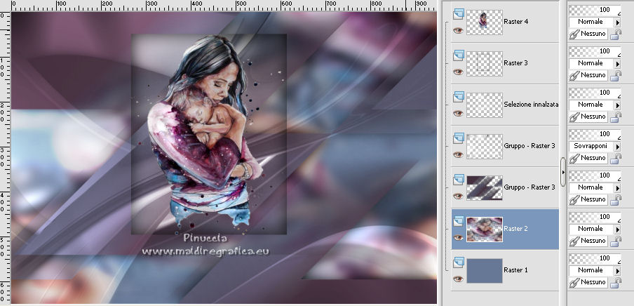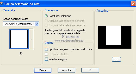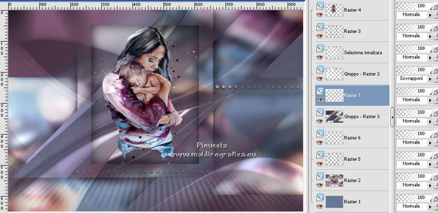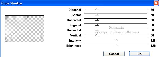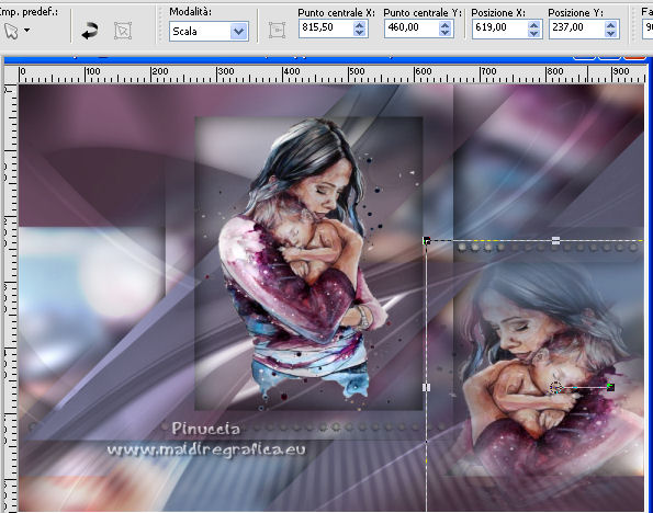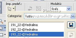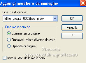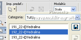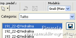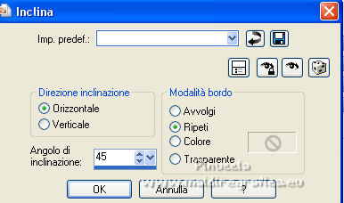 qui puoi trovare qualche risposta ai tuoi dubbi. Se l'argomento che ti interessa non è presente, ti prego di segnalarmelo. Questo tutorial è stato realizzato con Corel19 e tradotto con CorelX7, CorelX2 e CorelX3, ma può essere eseguito anche con le altre versioni di PSP. Dalla versione X4, il comando Immagine>Rifletti è stato sostituito con Immagine>Capovolgi in orizzontale, e il comando Immagine>Capovolgi con Immagine>Capovolgi in verticale. Nelle versioni X5 e X6, le funzioni sono state migliorate rendendo disponibile il menu Oggetti. Con la nuova versione X7, sono tornati Rifletti>Capovolgi, ma con nuove varianti. Vedi la scheda sull'argomento qui traduzione in francese/traduction en français qui/ici traduzione in inglese/english translation qui/here Versioni/Versions quiOccorrente: Un tube a scelta. Il resto del materiale qui Per il tube usato grazie EllyD Per le maschere grazie Ildiko e MD. (in questa pagina trovi i links ai siti dei creatori di tubes) Filtri: se hai problemi con i filtri, consulta la mia sezione filtri qui Filters Unlimited 2.0 qui Mura's Seamless - Emboss at Alpha qui Graphics Plus - Cross Shadow qui Simple - Top Left Mirror qui AAA Frames - Foto Frame qui I filtri Mura's Seamless, Graphics Plus e Simple si possono usare da soli o importati in Filters Unlimited (come fare vedi qui) Se un filtro fornito appare con questa icona ![]() non esitare a cambiare modalità di miscelatura e opacità secondo i colori utilizzati. Nelle ultime versioni di PSP non c'è il gradiente di primo piano/sfondo (Corel_06_029) Puoi usare i gradienti delle versioni precedenti. Trovi qui i gradienti Corel X. ![]() Metti i preset nella cartella Impostazioni predefinite. Metti la maschera 20-20 nella cartella Maschere. Apri le altre maschere in PSP e minimizzale con il resto del materiale. Imposta il colore di primo piano con #667896, e il colore di sfondo con #44303e. ![]() 1. Apri CanalAlpha_AMORDEMADRE. Finestra>Duplica o sulla tastiera maiuscola+D per fare una copia. ![]() Chiudi l'originale. La copia, che sarà la base del tuo lavoro, non è vuota, ma contiene le selezioni salvate sul canale alfa. Se hai problemi con il canale alfa, puoi utilizzare le selezioni da mettere nella cartella Selezioni. Riempi l'immagine trasparente con il colore di primo piano.2. Livelli>Nuovo livello raster. Selezione>Seleziona tutto. Apri il tuo tube e vai a Modifica>Copia. Torna al tuo lavoro e vai a Modifica>Incolla nella selezione. Selezione>Deseleziona. 3. Effetti>Effetti di immagine>Motivo unico. ![]() Regola>Sfocatura>Sfocatura gaussiana - raggio 10. ![]() 4. Passa il colore di primo piano a Gradiente di primo piano/sfondo, stile Lineare. ![]() Livelli>Nuovo livello raster. Riempi il livello con il gradiente.Livelli>Nuovo livello maschera>Da immagine. Apri il menu sotto la finestra di origine e vedrai la lista dei files aperti. Seleziona la maschera ildiko_create_0002free_mask. ![]() Livelli>Unisci>Unisci gruppo. Effetti>Effetti di immagine>Motivo unico, con i settaggi precedenti. ![]() 5. Effetti>Effetti geometrici>Inclina. ![]() Effetti>Effetti 3D>Sfalsa ombra, colore nero. ![]() 6. Imposta il colore di primo piano con il colore bianco. Livelli>Nuovo livello raster. Riempi il livello con il colore bianco.Livelli>Nuovo livello maschera>Da immagine. Apri il menu sotto la finestra di origine e seleziona la maschera MASK-MD-076. ![]() Livelli>Unisci>Unisci gruppo. Immagine>Capovolgi. Immagine>Rifletti. 7. Effetti>Plugins>Mura's Seamless - Emboss at Alpha, con i settaggi standard. ![]() 8. Effetti>Plugins>Graphics Plus - Cross Shadow, con i settaggi standard. ![]() Cambia la modalità di miscelatura di questo livello in Sovrapponi. ![]() Rimani su questo livello. 9. Selezione>Carica/Salva selezione>Carica selezione da canale alfa. La selezione #1 è subito disponibile. Devi soltanto cliccare Carica. (se usi la selezione da disco: carica da disco la selezione ©Yedralina_Sel761) ![]() Selezione>Innalza selezione a livello. Mantieni selezionato. 10. Livelli>Nuovo livello raster. Selezione>Inverti. Effetti>Effetti 3D>Sfalsa ombra, colore nero. ![]() Selezione>Inverti. Mantieni sempre selezionato. 11. Livelli>Nuovo livello raster. Modifica>Incolla nella selezione (il vostro tube è sempre in memoria). Selezione>Deseleziona. 12. Attiva il livello Raster 2. ![]() Livelli>Nuovo livello raster. Selezione>Carica/Salva selezione>Carica selezione da canale alfa. Apri il menu delle selezioni e carica la selezione #2. (se usi la selezione da disco: carica da disco la selezione ©Yedralina_Sel760) ![]() Effetti>Effetti 3D>Sfalsa ombra, colore nero. ![]() Selezione>Deseleziona. 13. Apri il tube Deco00290©Yedralina e vai a Modifica>Copia. Torna al tuo lavoro e vai a Modifica>Incolla come nuovo livello. Effetti>Effetti di immagine>Scostamento. ![]() 14. Apri il tube Deco00264©Yedralina e vai a Modifica>Copia. Torna al tuo lavoro e vai a Modifica>Incolla come nuovo livello. Oggetti>Allinea>Inferiore, o attiva lo strumento Puntatore (tasto K sulla tastiera)e imposta Posizione Y: 482.00 ![]() Tasto M per deselezionare lo strumento. Livelli>Disponi>Sposta su. ![]() 15. Attiva nuovamente il tuo tube. Con lo strumento Selezione , rettangolotraccia una parte del tube a tuo piacimento. ![]() Modifica>Copia. Torna al tuo lavoro e vai a Modifica>Incolla come nuovo livello. Livelli>Disponi>Porta in alto. 16. Livelli>Carica/Salva maschera>Carica maschera da disco. Cerca e carica la maschera 20-20. ![]() Livelli>Duplica. Livelli>Unisci>Unisci gruppo. 17. Ridimensiona, se necessario. Facoltativo: Immagine>Rifletti (dipende dal tube scelto) e sposta il tube in basso a destrao tasto K per attivare lo strumento Puntatore ![]() apri il menu delle impostazioni e seleziona il preset 191_22-©Yedralina ![]() ![]() Cambia la modalità di miscelatura di questo livello in Luce diffusa, e abbassa l'opacità +/-50%, secondo il tuo tube. 18. Livelli>Duplica. Immagine>Rifletti. Apri il menu delle impostazioni e seleziona il preset 192_22-