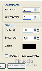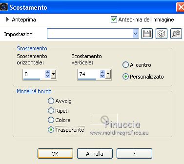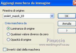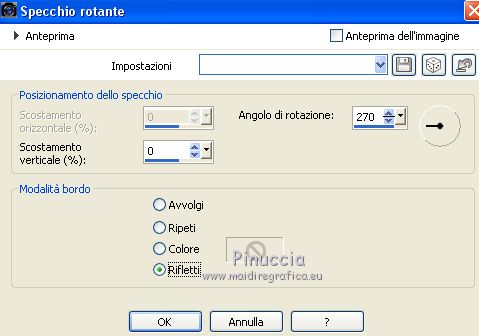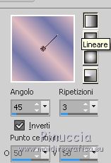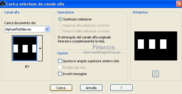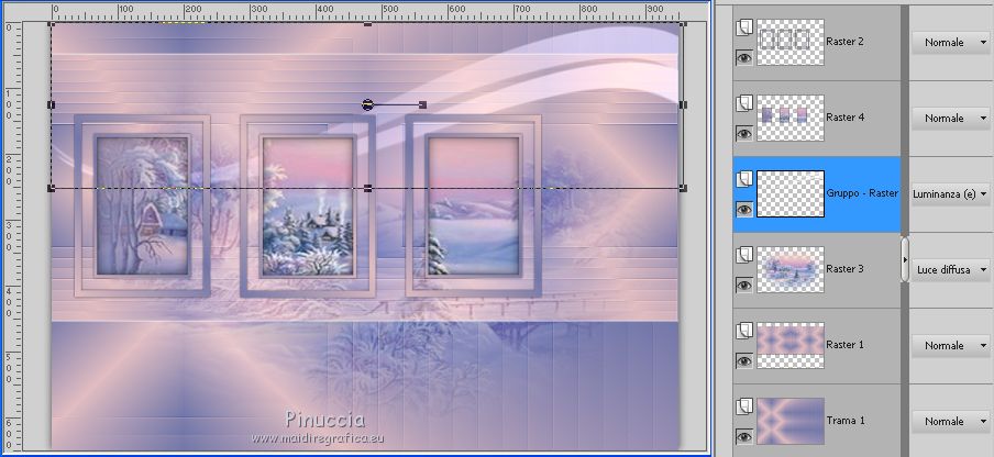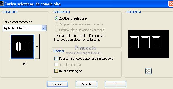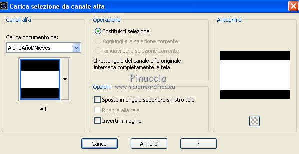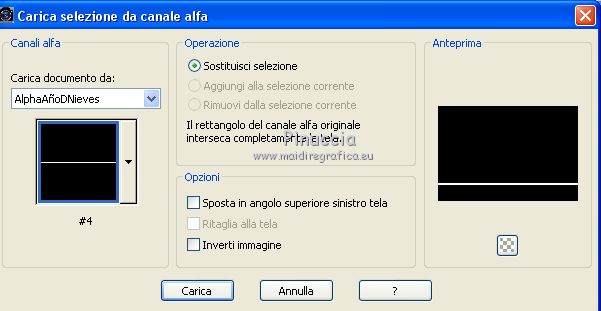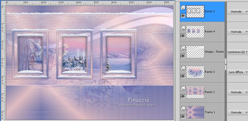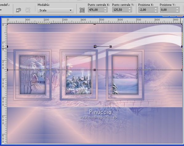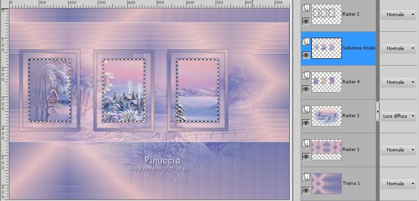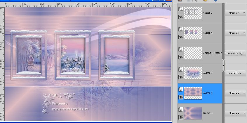 qui puoi trovare qualche risposta ai tuoi dubbi. Se l'argomento che ti interessa non è presente, ti prego di segnalarmelo. Questo tutorial è stato realizzato con Corel19 e tradotto con CorelX7, CorelX2 e CorelX3, ma può essere realizzato anche con le altre versioni di PSP. Dalla versione X4, il comando Immagine>Rifletti è stato sostituito con Immagine>Capovolgi in orizzontale, e il comando Immagine>Capovolgi con Immagine>Capovolgi in verticale. Nelle versioni X5 e X6, le funzioni sono state migliorate rendendo disponibile il menu Oggetti. Con la nuova versione X7, sono tornati Rifletti>Capovolgi, ma con nuove varianti. Vedi la scheda sull'argomento qui traduzione in francese/traduction en français qui/icitraduzione in inglese/english translation qui/here Versioni/Versions quiOccorrente: Tubes a scelta Il resto del materiale qui Per i tubes usati e non forniti grazie Valy (femmeVSP191) e Alenza (alenza_tube_848). Per la maschera grazie Smart (smArt_maszk_69) I tube accessori sono di Yedralina. (in questa pagina trovi i links ai siti dei creatori di tubes) Filtri: se hai problemi con i filtri, consulta la mia sezione filtri qui Filters Unlimited 2.0 qui Mura's Seamless - Emboss at Alpha qui Alien Skin Eye Candy 5 Nature - Snow Drift qui Screenworks - Point Array qui AP [Utility] - Repeats 4 qui I filtri Mura's Seamless e Screenworks si possono usare da soli o importati in Filters Unlimited (come fare vedi qui) Se un filtro fornito appare con questa icona ![]() non esitare a cambiare modalità di miscelatura e opacità secondo i colori utilizzati. Nelle ultime versioni di PSP non c'è il gradiente di primo piano/sfondo (Corel_06_029) Puoi usare i gradienti delle versioni precedenti. Trovi qui i gradienti Corel X. Metti il preset Cliccando sul file una o due volte (a seconda delle tue impostazioni), automaticamente il preset si installerà nella cartella corretta. perchè uno o due clic vedi qui Apri la maschera in PSP e minimizzala con il resto del materiale. Scegli due colori dal misted, il più scuro per il colore di primo piano, il colore 4 per il colore dello sfalsa ombra ![]() Imposta il colore di primo piano con il colore scuro #7277aa e il colore di sfondo con il colore chiaro #e1bdc1. ![]() Passa il colore di primo piano a Gradiente di primo piano/sfondo, stile Lineare. ![]() Passa il colore di sfondo a Gradiente di primo piano/sfondo, stile Lineare. ![]() ![]() 1. Apri Alpha_AñnoDNieves. Finestra>Duplica o sulla tastiera maiuscola+D per fare una copia. ![]() Chiudi l'originale. La copia, che sarà la base del tuo lavoro, non è vuota, ma contiene le selezioni salvate sul canale alfa. Riempi l'immagine trasparente con il gradiente di primo piano.2. Livelli>Nuovo livello raster Selezione>Carica/Salva selezione>Carica selezione da canale alpha. La selezione #1 è subito disponibile. Devi soltanto cliccare Carica. ![]() Riempi la selezione con il gradiente di primo piano.Mantieni selezionato. Immagine>Rifletti. Nella paletta dei livelli, clicca sul livello con il tasto destro del mouse, e seleziona Immobilizza ![]() Effetti>Plugins>AP [Utility] - Repeats4, con i settaggi standard. ![]() Effetti>Effetti di riflesso>Specchio rotante. ![]() Effetti>Plugins>Mura's Seamless - Emboss at Alpha, con i settaggi standard. ![]() Selezione>Deseleziona. Effetti>Effetti di immagine>Scostamento. ![]() Effetti>Effetti di bordo>Aumenta di più. Attiva il livello di sfondo. Ripeti Effetti>Plugins>AP [Utility] - Repeats4, con i settaggi standard. ![]() Effetti>Effetti di riflesso>Specchio rotante. ![]() Effetti>Effetti di bordo>Aumenta di più. 3. Livelli>Nuovo livello raster. Livelli>Disponi>Porta in alto. Selezione>Carica/Salva selezione>Carica selezione da canale alfa. Apri il menu delle selezioni carica la selezione #2. ![]() Riempi la selezione con il gradiente di sfondo.Effetti>Effetti 3D>Sfalsa ombra, colore nero. ![]() Selezione>Deseleziona. 4. Livelli>Nuovo livello raster. Selezione>Seleziona tutto. Apri il misted del paesaggio e vai a Modifica>Copia. Torna al tuo lavoro e vai a Modifica>Incolla nella selezione. Livelli>Disponi>Sposta giù. Cambia la modalità di miscelatura di questo livello in Luce diffusa. puoi lasciare il livello in modo Normale, e abbassare l'opacità, secondo i colori del tuo misted. Per esempio, nel mio secondo lavoro, ho soltanto abbassato l'opacità al 65%. 5. Livelli>Nuovo livello raster. Selezione>Carica/Salva selezione>Carica selezione da canale alfa. Apri il menu delle selezioni carica la selezione #3. ![]() Riempi la selezione con il gradiente di primo piano.Mantieni selezionato. Attiva il livello del misted. Selezione>Innalza selezione a livello. Livelli>Disponi>Sposta su ![]() Livelli>Unisci>Unisci giù. Selezione>Inverti. Effetti>Effetti 3D>Sfalsa ombra, colore nero. ![]() Selezione>Deseleziona. 6. Livelli>Nuovo livello raster. Imposta il colore di primo piano con il colore bianco. ![]() Riempi il livello con il colore bianco.Livelli>Nuovo livello maschera>da immagine. Apri il menu sotto la finestra di origine e vedrai la lista dei files aperti. Seleziona la maschera smArt_maszk_69. ![]() Livelli>Unisci>Unisci gruppo. Immagine>Capovolgi. Tasto K sulla tastiera per attivare lo strumento Puntatore ![]() e regola i settaggi per spostare la maschera in alto, leggermente tirata ai lati ![]() Tasto M per deselezionare lo strumento. Effetti>Plugins>Mura's Seamless - Emboss at alpha, con i settaggi standard. ![]() Livelli>Disponi>Sposta giù. Cambia la modalità di miscelatura di questo livello in Luminanza (esistente). ![]() 7. Attiva il livello soprastante dei quadri, Raster 4. Effetti>Plugins>Alien Skin Eye Candy 5 Nature - Snow Drift seleziona il preset SnowDrift_01-Yedra e ok. ![]() Attiva il livello delle cornici, Raster 2. Effetti>Plugins>Alien Skin Eye Candy 5 Nature - Snow Drift seleziona il preset SnowDrift_02-Yedra e ok. ![]() Attiva il livello Raster 1. ![]() Ripeti Effetti>Plugins>Alien Skin Eye Candy 5 Nature - Snow Drift, con i settaggi precedenti (