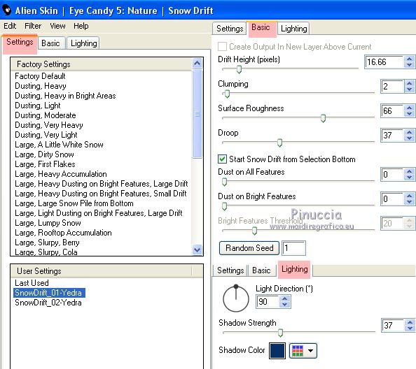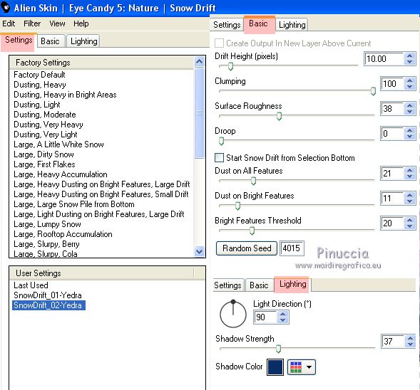 Repeat Effects>Plugins>Alien Skin Eye Candy 5 Nature - Snow Drift, same settings (preset SnowDrift_02-Yedra)