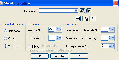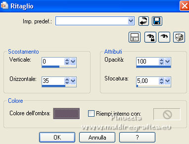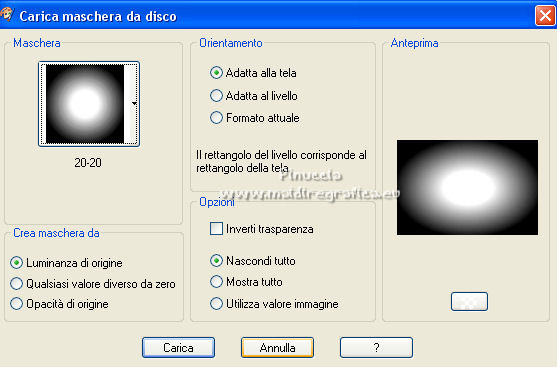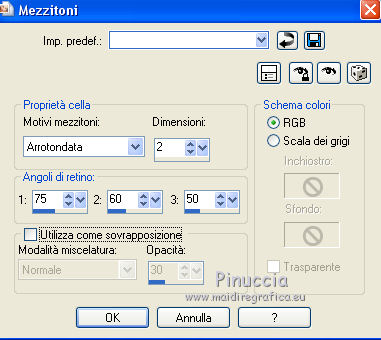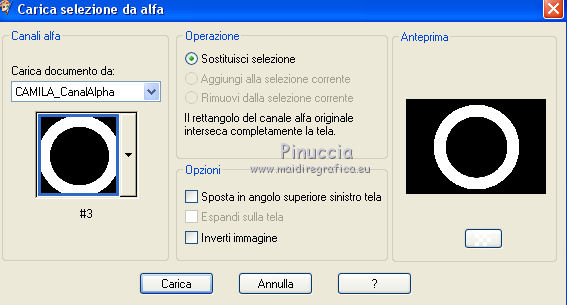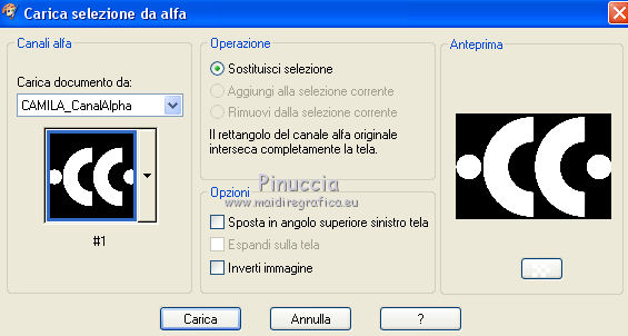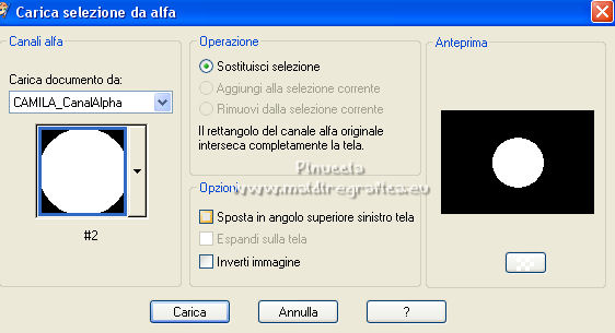 qui puoi trovare qualche risposta ai tuoi dubbi. Se l'argomento che ti interessa non è presente, ti prego di segnalarmelo. Questo tutorial è stato realizzato con Corel19 e tradotto con CorelX7, CorelX2 e CorelX3, ma può essere eseguito anche con le altre versioni di PSP. Dalla versione X4, il comando Immagine>Rifletti è stato sostituito con Immagine>Capovolgi in orizzontale, e il comando Immagine>Capovolgi con Immagine>Capovolgi in verticale. Nelle versioni X5 e X6, le funzioni sono state migliorate rendendo disponibile il menu Oggetti. Con la nuova versione X7, sono tornati Rifletti>Capovolgi, ma con nuove varianti. Vedi la scheda sull'argomento qui traduzione in francese/traduction en français qui/ici traduzione in inglese/english translation qui/here Versioni/Versions quiOccorrente: A scelta: un'immagine in jpg, il tube di un personaggio e un tube accessorio. Il resto del materiale qui Per il materiale usato e non fornito, grazie Luz Cristina (6530-Luz Cristina) e Bea (deco296_beas_tube). (in questa pagina trovi i links ai siti dei creatori di tubes) Filtri: se hai problemi con i filtri, consulta la mia sezione filtri qui Filters Unlimited 2.0 qui Simple - Pizza Slice Mirror, Top Left Mirror qui Sybia - POPERV qui Graphics Plus - Cross Shadow qui Alien Skin Eye Candy 5 Impact - Perspective Shadow, Glass qui Flaming Pear - Flexify 2 qui AAA Frames - Foto Frame qui Facoltativo: Adjust - Variations qui Facoltativo: Nik Software - Color Efex Pro qui I filtri Simple, Sybia e Graphics Plus si possono usare da soli o importati in Filters Unlimited (come fare vedi qui) Se un filtro fornito appare con questa icona ![]() non esitare a cambiare modalità di miscelatura e opacità secondo i colori utilizzati. Metti i preset Cliccando sul file una o due volte (a seconda delle tue impostazioni), automaticamente il preset si installerà nella cartella corretta. perchè uno o due clic vedi qui Metti il preset per Flexify in una cartella a scelta. Lo importerai da questa cartella, quando ti servirà. ![]() Metti la maschera 20-20 nella cartella Maschere. *** Per determinare i colori del tuo lavoro, prima di cominciare, colorizza a tuo piacimento il frattale che hai scelto. Per l'esempio ho scelto il filtro Adjust-Variations. Primo piano #d5d4bd, colore di sfondo #695868. ![]() *** Per cominciare, apri la tua immagine frattale: Livelli>Duplica. Livelli>Carica/Salva maschera>Carica maschera da disco. Cerca e carica la maschera 20-20. ![]() Livelli>Unisci>Unisci gruppo. E così avrai due livelli: il primo con l'immagine in jpg e il secondo con l'immagine sfumata ![]() Attiva il livello inferiore dell'immagine in jpg. Modifica>Copia. 1. Apri CAMILA_CanalAlpha (950 x 650 pixels). Finestra>Duplica o sulla tastiera maiuscola+D per fare una copia. ![]() Chiudi l'originale. La copia, che sarà la base del tuo lavoro, non è vuota, ma contiene le selezioni salvate sul canale alfa. Rinomina il livello Raster 1. 2. Selezione>Seleziona tutto. Modifica>Incolla nella selezione. Selezione>Deseleziona. 3. Effetti>Plugins>Filters Unlimited 2.0 - Simple - Pizza Slice Mirror. ![]() 4. Effetti>Effetti di immagine>Motivo unico. ![]() 5. Effetti>Effetti di riflesso>Specchio rotante. ![]() 6. Regola>Sfocatura>Sfocatura gaussiana - raggio 10. ![]() 7. Effetti>Plugins>AAA Frames - Foto Frame. ![]() 8. Effetti>Plugins>Sybia - POPERV. ![]() 9. Effetti>Effetti di immagine>Motivo unico, con i settaggi precedenti. ![]() 10. Effetti>Plugins>Simple - Top Left Mirror. ![]() 11. Effetti>Effetti di riflesso>Specchio rotante. ![]() 12. Livelli>Duplica. Regola>Sfocatura>Sfocatura gaussiana - raggio 5. ![]() 13. Effetti>Plugins>Flaming Pear - Flexify 2 clicca sul bottone rosso e cerca il preset Yedra_Flexify 2.q2q nella cartella in cui lo hai salvato. ![]() Questi i settaggi, clicca ok per chiudere. ![]() 14. Effetti>Plugins>Alien Skin Eye Candy 5 Impact - Perspective Shadow. Seleziona il preset EC5_DS8_©Yedralina e ok. ![]() 15. Abbassa l'opacità di questo livello +/-54%. Livelli>Duplica. 16. Effetti>Effetti di riflesso>Specchio rotante. ![]() Livelli>Disponi>Sposta giù. Attiva nuovamente il livello superiore, Copia di Raster 1. 17. Livelli>Nuovo livello raster. Selezione>Carica/Salva selezione>Carica selezione da canale alfa. La selezione #1 è subito disponibile. Devi soltanto cliccare Carica. ![]() 18. Effetti>Effetti 3D>Ritaglio, colore scuro di sfondo. ![]() 19. Effetti>Effetti artistici>Mezzitoni. ![]() Selezione>Deseleziona. 20. Effetti>Plugins>Alien Skin Eye Candy 5 Impact - Perspective Shadow, con i settaggi precedenti. Abbassa l'opacità di questo livello +/-60%. Attiva nuovamente il livello sottostante, Copia di Raster 1. 21. Effetti>Plugins>Graphics Plus - Cross Shadow. ![]() 22. Attiva il livello di sfondo. Selezione>Carica/Salva selezione>Carica selezione da canale alfa. Apri il menu delle selezioni e carica la selezione #2. ![]() 23. Attiva il frattale e attiva il livello superiore con il misted creato con la maschera. Modifica>Copia. Torna al tuo lavoro e vai a Modifica>Incolla come nuovo livello. Posiziona correttamente il misted sulla selezione.Selezione>Inverti. Premi sulla tastiera il tasto CANC ![]() Selezione>Inverti. Effetti>Plugins>Alien Skin Eye Candy 5 Impact - Glass. Seleziona il preset glass 4 e ok. ![]() Selezione>Deseleziona. 24. Livelli>Duplica. Immagine>Ridimensiona, all'85%, tutti i livelli non selezionato. 25. Effetti>Effetti di immagine>Motivo unico, con i settaggi precedenti. ![]() Livelli>Disponi>Sposta giù. 26. Livelli>Nuovo livello raster. Selezione>Carica/Salva selezione>Carica selezione da canale alfa. Apri il menu delle selezioni e carica la selezione #3. ![]() 27. Effetti>Effetti 3D>Ritaglio, con i settaggi precedenti. ![]() Selezione>Deseleziona. 28. Effetti>Effetti artistici>Mezzitoni, con i settaggi precedenti. ![]() 29. Attiva lo strumento Selezione ![]() (non importa il tipo di selezione impostato, perchè con la selezione personalizzata si ottiene sempre un rettangolo) clicca sull'