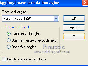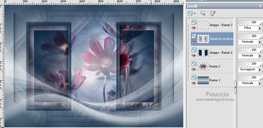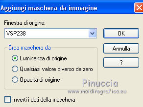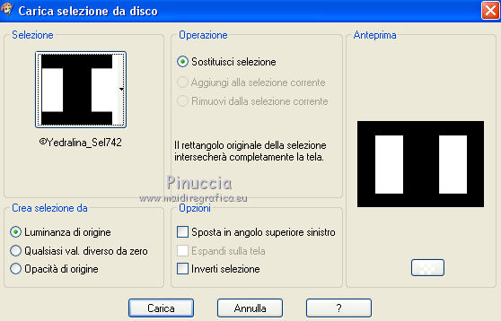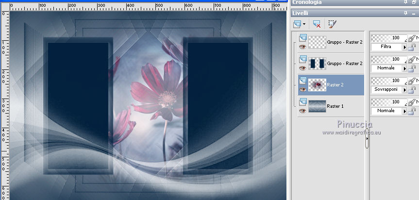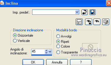 qui puoi trovare qualche risposta ai tuoi dubbi. Se l'argomento che ti interessa non è presente, ti prego di segnalarmelo. Questo tutorial è stato realizzato con Corel19 e tradotto con CorelX7, CorelX2 e CorelX3, ma può essere realizzato anche con le altre versioni di PSP. Dalla versione X4, il comando Immagine>Rifletti è stato sostituito con Immagine>Capovolgi in orizzontale, e il comando Immagine>Capovolgi con Immagine>Capovolgi in verticale. Nelle versioni X5 e X6, le funzioni sono state migliorate rendendo disponibile il menu Oggetti. Con la nuova versione X7, sono tornati Rifletti>Capovolgi, ma con nuove varianti. Vedi la scheda sull'argomento qui traduzione in francese/traduction en français qui/icitraduzione in inglese/english translation qui/hereVersioni/Versions qui Occorrente: Materiale qui Per i tubes grazie Beatriz (2732-woman-LB TUBES) e Yedralina (1955©©Yedralina) Per le maschere grazie Narah (Narah_Mask_1326) e Valy (VSP238). (in questa pagina trovi i links ai siti dei creatori di tubes) Filtri: se hai problemi con i filtri, consulta la mia sezione filtri qui Filters Unlimited 2.0 qui &<Bkg Designer sf10I> - Cruncher (da importare in Unlimited) qui VM Toolbox - Instant Tile qui Alf's Border FX - Mirror Bevel qui AAA Filters - A Framer qui I filtri Alf's Border FX e VM Toolbox si possono usare da soli o importati in Filters Unlimited (come fare vedi qui) Se un filtro fornito appare con questa icona ![]() non esitare a cambiare modalità di miscelatura e opacità secondo i colori utilizzati. Nelle ultime versioni di PSP non c'è il gradiente di primo piano/sfondo (Corel_06_029) Puoi usare i gradienti delle versioni precedenti. Trovi qui i gradienti Corel X. Metti la selezione nella cartella Selezioni. Apri le maschere in PSP e minimizzale con il resto del materiale. Imposta il colore di primo piano con il colore bianco #ffffff, e il colore di sfondo con #04223e. ![]() Passa il colore di sfondo a Gradiente di primo piano/sfondo, stile Lineare. ![]() 1. Apri una nuova immagine trasparente 950 x 650 pixels, e riempila con il gradiente.Effetti>Plugins>Filters Unlimited 2.0 - Alf's Border FX - Mirror Bevel, con i settaggi standard. ![]() Effetti>Plugins>Filters Unlimited 2.0 - &<Bkg Designer sf10I> - Cruncher, con i settaggi standard. ![]() Effetti>Effetti di bordo>Aumenta di più. Effetti>Effetti geometrici>Inclina. ![]() Effetti>Effetti di immagine>Motivo unico. ![]() Effetti>Plugins>VM Toolbox - Instant Tile, con i settaggi standard. ![]() 2. Livelli>Nuovo livello raster. Riempi il livello con il colore scuro di sfondo.Livelli>Nuovo livello maschera>da immagine. apri il menu sotto la finestra di origine e vedrai la lista dei files aperti. Seleziona la maschera Narah_Mask_1326. ![]() Livelli>Unisci>Unisci gruppo. 3. Imposta il colore di primo piano a Colore. Abbassa l'opacità dello strumento Riempimento a 70. Livelli>Nuovo livello raster. Riempi il livello con il colore bianco di primo piano.Livelli>Nuovo livello maschera>da immagine. apri il menu sotto la finestra di origine e seleziona la maschera VSP238. ![]() Livelli>Unisci>Unisci gruppo. Effetti>Effetti di bordo>Aumenta di più. Cambia la modalità di miscelatura di questo livello in Filtra. 4. Livelli>Nuovo livello raster. Selezione>Seleziona tutto. Apri il misted e vai a Modifica>Copia. Torna al tuo lavoro e vai a Modifica>Incolla nella selezione. Selezione>Deseleziona. Cambia la modalità di miscelatura di questo livello in Sovrapponi. Livelli>Disponi>Sposta giù - 2 volte. ![]() Rimani su questo livello. 5. Selezione>Carica/Salva selezione>Carica selezione da disco. Cerca e carica la selezione ©yedralina_sel742. ![]() Selezione>Innalza selezione a livello. Livelli>Disponi>Sposta su Effetti>Plugins>AAA Filters - AAA Framer. ![]() Selezione>Inverti. Effetti>Effetti 3D>Sfalsa ombra, colore nero. ![]() Selezione>Deseleziona. Dovresti avere questo. ![]() Livelli>Unisci>Unisci tutto. 8. Immagine>Aggiungi bordatura, 1 pixel, simmetriche, colore di sfondo. Selezione>Seleziona tutto. Immagine>Aggiungi bordatura, 25 pixels, simmetriche, colore di sfondo. Selezione>Inverti. Selezione>Innalza selezione a livello. Riporta l'opacità dello strumento Riempimento a 100 Riempi la selezione con il colore di primo piano.Livelli>Nuovo livello maschera>da immagine. apri il menu sotto la finestra di origine e seleziona nuovamente la maschera VSP238. ![]() Livelli>Unisci>Unisci gruppo. Selezione>Deseleziona. Immagine>Capovolgi. Cambia la modalità di miscelatura di questo livello in Filtra. 9. Immagine>Aggiungi bordatura, 2 pixels, simmetriche, colore chiaro di primo piano. Modifica>Copia. Selezione>Seleziona tutto. Immagine>Aggiungi bordatura, 35 pixels, simmetriche, colore scuro di sfondo. Selezione>Inverti. Modifica>Incolla nella selezione. Immagine>Capovolgi. Selezione>Deseleziona. 10. Apri il tube della donna e vai a Modifica>Copia. Torna al tuo lavoro e vai a Modifica>Incolla come nuovo livello. Immagine>Ridimensiona, al 110%, tutti i livelli non selezionato. Posiziona correttamente il tube.Effetti>Effetti 3D>Sfalsa ombra, a scelta. 11. Firma il tuo lavoro su un nuovo livello. Livelli>Unisci>Unisci tutto. Immagine>Ridimensiona, 950 pixels di larghezza, tutti i livelli selezionato. Salva in formato jpg. Versione con tubes di OcchiBlu (OBG_1763) e Violette (violette03_806bb31f) ![]() ![]() Puoi scrivermi se hai problemi o dubbi, o trovi un link che non funziona, o soltanto per un saluto. 13 Aprile 2020 |