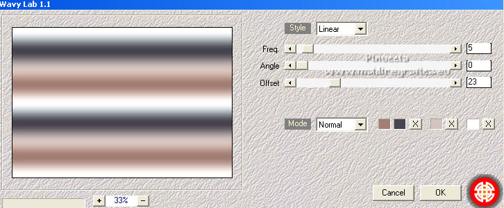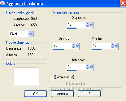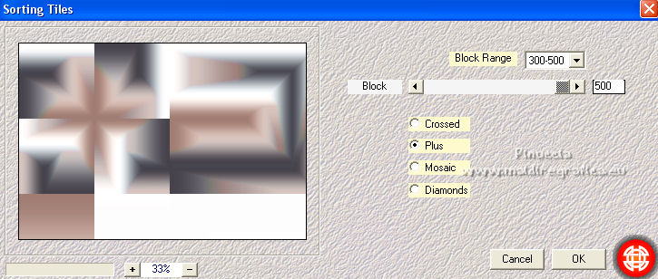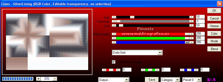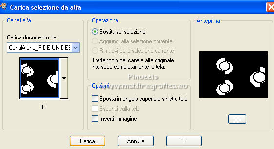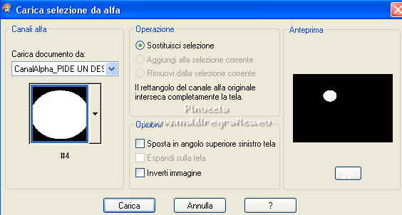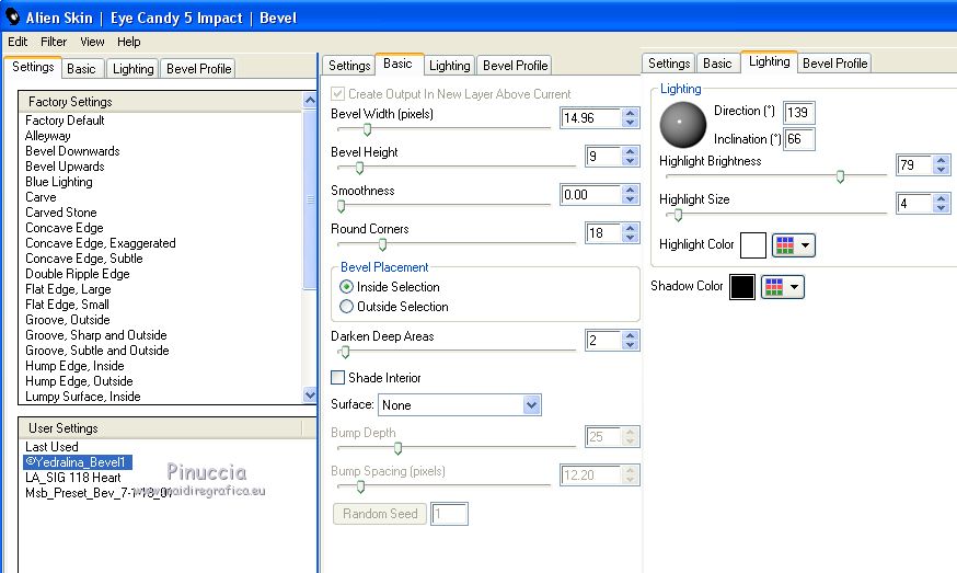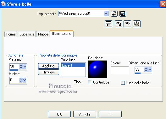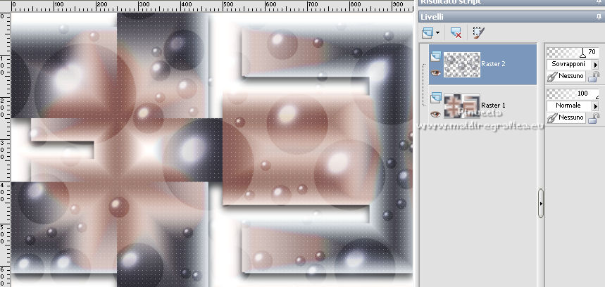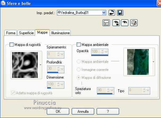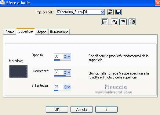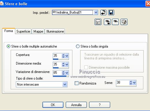 qui puoi trovare qualche risposta ai tuoi dubbi. Se l'argomento che ti interessa non è presente, ti prego di segnalarmelo. Questo tutorial è stato realizzato con Corel19 e tradotto con CorelX7, CorelX2 e CorelX3, ma può essere eseguito anche con le altre versioni di PSP. Dalla versione X4, il comando Immagine>Rifletti è stato sostituito con Immagine>Capovolgi in orizzontale, e il comando Immagine>Capovolgi con Immagine>Capovolgi in verticale. Nelle versioni X5 e X6, le funzioni sono state migliorate rendendo disponibile il menu Oggetti. Con la nuova versione X7, sono tornati Rifletti>Capovolgi, ma con nuove varianti. Vedi la scheda sull'argomento qui traduzione in francese/traduction en français qui/ici traduzione in inglese/english translation qui/here Versioni/Versions quiOccorrente: A scelta: un'immagine in jpg e/o il tube di un personaggio. Il resto del materiale qui Per il tube usato e non fornito, grazie Beatriz (3698-woman-LBTUBES). (in questa pagina trovi i links ai siti dei creatori di tubes) Filtri: se hai problemi con i filtri, consulta la mia sezione filtri qui Mehdi - Wavy Lab 1.1. qui Mehdi - Sorting Tiles qui AP 01 [Innovations] - Lines SilverLining qui Alien Skin Eye Candy 5 Impact - Bevel qui Mura's Meister - Perspective Tiling qui ![]() non esitare a cambiare modalità di miscelatura e opacità secondo i colori utilizzati. Metti il preset Cliccando sul file una o due volte (a seconda delle tue impostazioni), automaticamente il preset si installerà nella cartella corretta. perchè uno o due clic vedi qui Metti il preset Preset_BallsAndBubbles_©Yedralina_Burbuj01 nella cartella Impostazioni predefinite. ![]() Imposta il colore di primo piano con #46444e, e il colore di sfondo con #a27e74. ![]() 1. Apri CanalAlpha_PIDE UN DESEO. Finestra>Duplica o sulla tastiera maiuscola+D per fare una copia. ![]() Chiudi l'originale. La copia, che sarà la base del tuo lavoro, non è vuota, ma contiene le selezioni salvate sul canale alfa. Effetti>Plugins>Mehdi - Wavy Lab 1.1. Questo filtro crea gradienti con i colori della paletta: il primo è il colore di sfondo, il secondo quello di primo piano. Cambia gli ultimi due colori creati dal filtro: il terzo con il colore #d4c3be, e il quarto con il colore bianco #ffffff. ![]() 2. Effetti>Plugins>Mehdi - Sorting Tiles. ![]() 3. Effetti>Plugins>AP 01 [Innovations] - Lines SilverLining. ![]() 4. Effetti>Effetti di riflesso>Specchio rotante. ![]() 5. Selezione>Carica/Salva selezione>Carica selezione da canale alfa. La selezione #1 è subito disponibile. Devi soltanto cliccare Carica. ![]() Effetti>Effetti 3D>Sfalsa ombra, colore nero. ![]() Selezione>Deseleziona. 6. Livelli>Nuovo livello raster. Effetti>Effetti artistici>Sfere e bolle, seleziona il preset Preset_BallsAndBubbles_©Yedralina_Burbuj01, colore di primo piano Forma ![]() Superficie ![]() Mappe ![]() Illuminazione ![]() 7. Cambia la modalità di miscelatura di questo livello in Sovrapponi, e abbassa l'opacità +/-70%. ![]() 8. Immagine>Aggiungi bordatura, simmetriche non selezionato, colore bianco. ![]() 9. Livelli>Duplica. Effetti>Plugins>Mura's Meister - Perspective Tiling. ![]() Cambia la modalità di miscelatura di questo livello in Luce diffusa. 10. Livelli>Nuovo livello raster. Selezione>Carica/Salva selezione>Carica selezione da canale alfa. Apri il menu delle selezioni e carica la selezione #2. ![]() Imposta il colore di primo piano con il colore bianco. Abbassa l'opacità dello strumento Riempimento al 35%. Riempi la selezione con il colore bianco.(non dimenticare di riportare l'opacità a 100) 11. Effetti>Effetti di bordo>Aumenta di più. Cambia la modalità di miscelatura di questo livello in Luminanza (esistente). 12. Livelli>Nuovo livello raster. Selezione>Carica/Salva selezione>Carica selezione da canale alfa. Apri il menu delle selezioni e carica la selezione #3. ![]() 13. Se usi un'immagine in jpg, vai direttamente al punto 14. Apri il tube principale che hai scelto. Attiva lo strumento Selezione , rettangolo,e seleziona una parte del tube, a tuo piacimento. ![]() Modifica>Copia. Torna al tuo lavoro. 14. Modifica>Incolla nella selezione (la selezione che hai copiato o l'immagine in jpg). Effetti>Plugins>Alien Skin Eye Candy 5 Impact - Bevel. Seleziona il preset ©Yedralina_Bevel1. ![]() Selezione>Deseleziona. Modifica>Copia. 15. Livelli>Nuovo livello raster. Selezione>Carica/Salva selezione>Carica selezione da canale alfa. Apri il menu delle selezioni e carica la selezione #4. ![]() 16. Modifica>Incolla nella selezione. Immagine>Capovolgi>Capovolgi orizzontale. Questo comando riflette l'immagine, lasciandola nella stessa posizione. Se usi una versione precedente, ottieni lo stesso risultato con Immagine>Rifletti. 17. Ripeti Effetti>Plugins>Alien Skin Eye Candy 5 Impact - Bevel - preset ©Yedralina_Bevel1. Selezione>Deseleziona. 18. Livelli>Duplica. Immagine>Capovolgi. Effetti>Effetti di immagine>Scostamento. ![]() 19. Livelli>Unisci>Unisci giù - 2 volte. Effetti>Effetti 3D>Sfalsa ombra, colore nero. ![]() 20. Apri il tube principale e vai a Modifica>Copia. Torna al tuo lavoro e vai a Modifica>Incolla come nuovo livello. Immagine>Ridimensiona, se e quanto necessario (nel mio caso non ho ridimensionato), tutti i livelli non selezionato. Posiziona correttamente il tube.21. Effetti>Effetti 3D>Sfalsa ombra, a scelta; per me ![]() 22. Apri il testo, che ha due livelli. Attiva il livello del testo orizzontale e vai a Modifica>Copia. Torna al tuo lavoro e vai a Modifica>Incolla come nuovo livello. Spostalo sul bordo in alto a destra.Attiva il livello del testo verticale e vai a Modifica>Copia. Torna al tuo lavoro e vai a Modifica>Incolla come nuovo livello. Spostalo sul bordo in basso a sinistra.23. Immagine>Aggiungi bordatura, 2 pixels, simmetriche, colore scuro. 24. Immagine>Ridimensiona, 1000 pixels di larghezza, tutti i livelli selezionato. Firma il tuo lavoro su un nuovo livello. 25. Livelli>Unisci>Unisci tutto e salva in formato jpg. Per il tube di questo esempi