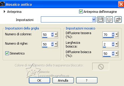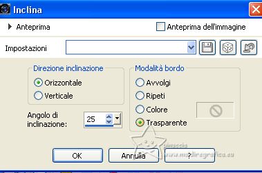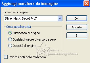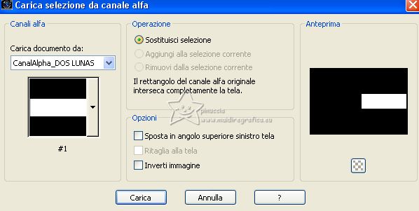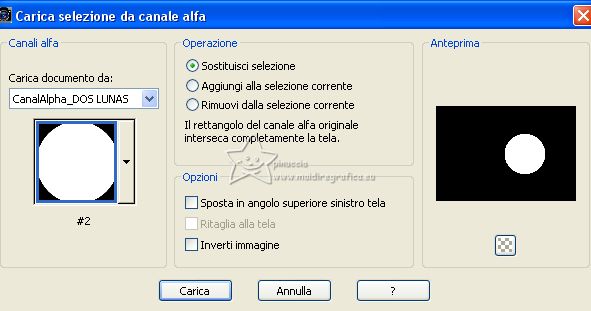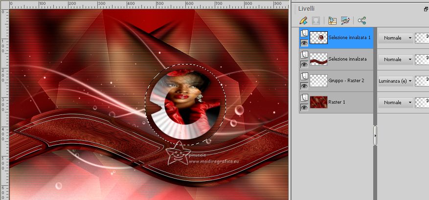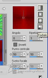 qui puoi trovare qualche risposta ai tuoi dubbi. Se l'argomento che ti interessa non è presente, ti prego di segnalarmelo. Questo tutorial è stato realizzato con PSP2020 e tradotto con PSPX7, ma può essere eseguito anche con le altre versioni di PSP. Dalla versione X4, il comando Immagine>Rifletti è stato sostituito con Immagine>Capovolgi in orizzontale, e il comando Immagine>Capovolgi con Immagine>Capovolgi in verticale. Nelle versioni X5 e X6, le funzioni sono state migliorate rendendo disponibile il menu Oggetti. Con la nuova versione X7, sono tornati Rifletti>Capovolgi, ma con nuove varianti. Vedi la scheda sull'argomento qui traduzione in francese/traduction en français qui/ici traduzione in inglese/english translation qui/here Versioni/Versions quiOccorrente: ![]() Grazie per il tube Vera Mendes e per la maschera Silvie. Il resto del materiale è di Yedralina. (in questa pagina trovi i links ai siti dei creatori di tubes) ![]() se hai problemi con i filtri, consulta la mia sezione filtri qui Filters Unlimited 2.0 qui Toadies - Sucking Toad Bevel III qui Carolaine and Sensibility - CS_Halloween2 qui AAA Frames - Foto Frame qui Alien Skin Eye Candy 5 Impact - Glass qui Graphics Plus - Cross shadow qui FM Tile Tools - Blend Emboss qui Mura's Meister - Copies qui I filtri Toadies, Graphics Plus si possono usare da soli o importati in Filters Unlimited (come fare vedi qui) Se un filtro fornito appare con questa icona ![]() non esitare a cambiare modalità di miscelatura e opacità secondo i colori utilizzati. Nelle ultime versioni di PSP non c'è il gradiente di primo piano/sfondo (Corel_06_029) Puoi usare i gradienti delle versioni precedenti. Trovi i gradienti Corel X qui. Metti i presets Cliccando sul file una o due volte (a seconda delle tue impostazioni), automaticamente il preset si installerà nella cartella corretta. perché uno o due clic vedi qui ![]() Se hai problemi con il canale alfa, apri una nuova immagine trasparente 950 x 650 pixels, e usa le selezioni da disco. Apri la maschera in PSP e minimizzala con il resto del materiale. Imposta il colore di primo piano con #a50301, e il colore di sfondo con #5d0000. ![]() Prepara il colore di primo piano con un Gradiente di primo piano/sfondo, stile Radiale. ![]() 1. Apri CanalAlpha_DOS LUNAS. Finestra>Duplica o sulla tastiera maiuscola+D per fare una copia. ![]() Chiudi l'originale. La copia, che sarà la base del tuo lavoro, non é vuota, ma contiene le selezioni salvate sul canale alfa. Riempi l'immagine trasparente con il gradiente radiale.2. Livelli>Nuovo livello raster. Selezione>Seleziona tutto. Apri il tube principale 739-vmtubes ![]() Modifica>Copia. Torna al tuo lavoro e vai a Modifica>Incolla nella selezione. Selezione>Deseleziona. 3. Effetti>Effetti di immagine>Motivo unico, con i settaggi standard. ![]() Regola>Sfocatura>Sfocatura gaussiana - raggio 25. ![]() 4. Effetti>Plugins>Carolaine and Sensibility - CS_Halloween 2, con i settaggi standard. ![]() 5. Effetti>Effetti geometrici>Pentagono. ![]() 6. Effetti>Effetti geometrici>Inclina. ![]() Effetti>Effetti di immagine>Motivo unico, con i settaggi standard. ![]() 7. Livelli>Duplica. Immagine>Rifletti. Livelli>Unisci>Unisci giù. Effetti>Effetti di bordo>Aumenta. Di nuovo Livelli>Unisci>Unisci giù. 8. Selezione>Carica/Salva selezione>Carica selezione da canale alfa. La selezione #1 è subito disponibile. Devi soltanto cliccare Carica. ![]() Selezione da disco ©Yedralina_Sel002 Selezione>Innalza selezione a livello. Selezione>Modifica>Contrai - 10 pixels. ![]() 9. Effetti>Plugins>AAA Frames - Foto Frame. ![]() 10. Selezione>Modifica>Contrai - 20 pixels. ![]() Effetti>Effetti di trama>Mosaico antico. ![]() 11. Effetti>Plugins>AAA Frames - Foto Frame - width 2. ![]() Selezione>Deseleziona. 12. Effetti>Effetti di riflesso>Specchio rotante, con i settaggi standard. ![]() 13. Effetti>Plugins>Mura's Meister - Copies. ![]() 14. Effetti>Effetti di distorsione>Onda. ![]() Effetti>Effetti 3D>Sfalsa ombra, colore nero. ![]() Oggetti>Allinea>Inferiore. oppure sposta l'immagine in bassoStrumento Puntatore ![]() ![]() ![]() 15. Livelli>Nuovo livello raster. Imposta il colore di primo piano con il colore bianco #ffffff. Riempi il livello con il colore bianco.Livelli>Nuovo livello maschera>Da immagine. Apri il menu sotto la finestra di origine e vedrai la lista dei files aperti. Seleziona la maschera Silvie_Mask_Deco17-17 ![]() Livelli>Duplica. Livelli>Unisci>Unisci gruppo. Immagine>Capovolgi. Immagine>Rifletti. 16. Effetti>Plugins>FM Tile Tools - Blend Emboss, con i settaggi standard. ![]() Cambia la modalità di miscelatura di questo livello in Luminanza (esistente). Livelli>Disponi>Sposta giù. ![]() 17. Selezione>Seleziona tutto. Livelli>Nuovo livello raster. Modifica>Incolla nella selezione (il tuo tube è sempre in memoria). Selezione>Deseleziona. 18. Effetti>Plugins>Toadies - Sucking Toad Bevel III. ![]() Effetti>Effetti 3D>Sfalsa ombra, con i settaggi precedenti. ![]() Modifica>Taglia (per tenere in memoria il livello). elimina il livello rimasto vuoto 19. Attiva il livello di sfondo. Selezione>Carica/Salva selezione>Carica selezione da canale alfa. Apri il menu delle selezioni e carica la selezione #2 ![]() Selezione da disco ©Yedralina_Sel679 Selezione>Innalza selezione a livello. Livelli>Disponi>Porta in alto. Modifica>Incolla nella selezione (il livello che hai copiato al punto precedenti) questo effetto può variare secondo il tube utilizzato ![]() 20. Effetti>Plugins>Alien Skin Eye Candy 5 Impact - Glass. Seleziona il preset ©Yedralina_Glass 11 ![]() Effetti>Plugins>Alien Skin Eye Candy 5 Impact - Glass. Seleziona il preset ©Yedralina_Glass 13 ![]() Selezione>Deseleziona. Tasto K sulla tastiera per attivare lo strumento Puntatore ![]() e imposta Posizione X: 624,00 e Posizione Y: 0,00. ![]() 21. Livelli>Duplica. Immagine>Rifletti. Imposta Posizione X: 69,00 e Posizione Y: 215,00. ![]() Tasto M per deselezionare lo strumento. 22. Dovresti avere questo: ![]() 23.