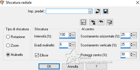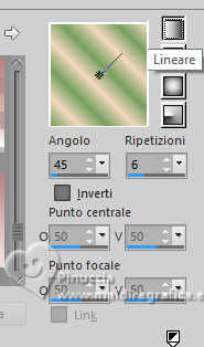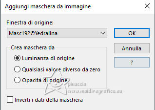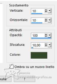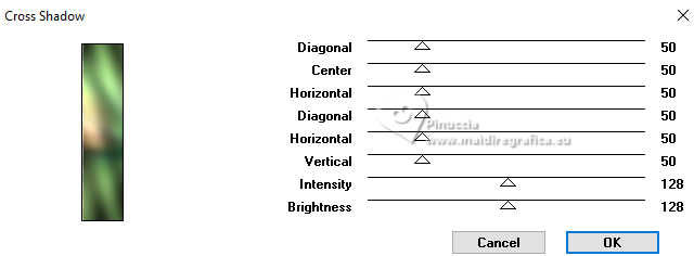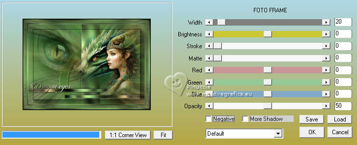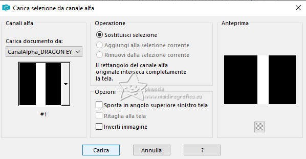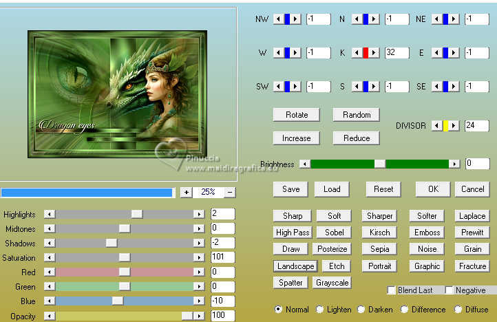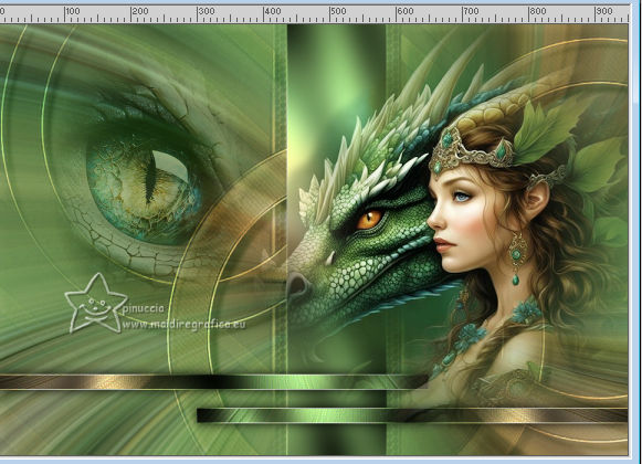 qui puoi trovare qualche risposta ai tuoi dubbi. Se l'argomento che ti interessa non è presente, ti prego di segnalarmelo. Questo tutorial è stato realizzato con PSP2020 e tradotto con PSPX9 e PSP2020, ma può essere eseguito anche con le altre versioni di PSP. Dalla versione X4, il comando Immagine>Rifletti è stato sostituito con Immagine>Capovolgi in orizzontale, e il comando Immagine>Capovolgi con Immagine>Capovolgi in verticale. Nelle versioni X5 e X6, le funzioni sono state migliorate rendendo disponibile il menu Oggetti. Con la nuova versione X7, sono tornati Rifletti>Capovolgi, ma con nuove varianti. Vedi la scheda sull'argomento qui traduzione in francese/traduction en français qui/ici traduzione in inglese/english translation qui/here Versioni/Versions qui![]() Occorrente: ![]() (in questa pagina trovi i links ai siti dei creatori di tubes) Filtri: se hai problemi con i filtri, consulta la mia sezione filtri qui Filters Unlimited 2.0 qui Graphics Plus - Cross Shadow qui AAA Frames - Foto Frame - AAA Filters - Custom qui I filtri Graphics Plus si possono usare da soli o importati in Filters Unlimited (come fare vedi qui) Se un filtro fornito appare con questa icona ![]() non esitare a cambiare modalità di miscelatura e opacità secondo i colori utilizzati. Nelle ultime versioni di PSP non c'é il gradiente di primo piano/sfondo (Corel_06_029) Puoi usare i gradienti delle versioni precedenti. Trovi qui i gradienti Corel X. ![]() Metti i presets Emboss 3 e Emboss 6 nella cartella Impostazioni predefinite. Apri la maschera in PSP e minimizzala con il resto del materiale. Colori utilizzati ![]() Imposta il colore di primo piano con il colore 1 #74a05c, e il colore di sfondo con il colore 2 #f3d7cd. ![]() Prepara un gradiente di primo piano/sfondo, stile Lineare. ![]() Per cominciare, imposta il colore con uno dei colori scuri, a tua scelta (1 o 3). 1. Apri CanalAlpha_DRAGON EYES Questa immagine, che sarà la base del tuo lavoro, non è vuota, ma contiene le selezioni salvate sul canale alfa. se hai problemi con il canale alfa, usa le selezioni da disco Riempi l'immagine trasparente con il colore scuro di primo piano.2. Selezione>Seleziona tutto. Apri il misted 2677©Yedralina ![]() Cancella il watermark e vai a Modifica>Copia. Minimizza il tube. Torna al tuo lavoro e vai a Modifica>Incolla nella selezione. Selezione>Deseleziona. 3. Effetti>Effetti di immagine>Motivo unico, con i settaggi standard. ![]() 4. Regola>Sfocatura>Sfocatura radiale. ![]() 5. Effetti>Filtro definito dall'utente - seleziona il preset Emboss 6 e ok. ![]() 6. Livelli>Nuovo livello raster. Riempi con il colore chiaro di sfondo.Livelli>Nuovo livello maschera>Da immagine. Apri il menu sotto la finestra di origine e vedrai la lista dei files aperti. Seleziona la maschera Masc192©Yedralina. ![]() Livelli>Duplica. Livelli>Unisci>Unisci gruppo. 7. Effetti>Filtro definito dall'utente - seleziona il preset Emboss 3 e ok. ![]() 8. Effetti>Effetti 3D>Sfalsa ombra, colore 3 #334729 ![]() ![]() Cambia la modalità di miscelatura di questo livello in Sovrapponi. 9. Attiva il livello di sfondo, Raster 1. Selezione>Carica/Salva selezione>Carica selezione da canale alfa. La selezione #1 è subito disponibile. Devi soltanto cliccare Carica. ![]() Selezione>Innalza selezione a livello. Livelli>Disponi>Porta in alto. 10. Regola>Sfocatura>Sfocatura gaussiana - raggio 15. ![]() 11. Effetti>Plugins>Graphics Plus - Cross Shadow, con i settaggi standard. ![]() Selezione>Deseleziona. Effetti>Effetti di bordo>Aumenta. 12. Apri il misted 2663©Yedralina ![]() Cancella la firma e vai a Modifica>Copia. Torna al tuo lavoro e vai a Modifica>Incolla come nuovo livello. Immagine>Rifletti>Rifletti orizzontalmente. Immagine>Ridimensiona, se necessario - per il tube fornito ho ridimensionato al 40%, tutti i livelli non selezionato. Sposta il tube a sinistra.Cambia la modalità di miscelatura di questo livello in Luce diffusa. Per il mio esempio; Livelli>Duplica. Livelli>Unisci>Unisci giù ![]() 13. Attiva nuovamente il livello Raster 1. Selezione>Carica/Salva selezione>Carica selezione da canale alfa. Apri il menu delle selezioni e carica la selezione #2 ![]() Selezione>Innalza selezione a livello. Livelli>Disponi>Porta in alto. 14. Effetti>Plugins>Graphics Plus - Cross Shadow, con i settaggi standard - 2 volte. Selezione>Deseleziona. Effetti>Effetti di bordo>Aumenta di più. 15. Livelli>Duplica. Immagine>Rifletti>Rifletti orizzontalmente. 16. Tasto K per attivare lo strumento Puntatore ![]() mantieni Posizione X: 0,00 e imposta Posizione Y: 528,00. ![]() Tasto M per deselezionare lo strumento. 17. Livelli>Unisci>Unisci giù. 18. Effetti>Effetti 3D>Sfalsa ombra, colore nero. ![]() 19. Attiva nuovamente il tube 2677©Yedralina e vai a Modifica>Copia. Torna al tuo lavoro e vai a Modifica>Incolla come nuovo livello. Immagine>Rifletti>Rifletti orizzontalmente. Immagine>Ridimensiona - per il tube fornito ho ridimensionato al 75%, tutti i livelli non selezionato. Spostalo a destra.per il mio esempio: Livelli>Duplica. Livelli>Unisci>Unisci giù ![]() 20. Livelli>Nuovo livello raster. 21. Selezione>Carica/Salva selezione>Carica selezione da canale alfa. Apri il menu delle selezioni e carica la selezione #3 ![]() 22. Imposta il colore di primo piano con il gradiente preparato all'inizio ![]() ![]() Riempi la selezione con il gradiente.23. Effetti>Effetti 3D>Sfalsa ombra, colore nero. ![]() Selezione>Deseleziona. 24. Effetti>Plugins>Graphics Plus - Cross Shadow, con i settaggi standard - 2 volte. **** se preferisci, puoi usare il testo Titulo_DRAGON EYES ![]() o scrivere il testo con la tua lingua, usando il font fornito ![]() **** 25. Attiva il livello di sfondo, Raster 1. Modifica>Copia. Modifica>Incolla come nuova immagine, e minimizza questa immagine. 26. Torna al tuo lavoro. Immagine>Aggiungi bordatura, 1 pixel, simmetriche, colore di sfondo ![]() Selezione>Seleziona tutto. 27. Immagine>Aggiungi bordatura, 10 pixels, simmetriche, colore di primo p