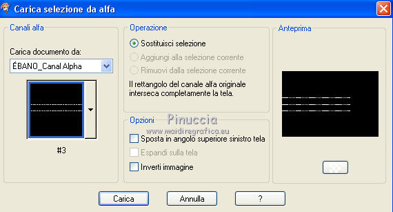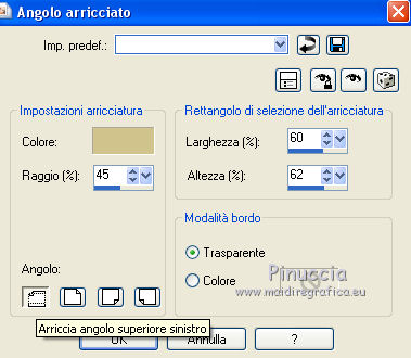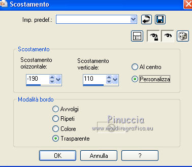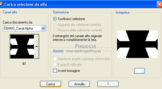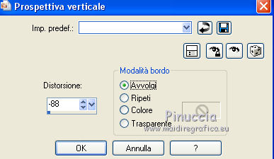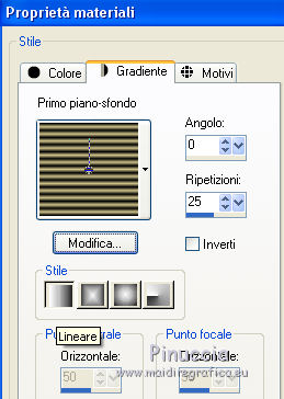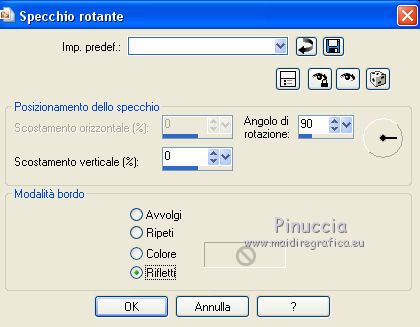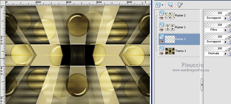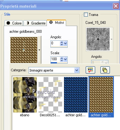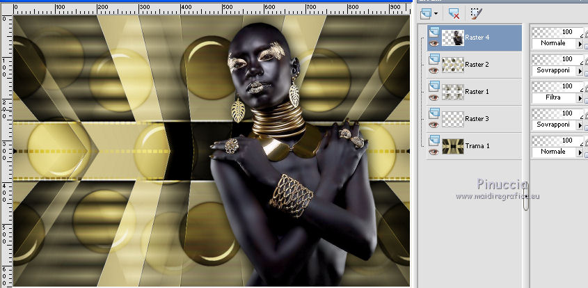 qui puoi trovare qualche risposta ai tuoi dubbi. Se l'argomento che ti interessa non è presente, ti prego di segnalarmelo. Questo tutorial è stato realizzato con Corel19 e tradotto con CorelX7, CorelX2 e CorelX3, ma può essere realizzato anche con le altre versioni di PSP. Dalla versione X4, il comando Immagine>Rifletti è stato sostituito con Immagine>Capovolgi in orizzontale, e il comando Immagine>Capovolgi con Immagine>Capovolgi in verticale. Nelle versioni X5 e X6, le funzioni sono state migliorate rendendo disponibile il menu Oggetti. Con la nuova versione X7, sono tornati Rifletti>Capovolgi, ma con nuove varianti. Vedi la scheda sull'argomento qui traduzione in francese/traduction en français qui/icitraduzione in inglese/english translation qui/hereVersioni/Versions qui Occorrente: Un tube a scelta. Il resto del materiale qui Per il tube usato e non fornito grazie Mina (Mina.4784goldblack_woman). Il resto del materiale è di Yedralina. (in questa pagina trovi i links ai siti dei creatori di tubes) Filtri: se hai problemi con i filtri, consulta la mia sezione filtri qui Mehdi - Wavy Lab 1.1 qui Mehdi - Sorting Tiles qui Alien Skin Eye Candy 5 Impact - Glass qui ![]() non esitare a cambiare modalità di miscelatura e opacità secondo i colori utilizzati. Nelle ultime versioni di PSP non c'è il gradiente di primo piano/sfondo (Corel_06_029) Puoi usare i gradienti delle versioni precedenti. Trovi qui i gradienti Corel X. Metti il preset Cliccando sul file una o due volte (a seconda delle tue impostazioni), automaticamente il preset si installerà nella cartella corretta. perchè uno o due clic vedi qui Apri la trama abbinata ai tuoi colori in PSP e minimizzala con il resto del materiale. Se stai usando altri colori, prima di minimizzarla, colorizzala. 1. Imposta il colore di primo piano con il colore nero #000000, e il colore di sfondo con il colore #d0c38b. ![]() Passa il colore di sfondo a Gradiente di primo piano/sfondo, stile Lineare. ![]() Passa anche il colore di sfondo a Gradiente di primo piano/sfondo, stile Lineare, ma con questi settaggi. ![]() 2. Apri EBANO_CanalAlpha. Duplica l'immagine (sulla tastiera shift+D) e chiudi l'originale. La copia, che sarà la base del tuo lavoro non è vuota, ma contiene le selezioni salvate sul canale alfa. Effetti>Plugins>Mehdi - Wavy Lab 1.1. questo filtro lavora con i colori della paletta: il primo è il colore di sfondo, il secondo quello di primo piano; mantieni gli ultimi due colori creati dal filtro. ![]() Effetti>Plugins>Mehdi - Sorting Tiles ![]() Effetti>Effetti di bordo>Aumenta di più. 3. Effetti>Effetti geometrici>Prospettiva verticale. ![]() 4. Effetti>Effetti di riflesso>Specchio rotante. ![]() 5. Effetti>Effetti di riflesso>Specchio rotante. ![]() 6. Livelli>Nuovo livello raster. Selezione>Carica/Salva selezione>Carica selezione da canale alfa. La selezione #1 è subito disponibile. Devi soltanto cliccare Carica. ![]() Riempi la selezione con il gradiente di sfondo.Selezione>Inverti. Effetti>Effetti 3D>Sfalsa ombra, colore nero. ![]() Selezione>Deseleziona. 7. Effetti>Effetti di immagine>Motivo unico. ![]() Cambia la modalità di miscelatura di questo livello in Filtra. 8. Livelli>Nuovo livello raster. Selezione>Carica/Salva selezione>Carica selezione da canale alfa. Apri il menu delle selezioni e carica la selezione #2. ![]() Riempi la selezione con il gradiente di primo piano.Mantieni selezionato. 9. Effetti>Plugins>Alien Skin Eye Candy 5 Impact - Glass. Seleziona il preset Yedralina_Glass3 e ok. ![]() Selezione>Deseleziona. 10. Effetti>Effetti di immagine>Scostamento. ![]() 11. Livelli>Duplica. Immagine>Capovolgi. Immagine>Rifletti. Livelli>Unisci>Unisci giù. 12. Effetti>Effetti di immagine>Motivo unico, con i settaggi precedenti. ![]() Cambia la modalità di miscelatura di questo livello in Sovrapponi, o altro. 13. Attiva il livello di sfondo. Livelli>Nuovo livello raster. Selezione>Carica/Salva selezione>Carica selezione da canale alfa. Apri il menu delle selezioni e carica la selezione #3. ![]() Riempi la selezione con il gradiente di primo piano.Selezione>Deseleziona. Effetti>Effetti di riflesso>Specchio rotante. ![]() Cambia la modalità di miscelatura di questo livello in Sovrapponi, o altro. ![]() 14. Attiva il livello superiore. Apri il tube della donna e vai a Modifica>Copia. Torna al tuo lavoro e vai a Modifica>Incolla come nuovo livello. Immagine>Ridimensiona, se e quanto necessario, tutti i livelli non selezionato. Se ridimensioni: Regola>Messa a fuoco>Metti a fuoco. Sposta il tube a destra.Effetti>Effetti 3D>Sfalsa ombra, a scelta o con i settaggi precedenti. ![]() ![]() 15. Passa il colore di primo piano a Motivi e, sotto la categoria Immagini aperte, cerca e seleziona il motivo fornito nel materiale trovi anche il motivo in blu, se preferisci. Se stai usando altri colori, colorizza il motivo prima di minimizzalo ![]() 16. Selezione>Seleziona tutto. Immagine>Aggiungi bordatura, 3 pixels, con il colore scuro di primo piano. Selezione>Inverti. Riempi la selezione con il motivo.Selezione>Deseleziona. 17. Immagine>Aggiungi bordatura, 3 pixels, simmetriche, colore scuro di primo piano. Selezione>Seleziona tutto. Immagine>Aggiungi bordatura, 3 pixels, simmetriche, ancora con il colore scuro di primo piano. Selezione>Inverti. Riempi la selezione con il motivo.18. Selezione>Seleziona tutto. Selezione>Modifica>Contrai - 9 pixels. Selezione>Inverti. Modifica>Copia. Selezione>Seleziona tutto. Immagine>Aggiungi bordatura, 40 pixels, simmetriche, colore scuro di primo piano. Selezione>Inverti. Modifica>Incolla nella selezione. Selezione>Deseleziona. 19.. Livelli>Duplica. Attiva il livello sottostante. Regola>Sfocatura>Sfocatura gaussiana - raggio 10. ![]() 20. Attiva nuovamente il livello superiore. Effetti>Effetti di immagine>Angolo arricciato - colore chiaro di sfondo #d0c38b. ![]() 21. Apri il tube Deco00251©Yedralina e vai a Modifica>Copia. Torna al tuo lavoro e vai a Modifica>Incolla come nuovo livello. Effetti>
