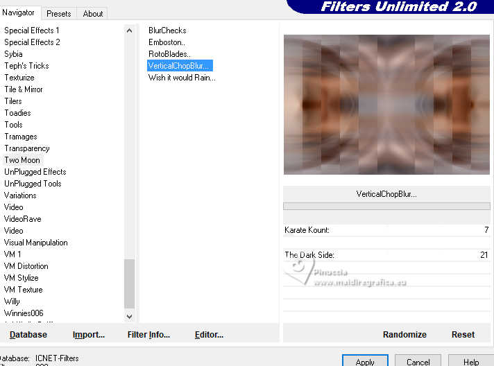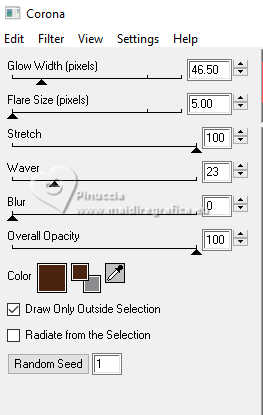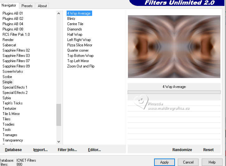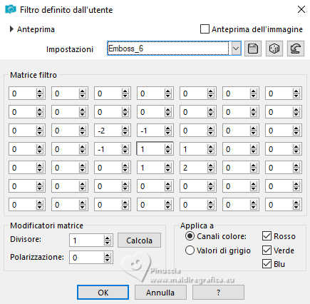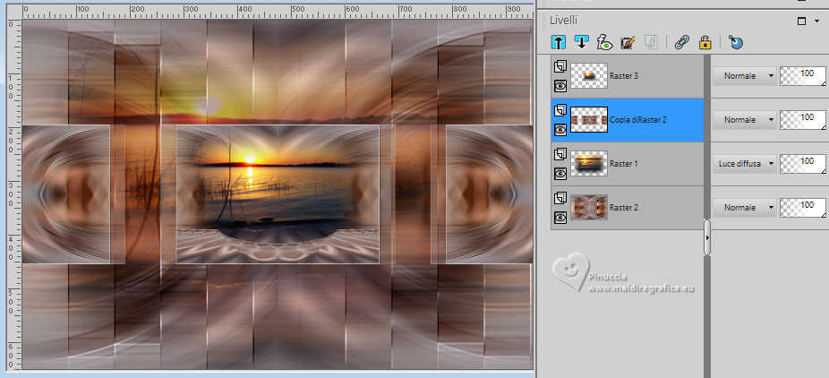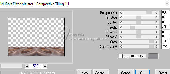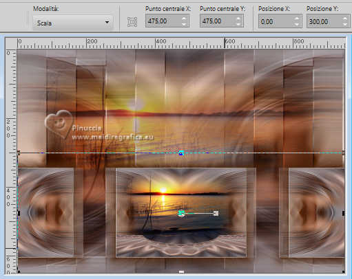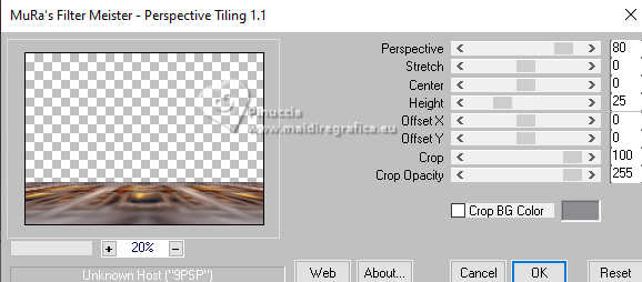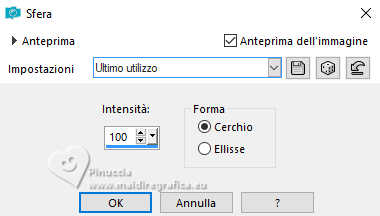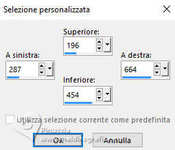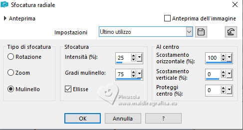 qui puoi trovare qualche risposta ai tuoi dubbi. Se l'argomento che ti interessa non è presente, ti prego di segnalarmelo. Questo tutorial è stato realizzato con PSP2020 e tradotto con PSPX9 e PSP2020, ma può essere eseguito anche con le altre versioni di PSP. Dalla versione X4, il comando Immagine>Rifletti è stato sostituito con Immagine>Capovolgi in orizzontale, e il comando Immagine>Capovolgi con Immagine>Capovolgi in verticale. Nelle versioni X5 e X6, le funzioni sono state migliorate rendendo disponibile il menu Oggetti. Con la nuova versione X7, sono tornati Rifletti>Capovolgi, ma con nuove varianti. Vedi la scheda sull'argomento qui traduzione in francese/traduction en français qui/ici traduzione in inglese/english translation qui/here Versioni/Versions qui![]() Occorrente: ![]() Grazie per i tubes Kamil e Sischou, per la maschera Ildiko. (in questa pagina trovi i links ai siti dei creatori di tubes) Filtri: se hai problemi con i filtri, consulta la mia sezione filtri qui Filters Unlimited 2.0 qui Simple - 4Way Average qui Two Moon - Vertical ChopBlur qui Mura's Meister - Perspective Tiling qui Eye Candy 4000 - Corona qui I filtri Simple e Two Moon si possono usare da soli o importati in Filters Unlimited (come fare vedi qui) Se un filtro fornito appare con questa icona ![]() non esitare a cambiare modalità di miscelatura e opacità secondo i colori utilizzati. Nelle ultime versioni di PSP non c'é il gradiente di primo piano/sfondo (Corel_06_029) Puoi usare i gradienti delle versioni precedenti. Trovi qui i gradienti Corel X. ![]() Metti il preset Emboss 6 nella cartella Impostazioni predefinite. Apri la maschera in PSP e minimizzala con il resto del materiale. Scegli 3 colori dal tuo misted. Imposta il colore di primo piano con il colore #e0c1af, e il colore di sfondo con il colore #8f8c91. colore 3 #4a240c colore 4 #ffffff ![]() Prepara un gradiente di primo piano/sfondo, stile Lineare. ![]() 1. Apri una nuova immagine trasparente 950 x 650 pixels. Selezione>Seleziona tutto. 2. Apri il tube KamilTube-958(1) ![]() Cancella il watermark e vai a Modifica>Copia. Minimizza il tube. Torna al tuo lavoro e vai a Modifica>Incolla nella selezione. Selezione>Deseleziona. 3. Regola>Sfocatura>Sfocatura radiale. ![]() 4. Effetti>Effetti di riflesso>Specchio rotante, con i settaggi standard. ![]() 5. Livelli>Nuovo livello raster. Riempi il livello con il gradiente.Livelli>Disponi>Sposta giù. 6. Attiva il livello superiore. Livelli>Unisci>Unisci giù. 7. Effetti>Plugins>Filters Unlimited 2.0 - Simple - 4 Way Average. ![]() Livelli>Duplica. Chiudi questo livello e torna al livello inferiore, Raster 2. 8. Effetti>Plugins>Filters Unlimited 2.0 - Two Moon - Vertical ChopBlur, con i settaggi standard. ![]() 9. Effetti>Filtro definito dall'utente, seleziona il preset Emboss 6 e ok. ![]() 10. Livelli>Nuovo livello raster. Selezione>Seleziona tutto. 11. Apri il misted scenery-2823106_Tb32 ![]() Modifica>Copia. Torna al tuo lavoro e vai a Modifica>Incolla nella selezione. Selezione>Deseleziona. 12. Cambia la modalità di miscelatura di questo livello in Luce diffusa, e abbassa l'opacità a tuo piacimento. 13. Riapri e attiva il livello superiore, Copia di Raster 2. Modifica>Copia. Modifica>Incolla come nuova immagine, e minimizza questa immagine. 14. Torna al tuo lavoro e rimani sul livello superiore. Immagine>Ridimensiona, al 40%, tutti i livelli non selezionato. 15. Effetti>Effetti di immagine>Motivo unico. ![]() 16. Di nuovo Effetti>Effetti di immagine>Motivo unico, Fianco a fianco. ![]() 17. Effetti>Effetti di riflesso>Specchio rotante, con i settaggi standard. ![]() Effetti>Effetti di bordo>Aumenta di più. 18. Attiva lo strumento Selezione ![]() (non importa il tipo di selezione impostato, perché con la selezione personalizzata si ottiene sempre un rettangolo) clicca sull'icona Selezione personalizzata ![]() e imposta i seguenti settaggi. ![]() 19. Selezione>Innalza selezione a livello. Mantieni selezionato. 20. Effetti>Plugins>Mura's Meister - Perspective Tiling. ![]() Mantieni ancora selezionato. 21. Effetti>Effetti geometrici>Sfera. ![]() Mantieni sempre selezionato. 22. Livelli>Nuovo livello raster. Modifica>Incolla nella selezione - il misted è sempre in memoria). 23. Livelli>Disponi>Sposta giù. Attiva il livello superiore. Livelli>Unisci>Unisci giù. Selezione>Deseleziona. 24. Attiva il livello sottostante, Copia di Raster 2 (i tre quadri) ![]() 25. Effetti>Plugins>Eye Candy 4000 - Corona - colore 3 #4a240c ![]() 26. Attiva nuovamente il livello superiore. Livelli>Unisci>Unisci giù. 27. Oggetti>Allinea>Inferiore, o tasto K per attivare lo strumento Puntatore ![]() Posizione X: 0,00 - Posizione Y: 300,00. ![]() Tasto M per deselezionare lo strumento. 28. Immagine>Aggiungi bordatura, 1 pixel, simmetriche, colore di primo piano. Immagine>Aggiungi bordatura, 1 pixel, simmetriche, colore di sfondo. Immagine>Aggiungi bordatura, 1 pixel, simmetriche, colore di primo piano. 29. Selezione>Seleziona tutto. 30. Immagine>Aggiungi bordatura, 10 pixels, simmetriche, con un colore qualsiasi. Selezione>Inverti. Riempi la selezione con il gradiente.31. Selezione>Innalza selezione a livello. Cambia la modalità di miscelatura di questo livello in Moltiplica. Livelli>Unisci>Unisci giù. 32. Immagine>Aggiungi bordatura, 1 pixel, simmetriche, colore di primo piano. Immagine>Aggiungi bordatura, 1 pixel, simmetriche, colore di sfondo. Immagine>Aggiungi bordatura, 1 pixel, simmetriche, colore di primo piano. 33. Selezione>Seleziona tutto. Immagine>Aggiungi bordatura, 45 pixels, simmetriche, con un colore qualsiasi. Selezione>Inverti. 34. Attiva l'immagine che hai minimizzato al punto 13 ![]() Modifica>Copia. Torna al tuo lavoro e vai a Modifica>Incolla nella selezione. Regola>Messa a fuoco>Accentua messa a fuoco. 35. Selezione>Inverti. Effetti>Effetti 3D>Sfalsa ombra, colore 3 #4a240c ![]() Selezione>Deseleziona. 36. Livelli>Duplica. Regola>Sfocatura>Sfocatura gaussiana - raggio 10. ![]() 37. Effetti>Pl