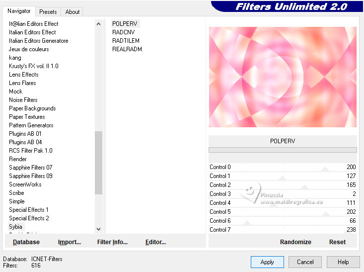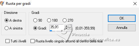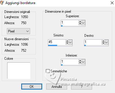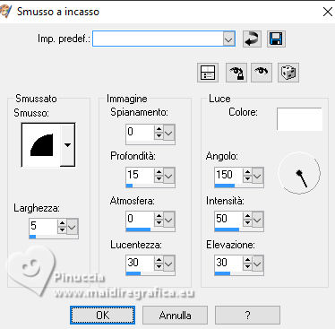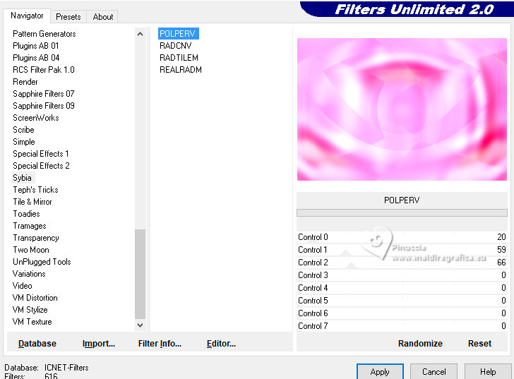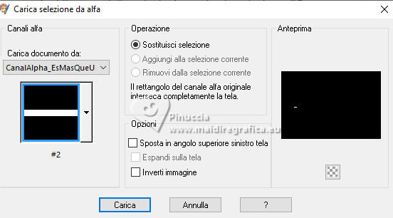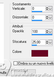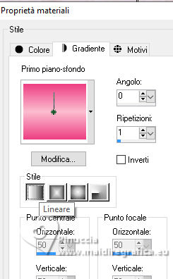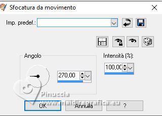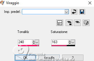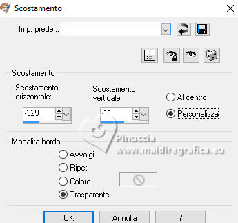 qui puoi trovare qualche risposta ai tuoi dubbi. Se l'argomento che ti interessa non è presente, ti prego di segesmasqueuncolorrmelo. Questo tutorial è stato realizzato con PSP2020 e tradotto con PSPX7, ma può essere eseguito anche con le altre versioni di PSP. Dalla versione X4, il comando Immagine>Rifletti è stato sostituito con Immagine>Capovolgi in orizzontale, e il comando Immagine>Capovolgi con Immagine>Capovolgi in verticale. Nelle versioni X5 e X6, le funzioni sono state migliorate rendendo disponibile il menu Oggetti. Con la nuova versione X7, sono tornati Rifletti>Capovolgi, ma con nuove varianti. Vedi la scheda sull'argomento qui traduzione in francese/traduction en français qui/ici traduzione in inglese/english translation qui/here Versioni/Versions qui![]() Occorrente: Materiale ![]() Il materiale è di Yedralina (in questa pagina trovi i links ai siti dei creatori di tubes) ![]() se hai problemi con i filtri, consulta la mia sezione filtri qui Filters Unlimited 2.0 qui Simple - Blintz qui Sybia - POLPERV qui I filtri Simple e Sybia si possono usare da soli o importati in Filters Unlimited (come fare vedi qui) Se un filtro fornito appare con questa icona ![]() non esitare a cambiare modalità di miscelatura e opacità secondo i colori utilizzati. Nelle ultime versioni di PSP non c'è il gradiente di primo piano/sfondo (Corel_06_029) Puoi usare i gradienti delle versioni precedenti. Trovi i gradienti Corel X qui. ![]() 1. Imposta il colore di primo piano con #ed3f82, e il colore di sfondo con #fcbdd0. ![]() Terzo colore #690523. Passa il colore di primo piano a Gradiente di primo piano/sfondo, stile Lineare. ![]() 2. Apri CanalAlpha_EsMasQueUnColor. Finestra>Duplica o sulla tastiera maiuscola+D per fare una copia. ![]() Chiudi l'originale. La copia, che sarà la base del tuo lavoro, non é vuota, ma contiene le selezioni salvate sul canale alfa Riempi l'immagine trasparente con il gradiente.3. Selezione>Seleziona tutto. Apri il misted 1853©Yedralina ![]() Cancella il watermark e vai a Modifica>Copia. Minimizza il tube. Torna al tuo lavoro e vai a Modifica>Incolla nella selezione. Selezione>Deseleziona. 4. Effetti>Effetti di immagine>Motivo unico. ![]() 5. Regola>Sfocatura>Sfocatura gaussiana - raggio 15. ![]() 6. Effetti>Plugins>Simple - Blintz - 3 volte Questo effetto lavora senza finestra ![]() 7. Effetti>Plugins>Sybia - POLPERV, con i settaggi standard. ![]() questo filtro può alterare i tuoi colori; per il mio esempio, ho aggiunto: Regola>Tonalità e saturazione>Viraggio. ![]() Con un altro tube potresti invece avere un risultato insoddisfacente, nella mia seconda versione per esempio ho avuto questo ![]() In questo caso, puoi cambiare i settaggi, cliccando su Randomize, finché non vedi il risultato che preferisci ![]() 8. Effetti>Effetti di immagine>Motivo unico. ![]() 9. Apri il tube del nastro 1852©Yedralina ![]() Cancella il watermark e vai a Modifica>Copia. Torna al tuo lavoro e vai a Modifica>Incolla come nuovo livello. Immagine>Ridimensiona, all'80%, tutti i livelli non selezionato. 10. Oggetti>Allinea>Sinistra, o tasto K per attivare lo strumento Puntatore ![]() e imposta Posizione X: 0,00 e Posizione Y: 24,00. ![]() Tasto M per deselezionare lo strumento. 11. Effetti>Effetti 3D>Sfalsa ombra, con il terzo colore #690523. ![]() 12. Apri il tube del fiore 1849©Yedralina ![]() Cancella il watermark e vai a Modifica>Copia. Torna al tuo lavoro e vai a Modifica>Incolla come nuovo livello. Immagine>Ridimensiona, se necessario. 13. Immagine>Ruota per gradi - 35 gradi a destra. ![]() 14. Effetti>Effetti di immagine>Scostamento. ![]() Rimani su questo livello. 15. Selezione>Carica/Salva selezione>Carica selezione da canale alfa. La selezione #1 é subito disponibile. Devi soltanto cliccare Carica. ![]() o seleziona a tuo piacimento con lo strumento Selezione , rettangolo,![]() Premi sulla tastiera il tasto CANC ![]() Selezione>Deseleziona. 16. Effetti>Effetti 3D>Sfalsa ombra, con i settaggi precedenti. ![]() 17. Livelli>Nuovo livello raster. Selezione>Carica/Salva selezione>Carica selezione da canale alfa. Apri il menu delle selezioni e carica la selezione #2 ![]() 18. Imposta il colore di primo piano con il colore bianco. Riempi la selezione con il colore bianco.19. Effetti>Effetti 3D>Smusso a incasso. ![]() Selezione>Deseleziona. 20. Livelli>Duplica. Posiziona correttamente le lineette sullo stelo del fiore![]() 21. Attiva il livello inferiore. Attiva nuovamente il misted ![]() Modifica>Copia. Torna al tuo lavoro e vai a Modifica>Incolla come nuovo livello. Immagine>Ridimensiona, se necessario. Spostalo all'interno del nastro, come nell'esempio.![]() 22. Attiva il livello superiore. Apri il testo Texto_DMCancerMamaB ![]() Modifica>Copia. Torna al tuo lavoro e vai a Modifica>Incolla come nuovo livello. puoi cambiare il colore a tuo piacimento e sempre secondo la tua immagine. Nel materiale anche il testo con il colore rosa e il font usato ![]() 23. Tasto K per attivare lo strumento Puntatore ![]() e imposta Posizione X: 324,00 e Posizione Y: 22,00 ![]() 24. Effetti>Effetti 3D>Sfalsa ombra, colore 3 #690523. ![]() 25. Apri il tube deco00331©Yedralina ![]() Modifica>Copia. Torna al tuo lavoro e vai a Modifica>Incolla come nuovo livello. Oggetti>Allinea>Destra. Sposta questo livello sopra il livello di sfondo ![]() 26. Immagine>Aggiungi bordatura, 2 pixels, simmetriche, colore bianco. Immagine>Aggiungi bordatura, 1 pixels, simmetriche, colore di primo piano #ed3f82. Immagine>Aggiungi bordatura, 2 pixels, simmetriche, colore bianco. 27. Selezione>Seleziona tutto. Modifica>Copia 28. Immagine>Aggiungi bordatura, 45 pixels, simmetriche, colore bianco. Selezione>Inverti. 29. Modifica>Incolla nella selezione 30. Regola>Sfocatura>Sfocatura da movimento. ![]() 31. Effetti>Effetti di riflesso>Specchio rotante. ![]() 32. Selezione>Inverti. Effetti>Effetti 3D>Sfalsa ombra, con i settaggi precedenti ![]() Selezione>Deseleziona. 33. Immagine>Aggiungi bordatura, simmetriche non 