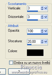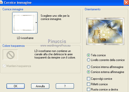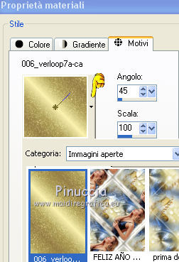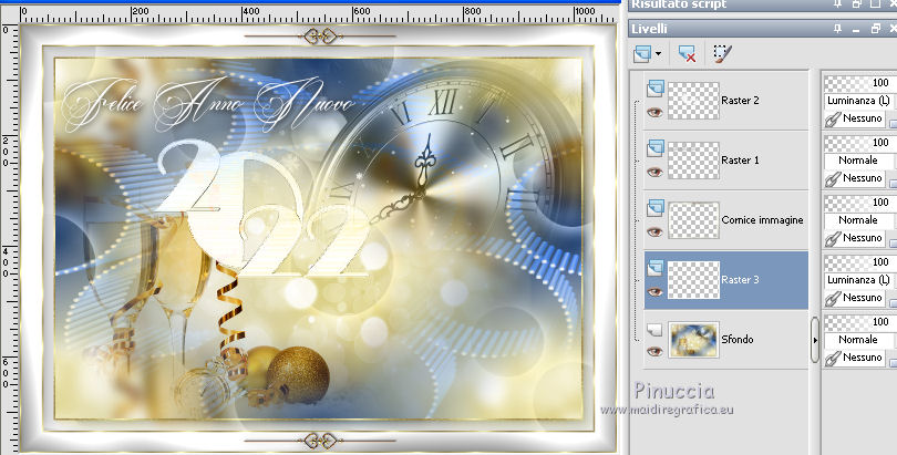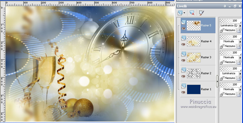 qui puoi trovare qualche risposta ai tuoi dubbi. Se l'argomento che ti interessa non è presente, ti prego di segnalarmelo. Questo tutorial è stato realizzato con Corel19 e tradotto con CorelX7, CorelX2 e CorelX3, ma può essere realizzato anche con le altre versioni di PSP. Dalla versione X4, il comando Immagine>Rifletti è stato sostituito con Immagine>Capovolgi in orizzontale, e il comando Immagine>Capovolgi con Immagine>Capovolgi in verticale. Nelle versioni X5 e X6, le funzioni sono state migliorate rendendo disponibile il menu Oggetti. Con la nuova versione X7, sono tornati Rifletti>Capovolgi, ma con nuove varianti. Vedi la scheda sull'argomento qui traduzione in francese/traduction en français qui/icitraduzione in inglese/english translation qui/here Versioni/Versions quiOccorrente: Tube a scelta. Il resto del materiale qui Per il tube utilizzato e non fornito grazie Bea (woman_369_beas_tube). (in questa pagina trovi i links ai siti dei creatori di tubes) Filtri: se hai problemi con i filtri, consulta la mia sezione filtri qui Alien Skin Eye Candy 5 Impact - Extrude qui Alien Skin Xenofex 2 - Constellation qui AAA Frames - Foto Frame qui Facoltativo: Animation Shop qui ![]() non esitare a cambiare modalità di miscelatura e opacità secondo i colori utilizzati. Apri il font e minimizzalo. Lo troverai nella lista dei font disponibili quando ti servirà. Con i nuovi sistemi operativi questo non è più possibile. Per usare un font occorre copiarlo nella cartella Fonts di Windows. ![]() Metti la selezione nella cartella Selezioni. Metti la cornice nella cartella Cornici-immagine. Apri il motivo oro in PSP e minimizzalo con il resto del materiale. Imposta il colore di primo piano con un colore scuro del tuo tube: #062a64, e il colore di sfondo con il colore bianco ![]() 1. Apri una nuova immagine trasparente 950 x 650 pixels, e riempila con il colore scuro di primo piano #062a64.2. Livelli>Nuovo livello raster. Selezione>Seleziona tutto. Apri il tube Deco00282©Yedralina e vai a Modifica>Copia. Torna al tuo lavoro e vai a Modifica>Incolla nella selezione. Selezione>Deseleziona. Effetti>Effetti di immagine>Motivo unico, con i settaggi standard. ![]() Effetti>Effetti di immagine>Motivo unico. ![]() Effetti>Effetti di riflesso>Specchio rotante. ![]() 3. Effetti>Plugins>Alien Skin Eye Candy 5 Impact - Extrude. ![]() 4. Cambia la modalità di miscelatura di questo livello in Sovrapponi, o a tuo piacimento. (Puoi anche rimandare la decisione prima di unire i livelli, per il mio esempio alla fine ho scelto Luminanza). 5. Selezione>Seleziona tutto. Livelli>Nuovo livello raster. Apri il misted 1896©Yedralina e vai a Modifica>Copia. Torna al tuo lavoro e vai a Modifica>Incolla nella selezione. Selezione>Deseleziona. Effetti>Effetti di immagine>Motivo unico, con i settaggi standard. ![]() Regola>Sfocatura>Sfocatura gaussiana - raggio 10 ![]() Puoi abbassare l'opacità di questo livello, ma non più dell'80%. 6. Modifica>Incolla come nuovo livello (il tube è sempre in memoria). Immagine>Rifletti. Immagine>Ridimensiona, al 75%, tutti i livelli non selezionato. Spostalo in basso a sinistra, o a tuo piacimento.7. Apri il misted dell'orologio 1892©Yedralina e vai a Modifica>Copia. Torna al tuo lavoro e vai a Modifica>Incolla come nuovo livello. Immagine>Ridimensiona, al 50%, tutti i livelli non selezionato. Sposta il tube in alto a destra.Cambia la modalità di miscelatura di questo livello in Luminanza (esistente). Dovresti avere questo ![]() 8. Selezione>Seleziona tutto. Immagine>Aggiungi bordatura, 3 pixels, simmetriche, colore bianco. Selezione>Inverti. 9. Passa il colore di primo piano a Motivo e seleziona il motivo oro ![]() Riempi la selezione con il motivo oro.10. Selezione>Seleziona tutto. Immagine>Aggiungi bordatura, 20 pixels, simmetriche, colore bianco. Selezione>Inverti. 11. Effetti>Plugins>AAA Frames - Foto Frame. ![]() Selezione>Deseleziona. 12. Immagine>Cornice-immagine - seleziona la cornice LD-ivoorframe. ![]() 13. Attiva lo strumento Testo ![]() seleziona il font fornito Beaked Tyrant Person, dimensione 100, ![]() colore di sfondo bianco. Scrivi il tuo testo in alto a sinistra. Livelli>Converti in livello raster. Effetti>Effetti 3D>Sfalsa ombra, colore di primo piano, o nero. ![]() 14. Apri il testo 2022 - Text_2022©Yedralina - e vai a Modifica>Copia. Torna al tuo lavoro e vai a Modifica>Incolla come nuovo livello. Cambia la modalità di miscelatura di questo livello in Luminanza (esistente). Effetti>Effetti 3D>Sfalsa ombra, con i settaggi precedenti. Posiziona il tube dove preferisci o vedi il mio esempio.![]() 15. Attiva il livello inferiore. Livelli>Nuovo livello raster. Selezione>Carica/Salva selezione>Carica selezione da disco. Cerca e carica la selezione ©Yedralina_Sel954. ![]() Effetti>Effetti 3D>Sfalsa ombra, colore bianco. ![]() Selezione>Deseleziona. 16. Effetti>Effetti di immagine>Motivo unico. ![]() Effetti>Effetti di immagine>Motivo unico, con i settaggi standard. ![]() Facoltativo: Cambia la modalità di miscelatura di questo livello in Luminanza (esistente), o Sovrapponi, a tuo piacimento. ![]() 17. Attiva il livello superiore. Apri il tuo tube principale e vai a Modifica>Copia. Torna al tuo lavoro e vai a Modifica>Incolla come nuovo livello. Immagine>Ridimensiona, se necessario (nel mio caso al 132%), tutti i livelli non selezionato. Regola>Messa a fuoco>Metti a fuoco. Sposta il tube a destra.Effetti>Effetti 3D>Sfalsa ombra, colore nero. ![]() 18. Immagine>Ridimensiona, 1000 pixels di larghezza, tutti i livelli selezionato. Firma il tuo lavoro su un nuovo livello. Se non vuoi animare il lavoro Livelli>Unisci>Unisci tutto e salva in formato jpg. 19. Se vuoi realizzare l'animazione, non unire i livelli e attiva il livello della selezione, Raster 3. Effetti>Plugins>Alien Skin Xenofex 2 - Constellation ![]() 20. Modifica>Copia Speciale>Copia Unione Apri Animation Shop e vai a Modifica>Incolla>Incolla come nuova animazione. 21. Torna in PSP. Modifica>Annulla Const