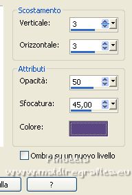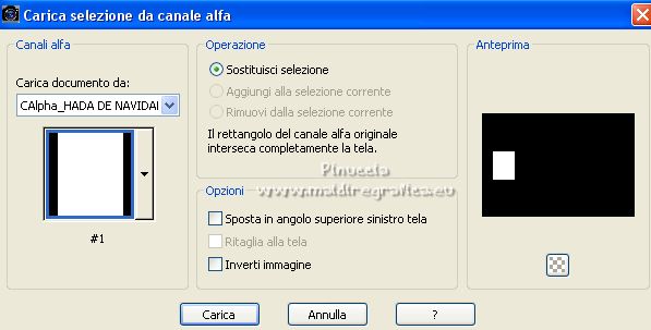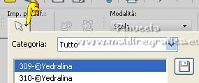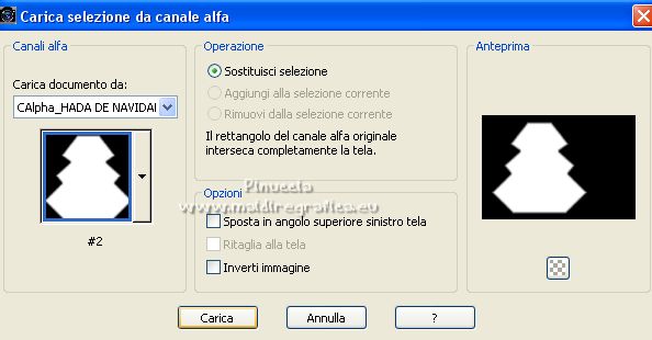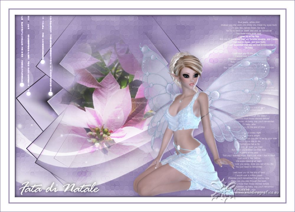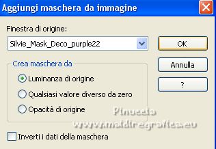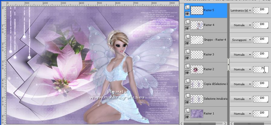 qui puoi trovare qualche risposta ai tuoi dubbi. Se l'argomento che ti interessa non è presente, ti prego di segnalarmelo. Questo tutorial è stato realizzato con Corel19 e tradotto con CorelX7, CorelX2 e CorelX3, ma può essere realizzato anche con le altre versioni di PSP. Dalla versione X4, il comando Immagine>Rifletti è stato sostituito con Immagine>Capovolgi in orizzontale, e il comando Immagine>Capovolgi con Immagine>Capovolgi in verticale. Nelle versioni X5 e X6, le funzioni sono state migliorate rendendo disponibile il menu Oggetti. Con la nuova versione X7, sono tornati Rifletti>Capovolgi, ma con nuove varianti. Vedi la scheda sull'argomento qui traduzione in francese/traduction en français qui/icitraduzione in inglese/english translation qui/here Versioni/Versions quiOccorrente: Tubes a scelta. Il resto del materiale qui Per i tubes utilizzati e non forniti grazie hada de kisspng e Yedralina (1477©Yedralina). Per la maschera grazie Silvie (Silvie_Mask_Deco_purple22). Il resto del materiale è di Yedralina. (in questa pagina trovi i links ai siti dei creatori di tubes) Filtri: se hai problemi con i filtri, consulta la mia sezione filtri qui Filters Unlimited 2.0 qui Mura's Meister - Cloud qui Mura's Meister - Copies qui RCS Filter Pack 1.0 - RCS Sequins qui AAA Frames - Foto Frame qui I filtri RCS Filters si possono usare da soli o importati in Filters Unlimited (come fare vedi qui) Se un filtro fornito appare con questa icona ![]() ![]() non esitare a cambiare modalità di miscelatura e opacità secondo i colori utilizzati. Apri il font e minimizzalo. Lo troverai nella lista dei font disponibili quando ti servirà. Con i nuovi sistemi operativi questo non è più possibile. Per usare un font occorre copiarlo nella cartella Fonts di Windows. Metti il pennello nella cartella Pennelli. Attenzione, il pennello è composto da due files che non devono essere separati. Vedi gli appunti sui pennelli qui ![]() Metti il preset nella cartella Impostazioni predefinite. Apri la maschera in PSP e minimizzala con il resto del materiale. Imposta il colore di primo piano con #cbc1dd, e il colore di sfondo con #5b4682. ![]() 1. Apri CAlpha-HADA DE NAVIDAD. Finestra>Duplica o sulla tastiera maiuscola+D per fare una copia. ![]() Chiudi l'originale. La copia, che sarà la base del tuo lavoro, non è vuota, ma contiene le selezioni salvate sul canale alfa. Effetti>Plugins>Mura's Meister - Cloud, con i settaggi standard. ![]() ricorda che questo filtro lavora con i colori impostati nella paletta dei materiali, ma tiene in memoria il primo settaggio dall'apertura del programma. Quindi se hai già usato il filtro, per essere sicuro di avere impostati i colori corretti, premi il tasto Reset. Il risultato dell'effetto è casuale, per questo non sarà uguale al mio. Puoi cambiare l'aspetto delle nuvole cliccando sulla finestra di anteprima, finché non sei soddisfatto del risultato 2. Effetti>Plugins>Filters Unlimited 2.0 - RCS Filter Pack 1.0 - RCS Sequins ![]() Effetti>Effetti di bordo>Aumenta di più. 3. Selezione>Carica/Salva selezione>Carica selezione da canale alfa. La selezione #1 è subito disponibile. Devi soltanto cliccare Carica. ![]() Selezione>Innalza selezione a livello. Effetti>Plugins>AAA Frames - Foto Frame. ![]() Selezione>Deseleziona. 4. Effetti>Plugins>Mura's Meister - Copies. ![]() 5. Effetti>Effetti di immagine>Motivo unico. ![]() 6. Effetti>Effetti di riflesso>Specchio rotante, con i settaggi standard. ![]() 7. Tasto K sulla tastiera per attivare lo strumento Puntatore ![]() apri il menu delle impostazioni e seleziona il preset Preset_Pick_309-©Yedralina. ![]() Se hai problemi con il preset, imposta manualmente i settaggi ![]() Livelli>Duplica. 8. Livelli>Nuovo livello raster. Selezione>Carica/Salva selezione>Carica selezione da canale alfa. Apri il menu delle selezioni e carica la selezione #2. ![]() Apri il tuo misted e vai a Modifica>Copia. Torna al tuo lavoro e vai a Modifica>Incolla nella selezione. Selezione>Deseleziona. Abbassa l'opacità di questo livello +/-75%. 9. Attiva lo strumento Pennello ![]() cerca e seleziona il pennello Texte brush1, dimensione 620 pixels ![]() Imposta il colore di primo piano con il colore bianco. Livelli>Nuovo livello raster. Applica il pennello a destra, cliccando con il tasto sinistro del mouse, per usare il colore bianco di primo piano. ![]() 10. Livelli>Nuovo livello raster. Riempi il livello con il colore bianco.Livelli>Nuovo livello maschera>Da immagine. Apri il menu sotto la finestra di origine e vedrai la lista dei files aperti. Seleziona la maschera Silvie_Mask_Deco_purple22. ![]() Livelli>Unisci>Unisci gruppo. Cambia la modalità di miscelatura di questo livello in Sovrapponi. puoi variare la posizione di questo livello; nella mia seconda versione ho fatto Immagine>Rifletti, e ho spostato il livello sotto il livello del misted. ![]() 11. Apri il tuo tube principale e vai a Modifica>Copia. Torna al tuo lavoro e vai a Modifica>Incolla come nuovo livello. Immagine>Ridimensiona, se e quanto necessario (per me 65%), tutti i livelli non selezionato. Sposta il tube in basso a destra.Effetti>Effetti 3D>Sfalsa ombra, colore di sfondo. ![]() 12. Apri il tube Deco00278©Yedralina e vai a Modifica>Copia. Torna al tuo lavoro e vai a Modifica>Incolla come nuovo livello. Spostalo in alto a sinistra.Cambia la modalità di miscelatura di questo livello in Luminanza (esistente). 13. Questa la tua tag e i suoi livelli. ![]() 14. Per i bordi, imposta nuovamente il colore di primo piano con il colore chiaro #cbc1dd. ![]() Immagine>Aggiungi bordatura, 1 pixel, simmetriche, colore scuro. Immagine>Aggiungi bordatura, 1 pixel, simmetriche, colore chiaro. Immagine>Aggiungi bordatura, 1 pixel, simmetriche, colore scuro. Immagine>Aggiungi bordatura, 20 pixels, simmetriche, colore bianco. Immagine>Aggiungi bordatura, 1 pixel, simmetriche, colore scuro. Immagine>Aggiungi bordatura, 1 pixel, simmetriche, colore chiaro. Immagine>Aggiungi bordatura, 1 pixel, simme