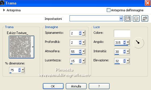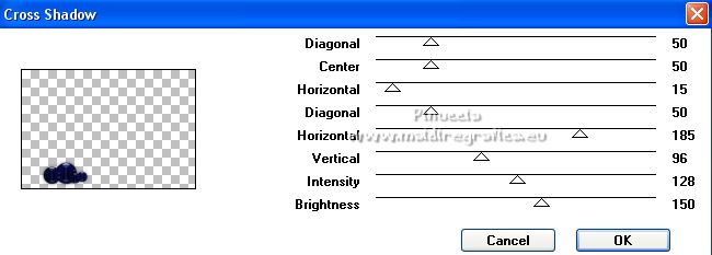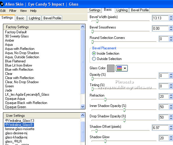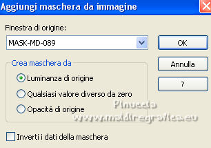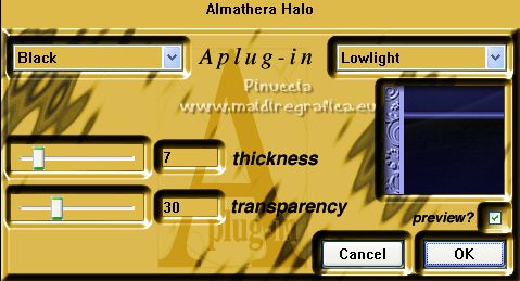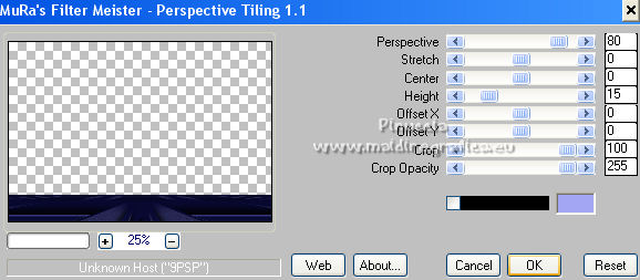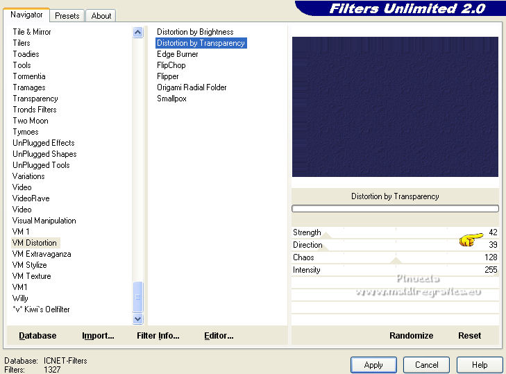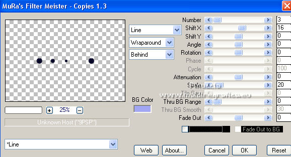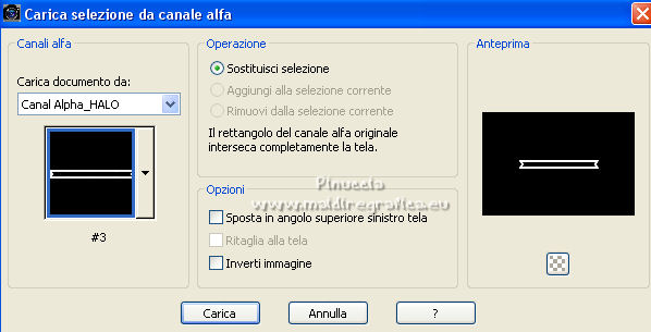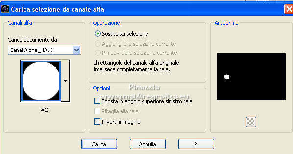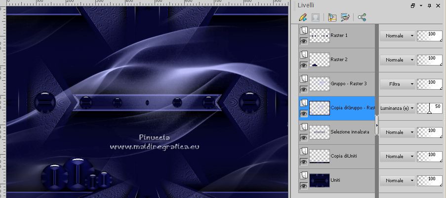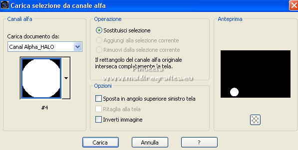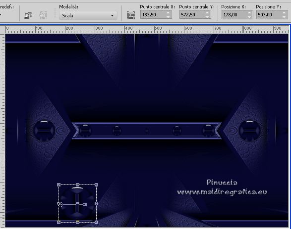 qui puoi trovare qualche risposta ai tuoi dubbi. Se l'argomento che ti interessa non è presente, ti prego di segnalarmelo. Questo tutorial è stato realizzato con Corel19 e tradotto con CorelX7, CorelX2 e CorelX3, ma può essere eseguito anche con le altre versioni di PSP. Dalla versione X4, il comando Immagine>Rifletti è stato sostituito con Immagine>Capovolgi in orizzontale, e il comando Immagine>Capovolgi con Immagine>Capovolgi in verticale. Nelle versioni X5 e X6, le funzioni sono state migliorate rendendo disponibile il menu Oggetti. Con la nuova versione X7, sono tornati Rifletti>Capovolgi, ma con nuove varianti. Vedi la scheda sull'argomento qui traduzione in francese/traduction en français qui/ici traduzione in inglese/english translation qui/here Versioni/Versions quiOccorrente: Un tube a scelta. ![]() Per il tube usato e non fornito grazie Yedralina (2143©Yedralina) Per la maschera grazie MJ (MASK-MD-089). (in questa pagina trovi i links ai siti dei creatori di tubes) ![]() se hai problemi con i filtri, consulta la mia sezione filtri qui Filters Unlimited 2.0 qui VM Distortion - Distortion by Transparency qui Simple - Top Left Mirror qui Alien Skin Eye Candy 5 Impact - Glass qui Mura's Meister - Perspective Tiling qui Mura's Meister - Copies qui Carolaine and Sensibility - CS_Texture qui Graphics Plus - Cross Shadow qui Almathera - Halo qui AAA Frames - Foto Frame qui I filtri VM Distortion, Simple e Graphics Plus si possono usare da soli o importati in Filters Unlimited (come fare vedi qui) Se un filtro fornito appare con questa icona ![]() non esitare a cambiare modalità di miscelatura e opacità secondo i colori utilizzati. Nelle ultime versioni di PSP non c'è il gradiente di primo piano/sfondo (Corel_06_029) Puoi usare i gradienti delle versioni precedenti. Trovi i gradienti Corel X qui. Metti il preset Cliccando sul file una o due volte (a seconda delle tue impostazioni), automaticamente il preset si installerà nella cartella corretta. perché uno o due clic vedi qui ![]() Metti la trama nella cartella Trame. Apri la maschera in PSP e minimizzala con il resto del materiale. 1. Imposta il colore di primo piano con #292a57, e il colore di sfondo con #a3a6f3. ![]() Prepara il colore di primo piano con un Gradiente di primo piano/sfondo, stile Lineare. ![]() Comincia con il colore di primo piano impostato su Colore. 2. Apri CanalAlpha_Halo. Finestra>Duplica o sulla tastiera maiuscola+D per fare una copia. ![]() Chiudi l'originale. La copia, che sarà la base del tuo lavoro, non è vuota, ma contiene le selezioni salvate sul canale alfa. Riempi l'immagine trasparente con il colore di primo piano.3. Effetti>Effetti di trama>Trama - seleziona la trama Exkizz-Texture_Doodles. ![]() 4. Effetti>Plugins>Filters Unlimited 2.0 - VM Distortion - Distortion by Transparency. ![]() 5. Effetti>Plugins>Simple - Top Left Mirror. ![]() 6. Selezione>Carica/Salva selezione>Carica selezione da canale alfa. La selezione #1 è subito disponibile. Devi soltanto cliccare Carica. ![]() Selezione>Innalza selezione a livello. 7. Effetti>Plugins>AAA Frames - Foto Frame. ![]() 8. Effetti>Effetti 3D>Sfalsa ombra, colore nero. ![]() Selezione>Deseleziona. 9. Cambia la modalità di miscelatura di questo livello in Sovrapponi, o Luminanza (esistente). 10. Modifica>Copia Speciale>Copia Unione. Modifica>Incolla come nuovo livello. Nelle versioni più recenti di PSP: Livelli>Unisci>Unisci visibile a nuovo livello 11. Effetti>Effetti geometrici>Prospettiva verticale. ![]() 12. Effetti>Effetti di riflesso>Specchio rotante. ![]() 13. Livelli>Unisci>Unisci visibile. 14. Effetti>Effetti di immagine>Motivo unico, con i settaggi standard. ![]() Effetti>Effetti di bordo>Aumenta. 15. Livelli>Duplica. Effetti>Plugins>Mura's Meister - Perspective Tiling. ![]() 16. Attiva lo strumento Bacchetta magica , sfumatura e tolleranza 0,e clicca nella parte trasparente per selezionarla. 17. Selezione>Modifica>Sfuma interno/esterno. ![]() Premi +/-10 volte CANC sulla tastiera ![]() Selezione>Deseleziona. 18. Attiva nuovamente il livello di sfondo, Uniti. Modifica>Copia. Modifica>Incolla come nuova immagine, e minimizza questa immagine. 19. Torna al tuo lavoro. Livelli>Nuovo livello raster. Livelli>Disponi>Sposta su. 20. Selezione>Carica/Salva selezione>Carica selezione da canale alfa. Apri il menu delle selezioni e carica la selezione #2. ![]() 21. Modifica>Incolla nella selezione (è in memoria l'immagine che hai minimizzato al punto 18) 22. Effetti>Plugins>Alien Skin Eye Candy 5 Impact - Glass. Seleziona il preset Glass 9 e ok. ![]() Selezione>Deseleziona. 23. Effetti>Effetti di riflesso>Specchio rotante. ![]() 24. Livelli>Duplica. Immagine>Ridimensiona, al 60%, tutti i livelli non selezionato. 25. Effetti>Plugins>Mura's Meister - Copies. ![]() 26. Effetti>Effetti di riflesso>Specchio rotante, con i settaggi precedenti. ![]() 27. Livelli>Unisci>Unisci giù. Regola>Messa a fuoco>Metti a fuoco. 28. Attiva il livello di sfondo, Uniti. Selezione>Carica/Salva selezione>Carica selezione da canale alfa. Apri il menu delle selezioni e carica la selezione #3. ![]() Selezione>Innalza selezione a livello. Livelli>Disponi>Sposta su. 29. Effetti>Plugins>Carolaine and Sensibility - CS_Texture, con i settaggi standard. ![]() 30. Effetti>Effetti di riflesso>Specchio rotante. ![]() Selezione>Deseleziona. 31. Livelli>Nuovo livello raster. Selezione>Carica/Salva selezione>Carica selezione da canale alfa. Apri il menu delle selezioni e carica la selezione #4. ![]() 32. Modifica>Incolla nella selezione (l'immagine minimizzata al punto 18 è sempre in memoria). 33. Immagine>Ruota per gradi - 90 gradi a destra. ![]() 34. Effetti>Plugins>Alien Skin Eye Candy 5 Impact, con i settaggi precedenti. ![]() Selezione>Deseleziona. 35. Tasto K sulla tastiera per attivare lo strumento Puntatore ![]() e imposta Posizione X: 178,00 e Posizione Y: 507,00 ![]() Tasto M per deselezionare lo strumento. Questa sara la sfera 1 36. Livelli>Duplica. Immagine>Ridimensi