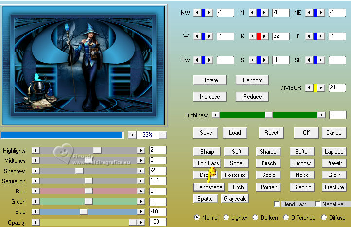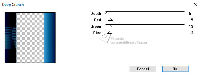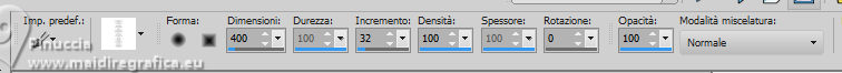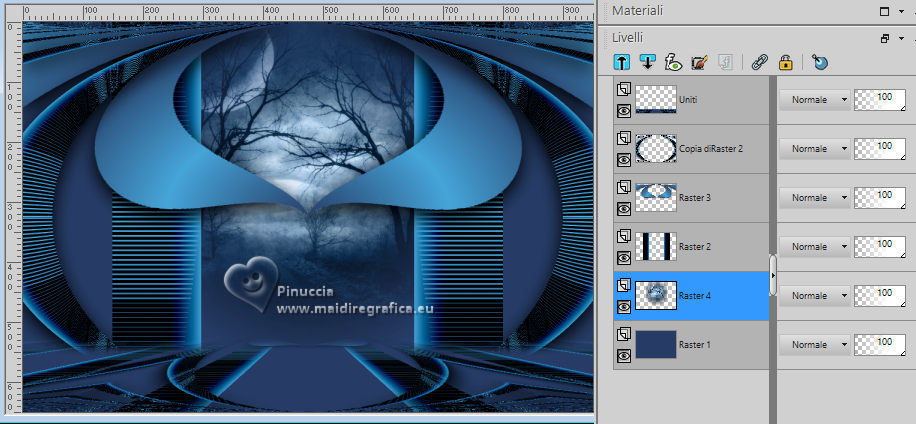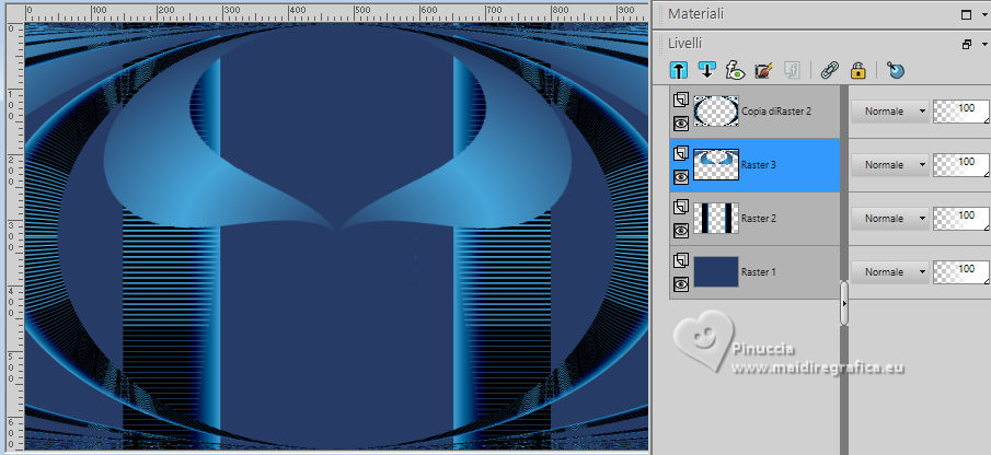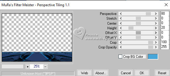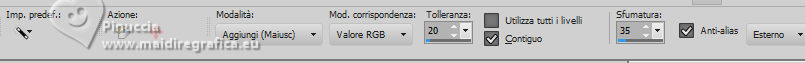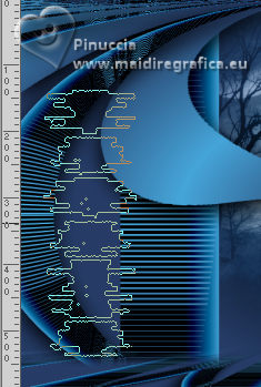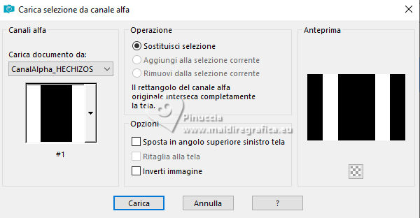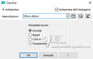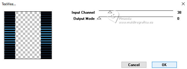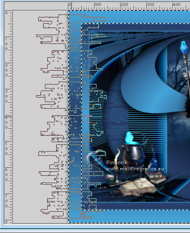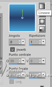 qui puoi trovare qualche risposta ai tuoi dubbi. Se l'argomento che ti interessa non è presente, ti prego di seghechizosrmelo. Questo tutorial è stato realizzato con PSP2020 e tradotto con PSPX7, ma può essere eseguito anche con le altre versioni di PSP. Dalla versione X4, il comando Immagine>Rifletti è stato sostituito con Immagine>Capovolgi in orizzontale, e il comando Immagine>Capovolgi con Immagine>Capovolgi in verticale. Nelle versioni X5 e X6, le funzioni sono state migliorate rendendo disponibile il menu Oggetti. Con la nuova versione X7, sono tornati Rifletti>Capovolgi, ma con nuove varianti. Vedi la scheda sull'argomento qui traduzione in francese/traduction en français qui/ici traduzione in inglese/english translation qui/here Versioni/Versions qui![]() Occorrente: Tubes a scelta. Il resto del materiale ![]() Per i tubes usati grazie Ina e NaiseM. Il misted viene da klipartz.com. (in questa pagina trovi i links ai siti dei creatori di tubes) ![]() se hai problemi con i filtri, consulta la mia sezione filtri qui Filters Unlimited 2.0 qui VM Experimental - TeeWee, Deep Crunch qui Mura's Meister - Perspective Tiling qui AAA Filters - Custom qui I filtri VM Experimental si possono usare da soli o importati in Filters Unlimited (come fare vedi qui) Se un filtro fornito appare con questa icona ![]() non esitare a cambiare modalità di miscelatura e opacità secondo i colori utilizzati. Nelle ultime versioni di PSP non c'è il gradiente di primo piano/sfondo (Corel_06_029) Puoi usare i gradienti delle versioni precedenti. Trovi i gradienti Corel X qui. ![]() Metti il pennello nella cartella Pennelli. Attenzione, il pennello è composto da due files che non devono essere separati. Vedi gli appunti sui pennelli qui 1. Imposta il colore di primo piano con #273d67, e il colore di sfondo con #46a5d9. ![]() Passa il colore di primo piano a Gradiente di primo piano/sfondo, stile Lineare. ![]() Per cominciare, imposta il colore di primo piano a Colore. 2. Apri CanalAlpha_HECHIZOS. Finestra>Duplica o sulla tastiera maiuscola+D per fare una copia. ![]() Chiudi l'originale. La copia, che sarà la base del tuo lavoro, non é vuota, ma contiene le selezioni salvate sul canale alfa (la terza selezione non sarà utilizzata). Riempi l'immagine trasparente con il colore di primo piano.3. Livelli>Nuovo livello raster. Selezione>Carica/Salva selezione>Carica selezione da canale alfa. La selezione #1 é subito disponibile. Devi soltanto cliccare Carica. ![]() 4. Passa il colore di primo piano a Gradiente. Riempi la selezione con il gradiente.5. Effetti>Plugins>VM Experimental - TeeWee. ![]() 6. Effetti>Plugins>VM Experimental - Deep Crunch. ![]() 7. Effetti>Effetti di riflesso>Specchio rotante, con i settaggi standard. ![]() Selezione>Deseleziona. 8. Livelli>Duplica. Effetti>Effetti geometrici>Cerchio. ![]() 9. Effetti>Effetti di riflesso>Specchio rotante. ![]() 10. Selezione>Carica/Salva selezione>Carica selezione da canale alfa. Apri il menu delle selezioni e carica la selezione #2 ![]() Premi sulla tastiera il tasto CANC ![]() 11. Livelli>Nuovo livello raster. Riempi la selezione con il gradiente.Selezione>Deseleziona. 12. Effetti>Effetti di distorsione>Coordinate polari. ![]() 13. Immagine>Capovolgi. Livelli>Disponi>Sposta giù. ![]() 14. Effetti>Effetti 3D>Sfalsa ombra, colore nero. ![]() 15. Attiva il livello superiore. Modifica>Ripeti Sfalsa ombra. 16. Livelli>Unisci>Unisci visibile a nuovo livello. ![]() 17. Effetti>Plugins>Mura's Meister - Perspective Tiling. ![]() 18. Attiva lo strumento Bacchetta magica , tolleranza 20, sfumatura 35.![]() Clicca nello spazio trasparente per selezionarlo. Premi +/-10 volte CANC sulla tastiera. Selezione>Deseleziona. non dimenticare di riportare tolleranza e sfumatura a 0 19. Apri il tuo misted, per l'esempio klipartz.com ![]() Modifica>Copia. Torna al tuo lavoro e vai a Modifica>Incolla come nuovo livello. Immagine>Ridimensiona, se necessario. Sposta il tube un po' più in alto.Livelli>Disponi>Sposta giù - 4 volte (sopra il livello di sfondo. ![]() 20. Attiva il livello di sfondo, Raster 1. Livelli>Nuovo livello raster. 21. Attiva lo strumento Pennello ![]() cerca e seleziona il pennello Text brush 1, dimensione 400 pixels. ![]() Applica il pennello a sinistra cliccando con il tasto destro del mouse, per usare il colore di sfondo. ![]() 22. Effetti>Effetti di riflesso>Specchio rotante. ![]() 23. Attiva il livello superiore. Apri il tuo tube, per l'esempio ina_heks_02-10-2022 ![]() Modifica>Copia. Torna al tuo lavoro e vai a Modifica>Incolla come nuovo livello. Immagine>Ridimensiona, se necessario, per me al 90%, tutti i livelli non selezionato. Spostalo in basso.(Oggetti>Allinea>Inferiore). 24. Effetti>Effetti 3D>Sfalsa ombra, colore nero. ![]() 25. Se vuoi aggiungere un tube decorativo, questo è il momento. Per il mio esempio halloween-naisem-74 ![]() Spostalo in basso a sinistra.26. Immagine>Aggiungi bordatura, 1 pixel, simmetriche, colore di sfondo. Immagine>Aggiungi bordatura, 1 pixel, simmetriche, colore di primo piano. Immagine>Aggiungi bordatura, 1 pixel, simmetriche, colore di sfondo. 27. Selezione>Seleziona tutto. Immagine>Aggiungi bordatura, 25 pixels, simmetriche, con un colore qualsiasi. Selezione>Inverti. Riempi la selezione con il gradiente.Selezione>Deseleziona. 28. Immagine>Aggiungi bordatura, 1 pixel, simmetriche, colore di sfondo. Immagine>Aggiungi bordatura, 1 pixel, simmetriche, colore di primo piano. Immagine>Aggiungi bordatura, 1 pixel, simmetriche, colore di sfondo. 29. Selezione>Seleziona tutto. Immagine>Aggiungi bordatura, 50 pixels, simmetriche, con un colore qualsiasi. Selezione>Inverti. 30. Cambia i settaggi del gradiente e seleziona Inverti. ![]() Riempi la selezione con il gradiente.Mantieni selezionato. 31. Livelli>Nuovo livello raster. Attiva nuovamente lo strumento Pennello ![]() e imposta la dimensione à 780 ![]() Applica il pennello sulla selezione, un po' fuori dal bordo, come nell'esempio. ![]() 32. Effetti>Effetti d