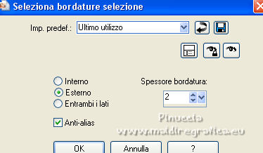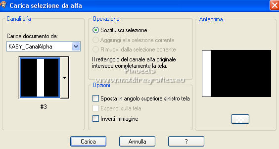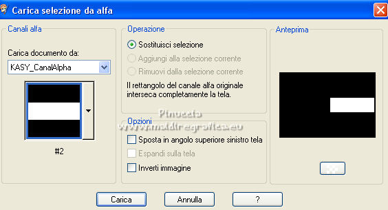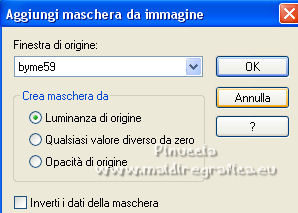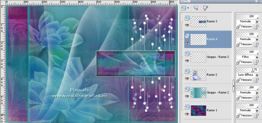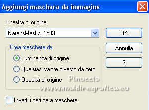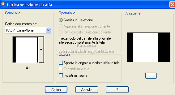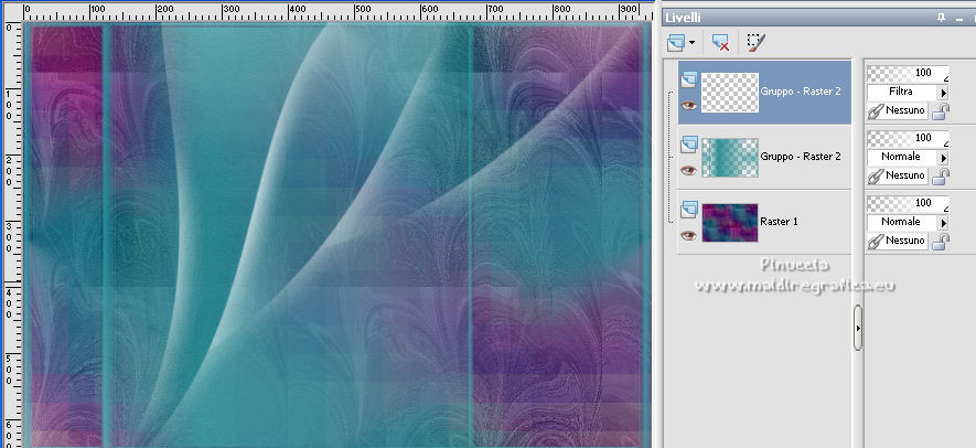 qui puoi trovare qualche risposta ai tuoi dubbi. Se l'argomento che ti interessa non è presente, ti prego di segnalarmelo. Questo tutorial è stato realizzato con Corel19 e tradotto con CorelX7, CorelX2 e CorelX3, ma può essere eseguito anche con le altre versioni di PSP. Dalla versione X4, il comando Immagine>Rifletti è stato sostituito con Immagine>Capovolgi in orizzontale, e il comando Immagine>Capovolgi con Immagine>Capovolgi in verticale. Nelle versioni X5 e X6, le funzioni sono state migliorate rendendo disponibile il menu Oggetti. Con la nuova versione X7, sono tornati Rifletti>Capovolgi, ma con nuove varianti. Vedi la scheda sull'argomento qui traduzione in francese/traduction en français qui/ici traduzione in inglese/english translation qui/here Versioni/Versions quiOccorrente: Materiale qui Grazie: per il tube principale Luz Cristina (6581-Luz Cristina), per le maschere Narah (NarahsMasks_1533) e byme (byme59) e per il pennello Astrid (Astrid penseel 143). Il resto del materiale è di Yedralina. (in questa pagina trovi i links ai siti dei creatori di tubes) Filtri: se hai problemi con i filtri, consulta la mia sezione filtri qui Filters Unlimited 2.0 qui RCS Filter Pack - RCS CTripleExposure qui Mehdi - Sorting Tiles qui Mura's Seamless - Emboss at Alpha qui I filtri RCS e Mura's Seamless si possono usare da soli o importati in Filters Unlimited (come fare vedi qui) Se un filtro fornito appare con questa icona ![]() non esitare a cambiare modalità di miscelatura e opacità secondo i colori utilizzati. Nelle ultime versioni di PSP non c'è il gradiente di primo piano/sfondo (Corel_06_029) Puoi usare i gradienti delle versioni precedenti. Trovi qui i gradienti Corel X. ![]() Metti i pennelli nella cartella Pennelli. Attenzione, ogni pennello è composto da due files che non devono essere separati. Vedi gli appunti sui pennelli qui Apri le maschere in PSP e minimizzale con il resto del materiale. 1. Imposta il colore di primo piano con #a21c7a, e il colore di sfondo con #288c94. ![]() Passa il colore di primo piano a Gradiente di primo piano/sfondo, stile Lineare. ![]() 2. Apri KASY2_CanalAlpha Finestra>Duplica o sulla tastiera maiuscola+D per fare una copia. ![]() Chiudi l'originale. La copia, che sarà la base del tuo lavoro, non è vuota, ma contiene le selezioni salvate sul canale alfa. Riempi l'immagine trasparente con il gradiente.3. Effetti>Plugins>Mehdi - Sorting Tiles. ![]() 4. Effetti>Plugins>Filters Unlimited 2.0 - RCS Filter Packs 1.0 - RCS TripleExposure, con i settaggi standard. ![]() 5. Effetti>Plugins>Filters Unlimited 2.0 - Paper Textures - Papier Kasy 2. ![]() 6. Ripeti Effetti>Plugins>Filters Unlimited 2.0 - Paper Textures - Papier Kasy 2, con i settaggi standard. ![]() 7. Effetti>Effetti di immagine>Motivo unico, con i settaggi standard. ![]() Regola>Messa a fuoco>Metti a fuoco. 8. Livelli>Nuovo livello raster. Riempi con il colore di sfondo.9. Livelli>Nuovo livello maschera>Da immagine. Apri il menu sotto la finestra di origine e vedrai la lista dei files aperti. Seleziona la maschera humo byme59. ![]() Livelli>Unisci>Unisci gruppo. Effetti>Effetti di bordo>Aumenta. 10. Imposta il colore di sfondo con il colore bianco. Livelli>Nuovo livello raster. Riempi il livello con il colore bianco.11. Livelli>Nuovo livello maschera>Da immagine. Apri il menu sotto la finestra di origine e seleziona la maschera NarahsMasks_1533. ![]() Livelli>Unisci>Unisci gruppo. Immagine>Rifletti. 12. Effetti>Plugins>Mura's Seamless - Emboss at Alpha, con i settaggi standard. ![]() Cambia la modalità di miscelatura di questo livello in Filtra. ![]() 13. Selezione>Carica/Salva selezione>Carica selezione da canale alfa. La selezione #1 è subito disponibile. Devi soltanto cliccare Carica. ![]() 14. Livelli>Nuovo livello raster. Apri il misted dei fiori e vai a Modifica>Copia. Torna al tuo lavoro e vai a Modifica>Incolla nella selezione. Selezione>Deseleziona. 15. Effetti>Effetti 3D>Sfalsa ombra, colore nero. ![]() 16. Cambia la modalità di miscelatura di questo livello in Luce diffusa o Luminanza (esistente) e abbassa l'opacità +/-75%. Livelli>Disponi>Sposta giù. 17. Attiva il livello superiore. Livelli>Unisci>Unisci visibile in un nuovo livello. (nelle versioni meno recenti: Modifica>Copia Speciale>Copia Unione e Modifica>Incolla come nuovo livello) Immagine>Rifletti. 18. Modifica>Taglia, per tenere in memoria l'immagine. Il livello resterà vuoto, quindi non sarà necessario aggiungere un nuovo livello. 19. Selezione>Carica/Salva selezione>Carica selezione da canale alfa. Apri il menu delle selezioni e carica la selezione #2. ![]() Modifica>Incolla nella selezione. 20. Selezione>Inverti. Effetti>Effetti 3D>Sfalsa ombra, con i settaggi precedenti. ![]() 21. Selezione>Inverti. Selezione>Modifica>Seleziona bordature selezione. ![]() Riempi la selezione con il colore bianco.Selezione>Deseleziona. 22. Livelli>Nuovo livello raster. Attiva lo strumento Pennello ![]() cerca e seleziona il pennello Astrid penseel 143 ![]() Applica il pennello a destra cliccando con il tasto destro del mouse, per usare il colore bianco di sfondo. ![]() Attiva lo strumento Puntatore (tasto K sulla tastiera)per farlo scorrere leggermente da sinistra a destra ![]() 23. Effetti>Effetti di riflesso>Specchio rotante. ![]() Livelli>Disponi>Sposta giù ![]() 24. Livelli>Nuovo livello raster. Selezione>Carica/Salva selezione>Carica selezione da canale alfa. Apri il menu delle selezioni e carica la selezione #3. ![]() 25. Attiva nuovamente lo strumento Pennello ![]() cerca e seleziona il pennello Texte brush, dimensione 600 ![]() Applica il pennello nella selezione, sempre con il colore bianco (non preoccuparti se il testo esce dalla selezione) ![]() per il mio esempio ho applicato il pennello con il colore nero. 26. Selezione>Inverti. Effetti>Effetti 3D>Sfalsa ombra, colore nero. ![]() Selezione>Deseleziona. Cambia la modalità di miscelatura di questo livello in Luminanza (esistente). 27. Per i bordi, imposta nuo