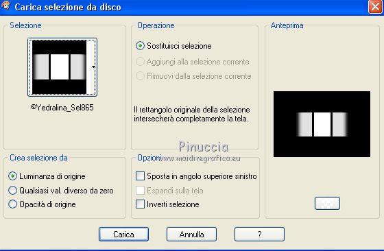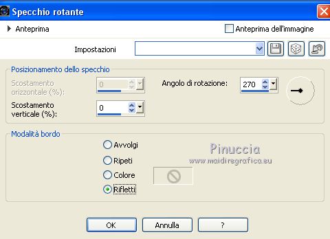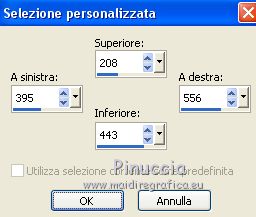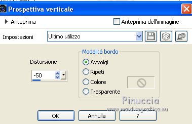 qui puoi trovare qualche risposta ai tuoi dubbi. Se l'argomento che ti interessa non è presente, ti prego di segnalarmelo. Questo tutorial è stato realizzato con Corel19 e tradotto con CorelX7, CorelX2 e CorelX3, ma può essere realizzato anche con le altre versioni di PSP. Dalla versione X4, il comando Immagine>Rifletti è stato sostituito con Immagine>Capovolgi in orizzontale, e il comando Immagine>Capovolgi con Immagine>Capovolgi in verticale. Nelle versioni X5 e X6, le funzioni sono state migliorate rendendo disponibile il menu Oggetti. Con la nuova versione X7, sono tornati Rifletti>Capovolgi, ma con nuove varianti. Vedi la scheda sull'argomento qui traduzione in francese/traduction en français qui/icitraduzione in inglese/english translation qui/here Versioni/Versions quiOccorrente: Tubes a scelta Il resto del materiale qui Per i tube usati e non forniti grazie Gabry (Gabry-woman 876), e ARTE PASSION (muguet1). Il resto del materiale è di Yedralina. (in questa pagina trovi i links ai siti dei creatori di tubes) Filtri: se hai problemi con i filtri, consulta la mia sezione filtri qui Filters Unlimited 2.0 qui Toadies - Blur'em qui Mura's Meister - Copies qui Alf's Border FX - Mirror Bevel qui Simple - Half Wrap qui FM Tile Tools - Collage Circular qui Sapphire Effects 01 - SapphirePlugin_0001 qui AAA Frames - Foto Frame qui I filtri Toadies, Alf's Border FX, Simple e Sapphire si possono usare da soli o importati in Filters Unlimited (come fare vedi qui) Se un filtro fornito appare con questa icona ![]() non esitare a cambiare modalità di miscelatura e opacità secondo i colori utilizzati. Nelle ultime versioni di PSP non c'è il gradiente di primo piano/sfondo (Corel_06_029) Puoi usare i gradienti delle versioni precedenti. Trovi qui i gradienti Corel X. Metti la selezione nella cartella Selezioni. Imposta il colore di primo piano con il colore scuro #836449, e il colore di sfondo con il colore chiaro #f2e8ce. ![]() Passa il colore di primo piano a Gradiente di primo piano/sfondo, stile Lineare. ![]() 1. Apri una nuova immagine trasparente 950 x 650 pixels, e riempila con il gradiente.2. Livelli>Nuovo livello raster. Selezione>Seleziona tutto. Apri il tuo misted e vai a Modifica>Copia. Torna al tuo lavoro e vai a Modifica>Incolla nella selezione. Selezione>Deseleziona. Effetti>Effetti di immagine>Motivo unico. ![]() Effetti>Plugins>Toadies - Blur'em! ![]() Regola>Messa a fuoco>Metti a fuoco. Cambia la modalità di miscelatura di questo livello in Moltiplica, o secondo i tuoi colori, e abbassa l'opacità +/- 65%, sempre in base ai tuoi colori per il mio secondo lavoro ho cambiato in Sovrapponi Attiva il livello di sfondo. 3. Effetti>Plugins>FM Tile Tools - Collage Circular, con i settaggi standard. ![]() Effetti>Plugins>Filters Unlimited 2.0 - Sapphire Effects 01 - SapphirePlugin_0001, con i settaggi standard. ![]() Effetti>Effetti di riflesso>Specchio rotante. ![]() Effetti>Plugins>Filters Unlimited 2.0 - Simple - Half Wrap ![]() Effetti>Effetti di riflesso>Specchio rotante, con i settaggi standard. ![]() 4. Attiva il livello superiore. Livelli>Nuovo livello raster. Selezione>Carica/Salva selezione>Carica selezione da disco. Cerca e carica la selezione ©Yedralina_Sel865. ![]() Modifica>Incolla nella selezione (il tuo misted è sempre in memoria). Selezione>Deseleziona. Regola>Messa a fuoco>Metti a fuoco. 5. Effetti>Effetti di immagine>Motivo unico. ![]() Effetti>Plugins>Mura's Meister - Copies. ![]() Effetti>Effetti di riflesso>Specchio rotante. ![]() Abbassa l'opacità di questo livello +/- 60%, o 64% andrà bene 6. Livelli>Nuovo livello raster. Attiva lo strumento Selezione ![]() (non importa il tipo di selezione impostato, perchè con la selezione personalizzata si ottiene sempre un rettangolo) clicca sull'icona Selezione personalizzata ![]() e imposta i seguenti settaggi. ![]() Modifica>Incolla nella selezione (il tuo misted è ancora in memoria). Selezione>Deseleziona. Se necessario, con lo strumento Puntatore (tasto K sulla tastiera),tira leggeremente il misted a destra e a sinistra ![]() 7. Apri il testo Text_ALoveKiss@Yedralina e vai a Modifica>Copia. Torna al tuo lavoro e vai a Modifica>Incolla come nuovo livello. Non spostarlo. E' al suo posto. 8. Livelli>Unisci>Unisci visibile a nuovo livello. Nelle versioni precedenti: Modifica>Copia Speciale>Copia Unione Modifica>Incolla come nuovo livello. Effetti>Effetti geometrici>Prospettiva verticale. ![]() 9. Tasto K sulla tastiera per attivare lo strumento Puntatore ![]() e, in modalità scala ![]() spingi il nodo centrale superiore ![]() verso il basso, come nell'esempio ![]() Tasto M per deselezionare lo strumento. 9. Apri il testo Text_KissMe©Yedralina e vai a Modifica>Copia. Torna al tuo lavoro e vai a Modifica>Incolla come nuovo livello. Spostalo sulla striscia in alto.Se preferisci scrivere un tuo testo, chiudi il colore di primo piano e attiva lo strumento Testo ,font Freestyle Script (lo trovi nel materiale), regola la dimensione in base al testo e alla versione di PSP che stai usando. ![]() Scrivi la tua frase. Cambia la modalità di miscelatura di questo livello in Luce diffusa (o secondo i tuoi colori); per il mio esempio ho scelto Luce netta. 10. Apri il tuo tube principale, nel mio caso una coppia, e vai a Modifica>Copia. Torna al tuo lavoro e vai a Modifica>Incolla come nuovo livello. Immagine>Ridimensiona, se e quanto necessario, tutti i livelli non selezionato. Posiziona correttamente il tube.Effetti>Effetti 3D>Sfalsa ombra, a scelta, per il mio esempio ![]() 11. Immagine>Aggiungi bordatura, 2 pixels, simmetriche, colore di primo piano. Immagine>Aggiungi bordatura, 2 pixels, simmetriche, colore di sfondo. Immagine>Aggiungi bordatura, 2 pixels, simmetriche, colore di primo piano. Modifica>Copia e, per precauzione, Modifica>Incolla come nuova immagine, e minimizza questa immagine. Torna al tuo lavoro. Immagine>Aggiungi bordatura, 15 pixels, simmetriche, colore bianco. Immagine>Aggiungi bordatura, 2 pixels, si
