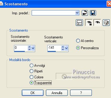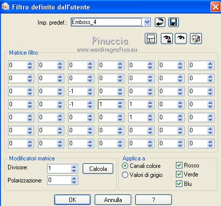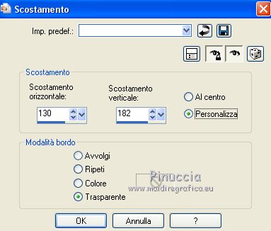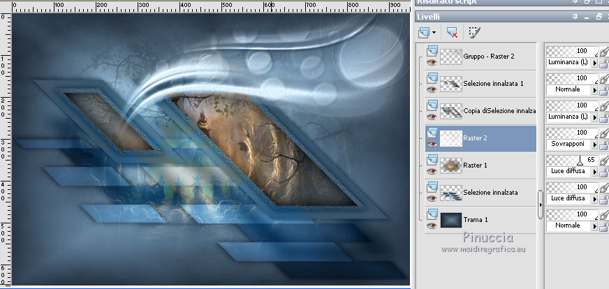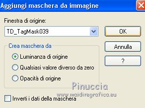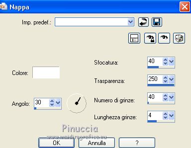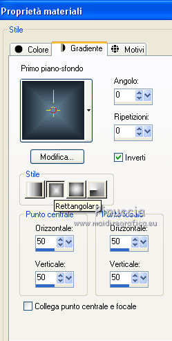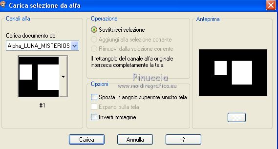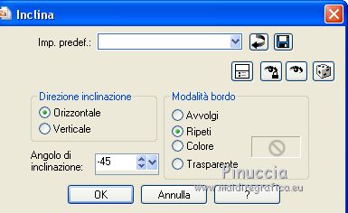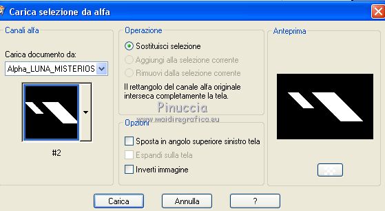 qui puoi trovare qualche risposta ai tuoi dubbi. Se l'argomento che ti interessa non è presente, ti prego di segnalarmelo. Questo tutorial è stato realizzato con Corel19 e tradotto con CorelX7, CorelX2 e CorelX3, ma può essere realizzato anche con le altre versioni di PSP. Dalla versione X4, il comando Immagine>Rifletti è stato sostituito con Immagine>Capovolgi in orizzontale, e il comando Immagine>Capovolgi con Immagine>Capovolgi in verticale. Nelle versioni X5 e X6, le funzioni sono state migliorate rendendo disponibile il menu Oggetti. Con la nuova versione X7, sono tornati Rifletti>Capovolgi, ma con nuove varianti. Vedi la scheda sull'argomento qui traduzione in francese/traduction en français qui/icitraduzione in inglese/english translation qui/hereVersioni/Versions qui Occorrente: Tubes a scelta (un paesaggio e un tube). Il resto del materiale qui Per i tubes usati e non forniti grazie Silvie e Nena Silva. Maschera di TD (TD_TagMask039) (in questa pagina trovi i links ai siti dei creatori di tubes) Filtri: se hai problemi con i filtri, consulta la mia sezione filtri qui Filters Unlimited 2.0 qui Mura's Meister - Cloud qui VM Extravaganza - Transmission qui Alien Skin Eye Candy 5 Impact - Perspective Shadow qui AAA Filters - Custom qui I filtri VM Extravaganza si possono usare da soli o importati in Filters Unlimited (come fare vedi qui) Se un filtro fornito appare con questa icona ![]() non esitare a cambiare modalità di miscelatura e opacità secondo i colori utilizzati. Nelle ultime versioni di PSP non c'è il gradiente di primo piano/sfondo (Corel_06_029) Puoi usare i gradienti delle versioni precedenti. Trovi qui i gradienti Corel X. Metti il preset Cliccando sul file una o due volte (a seconda delle tue impostazioni), automaticamente il preset si installerà nella cartella corretta. perchè uno o due clic vedi qui Metti il preset Emboss 4 nella cartella Impostazioni predefinite. Apri la maschera in PSP e minimizzala con il resto del materiale. 1. Imposta il colore di primo piano con #182029, e il colore di sfondo con il colore #698aa1. ![]() Passa il colore di primo piano a Gradiente di primo piano/sfondo, stile Rettangolare. ![]() 2. Apri Alpha_Luna misteriosa. Duplica l'immagine (sulla tastiera shift+D) e chiudi l'originale. La copia, che sarà la base del tuo lavoro non è vuota, ma contiene le selezioni salvate sul canale alfa. Riempi l'immagine trasparente con il gradiente.3. Selezione>Carica/Salva selezione>Carica selezione da canale alfa. La selezione #1 è subito disponibile. Devi soltanto cliccare Carica. ![]() Selezione>Innalza selezione a livello. Effetti>Effetti 3D>Sfalsa ombra, colore nero. ![]() Selezione>Deseleziona. 4. Effetti>Effetti geometrici>Inclina. ![]() 5. Livelli>Duplica Attiva il livello sottostante dell'originale, Selezione innalzata. Immagine>Rifletti. Effetti>Plugins>VM Extravaganza - Transmission. ![]() Di nuovo Immagine>Rifletti. Oggetti>Allinea>Basso Se stai lavorando con una versione precedente che non rende disponibile il menu Oggetti, usa lo strumento Spostamento ![]() ![]() in alternativa puoi fare Effetti>Effetti di immagine>Scostamento ![]() Effetti>Effetti 3D>Sfalsa ombra, con i settaggi precedenti. ![]() Cambia la modalità di miscelatura di questo livello in Luce diffusa. 6. Livelli>Nuovo livello raster. Selezione>Seleziona tutto. Apri il tube del paesaggio e vai a Modifica>Copia. Torna al tuo lavoro e vai a Modifica>Incolla nella selezione. Selezione>Deseleziona. Cambia la modalità di miscelatura di questo livello in Luce diffusa, e abbassa l'opacità +/-65%. 7. Attiva il livello superiore, copia di Selezione innalzata. Selezione>Carica/Salva selezione>Carica selezione da canale alfa. Apri il menu delle selezioni e carica la selezione #2. ![]() Effetti>Effetti 3D>Sfalsa ombra, con i settaggi precedenti. ![]() Effetti>Effetti di trama>Nappa. ![]() Selezione>Modifica>Contrai - 10 pixels. Selezione>Innalza selezione a livello. Ritorna sul livello sottostante Premi sulla tastiera il tasto CANC ![]() 8. Attiva il livello del paesaggio, Raster 1 Selezione>Innalza selezione a livello. Livelli>Disponi>Porta in alto. Selezione>Inverti. Effetti>Effetti 3D>Sfalsa ombra, colore nero. ![]() Selezione>Deseleziona. Livelli>Unisci>Unisci giù. 9. Attiva nuovamente il livello Copia di Selezione>Innalzata. Effetti>Plugins>Alien Skin Eye Candy 5 Impact - Perspective Shadow. Seleziona il preset EC5_PS8. ![]() Cambia la modalità di miscelatura di questo livello in Luminanza (esistente), o altro. 10. Imposta il colore di primo piano con il colore bianco. Livelli>Nuovo livello raster. Riempi il livello con il colore bianco.Livelli>Nuovo livello maschera>Da immagine. Apri il menu sotto la finestra di origine e vedrai la lista dei files aperti. Seleziona la maschera TD_TagMask039. ![]() Livelli>Duplica. Livelli>Unisci>Unisci gruppo. Immagine>Ridimensiona, all'80%, tutti i livelli non selezionato. Immagine>Rifletti. Immagine>Ruota per gradi - 25 gradi a sinistra ![]() Effetti>Effetti di immagine>Scostamento. ![]() Effetti>Filtro definito dall'utente - seleziona il preset Emboss 4 e ok. ![]() Effetti>Effetti 3D>Sfalsa ombra, colore nero. ![]() Cambia la modalità di miscelatura di questo livello in Luminanza (esistente). Livelli>Disponi>Porta in alto. 11. Livelli>Nuovo livello raster. Effetti>Plugins>Mura's Meister - Cloud seleziona soltanto il colore bianco ![]() Livelli>Disponi>Sposta giù - 3 volte. Cambia la modalità di miscelatura di questo livello in Sovrapponi. ![]() 12. Livelli>Unisci>Unisci tutto. 13. Immagine>Aggiungi bordatura, 2 pixels, simmetriche, colore chiaro. Immagine>Aggiungi bordatura, 2 pixels, simmetriche, colore scuro. Immagine>Aggiungi bordatura, 2 pixels, simmetriche, colore chiaro. Selezione>Seleziona tutto. Modifica>Copia. 14. Immagine>Aggiungi bordatura, 25 pixels, simmetriche, con un colore qualunque. Selezione>Inverti. Modifica>Incolla nella selezione. Regola>Sfocatura>Sfocatura gaussiana - raggio 10. ![]() Selezione>Inverti.