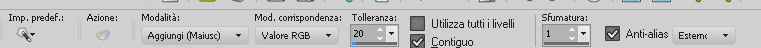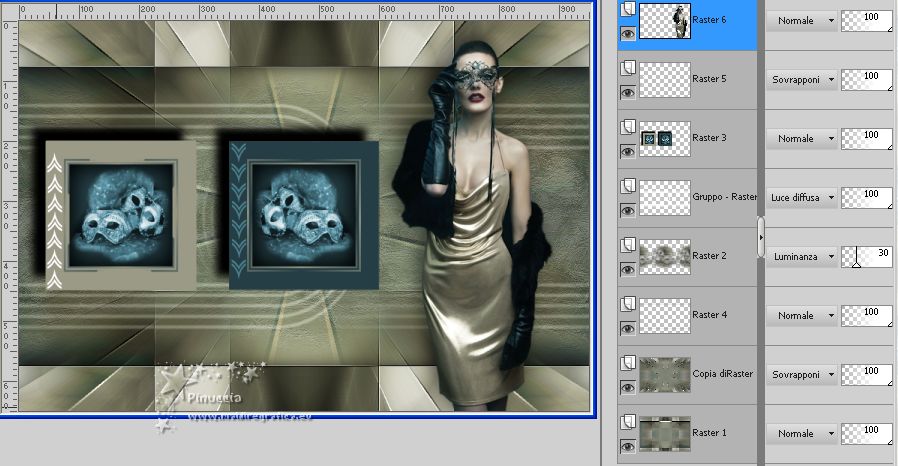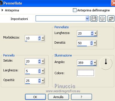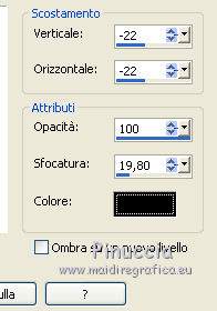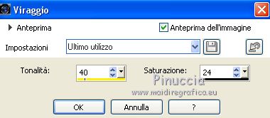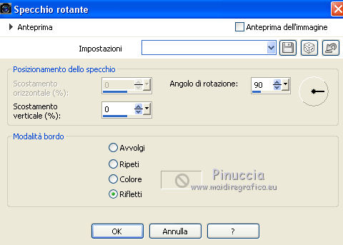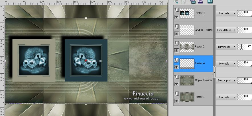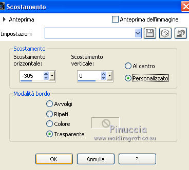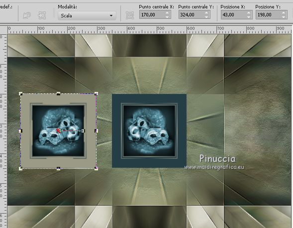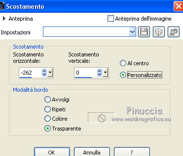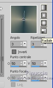 qui puoi trovare qualche risposta ai tuoi dubbi. Se l'argomento che ti interessa non è presente, ti prego di segnalarmelo. Questo tutorial è stato realizzato con Corel19 e tradotto con CorelX7, CorelX2 e CorelX3, ma può essere realizzato anche con le altre versioni di PSP. Dalla versione X4, il comando Immagine>Rifletti è stato sostituito con Immagine>Capovolgi in orizzontale, e il comando Immagine>Capovolgi con Immagine>Capovolgi in verticale. Nelle versioni X5 e X6, le funzioni sono state migliorate rendendo disponibile il menu Oggetti. Con la nuova versione X7, sono tornati Rifletti>Capovolgi, ma con nuove varianti. Vedi la scheda sull'argomento qui traduzione in francese/traduction en français qui/icitraduzione in inglese/english translation qui/hereVersioni/Versions qui Occorrente: Tubes a scelta Il resto del materiale qui Per i tubes grazie OcchiBlu (OBG_1763) e Violette (violette03_806bb31f) Per la maschera grazie Narah. Il resto del materiale è di Yedralina. (in questa pagina trovi i links ai siti dei creatori di tubes) Filtri: se hai problemi con i filtri, consulta la mia sezione filtri qui Filters Unlimited 2.0 qui Scribe - 4Way Mirror qui VM Stylize - Zoom Blur qui Mehdi - Sorting Tiles qui I filtri Scribe e VM Stylize si possono usare da soli o importati in Filters Unlimited (come fare vedi qui) Se un filtro fornito appare con questa icona ![]() non esitare a cambiare modalità di miscelatura e opacità secondo i colori utilizzati. Nelle ultime versioni di PSP non c'è il gradiente di primo piano/sfondo (Corel_06_029) Puoi usare i gradienti delle versioni precedenti. Trovi qui i gradienti Corel X. Metti le selezioni nella cartella Selezioni. Apri la maschera in PSP e minimizzala con il resto del materiale. Scegli due colori dal tuo tube. Per l'esempio: Imposta il colore di primo piano con #263f46, e il colore di sfondo con #9b9a86. ![]() Passa il colore di sfondo a Gradiente di primo piano/sfondo, stile Radiale. ![]() 1. Apri una nuova immagine trasparente 950 x 650 pixels, e riempila con il gradiente.Selezione>Seleziona tutto. Apri il misted Per il mio esempio ho applicato al tube: Regola>Tonalità e Saturazione>Viraggio ![]() Modifica>Copia. Torna al tuo lavoro e vai a Modifica>Incolla nella selezione. Selezione>Deseleziona. Regola>Sfocatura>Sfocatura gaussiana - raggio 20. ![]() Effetti>Plugins>Mehdi - Sorting Tiles. ![]() Effetti>Effetti di bordo>Aumenta di più. Effetti>Plugins>Scribe - 4Way Mirror, con i settaggi standard. ![]() Livelli>Duplica. 2. Effetti>Plugins>VM Stylize - Zoom Blur, con i settaggi standard. ![]() Cambia la modalità di miscelatura di questo livello in Sovrapponi. 3. Modifica>Incolla come nuovo livello (il misted è ancora in memoria). Effetti>Effetti di immagine>Motivo unico. ![]() Effetti>Effetti tecniche di disegno>Pennellate. ![]() Cambia la modalità di miscelatura di questo livello in Luminanza, e abbassa l'opacità a 30, o secondo i tuoi colori (per la seconda versione ho abbassato l'opacità a 70) 4. Livelli>Nuovo livello raster. Selezione>Carica/Salva selezione>Carica selezione da disco. Cerca e carica la selezione ©Yedralina_sel732. ![]() Riempi la selezione con il colore scuro di primo piano.Selezione>Modifica>Contrai - 30 pixels. Riempi la selezione con il gradiente.Selezione>Modifica>Contrai - 3 pixels. Riempi la selezione con il colore scuro.Selezione>Modifica>Contrai - 3 pixels. Cambia i settaggi del gradiente selezionando Inverti. ![]() Riempi la selezione con il gradiente.Selezione>Modifica>Contrai - 3 pixels. Riempi la selezione con il colore scuro.Mantieni selezionato. 5. Livelli>Nuovo livello raster. Modifica>Incolla nella selezione (il misted è sempre in memoria). Cambia la modalità di miscelatura di questo livello in Luminanza, o altro. (per il mio esempio ho lasciato Normale) Selezione>Inverti. Effetti>Effetti 3D>Sfalsa ombra, colore nero. ![]() Livelli>Unisci>Unisci giù. Selezione>Deseleziona. Livelli>Duplica. 6. Attiva lo strumento Bacchetta magica , tolleranza 20,![]() clicca nel bordo più largo per selezionarlo. Passa il colore di sfondo a Colore. Riempi la selezione con il colore chiaro di sfondo.Selezione>Deseleziona. Effetti>Effetti di immagine>Scostamento. ![]() Immagine>Capovolgi>Capovolgi in orizzontale. nelle versioni meno recenti: Immagine>Rifletti. Strumento Puntatore ![]() e imposta Posizione X: 43,00 e Posizione Y: 198,00 ![]() Livelli>Unisci>Unisci giù. Effetti>Effetti 3D>Sfalsa ombra. ![]() 7. Imposta il colore di primo piano con il colore bianco Livelli>Nuovo livello raster. Riempi il livello con il colore bianco.Nella mia seconda versione ho usato il colore scuro. Livelli>Nuovo livello maschera>Da immagine. Apri il menu sotto la finestra di origine e vedrai la lista dei files aperti. Seleziona la maschera Narah_Mask_1401. ![]() Livelli>Unisci>Unisci gruppo. Cambia la modalità di miscelatura di questo livello in Luce diffusa, o altro. nella mia seconda versione ho cambiato in Sovrapponi Immagine>Rifletti. Immagine>Capovolgi. Effetti>Effetti di riflesso>Specchio rotante. ![]() Livelli>Disponi>Sposta giù. 8. Livelli>Nuovo livello raster. Selezione>Carica/Salva selezione>Carica selezione da disco. Cerca e carica la selezione ©Yedralina_sel733. ![]() Effetti>Effetti 3D>Sfalsa ombra, colore nero. ![]() Selezione>Deseleziona. Livelli>Disponi>Sposta giù - 2 volte. ![]() 9. Attiva il livello superiore. Apri il tube Deco00257©Yedralina e vai a Modifica>Copia. Torna al tuo lavoro e vai a Modifica>Incolla come nuovo livello. Effetti>Effetti di immagine>Scostamento. ![]() Cambia la modalità di miscelatura di questo livello in Sovrapponi. 10. Apri il tube principale e vai a Modifica>Copia. Torna al tuo lavoro e vai a Modifica>Incolla come nuovo livello. Spostalo a destra.Effetti>Effetti 3D>Sfalsa ombra, a scelta. Per il mio esempio ![]() 11. Dovresti avere questo. ![]() 12. Immagine>Aggiungi bordatura, 2 pixels, simmetriche, colore scuro. Immagine>Aggiungi bordatura, 10 pixels, simmetriche, colore chiaro