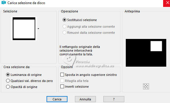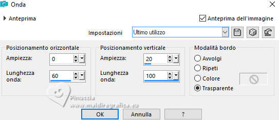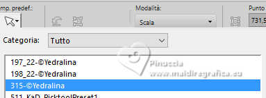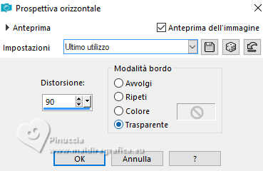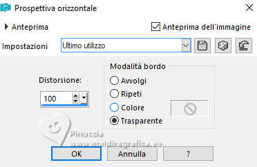 qui puoi trovare qualche risposta ai tuoi dubbi. Se l'argomento che ti interessa non è presente, ti prego di segnalarmelo. Questo tutorial è stato realizzato con PSP2020 e tradotto con PSPX9 ma può essere eseguito anche con le altre versioni di PSP. Dalla versione X4, il comando Immagine>Rifletti è stato sostituito con Immagine>Capovolgi in orizzontale, e il comando Immagine>Capovolgi con Immagine>Capovolgi in verticale. Nelle versioni X5 e X6, le funzioni sono state migliorate rendendo disponibile il menu Oggetti. Con la nuova versione X7, sono tornati Rifletti>Capovolgi, ma con nuove varianti. Vedi la scheda sull'argomento qui traduzione in francese/traduction en français qui/ici traduzione in inglese/english translation qui/here Versioni/Versions qui![]() Occorrente: ![]() Per i tubes grazie Karin e LisaT. Il resto del materiale è di Yedralina. (in questa pagina trovi i links ai siti dei creatori di tubes) Filtri: se hai problemi con i filtri, consulta la mia sezione filtri qui Filters Unlimited 2.0 qui Toadies - What are you qui Carolaine and Sensibility - CS_LDots qui Simple - Top Left Mirror qui Winnies6 - win_053 qui Tramages - Tow the Line qui Mura's Meister - Copies qui Graphics Plus - Cross Shadow qui AAA Frames - Foto Frame qui I filtri Toadies, Simple, Winnies, Tramages e Graphics Plus si possono usare da soli o importati in Filters Unlimited (come fare vedi qui) Se un filtro fornito appare con questa icona ![]() non esitare a cambiare modalità di miscelatura e opacità secondo i colori utilizzati. Nelle ultime versioni di PSP non c'è il gradiente di primo piano/sfondo (Corel_06_029) Puoi usare i gradienti delle versioni precedenti. Trovi i gradienti Corel X qui. ![]() Metti la selezione nella cartella Selezioni. Metti il preset nella cartella Impostazioni predefinite. Scegli due colori in tono con il tuo tube principale. Fai attenzione che non siano troppo scuri, perchè ci sono effetti che andranno persi. Vedi il mio secondo lavoro. Colori utilizzati: ![]() 1. Imposta il colore di primo piano con #c94771, e il colore di sfondo con #f0d4b1. ![]() Passa il colore di primo piano a Gradiente di primo piano/sfondo, stile Radiale. ![]() Passa il colore di sfondo a Gradiente di primo piano/sfondo, stile Rettangolare. ![]() 2. Apri una nuova immagine trasparente 950 x 650 pixels. Riempi l'immagine trasparente con il gradiente radiale di primo piano.3. Livelli>Nuovo livello raster. Selezione>Seleziona tutto 4. Apri il tube principale kw karneval 22 02 23 21 ![]() Cancella il watermark e vai a Modifica>Copia. Torna al tuo lavoro e vai a Modifica>Incolla nella selezione. Selezione>Deseleziona. ho notato che l'autrice non ha usato il tube principale ma il misted; decidi tu come fare; in fondo al tutorial la versione con il misted (ovviamente, le schermate degli effetti sono riferite alla versione con il tube principale 5. Livelli>Duplica. Effetti>Effetti di immagine>Motivo unico, con i settaggi standard. ![]() Regola>Sfocatura>Sfocatura gaussiana - raggio 25. ![]() 6. Effetti>Plugins>Filters Unlimited 2.0 - Winnies6 - win_053. ![]() 7. Effetti>Effetti di riflesso>Specchio rotante. ![]() 8. Effetti>Plugins>Toadies - What are you. ![]() Effetti>Effetti di bordo>Aumenta o Aumenta di più. 9. Attiva il livello sottostante del tube originale. Effetti>Effetti di immagine>Motivo unico. ![]() 10. Cambia la modalità di miscelatura di questo livello in Luminanza (esistente), e abbassa l'opacità +/- 65%, secondo il tuo tube. nel mio secondo lavoro ho abbassato l'opacità all'85% 11. Attiva il livello di sfondo. Livelli>Duplica. Livelli>Disponi>Porta in alto. 12. Effetti>Effetti geometrici>Prospettiva orizzontale. ![]() 13. Immagine>Rifletti>Rifletti orizzontalmente. Ripeti Effetti>Effetti geometrici>Prospettiva orizzontale, con i settaggi precedenti. ![]() 14. Effetti>Plugins>Tramages - Tow the lines, con i settaggi standard. ![]() 15. Effetti>Effetti di distorsione>Onda. ![]() 16. Effetti>Plugins>Mura's Meister - Copies. ![]() Questo è uno dei casi in cui è importante che BG Color sia impostato con il tuo colore di sfondo. Clicca su Reset per assicurarti di avere il tuo colore di sfondo e poi imposta i settaggi 17. Effetti>Effetti di immagine>Motivo unico, con i settaggi precedenti. ![]() 18. Effetti>Effetti di riflesso>Specchio rotante. ![]() 19. Effetti>Plugins>Simple - Top Left Mirror. ![]() 20. Oggetti>Allinea>Superiore o tasto K per attivare lo strumento Puntatore ![]() e imposta Posizione X e Y: 0,00 ![]() ![]() Effetti>Effetti 3D>Sfalsa ombra, colore 3 #631923 ![]() 21. Attiva nuovamente il livello di sfondo. Livelli>Duplica. Livelli>Disponi>Porta in alto. Effetti>Effetti geometrici>Prospettiva orizzontale. ![]() 22. Immagine>Rifletti. Ripeti Effetti>Effetti geometrici>Prospettiva orizzontale, con i settaggi precedenti. ![]() 23. Effetti>Effetti di distorsione>Onda, con i settaggi precedenti. ![]() 24. Effetti>Plugins>Mura's Meister - Copies. ![]() anche in questo caso, devi assicurarti che in BG color sia impostato il tuo colore di sfondo 25. Effetti>Effetti 3D>Sfalsa ombra, colore 3 #631923 ![]() 26. Effetti>Plugins>Graphics Plus - Cross Shadow, con i settaggi standard. ![]() 27. Oggetti>Allinea>Superiore o tasto K per attivare lo strumento Puntatore ![]() e imposta Posizione X e Y: 0,0 ![]() ![]() 28. Livelli>Nuovo livello raster. Selezione>Carica/Salva selezione>Carica selezione da disco. Cerca e carica la selezione ©Yedralina_sel148 ![]() 29. Apri il misted paysages_0187_lisat ![]() Cancella il watermark per il mio esempio: Immagine>Rifletti Modifica>Copia. Torna al tuo lavoro e vai a Modifica>Incolla nella selezione. Selezione>Deseleziona. Regola>Messa a fuoco>Metti a fuoco. 30. Livelli>Duplica. Immagine>Rifletti>Rifletti orizzontalmente. Livelli>Unisci>Unisci giù. Cambia la modalità di miscelatura di questo livello in Luminanza (esistente). 31. Attiva nuovamente il tube principale e vai a Modifica>Copia. Torna al tuo lavoro e vai a Modifica>Incolla come nuovo livello