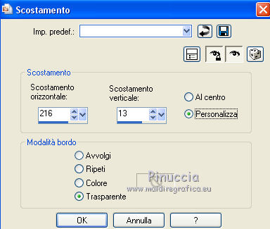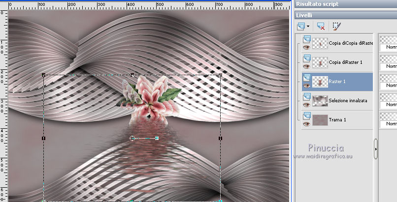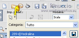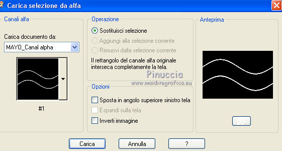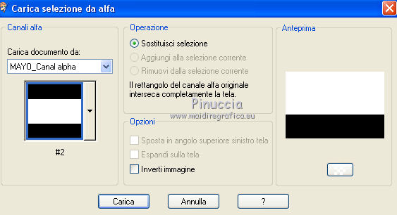 qui puoi trovare qualche risposta ai tuoi dubbi. Se l'argomento che ti interessa non è presente, ti prego di segnalarmelo. Questo tutorial è stato realizzato con Corel19 e tradotto con CorelX7, CorelX2 e CorelX3, ma può essere realizzato anche con le altre versioni di PSP. Dalla versione X4, il comando Immagine>Rifletti è stato sostituito con Immagine>Capovolgi in orizzontale, e il comando Immagine>Capovolgi con Immagine>Capovolgi in verticale. Nelle versioni X5 e X6, le funzioni sono state migliorate rendendo disponibile il menu Oggetti. Con la nuova versione X7, sono tornati Rifletti>Capovolgi, ma con nuove varianti. Vedi la scheda sull'argomento qui traduzione in francese/traduction en français qui/icitraduzione in inglese/english translation qui/hereVersioni/Versions qui Occorrente: Tubes a scelta. Per i tubes usati e non forniti, grazie Beatriz (3008-woman-LBTUBES) tube del fiore Hbird11 (non firmato). Il resto del materiale qui (in questa pagina trovi i links ai siti dei creatori di tubes) Filtri: se hai problemi con i filtri, consulta la mia sezione filtri qui Filters Unlimited 2.0 qui Unplugged Tools - Spotlight qui Flaming Pear - Flood qui Graphics Plus - Cross Shadow qui Mura's Meister - Copies qui Mura's Meister - Cloud qui Simple - Top Button Wrap (bonus) qui AAA Filters - AAA Framer qui AAA Filters - Custom qui I filtri Simple, Graphics Plus e Unplugged si possono usare da soli o importati in Filters Unlimited (come fare vedi qui) Se un filtro fornito appare con questa icona ![]() non esitare a cambiare modalità di miscelatura e opacità secondo i colori utilizzati. Metti il preset Preset_Pick_289-©Yedralina nella cartella Impostazioni predefinite. Imposta il colore di primo piano con il colore #937376, e il colore di sfondo con il colore #989898. ![]() 1. Apri l'immagine Alpha Mayo_Canal Alpha. Duplica l'immagine (sulla tastiera shift+D) e chiudi l'originale. La copia, che sarà la base del tuo lavoro non è vuota, ma contiene le selezioni salvate sul canale alfa. 2. Effetti>Plugins>Mura's Meister - Cloud ![]() ricorda che questo filtro lavora con i lavori impostati nella paletta dei materiali, ma tiene in memoria il primo settaggio dall'apertura del programma. Quindi se hai già usato il filtro, per essere sicuro di avere impostati i colori corretti premi il tasto Reset. Il risultato è casuale e per questo non sarà uguale al mio. Se vuoi cambiare l'aspetto delle nuvole, clicca sulla finestra di anteprima, finché non vedi quello che preferisci. 3. Selezione>Carica/Salva selezione>Carica selezione da canale alfa. La selezione #1 è subito disponibile. Devi soltanto cliccare Carica. ![]() Selezione>Innalza selezione a livello. Selezione>Deseleziona. 5. Effetti>Effetti di bordo>Aumenta. Immagine>Rifletti. 6. Effetti>Plugins>Filters Unlimited 2.0 - Simple - Top Bottom Wrap. ![]() 7. Effetti>Effetti 3D>Sfalsa ombra, colore nero. ![]() 8. Effetti>Plugins>Mura's Meister - Copies. ![]() 9. Selezione>Carica/Salva selezione>Carica selezione da canale alfa. Apri il menu delle selezioni e carica la selezione #2. ![]() Mantieni selezionato. Immagine>Rifletti. Selezione>Deseleziona. 10. Effetti>Plugins>Graphics Plus - Cross Shadow, con i settaggi standard. ![]() 11. Apri il tuo tube decorativo (nel mio caso un fiore) e vai a Modifica>Copia. Torna al tuo lavoro e vai a Modifica>Incolla come nuovo livello. Facoltativo: Attiva lo strumento Puntatore ![]() apri il menu delle impostazioni e seleziona il preset 289-©Yedralina. ![]() ![]() 12. Regola>Messa a fuoco>Metti a fuoco. 13. Effetti>Plugins>Flaming Pear - Flood. ![]() 14. Livelli>Duplica. Immagine>Ridimensiona, all'80%, tutti i livelli non selezionato. 15. Livelli>Duplica. Immagine>Ridimensiona, al 70%, tutti i livelli non selezionato. Adesso hai tre livelli del tube che hai scelto. Attiva il livello più basso (l'originale) ![]() 16. Effetti>Effetti di immagine>Scostamento. ![]() 17. Attiva il livello soprastante della prima copia. Immagine>Rifletti. Effetti>Effetti di immagine>Scostamento. ![]() 18. Attiva il livello superiore della seconda copia. Effetti>Effetti di immagine>Scostamento. ![]() 19. Livelli>Unisci>Unisci giù - 2 volte. Regola>Messa a fuoco>Metti a fuoco. 20. Effetti>Effetti 3D>Sfalsa ombra, colore nero. ![]() 21. Attiva il livello inferiore. Effetti>Plugins>Unplugged Tools - Spotlight. ![]() 22. Immagine>Aggiungi bordatura, 2 pixels, simmetriche, colore bianco. Immagine>Aggiungi bordatura, 2 pixels, simmetriche, colore di primo piao. Immagine>Aggiungi bordatura, 25 pixels, simmetriche, colore bianco. Immagine>Aggiungi bordatura, 2 pixels, simmetriche, colore di primo piao. 23. Selezione>Seleziona tutto. 24. Modifica>Copia. 25. Immagine>Aggiungi bordatura, 25 pixels, simmetriche, colore bianco. Selezione>Inverti. Modifica>Incolla nella selezione. 26. Effetti>Plugins>AAA Filters - AAA Framer. ![]() 27. Effetti>Effetti 3D>Sfalsa ombra, colore nero. ![]() Selezione>Deseleziona. 28. Apri il tube principale e vai a Modifica>Copia. Torna al tuo lavoro e vai a Modifica>Incolla come nuovo livello. Immagine>Ridimensiona, se e quanto necessario, tutti i livelli non selezionato. Effetti>Effetti 3D>Sfalsa ombra, a scelta. Spostalo a sinistra.![]() 29. Firma il tuo lavoro su un nuovo livello. 30. Livelli>Unisci>Unisci tutto. Immagine>Ridimensiona, 1000 pixels di larghezza, tutti i livelli selezionato. Facoltativo: Effetti>Plugins>AAA Filters - Custom - Landscape. ![]() Salva in formato jpg. Versione con tubes di Guismo e Fato ![]() Versione con tubes di Rooske e Sonia ![]() ![]() Puoi scrivermi se hai problemi o dubbi, o trovi un link che non funziona, o soltanto per un saluto. 16 Maggio 2019 |