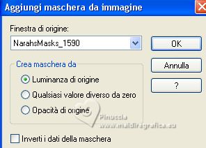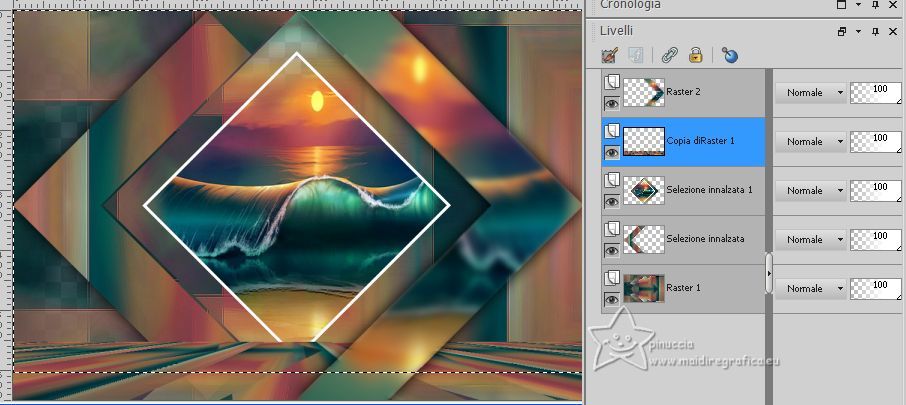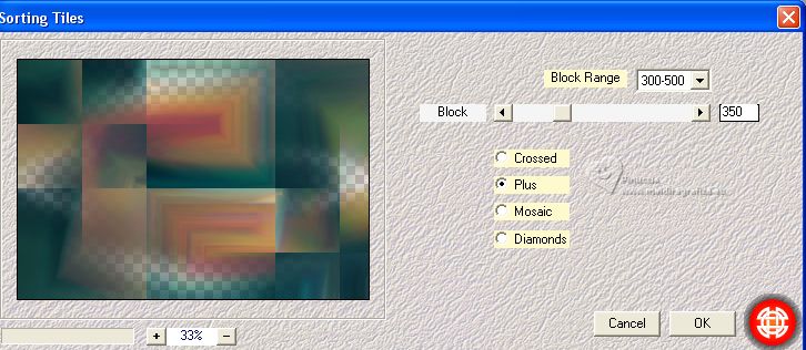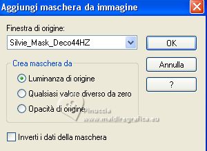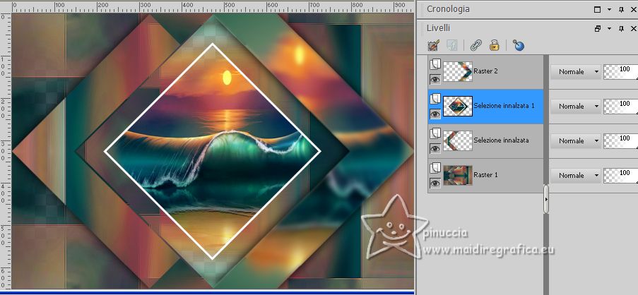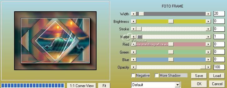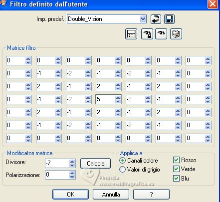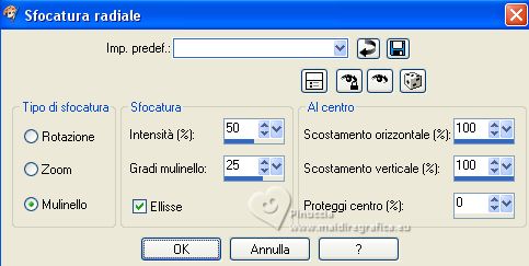 qui puoi trovare qualche risposta ai tuoi dubbi. Se l'argomento che ti interessa non è presente, ti prego di segmomentosmagicosrmelo. Questo tutorial è stato realizzato con PSP2020 e tradotto con PSPX7, ma può essere eseguito anche con le altre versioni di PSP. Dalla versione X4, il comando Immagine>Rifletti è stato sostituito con Immagine>Capovolgi in orizzontale, e il comando Immagine>Capovolgi con Immagine>Capovolgi in verticale. Nelle versioni X5 e X6, le funzioni sono state migliorate rendendo disponibile il menu Oggetti. Con la nuova versione X7, sono tornati Rifletti>Capovolgi, ma con nuove varianti. Vedi la scheda sull'argomento qui traduzione in francese/traduction en français qui/ici traduzione in inglese/english translation qui/here Versioni/Versions qui![]() Occorrente: ![]() Grazie: per i tubes grazie Lana, SC, Riet e per le maschere Silvie e Narah. Il resto del materiale è di Yedralina. (in questa pagina trovi i links ai siti dei creatori di tubes) ![]() se hai problemi con i filtri, consulta la mia sezione filtri qui Filters Unlimited 2.0 qui Mehdi - Sorting Tiles qui Mura's Meister - Perspective Tiling qui Simple - Blintz qui AAA Frames - Foto Frame qui I filtri Simple si possono usare da soli o importati in Filters Unlimited (come fare vedi qui) Se un filtro fornito appare con questa icona ![]() non esitare a cambiare modalità di miscelatura e opacità secondo i colori utilizzati. Nelle ultime versioni di PSP non c'è il gradiente di primo piano/sfondo (Corel_06_029) Puoi usare i gradienti delle versioni precedenti. Trovi i gradienti Corel X qui. ![]() Metti i presets Emboss 4 e Double Vision nella cartella Impostazioni predefinite. Apri le maschere in PSP e minimizzale con il resto del materiale. 1. Imposta il colore di primo piano con #2e6550, e il colore di sfondo con #dac294. ![]() 2. Passa il colore di primo piano a Gradiente di primo piano/sfondo, stile Sprazzo di luce ![]() 3. Apri CanalAlpha_MOMENTOSM Finestra>Duplica o sulla tastiera maiuscola+D per fare una copia. ![]() Chiudi l'originale. La copia, che sarà la base del tuo lavoro, non é vuota, ma contiene le selezioni salvate sul canale alfa. 4. Selezione>Seleziona tutto. Apri il misted SC_MistedBeach02_01-06.2232 ![]() Modifica>Copia. Torna al tuo lavoro e vai a Modifica>Incolla nella selezione. Selezione>Deseleziona. 5. Effetti>Effetti di immagine>Motivo unico, con i settaggi standard. ![]() 6. Regola>Sfocatura>Sfocatura radiale. ![]() 7. Effetti>Effetti di riflesso>Specchio rotante. ![]() 8. Effetti>Plugins>Mehdi - Sorting Tiles. ![]() 9. Effetti>Filtro definito dall'utente - seleziona il preset Double_Vision e ok. ![]() Effetti>Effetti di bordo>Aumenta. 10. Effetti>Plugins>Simple - Blintz - 2 volte questo effetto lavora senza finestre: risultato ![]() 11. Effetti>Effetti di riflesso>Specchio rotante, con i settaggi precedenti. ![]() 12. Livelli>Nuovo livello raster. Selezione>Carica/Salva selezione>Carica selezione da canale alfa. La selezione #1 è subito disponibile. Devi soltanto cliccare Carica. ![]() 13. Riempi la selezione con il gradiente.Modifica>Incolla nella selezione (il misted è sempre in memoria). 14. Regola>Sfocatura>Sfocatura gaussiana - raggio 5. ![]() 15. Effetti>Effetti 3D>Sfalsa ombra, colore nero. ![]() Selezione>Deseleziona. 16. Immagine>Rifletti. Attiva il livello inferiore. 17. Selezione>Carica/Salva selezione>Carica selezione da canale alfa. Apri il menu delle selezioni e carica la selezione #2 ![]() Selezione>Innalza selezione a livello. Selezione>Deseleziona. 18. Immagine>Rifletti. Effetti>Effetti 3D>Sfalsa ombra, con i settaggi precedenti. 19. Attiva nuovamente il livello inferiore. Selezione>Carica/Salva selezione>Carica selezione da canale alfa. Apri il menu delle selezioni e carica la selezione #3 ![]() Selezione>Innalza selezione a livello. Livelli>Disponi>Sposta su 20. Selezione>Modifica>Contrai - 50 pixels. Imposta il colore di primo piano con il colore bianco #ffffff. Riempi la selezione con il colore bianco.21. Selezione>Modifica>Contrai - 5 pixels. Premi sulla tastiera il tasto CANC ![]() 22. Modifica>Incolla nella selezione (il misted è sempre in memoria). Selezione>Deseleziona. La tag e i livelli ![]() 23. Attiva nuovamente il livello di sfondo. Livelli>Duplica. 24. Effetti>Plugins>Mura's Meister - Perspective Tiling. ![]() 25. Livelli>Disponi>Sposta su - 2 volte. 26. Attiva lo strumento Bacchetta magica , tolleranza 0 e sfumatura 50![]() e clicca nella zona trasparente per selezionarla. ![]() Premi +/-10 volte CANC sulla tastiera. Selezione>Deseleziona. Livelli>Duplica. non dimenticare di riportare la sfumatura dello strumento Bacchetta magica a 0 27. Livelli>Nuovo livello raster. Riempi il livello con il colore bianco.28. Livelli>Nuovo livello maschera>Da immagine. Apri il menu sotto la finestra di origine e vedrai la lista dei files aperti. Seleziona la maschera Silvie_Mask_Deco44HZ ![]() Livelli>Unisci>Unisci gruppo. 29. Effetti>Filtro definito dall'utente - seleziona il preset Emboss 4 e ok. ![]() 30. Cambia la modalità di miscelatura di questo livello in Luminanza (esistente). 31. Attiva il livello inferiore. Modifica>Copia. Modifica>Incolla come nuova immagine, e minimizza questa immagine. 32. Torna al tuo lavoro. Rimani posizionato sul livello di sfondo. Apri il tube Deco00317©Yedralina ![]() Modifica>Copia. Torna al tuo lavoro e vai a Modifica>Incolla come nuovo livello. Tasto K per attivare lo strumento Puntatore ![]() e imposta Posizione X: 125,00 e Posizione Y: 27,00 ![]() 33. Livelli>Disponi>Sposta su. 34. Immagine>Aggiungi bordatura, 1 pixel, simmetriche, colore bianco. Immagine>Aggiungi bordatura, 1 pixel, simmetriche, con il primo colore #2e6550. Immagine>Aggiungi bordatura, 1 pixel, simmetriche, colore di sfondo. 35. Selezione>Seleziona tutto. Immagine>Aggiungi bordatura, 45 pixels, simmetriche, con un colore qualsiasi. Selezione>Inverti. 36. Attiva l'immagine che hai minimizzato al punto 31 e vai a Modifica>Copia. Torna al tuo lavoro e va