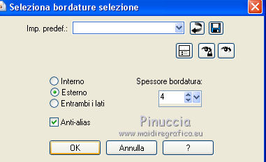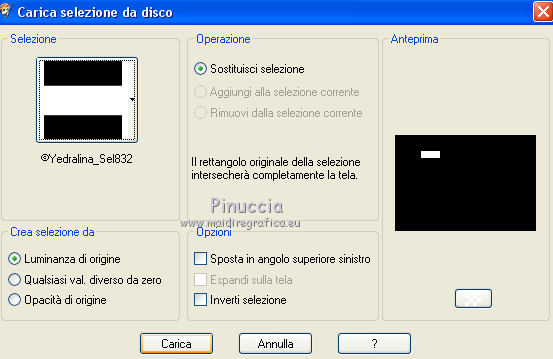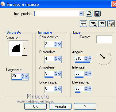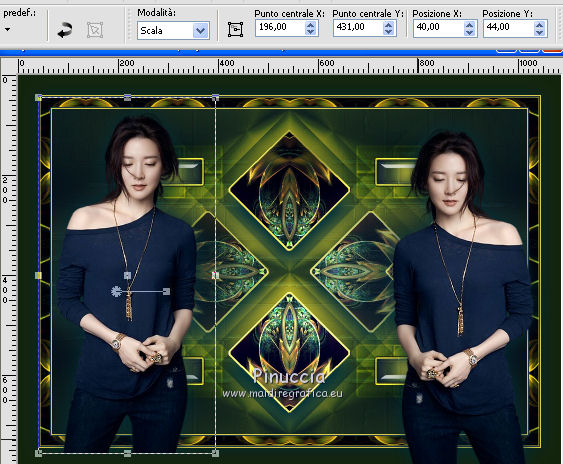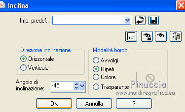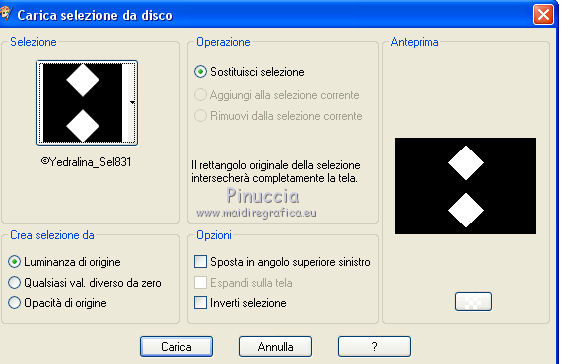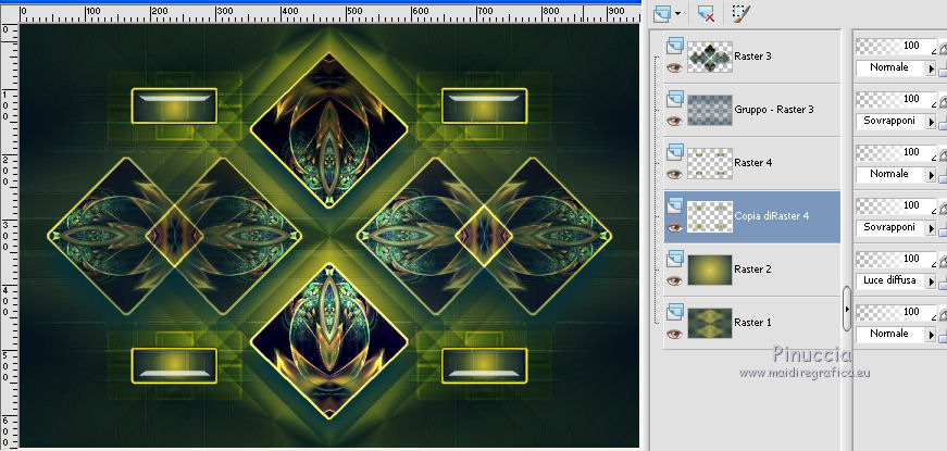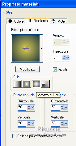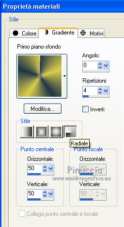qui puoi trovare qualche risposta ai tuoi dubbi. Se l'argomento che ti interessa non è presente, ti prego di segnalarmelo. Questo tutorial è stato realizzato con Corel19 e tradotto con CorelX7, CorelX2 e CorelX3, ma può essere realizzato anche con le altre versioni di PSP. Dalla versione X4, il comando Immagine>Rifletti è stato sostituito con Immagine>Capovolgi in orizzontale, e il comando Immagine>Capovolgi con Immagine>Capovolgi in verticale. Nelle versioni X5 e X6, le funzioni sono state migliorate rendendo disponibile il menu Oggetti. Con la nuova versione X7, sono tornati Rifletti>Capovolgi, ma con nuove varianti. Vedi la scheda sull'argomento qui traduzione in francese/traduction en français qui/icitraduzione in inglese/english translation qui/here Versioni/Versions quiOccorrente: Tubes a scelta Il resto del materiale qui Per il tube grazie Beatriz (3291-woman-LB TUBES. Il resto del materiale è di Yedralina (in questa pagina trovi i links ai siti dei creatori di tubes) Filtri: se hai problemi con i filtri, consulta la mia sezione filtri qui Filters Unlimited 2.0 qui RCS Filter Pak - RCS-TripleExposure qui Alien Skin Eye Candy 5 Impact - Glass qui Toadies - What are you qui Simple - Top Left Mirror qui Graphics Plus - Cross Shadow qui Facoltativo Adjust - Variations qui I filtri RCS, Toadies, Simple e Graphics Plus si possono usare da soli o importati in Filters Unlimited (come fare vedi qui) Se un filtro fornito appare con questa icona ![]() non esitare a cambiare modalità di miscelatura e opacità secondo i colori utilizzati. Nelle ultime versioni di PSP non c'è il gradiente di primo piano/sfondo (Corel_06_029) Puoi usare i gradienti delle versioni precedenti. Trovi qui i gradienti Corel X. Metti il preset Cliccando sul file una o due volte (a seconda delle tue impostazioni), automaticamente il preset si installerà nella cartella corretta. perchè uno o due clic vedi qui Metti le selezioni nella cartella Selezioni. Apri la maschera in PSP e minimizzala con il resto del materiale. Imposta il colore di primo piano con il colore #1f3546, e il colore di sfondo con #e7d647. ![]() Passa il colore di primo piano a Gradiente di primo piano/sfondo, stile Radiale. ![]() 1. Apri una nuova immagine trasparente 950 x 650 pixels. Riempi l'immagine trasparente con il gradiente.Effetti>Plugins>Filters Unlimited 2.0 - RCS Filter Pack 1.0 - RCS TripleExposure, con i settaggi standard. ![]() Effetti>Effetti geometrici>Inclina. ![]() Effetti>Effetti di riflesso>Specchio rotante. ![]() Effetti>Effetti di riflesso>Specchio rotante. ![]() 2. Cambia i settaggi del Gradiente, Stile Lineare. ![]() Livelli>Nuovo livello raster. Riempi il livello con il gradiente.Cambia la modalità di miscelatura di questo livello in Luce diffusa. 3. Livelli>Nuovo livello raster. Passa il colore di primo piano a Colore. Riempi il livello con il colore scuro di primo piano.Livelli>Nuovo livello maschera>Da immagine. Apri il menu sotto la finestra di origine e vedrai la lista dei files aperti. Seleziona la maschera Masc127©Yedralina, Inverti i dati della maschera selezionato. ![]() Livelli>Unisci>Unisci gruppo. Effetti>Effetti di bordo>Aumenta di più. Regola>Messa a fuoco>Metti a fuoco - 2 volte. Cambia la modalità di miscelatura di questo livello in Sovrapponi. 4. Attiva il livello di sfondo. Effetti>Effetti di immagine>Motivo unico. ![]() 5. Selezione>Carica/Salva selezione>Carica selezione da disco. Cerca e carica la selezione ©Yedralina_sel831. ![]() Livelli>Nuovo livello raster. Apri l'immagine Fractal e vai a Modifica>Copia. Torna al tuo lavoro e vai a Modifica>Incolla nella selezione. se utilizzi il frattale aggiunto nel materiale, puoi cambiare i colori, con il filtro Adjust>Variations. Nel mio caso, un clic su Original, 2 clic More Yellow et ok. Selezione>Modifica>Seleziona bordature selezione. ![]() Riempi la selezione con il colore chiaro di sfondo.Effetti>Effetti 3D>Smusso a incasso. ![]() Selezione>Deseleziona. Livelli>Duplica. 6. Immagine>Ruota per gradi - 90 gradi a sinistra. ![]() Effetti>Effetti di immagine>Motivo unico. ![]() Livelli>Unisci>Unisci giù. 7. Effetti>Plugins>Graphics Plus - Cross Shadow, con i settaggi standard. ![]() Effetti>Effetti 3D>Sfalsa ombra, colore nero. ![]() Livelli>Disponi>Porta in alto. 8. Livelli>Nuovo livello raster. Selezione>Carica/Salva selezione>Carica selezione da disco. Cerca e carica la selezione ©Yedralina_sel832. ![]() Imposta nuovamente il colore di primo piano con il gradiente Sprazzo di luce. ![]() Riempi la selezione con il gradiente.Livelli>Disponi>Sposta giù - 2 volte. Effetti>Plugins>Alien Skin Eye Candy 5 Impact - Glass. Seleziona il preset ©Yedralina_Glass2 e ok. ![]() Selezione>Modifica>Seleziona bordature selezione, con i settaggi precedenti. ![]() Riempi la selezione con il colore chiaro di sfondo.Effetti>Effetti 3D>Smusso a incasso, con i settaggi precedenti. ![]() Selezione>Deseleziona. Effetti>Plugins>Simple - Top Left Mirror. ![]() Livelli>Duplica. Effetti>Plugins>Toadies - What are you, con i settaggi standard. ![]() Livelli>Disponi>Sposta giù. Cambia la modalità di miscelatura di questo livello in Sovrapponi. Effetti>Effetti 3D>Sfalsa ombra, colore nero. ![]() 9. Dovresti avere questo ![]() Immagine>Aggiungi bordatura, 2 pixels, simmetriche, colore chiaro. Immagine>Aggiungi bordatura, 2 pixels, simmetriche, colore scuro. Selezione>Seleziona tutto. Immagine>Aggiungi bordatura, 20 pixels, simmetriche, colore chiaro. Selezione>Inverti. 10. Livelli>Nuovo livello raster. Apri la cornice "marco", e vai a Modifica>Copia. Torna al tuo lavoro e vai a Modifica>Incolla nella selezione. Cambia la modalità di miscelatura di questo livello in Luce netta, Moltiplica, o secondo i tuoi colori. Selezione>Deseleziona. Immagine>Aggiungi bordatura, 2 pixels, simmetriche, colore scuro. Immagine>Aggiungi bordatura, 2 pixels, simmetriche, colore chiaro. Selezione>Seleziona tutto. Immagine>Aggiungi bordatura, 40 pixels, simmetriche, con un terzo colore: 15240