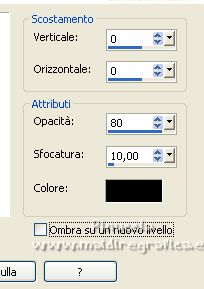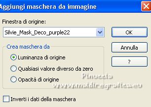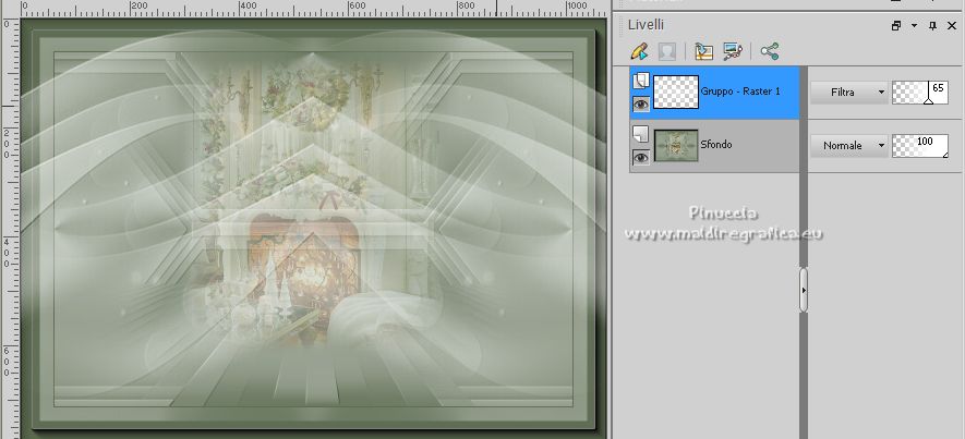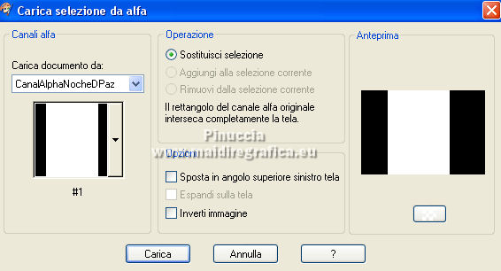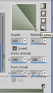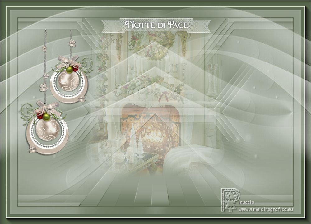 qui puoi trovare qualche risposta ai tuoi dubbi. Se l'argomento che ti interessa non è presente, ti prego di segnalarmelo. Questo tutorial è stato realizzato con Corel19 e tradotto con CorelX7, CorelX2 e CorelX3, ma può essere eseguito anche con le altre versioni di PSP. Dalla versione X4, il comando Immagine>Rifletti è stato sostituito con Immagine>Capovolgi in orizzontale, e il comando Immagine>Capovolgi con Immagine>Capovolgi in verticale. Nelle versioni X5 e X6, le funzioni sono state migliorate rendendo disponibile il menu Oggetti. Con la nuova versione X7, sono tornati Rifletti>Capovolgi, ma con nuove varianti. Vedi la scheda sull'argomento qui traduzione in francese/traduction en français qui/ici traduzione in inglese/english translation qui/here Versioni/Versions qui![]() Occorrente: Un tube a scelta. ![]() Per il tube usato e non fornito grazie Mina (Min@.5032 mist interno natale 11.17). Per la maschera grazie Silvie (Silvie_Mask_Deco_purple22). Il resto del materiale è di Yedralina. (in questa pagina trovi i links ai siti dei creatori di tubes) Filtri: se hai problemi con i filtri, consulta la mia sezione filtri qui Filters Unlimited 2.0 qui Frischluft - Mosaic Plane qui Horizonaus Mixed Bag - PutitintheCorner qui Toadies - What are you qui AAA Frames - Foto Frame qui Alien Skin Eye Candy 5 Impact - Extrude qui I filtri Horizonaus e Toadies si possono usare da soli o importati in Filters Unlimited (come fare vedi qui) Se un filtro fornito appare con questa icona ![]() non esitare a cambiare modalità di miscelatura e opacità secondo i colori utilizzati. Nelle ultime versioni di PSP non c'è il gradiente di primo piano/sfondo (Corel_06_029) Puoi usare i gradienti delle versioni precedenti. Trovi i gradienti Corel X qui. ![]() Metti il preset Emboss 4 nella cartella Impostazioni predefinite. Apri la maschera in PSP e minimizzala con il resto del materiale. 1. Imposta il colore di primo piano con #bcc2b7, e il colore di sfondo con #5e6d53. ![]() Passa il colore di primo piano a Gradiente di primo piano/sfondo, stile Radiale. ![]() 2. Apri CanalAlphaNocheDPaz . Finestra>Duplica o sulla tastiera maiuscola+D per fare una copia. ![]() Chiudi l'originale. La copia, che sarà la base del tuo lavoro, non é vuota, ma contiene una selezione salvata sul canale alfa. Riempi l'immagine trasparente con il gradiente.3. Effetti>Plugins>Toadies - What are you. ![]() 4. Effetti>Plugins>Horizonaus Mixed Bag - PutitintheCorner, con i settaggi standard. ![]() 5. Effetti>Effetti di immagine>Scostamento. ![]() 6. Livelli>Duplica. Immagine>Rifletti. 7. Selezione>Carica/Salva selezione>Carica selezione da canale alfa. La selezione #1 é subito disponibile. Devi soltanto cliccare Carica. ![]() Premi sulla tastiera il tasto CANC ![]() Selezione>Deseleziona. 8. Livelli>Unisci>Unisci giù. 9. Effetti>Effetti di riflesso>Specchio rotante. ![]() 10. Effetti>Effetti di immagine>Motivo unico, con i settaggi standard. ![]() 11. Apri il tuo misted - per l'esempio Min@.5032 mist interno natale 11.17 ![]() e vai a Modifica>Copia. Torna al tuo lavoro e vai a Modifica>Incolla come nuovo livello. Immagine>Ridimensiona, se necessario (per il mio esempio al 75%), tutti i livelli non selezionato. Posiziona correttamente il tube.12. Facoltativo: Oggetti>Allinea>Superiore. O, con lo strumento Puntatore ![]() imposta Posizione Y a 0,00 (la Posizione X dipenderà dal tube utilizzato). ![]() 13. Cambia la modalità di miscelatura di questo livello in Luce diffusa. ![]() 14. Attiva il livello inferiore. Modifica>Copia Modifica>Incolla come nuova immagine e minimizza questa immagine. 15. Torna al tuo lavoro e rimani posizionato sul livello inferiore. Effetti>Plugins>Frischluft - Mosaic Plan. ![]() 16. Effetti>Filtro definito dall'utente - seleziona il preset Emboss 4 e ok. ![]() 17. Immagine>Aggiungi bordatura, 2 pixels, simmetriche, colore scuro. 18. Selezione>Seleziona tutto. Immagine>Aggiungi bordatura, 25 pixels, simmetriche, colore chiaro. Selezione>Inverti. 19. Modifica>Incolla nella selezione (hai ancora in memoria l'immagine del punto 14). 20. Regola>Sfocatura>Sfocatura gaussiana, raggio 15. ![]() 21. Selezione>Seleziona tutto. Immagine>Aggiungi bordatura, 35 pixels, simmetriche, colore scuro. 22. Selezione>Inverti. Effetti>Plugins>AAA Frames - Foto Frame. ![]() Selezione>Deseleziona. 23. Imposta il colore di primo piano con il colore bianco. Livelli>Nuovo livello raster. Riempi il livello con il colore bianco.24. Livelli>Nuovo livello maschera>da immagine. Apri il menu sotto la finestra di origine e vedrai la lista dei files aperti. Seleziona la maschera Silvie_Mask_Deco_purple22 ![]() Livelli>Unisci>Unisci gruppo. 25. Immagine>Rifletti. Effetti>Effetti di immagine>Motivo unico. ![]() 26. Immagine>Capovolgi. Effetti>Effetti di riflesso>Specchio rotante. ![]() 27. Effetti>Filtro definito dall'utente - Emboss 4. ![]() 28. Abbassa l'opacità di questo livello +/-65%, facoltativo: cambia la modalità di miscelatura in Filtra. ![]() 29. Apri il deco 2206©Yedralina ![]() Modifica>Copia. Torna al tuo lavoro e vai a Modifica>Incolla come nuovo livello. Posiziona il tube in alto al centro.![]() 30. Attiva lo strumento Testo ![]() io ho impostato il colore di primo e di secondo piano con il colore bianco Regola la dimensione in base al tuo testo e alla tua versione di PSP ![]() Scrivi Noche de paz, o nella tua lingua, se vuoi 31. Effetti>Effetti 3D>Sfalsa ombra, colore nero. ![]() ***Se preferisci, copia/incolla come nuovo livello il file di testo ![]() e posizionalo sul banner in alto.![]() 32. Apri il tube deco - per me pngwing.com(90) ![]() Modifica>Copia. Torna al tuo lavoro e vai a Modifica>Incolla come nuovo livello. Posiziona il tube il alto a sinistra, come nel mio esempio.![]() Effetti>Effetti 3D>Sfalsa ombra, a scelta. 33. Immagine>Ridimensiona, 1000 pixels di larghezza, tutti i livelli selezionato. ![]() 34. Firma il tuo lavoro su un nuovo livello. Livelli>Unisci>Unisci tutto e salva in formato jpg. Per i tube