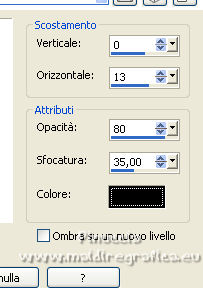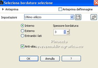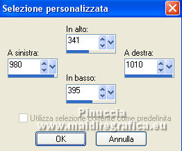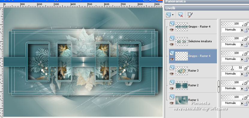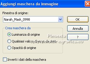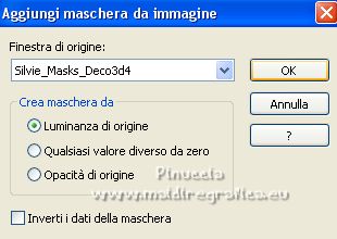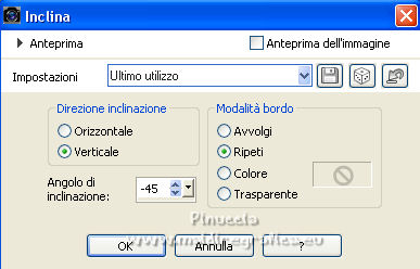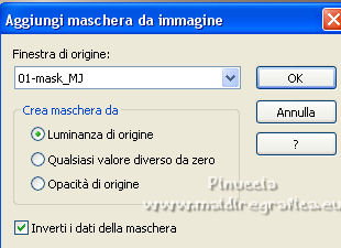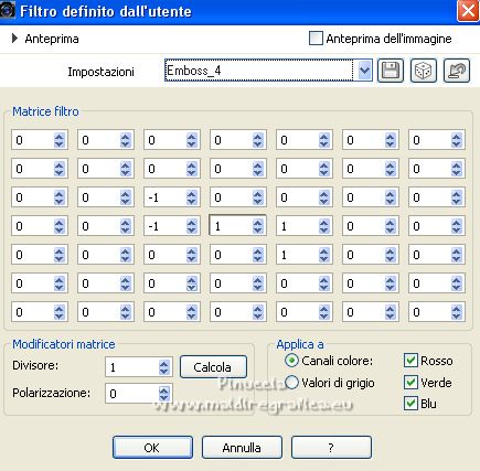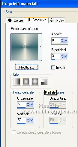 qui puoi trovare qualche risposta ai tuoi dubbi. Se l'argomento che ti interessa non è presente, ti prego di segnalarmelo. Questo tutorial è stato realizzato con Corel19 e tradotto con CorelX7, CorelX2 e CorelX3, ma può essere eseguito anche con le altre versioni di PSP. Dalla versione X4, il comando Immagine>Rifletti è stato sostituito con Immagine>Capovolgi in orizzontale, e il comando Immagine>Capovolgi con Immagine>Capovolgi in verticale. Nelle versioni X5 e X6, le funzioni sono state migliorate rendendo disponibile il menu Oggetti. Con la nuova versione X7, sono tornati Rifletti>Capovolgi, ma con nuove varianti. Vedi la scheda sull'argomento qui traduzione in francese/traduction en français qui/ici traduzione in inglese/english translation qui/here Versioni/Versions qui![]() Occorrente: Un tube a scelta. ![]() Il tube utilizzato e non fornito è di pngwing. Per le maschere grazie Maria José (01-mask_MJ), Narah (Narah_Mask_0998) e Silvie (Silvie_Masks_Deco3d4) Il resto del materiale è di Yedralina. (in questa pagina trovi i links ai siti dei creatori di tubes) ![]() se hai problemi con i filtri, consulta la mia sezione filtri qui Filters Unlimited 2.0 qui Mehdi - Sorting Tiles qui &<Bkg Designer sf10III> - VMT Instant Tile (da importare in Unlimited) qui VanDerLee - Unplugged X qui L&K's - L&K's Zitah qui Alien Skin Eye Candy 5 Impact - Glass qui Filter Factory Gallery J - Whirl Blur qui I filtri Factory Gallery si possono usare da soli o importati in Filters Unlimited (come fare vedi qui) Se un filtro fornito appare con questa icona ![]() non esitare a cambiare modalità di miscelatura e opacità secondo i colori utilizzati. Nelle ultime versioni di PSP non c'è il gradiente di primo piano/sfondo (Corel_06_029) Puoi usare i gradienti delle versioni precedenti. Trovi i gradienti Corel X qui. Metti i presets Cliccando sul file una o due volte (a seconda delle tue impostazioni), automaticamente il preset si installerà nella cartella corretta. perché uno o due clic vedi qui ![]() Metti il preset Emboss 4 nella cartella Impostazioni predefinite. Apri le maschere in PSP e minimizzale con il resto del materiale. 1. Imposta il colore di primo piano con #f1ebde, e il colore di sfondo con #31636c. ![]() Passa il colore di primo piano a Gradiente di primo piano/sfondo, stile Radiale. ![]() 2. Apri CanalAlpha Finestra>Duplica o sulla tastiera maiuscola+D per fare una copia. ![]() Chiudi l'originale. La copia, che sarà la base del tuo lavoro, non é vuota, ma contiene le selezioni salvate sul canale alfa. Riempi l'immagine trasparente con il gradiente.3. Regola>Sfocatura>Sfocatura gaussiana - raggio 20. ![]() 4. Effetti>Plugins>Mehdi - Sorting Tiles. ![]() 5. Effetti>Effetti geometrici>Inclina. ![]() 6. Effetti>Plugins>Filters Unlimited 2.0 - &<Bkg Designer sf10III> - VMT Instant Tile, con i settaggi standard. ![]() 7. Effetti>Plugins>Filters Unlimited 2.0 - Filter Factory Gallery J - Whirl Blur, con i settaggi standard. ![]() 8. Livelli>Nuovo livello raster. Selezione>Carica/Salva selezione>Carica selezione da canale alfa. La selezione #1 è subito disponibile. Devi soltanto cliccare Carica. ![]() Riempi la selezione con il gradiente.9. Regola>Sfocatura>Sfocatura gaussiana - raggio 20. ![]() 10. Selezione>Deseleziona. Effetti>Effetti di bordo>Aumenta di più. 11. Effetti>Plugins>VanDerLee - Unplugged-X ![]() 12. Selezione>Carica/Salva selezione>Carica selezione da canale alfa. Carica nuovamente la selezione #1 ![]() (utilizzeremo questa selezione come referenza per il tube) 13. Apri il tube scelto - per me ![]() Modifica>Copia. Torna al tuo lavoro e vai a Modifica>Incolla come nuovo livello. Immagine>Ridimensiona, se necessario, in modo che non superi troppo la selezione. Nel mio caso, ho fatto all'80%. ![]() 14. Selezione>Deseleziona. 15. Effetti>Effetti 3D>Sfalsa ombra, colore nero. ![]() 16. Livelli>Nuovo livello raster. Riempi il livello con il gradiente.17. Livelli>Nuovo livello maschera>Da immagine. Apri il menu sotto la finestra di origine e vedrai la lista dei files aperti. Seleziona la maschera 01-mask_MJ ![]() Livelli>Unisci>Unisci gruppo. 19. Facoltativo: Livelli>Duplica. Livelli>Unisci>Unisci giù. 20. Effetti>Effetti di bordo>Aumenta di più. 21. Effetti>Effetti 3D>Sfalsa ombra, con i settaggi precedenti. ![]() 22. Attiva il livello del tube, Raster 3. ![]() 23. Selezione>Carica/Salva selezione>Carica selezione da canale alfa. Apri il menu delle selezioni e carica la selezione #2 ![]() Selezione>Innalza selezione a livello. **Nella mia seconda versione, ho incolla nella selezione il tube completo. 24. Selezione>Inverti. Effetti>Effetti 3D>Sfalsa ombra, con i settaggi precedenti. ![]() Selezione>Deseleziona. 25. Effetti>Effetti di riflesso>Specchio rotante. ![]() 26. Attiva nuovamente il livello del misted. Abbassa l'opacità di questo livello +/-50%. ![]() 27. Attiva il livello Raster 2. Effetti>Effetti 3D>Sfalsa ombra, con i settaggi precedenti. ![]() 28. Imposta il colore di primo piano con il colore bianco. Livelli>Nuovo livello raster. Riempi il livello con il colore bianco.29. Livelli>Nuovo livello maschera>Da immagine. Apri il menu sotto la finestra di origine e seleziona la maschera Silvie_Masks_Deco3d4 ![]() Livelli>Unisci>Unisci gruppo. 30. Effetti>Filtro definito dall'utente - seleziona il preset Emboss 4 e ok. ![]() Livelli>Disponi>Sposta su. ![]() 31. Livelli>Nuovo livello raster. Riempi il livello con il colore bianco.32. Livelli>Nuovo livello maschera>Da immagine. Apri il menu sotto la finestra di origine e seleziona la maschera Narah_Mask_0998 ![]() Livelli>Unisci>Unisci gruppo. 33. Ripeti Effetti>Filtro definito dall'utente - Emboss 4. ![]() per il mio esempio: Livelli>Disponi>Sposta su Decidi secondo le immagini utilizzate. ![]() 34. Attiva il livello inferiore, Raster 1. Effetti>Plugins>L&K's - L&K's Zitah. ![]() 35. Apri il tube decorativo - per la mia versione ho utilizzato lo stesso tube ![]() Modifica>Copia. Torna al tuo lavoro e vai a Modifica>Incol